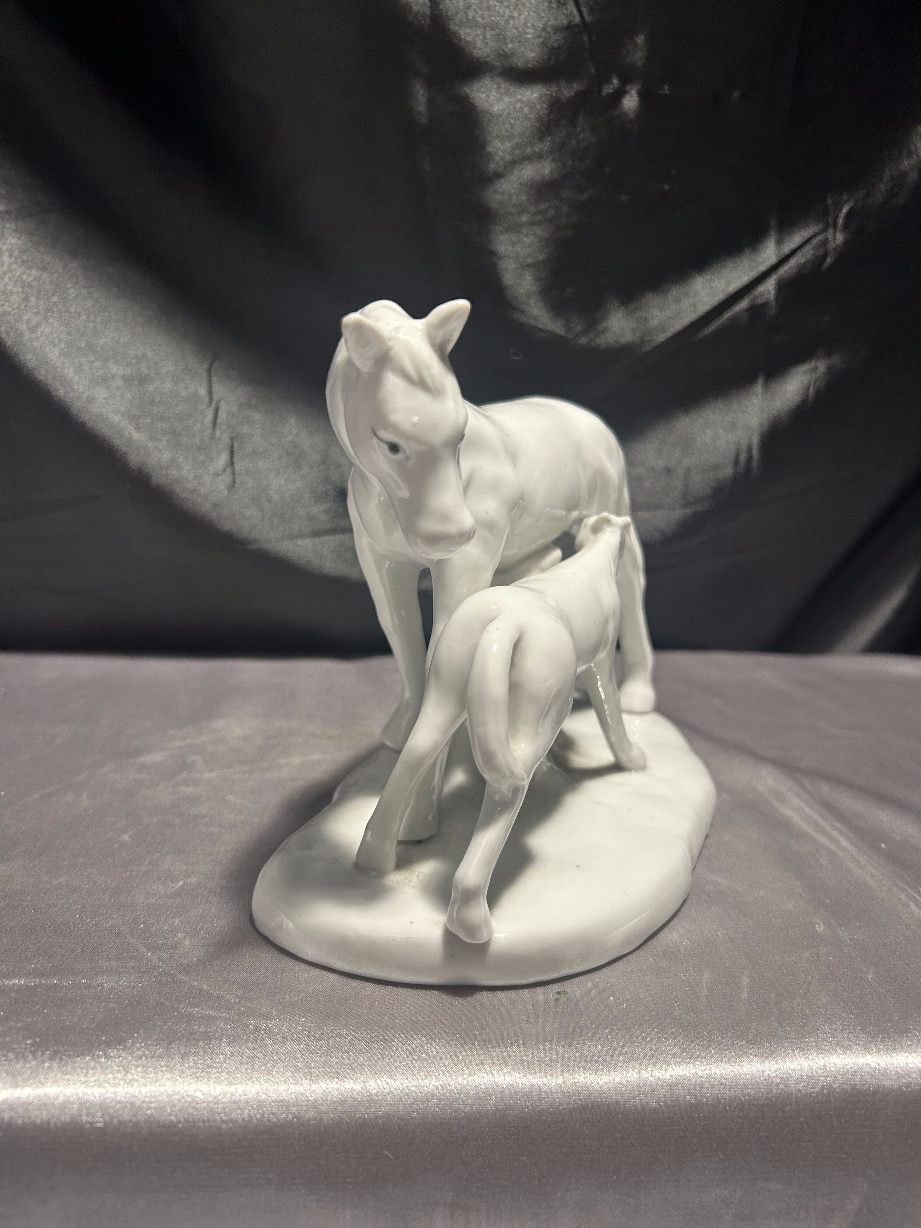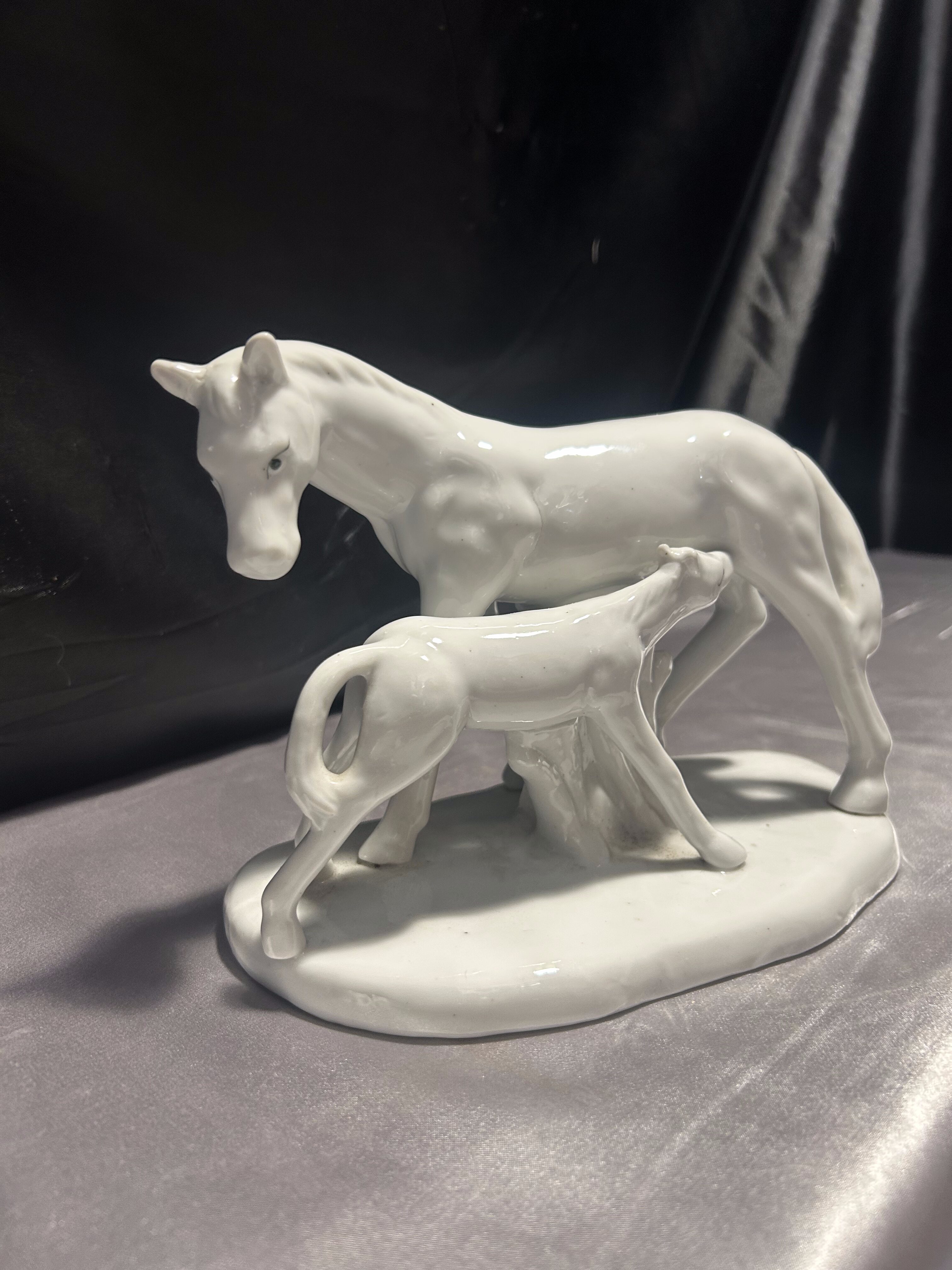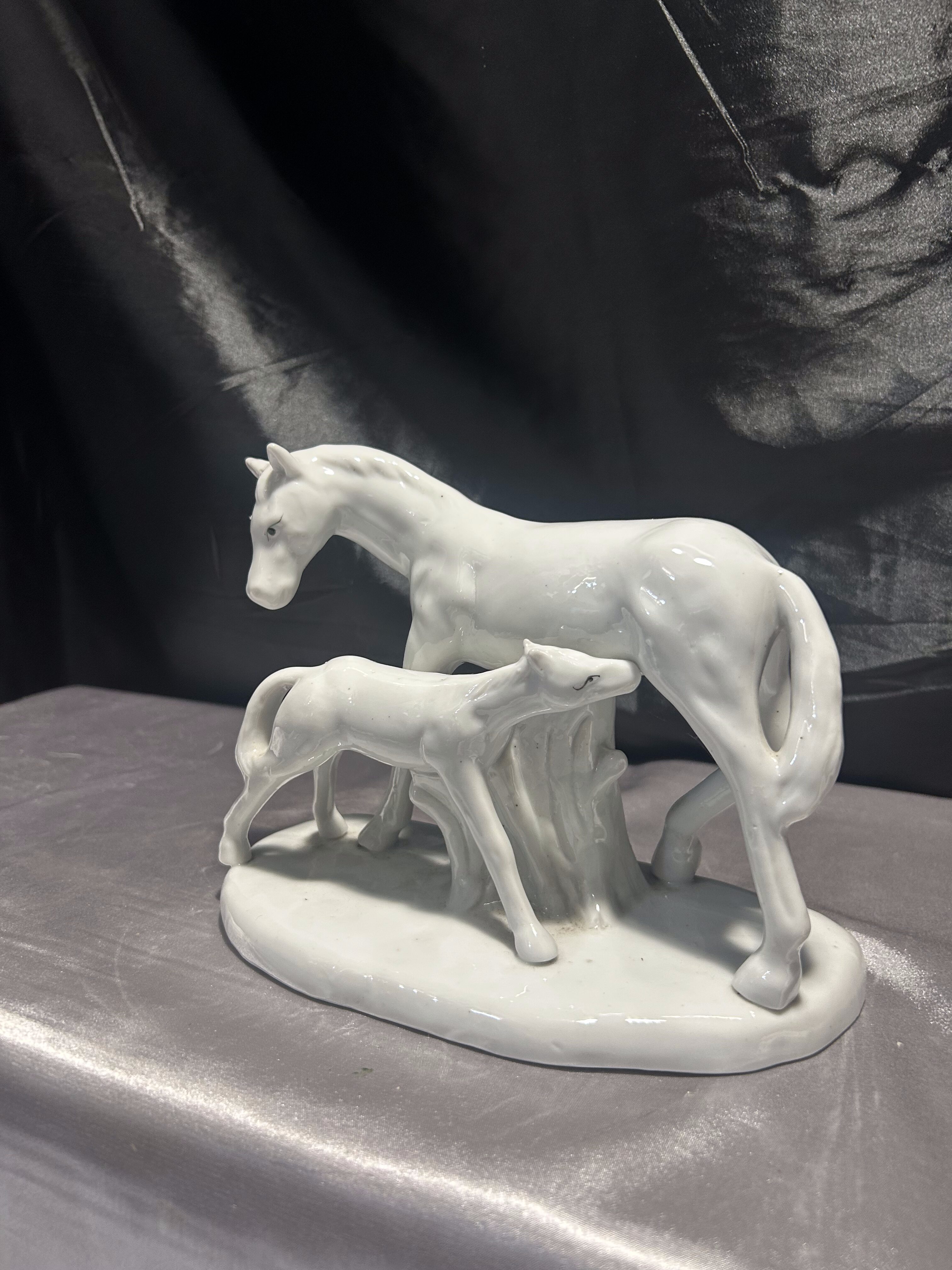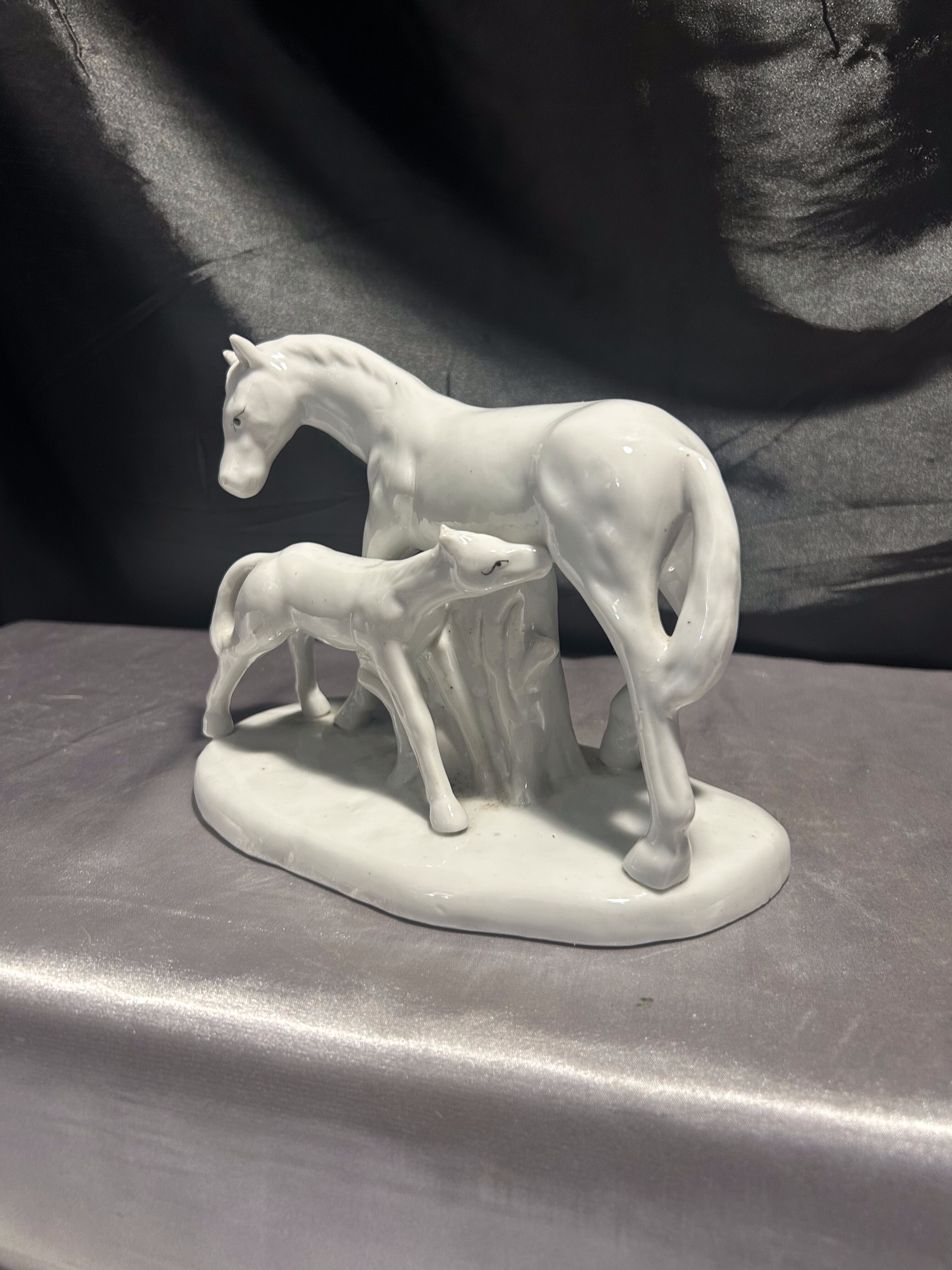 Figurka klaczy ze źrebakiem – porcelana biała – scena rodzinna