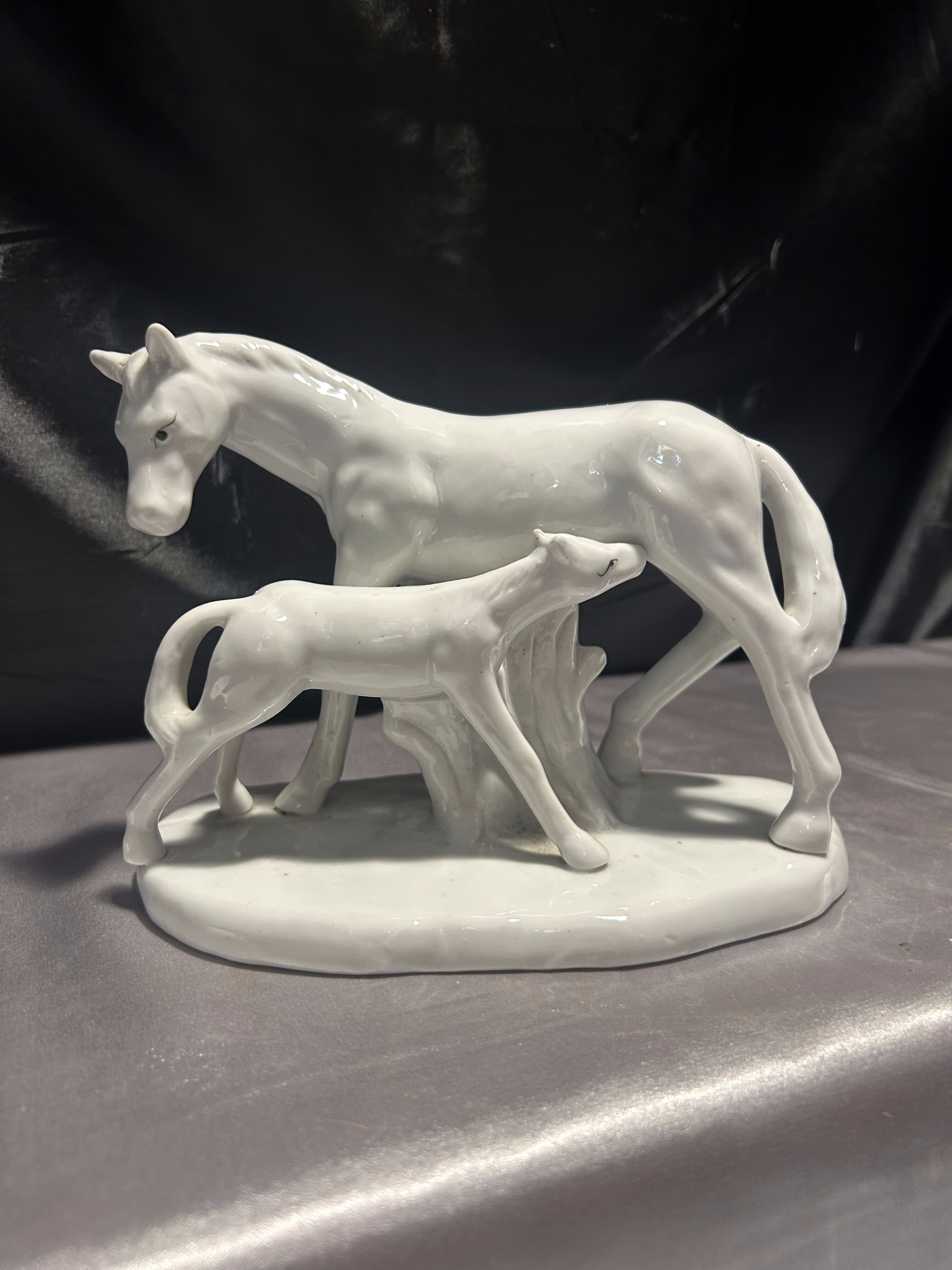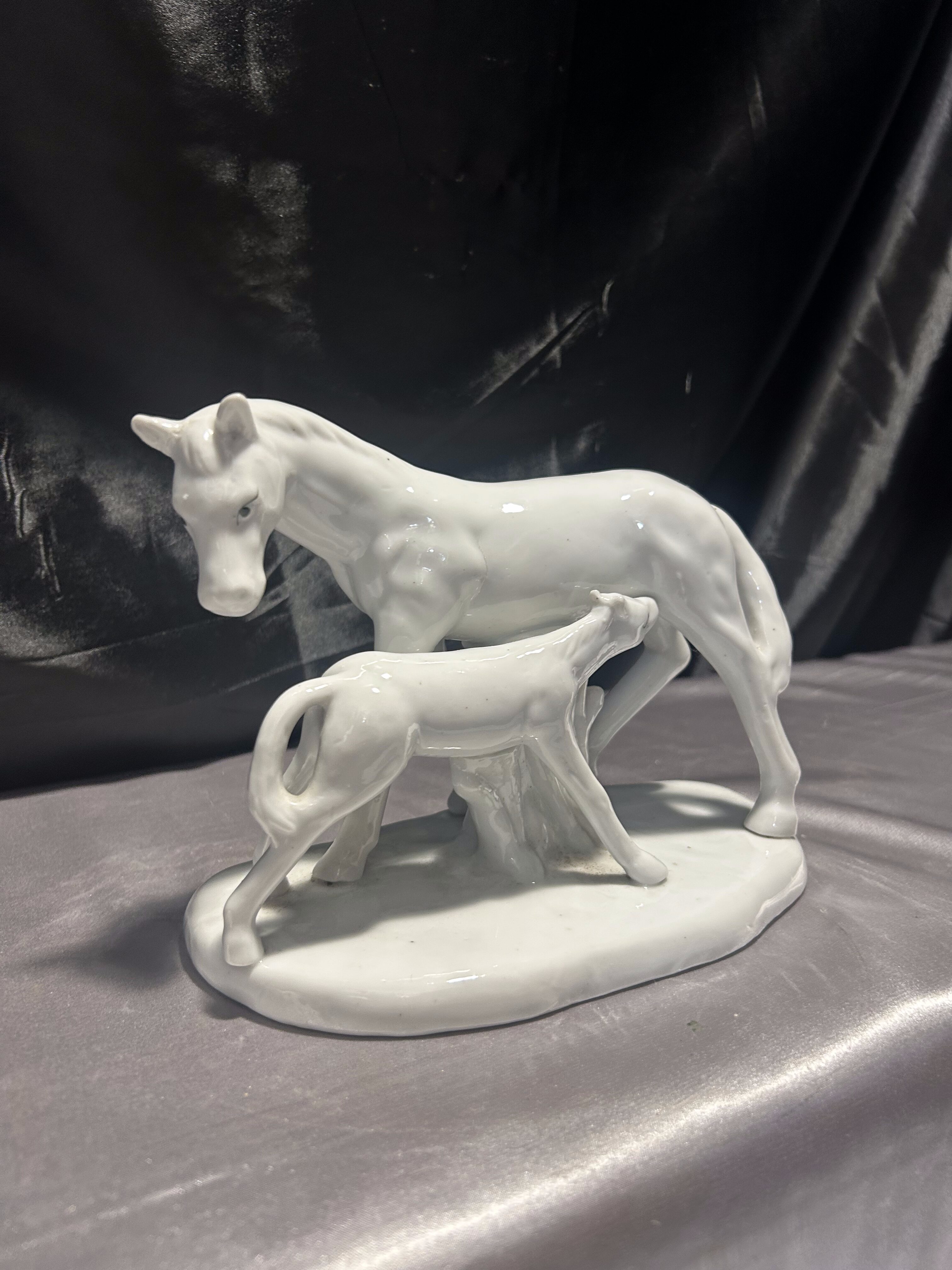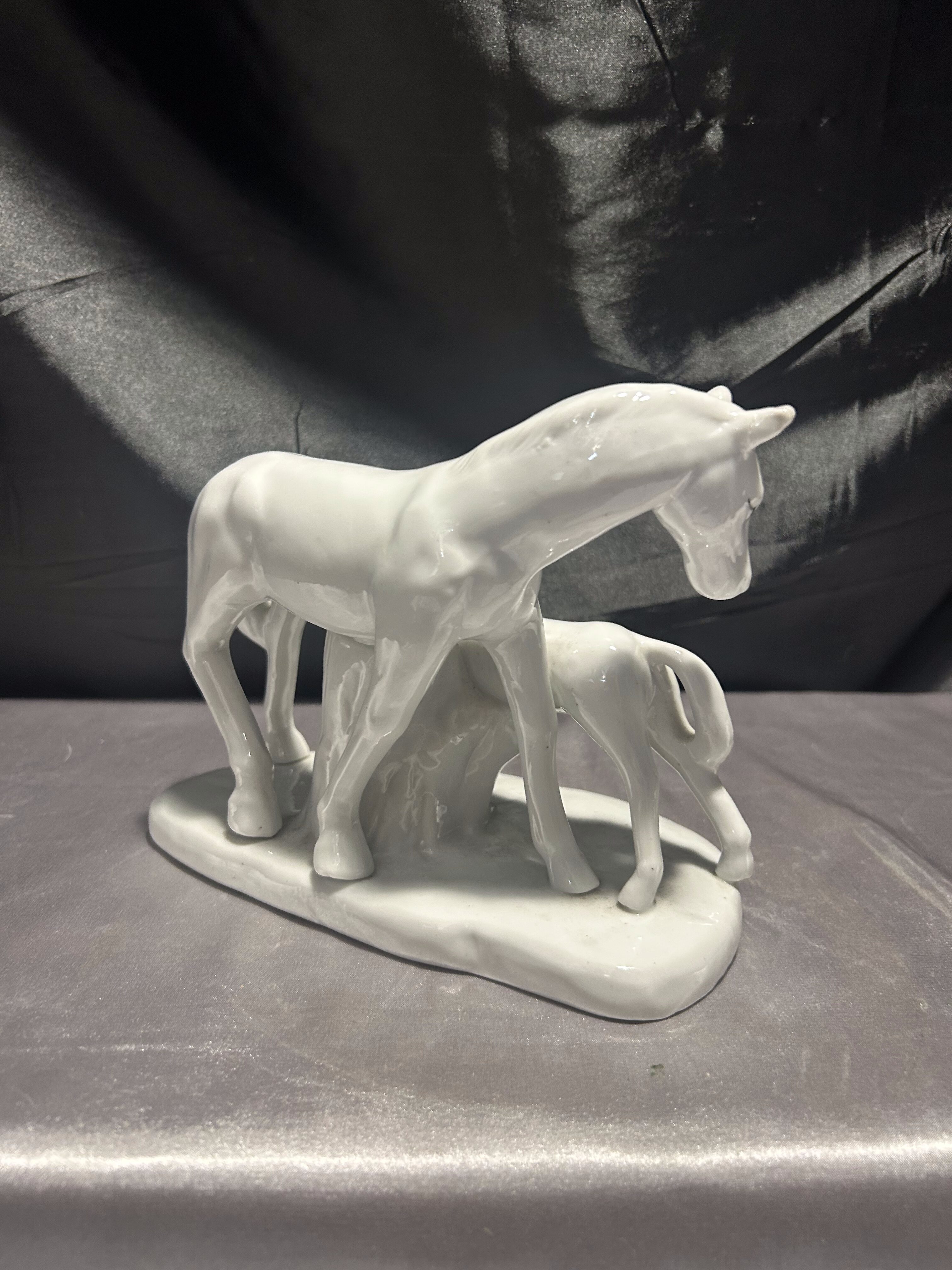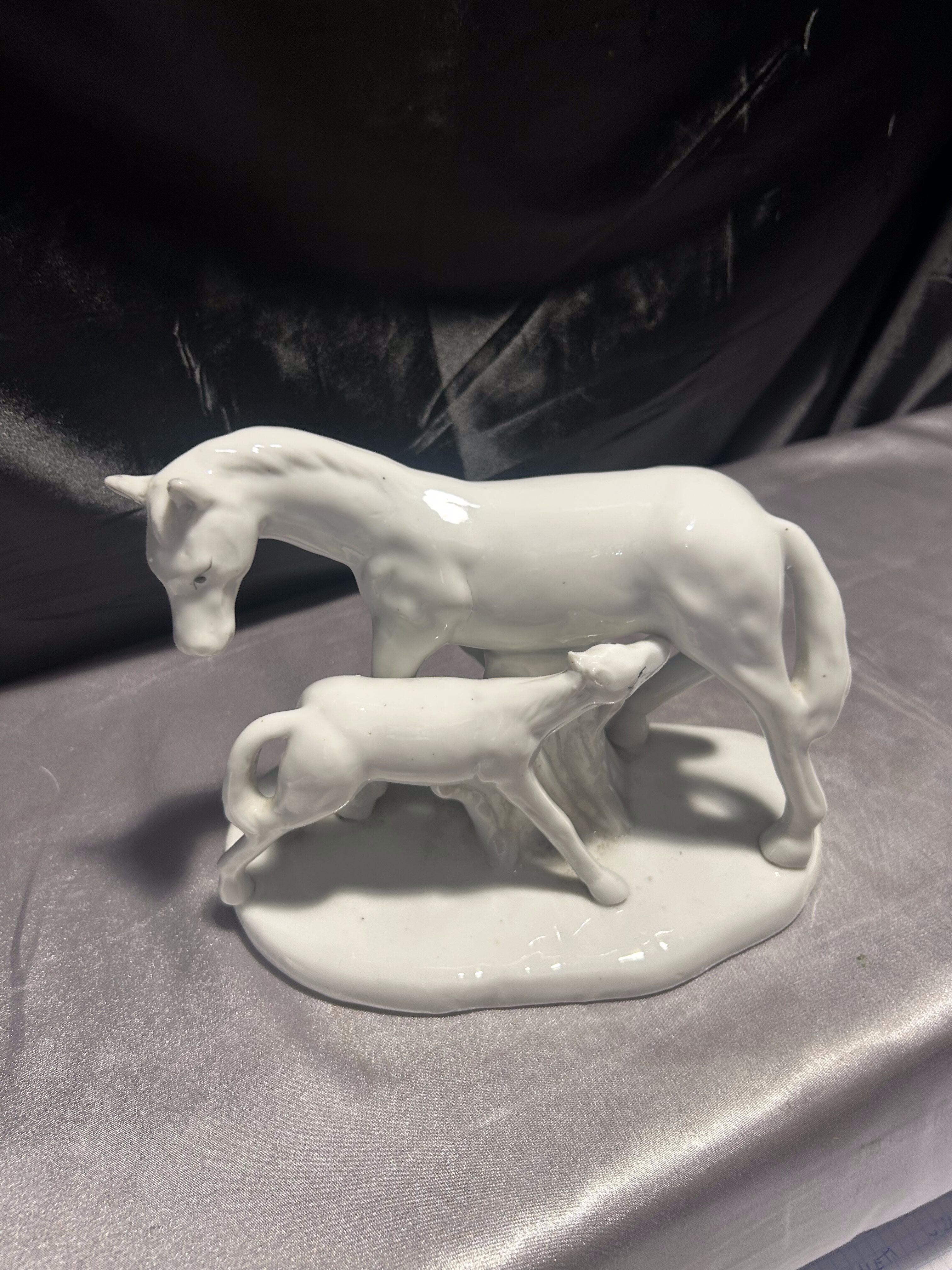 Figurka klaczy ze źrebakiem – porcelana biała – scena rodzinna