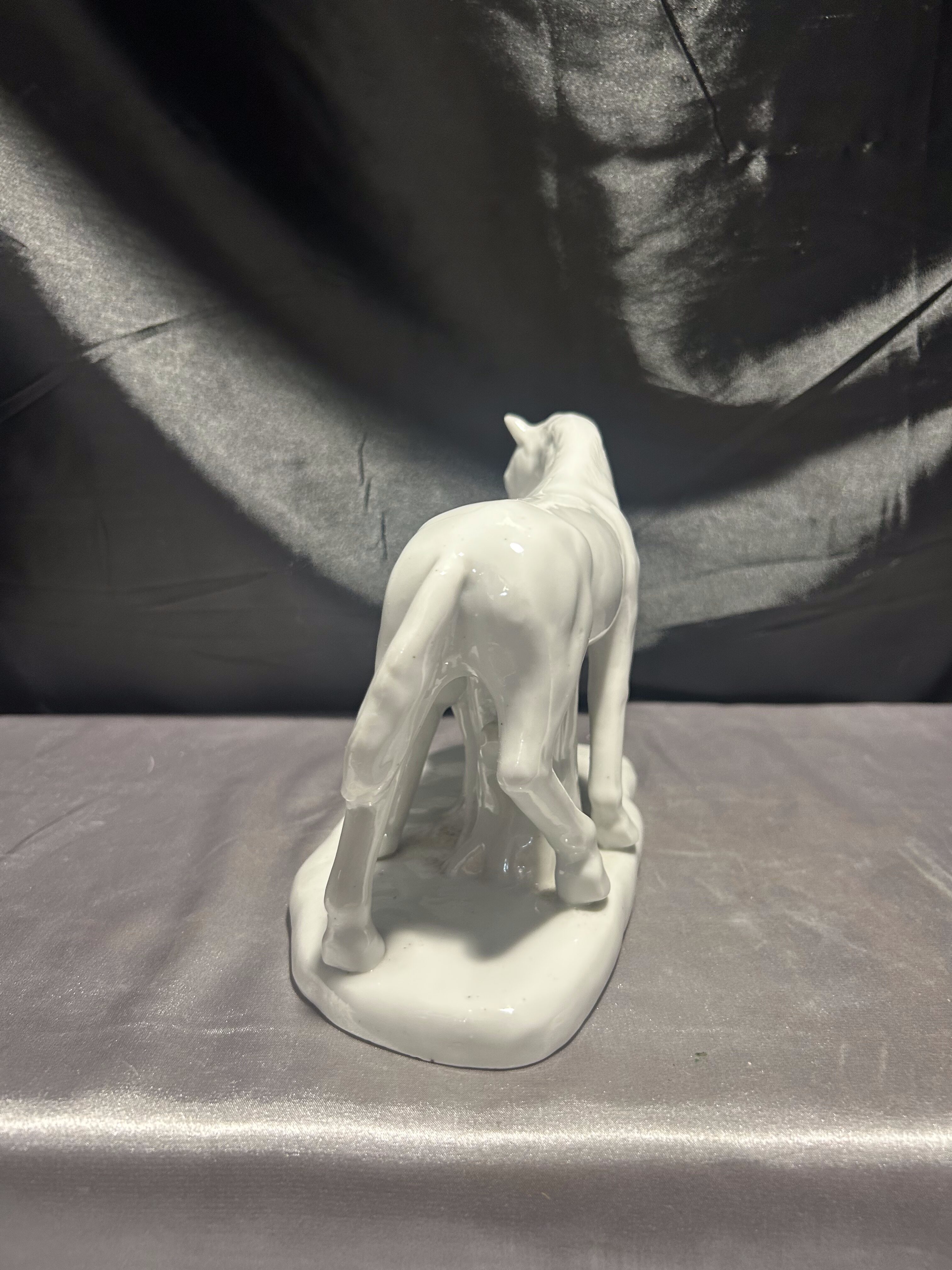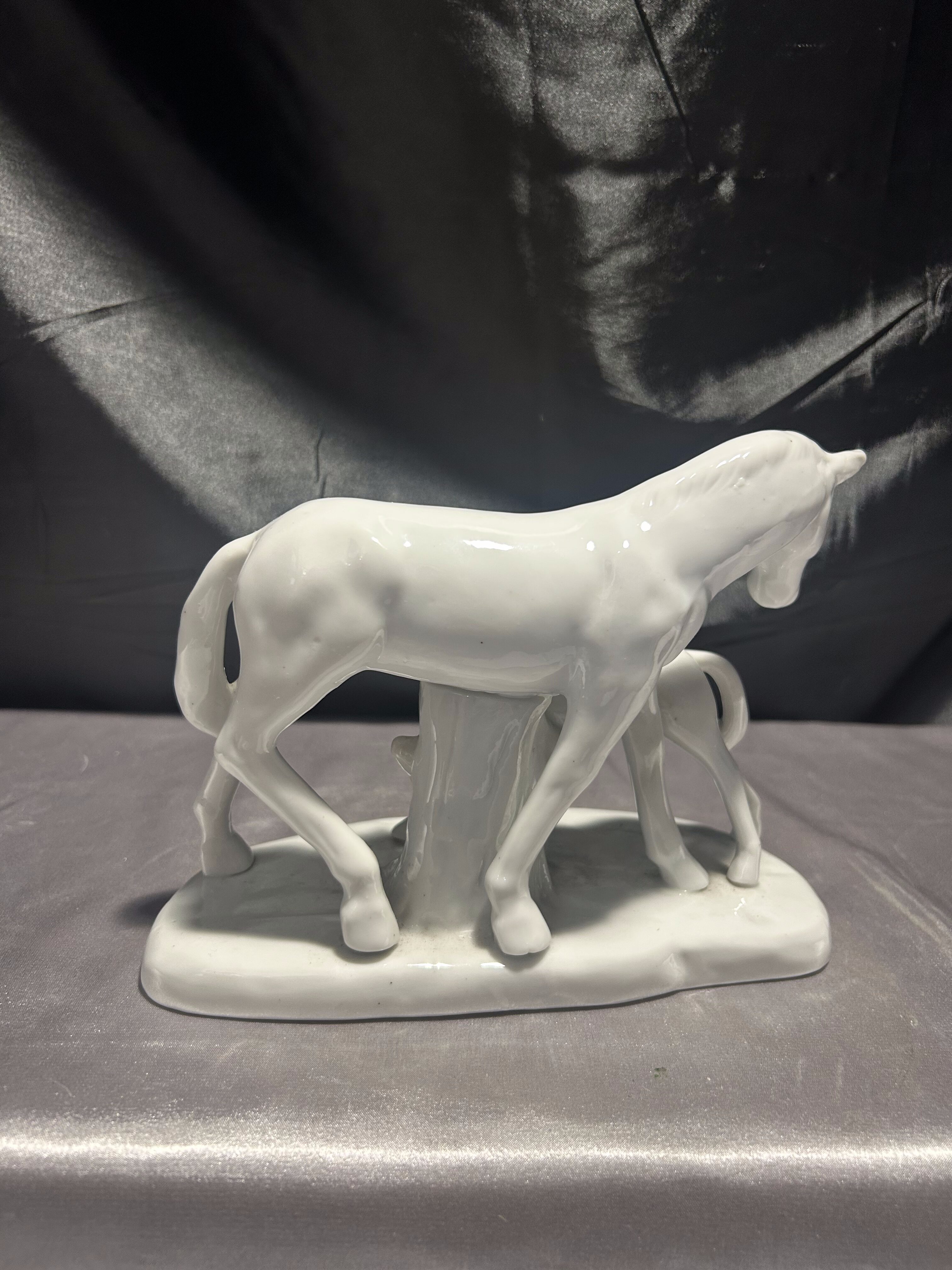 Poruszająca w swej prostocie figurka przedstawiająca klacz z pochylonym źrebakiem, utrzymana w klasycznej, białej porcelanie szkliwionej. Delikatna rzeźba uchwyciła moment bliskości i opieki matki nad młodym koniem – to scena, która emanuje spokojem, czułością i naturalnym pięknem.
