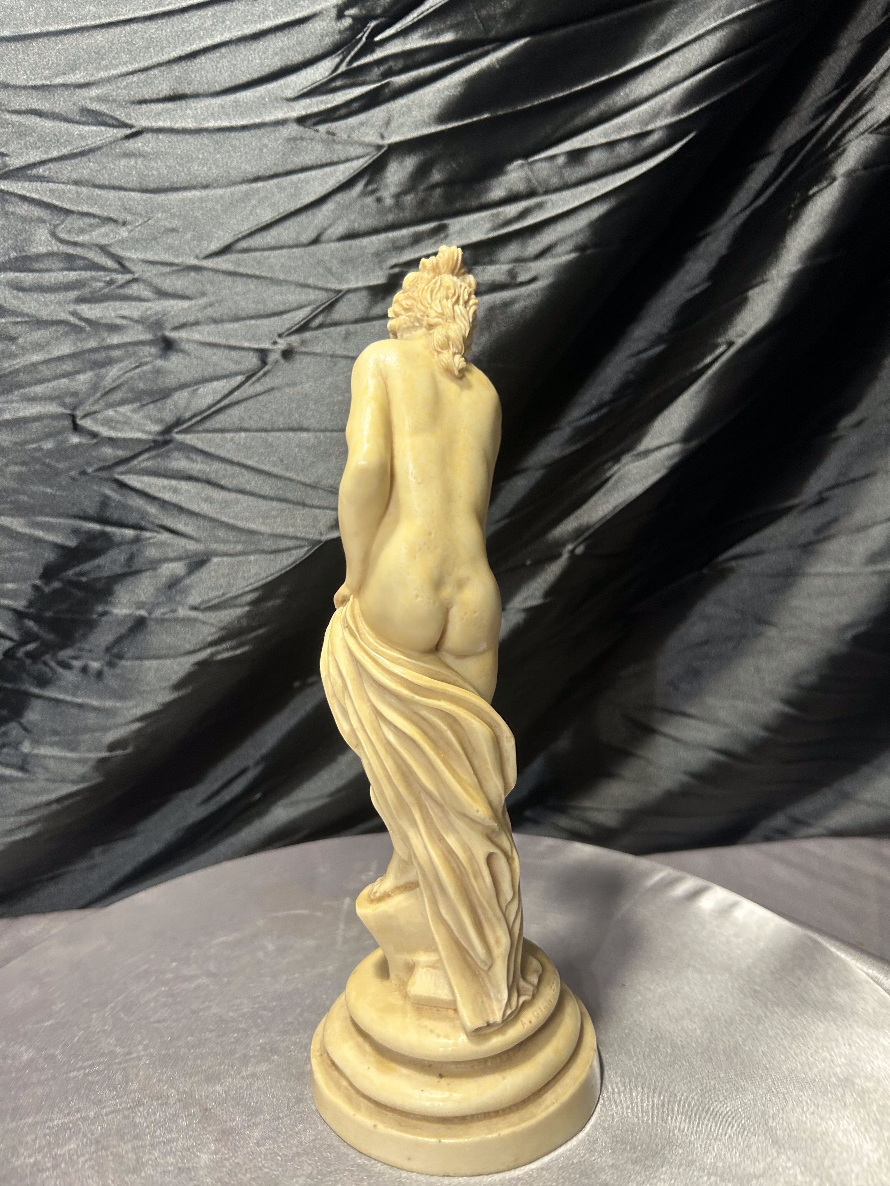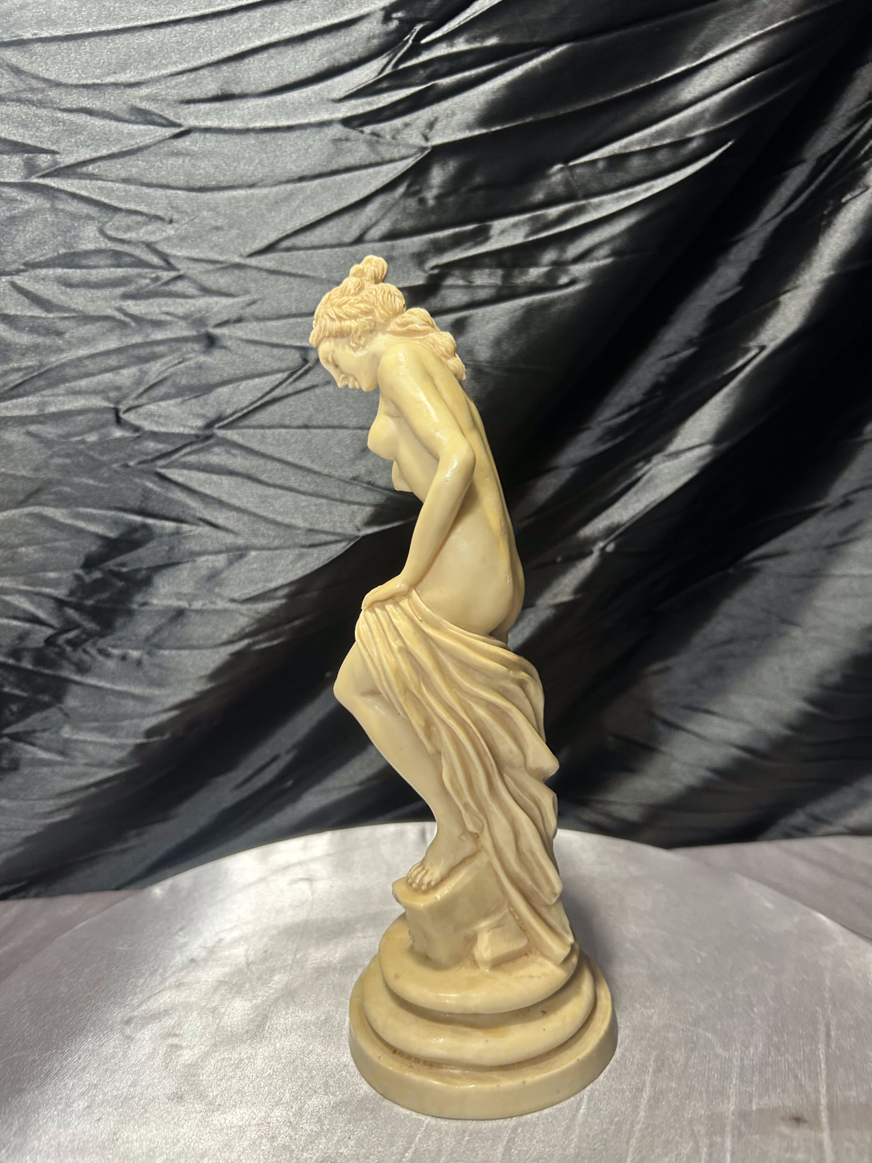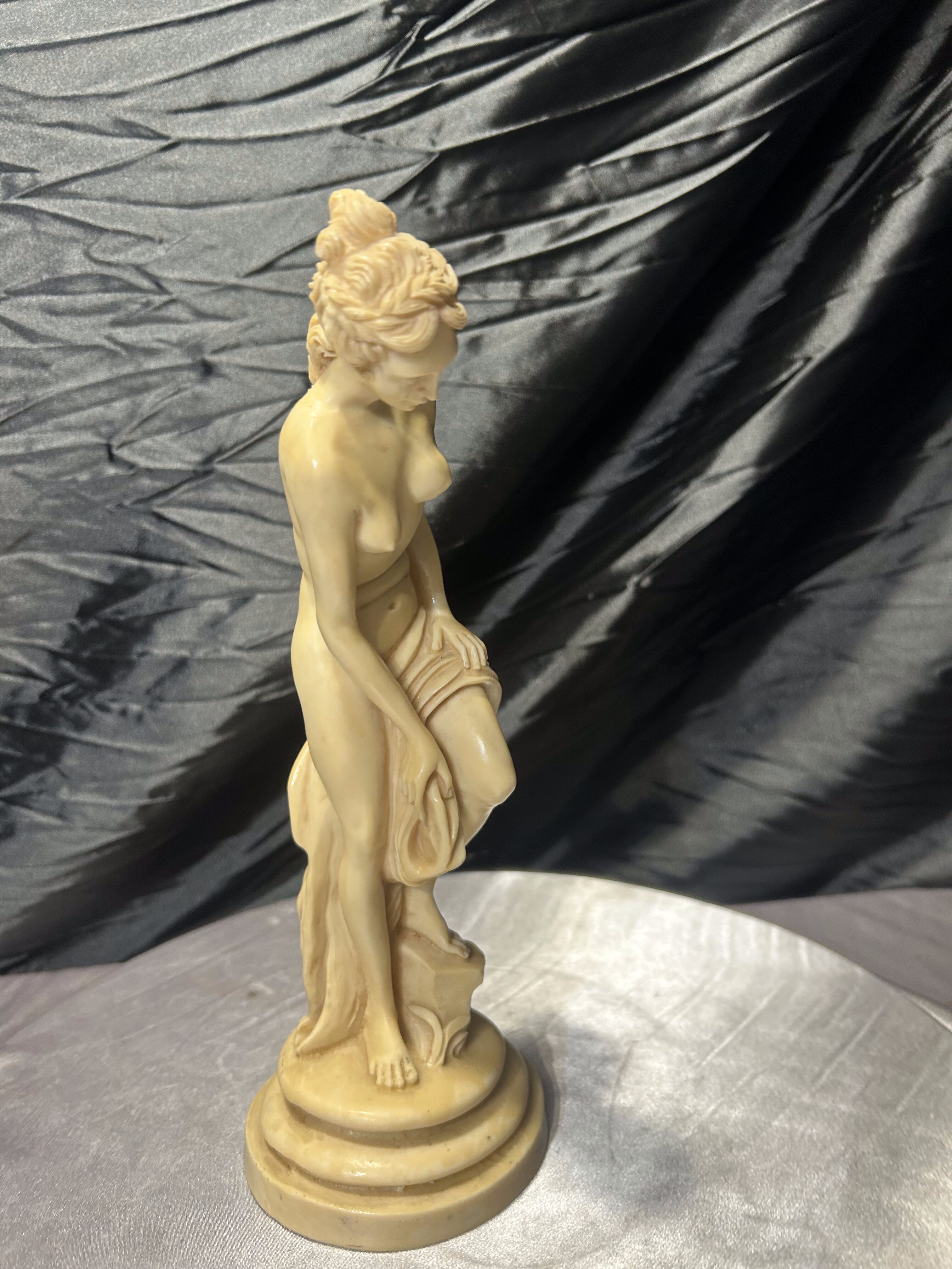 Piękna dekoracyjna figurka przedstawiająca kobietę w delikatnym, klasycznym akcie, inspirowana antyczną estetyką. Rzeźba wykonana z kompozytu alabastrowo-żywicznego, popularnego w drugiej połowie XX wieku, który pozwala na uzyskanie subtelnych detali i gładkiego wykończenia. Model nawiązuje do motywów Wenus i klasycznych przedstawień kobiecej sylwetki, dzięki czemu stanowi elegancką ozdobę wnętrza, wprowadzając nutę artystycznego charakteru.