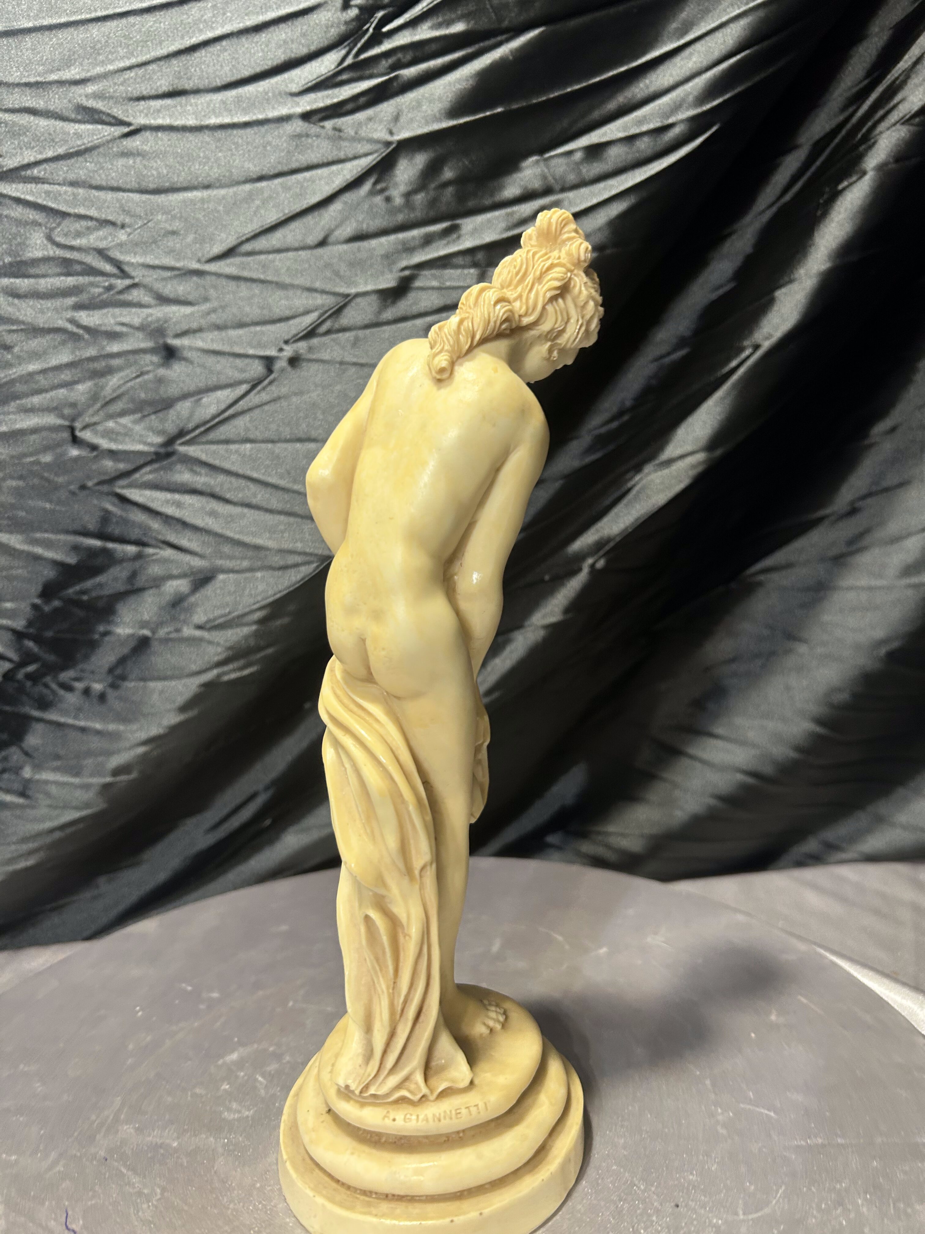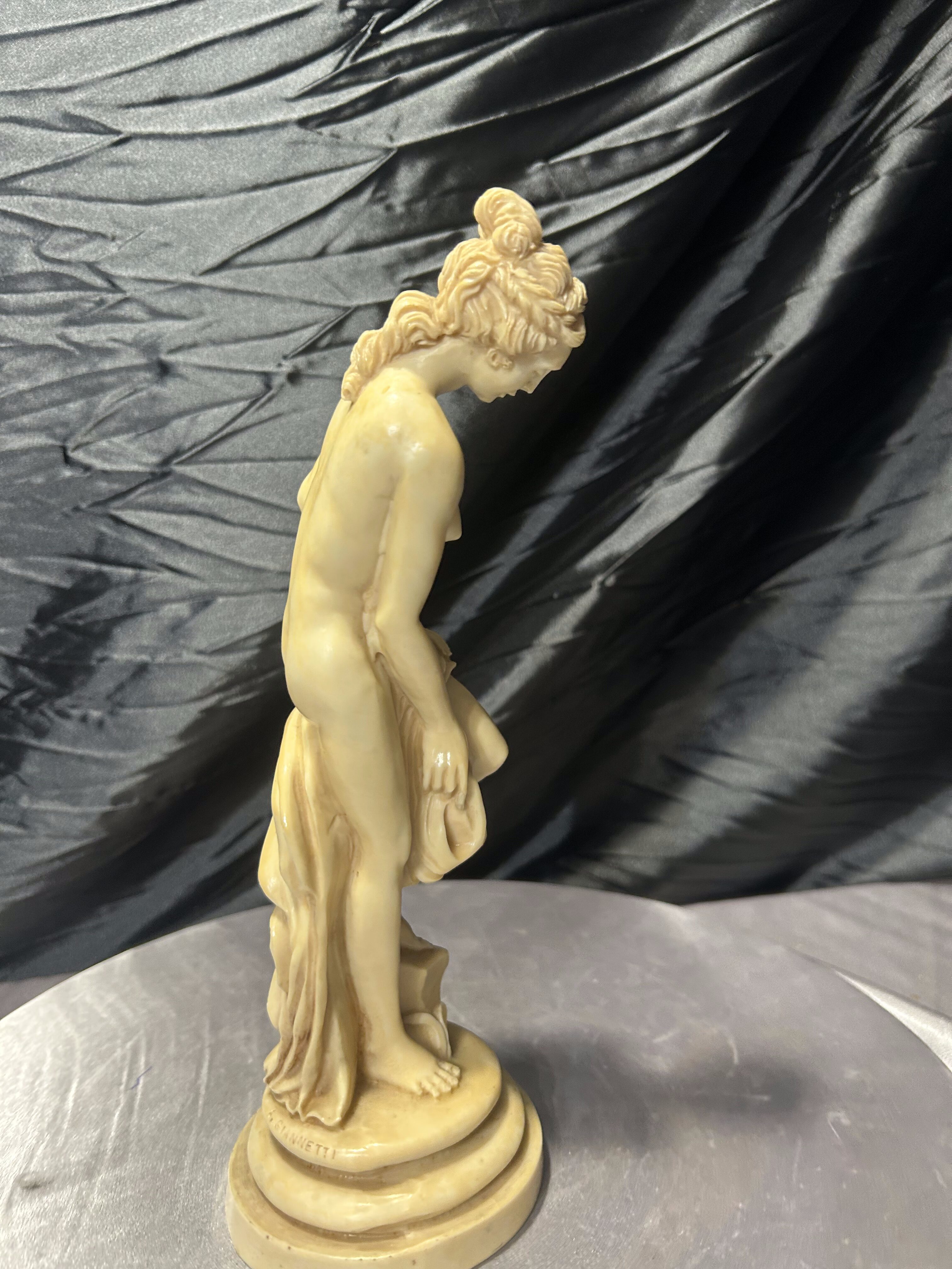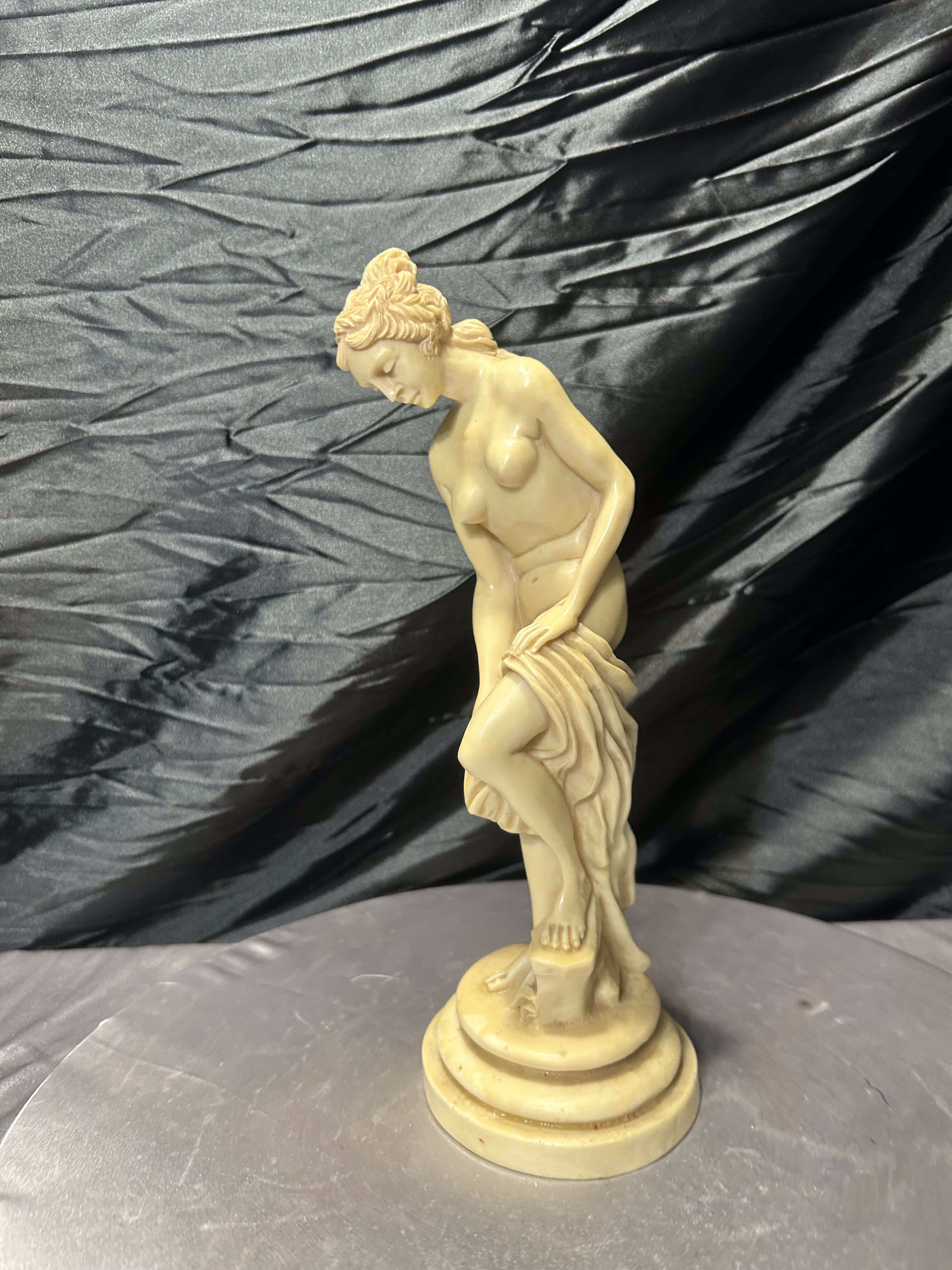 Piękna dekoracyjna figurka przedstawiająca kobietę w delikatnym, klasycznym akcie, inspirowana antyczną estetyką. Rzeźba wykonana z kompozytu alabastrowo-żywicznego, popularnego w drugiej połowie XX wieku, który pozwala na uzyskanie subtelnych detali i gładkiego wykończenia. Model nawiązuje do motywów Wenus i klasycznych przedstawień kobiecej sylwetki, dzięki czemu stanowi elegancką ozdobę wnętrza, wprowadzając nutę artystycznego charakteru.
