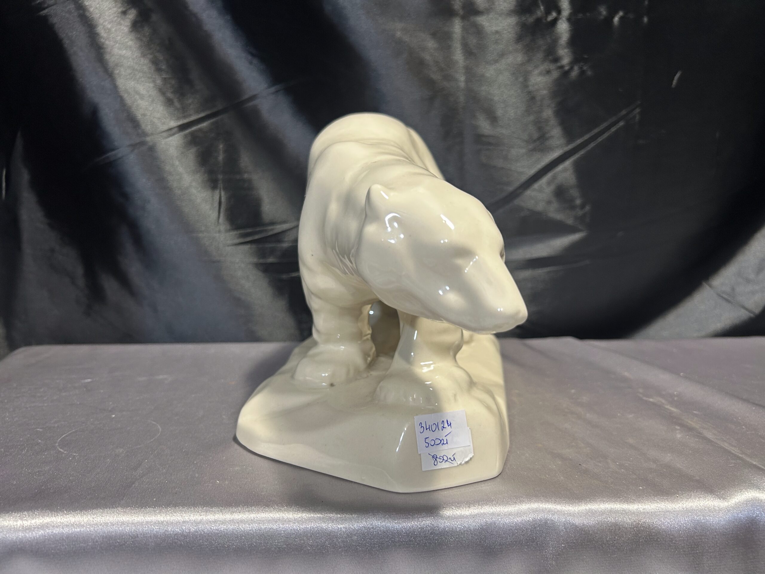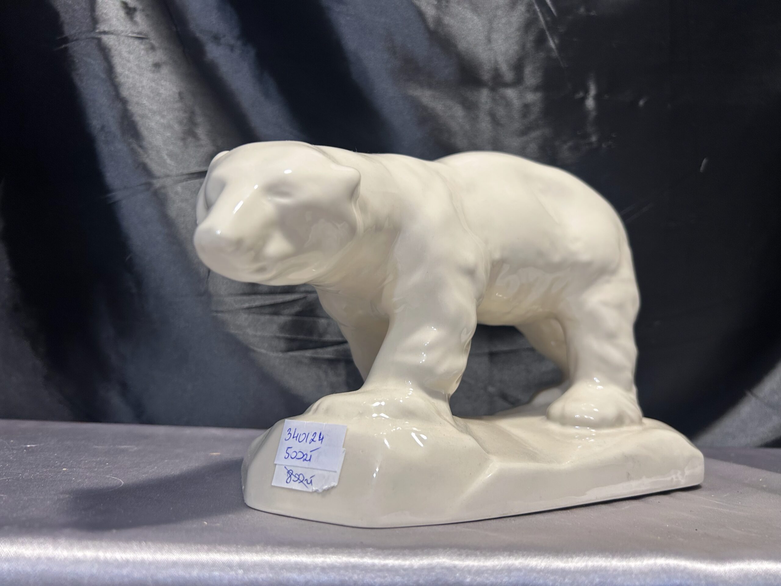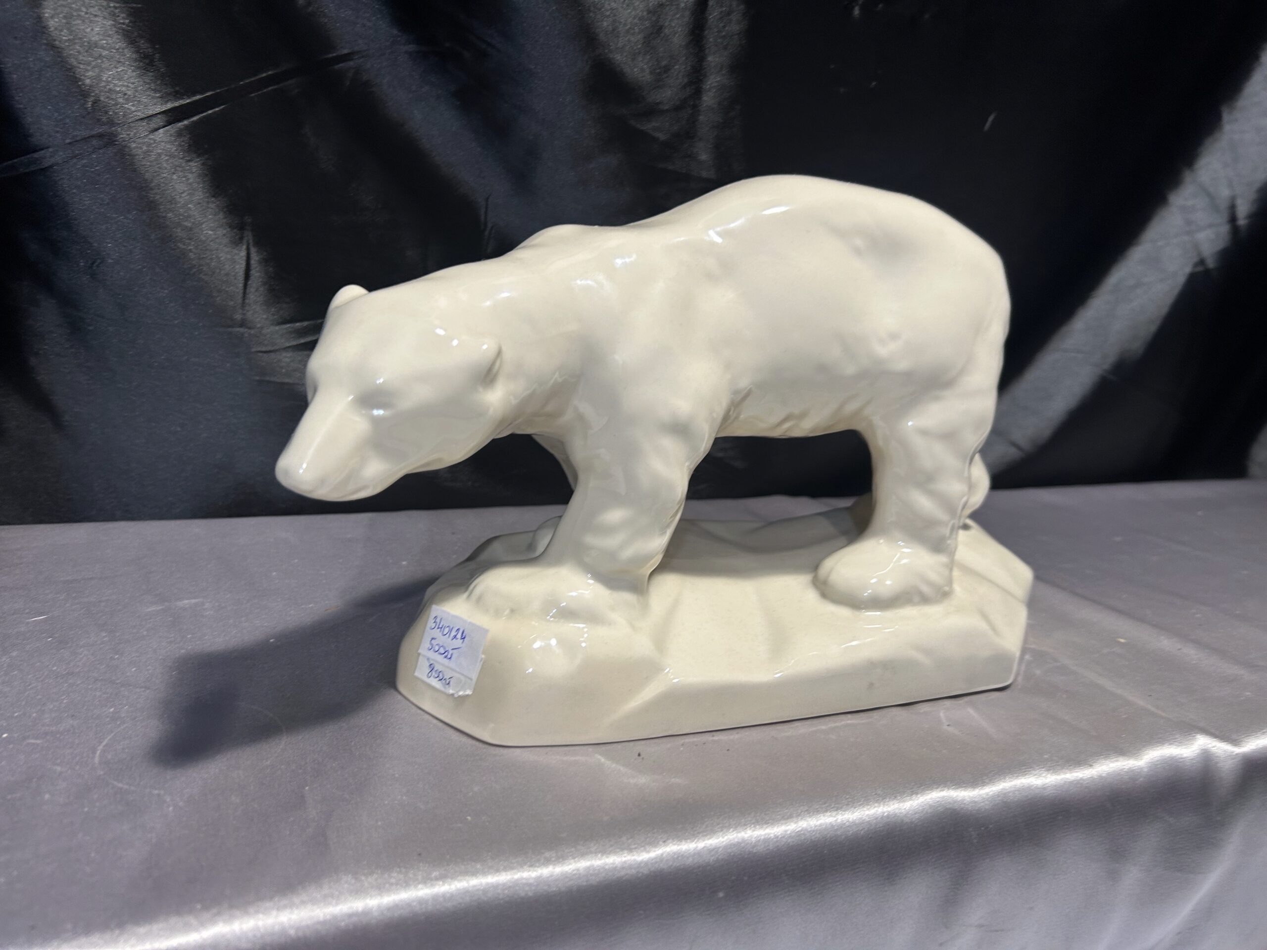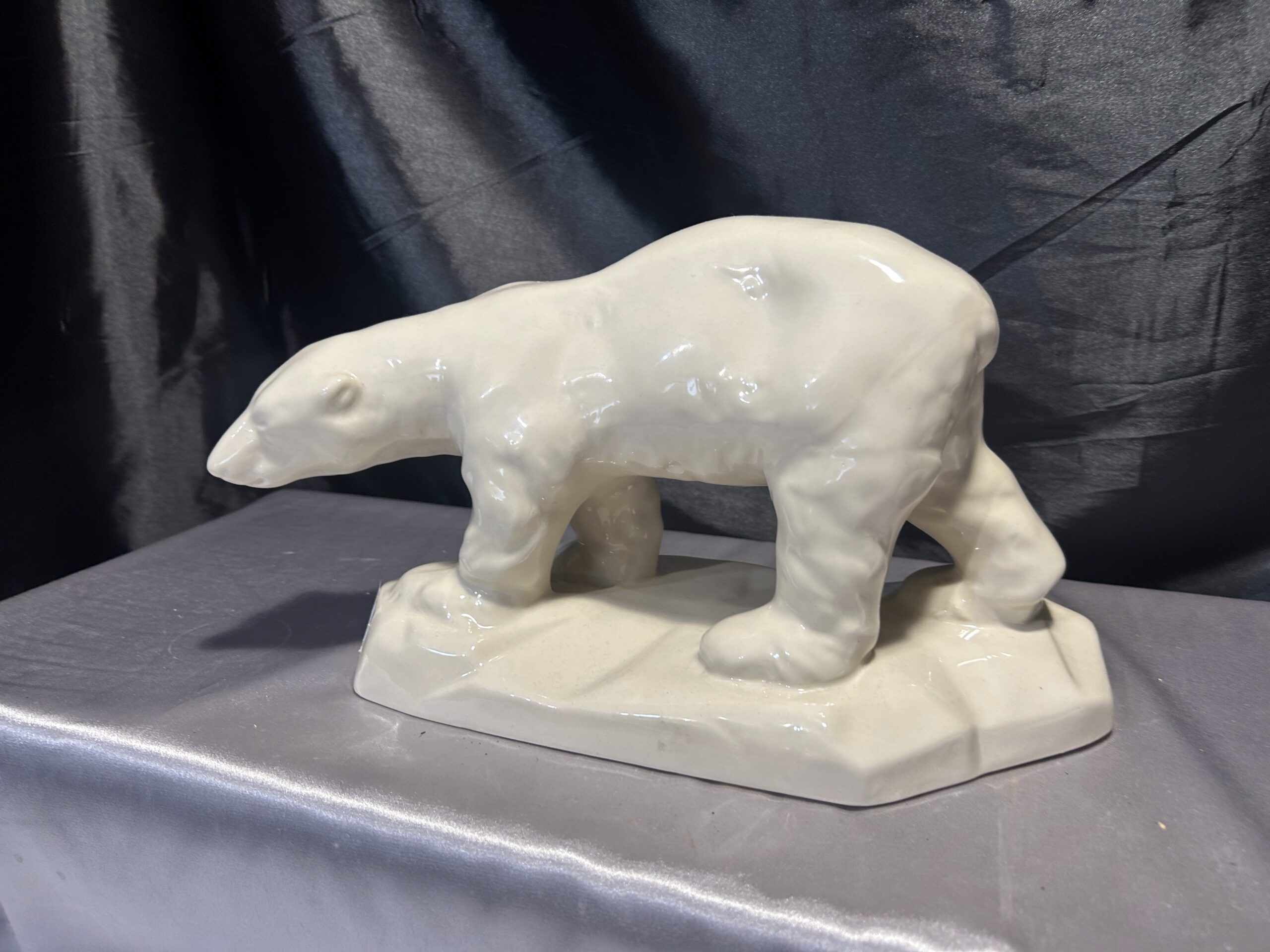 Realistyczna figurka przedstawiająca niedźwiedzia polarnego w kremowym kolorze, wykonana w latach 60-tych przez renomowaną fabrykę porcelany Chodzież. Sygnowana „Made in Poland”, jest wyjątkowym przykładem polskiego rzemiosła artystycznego.