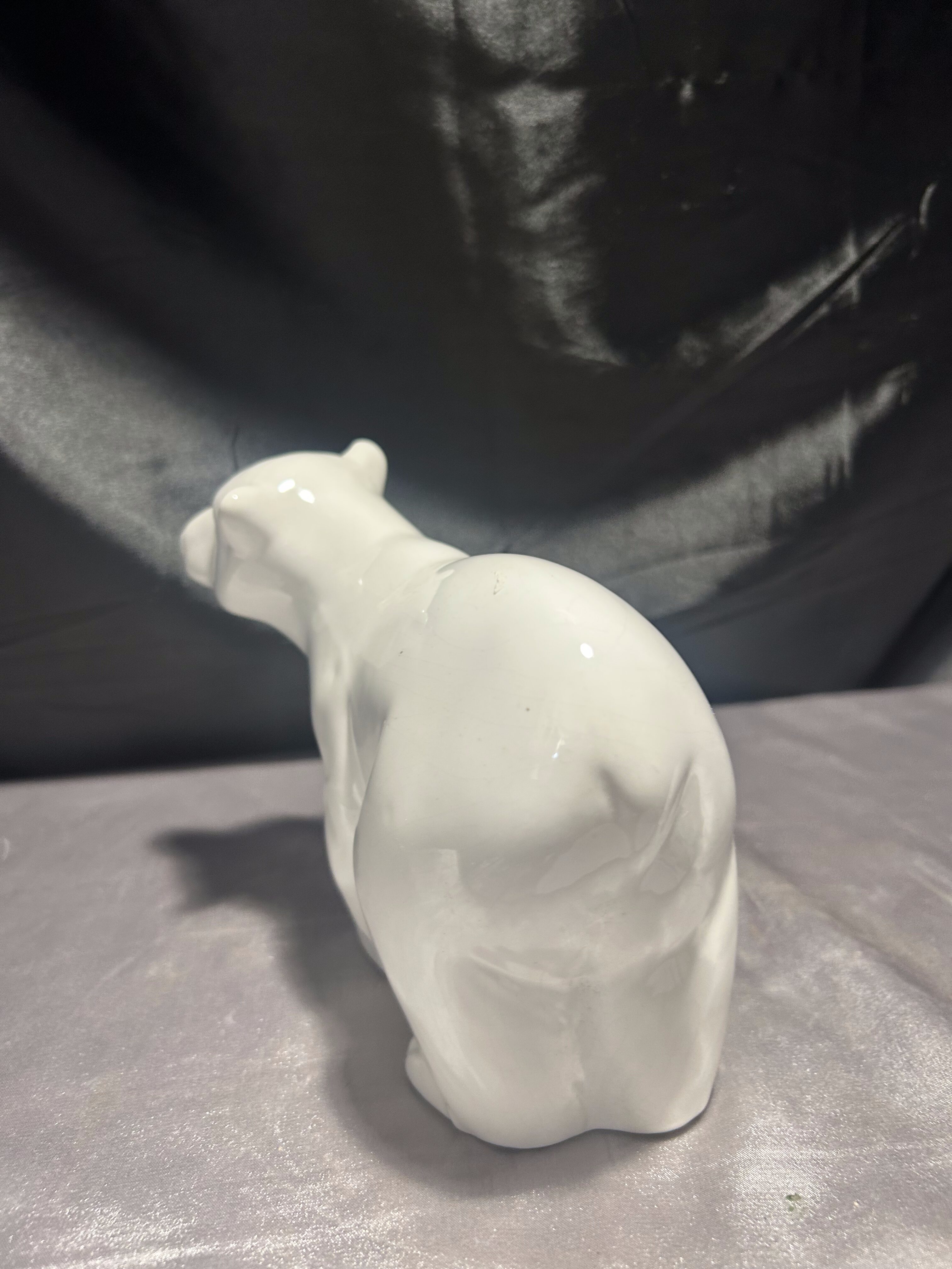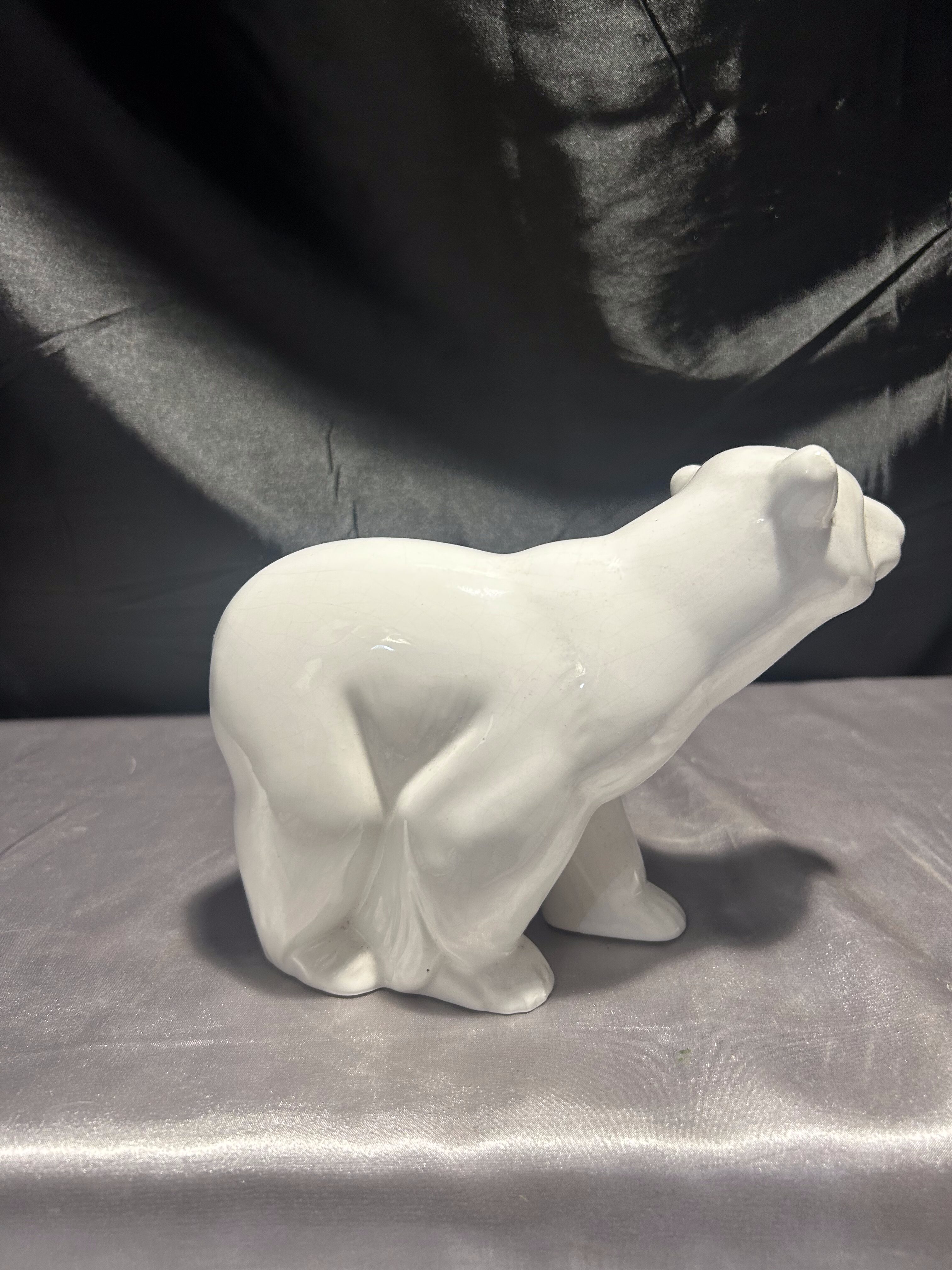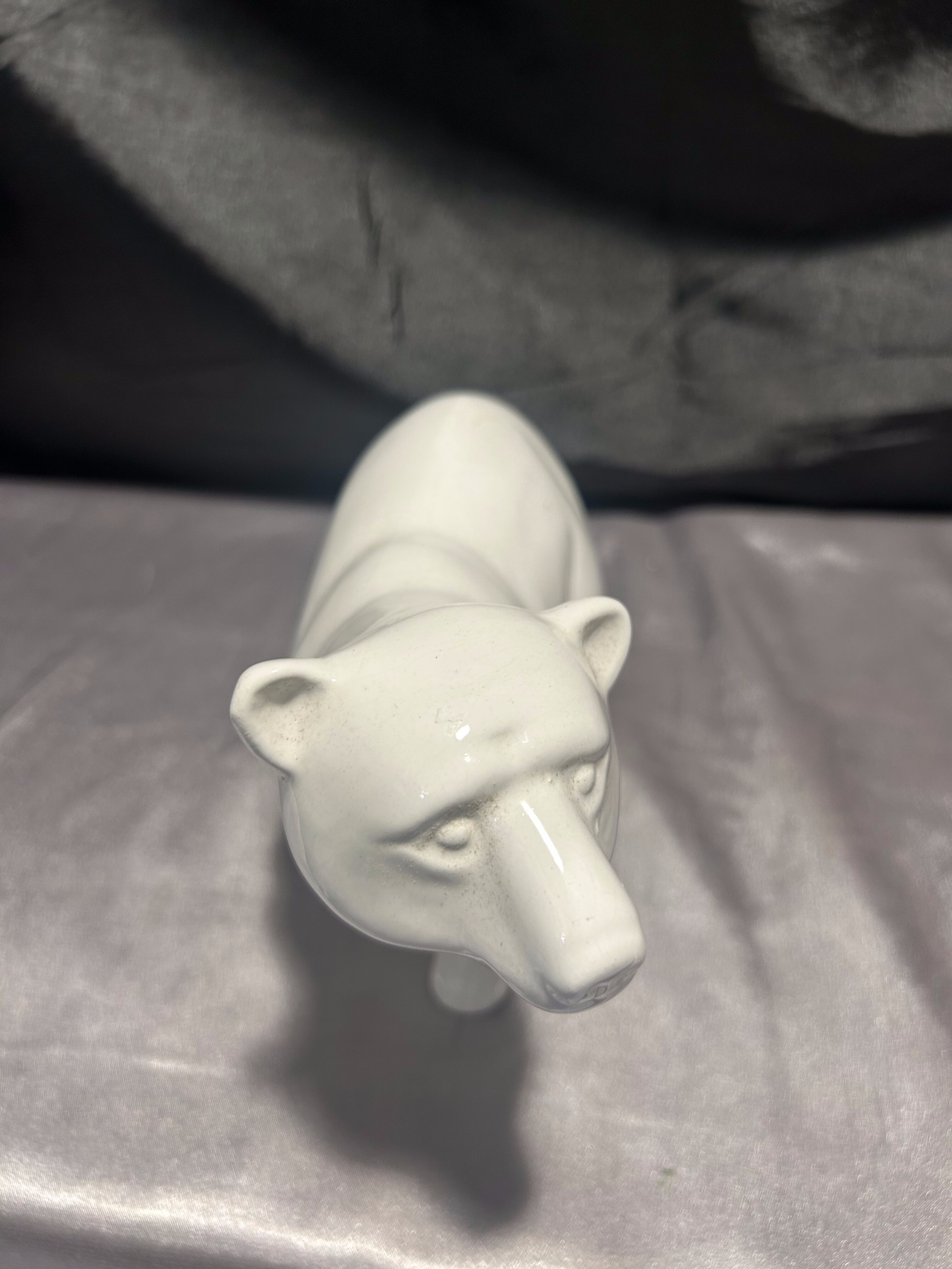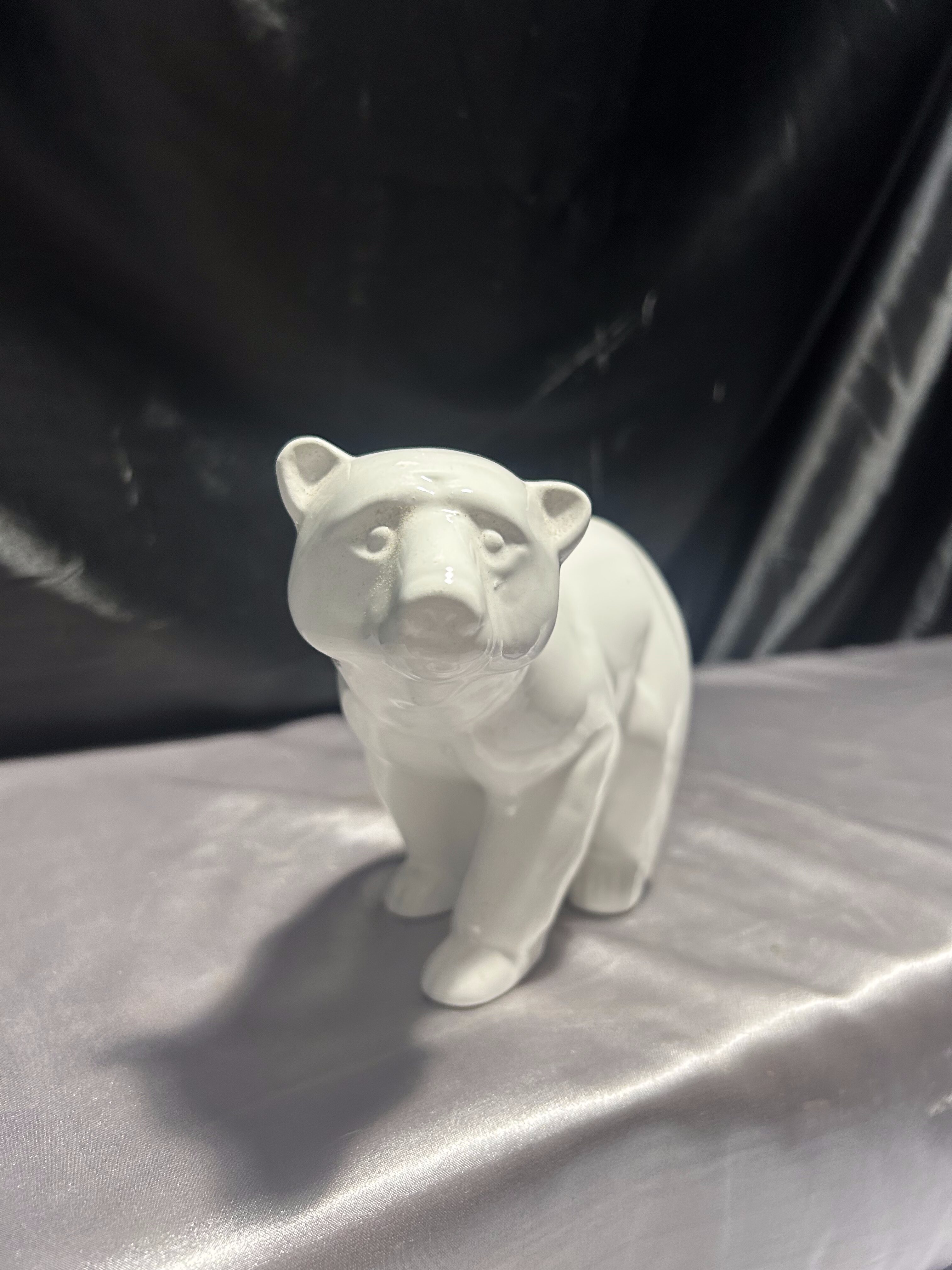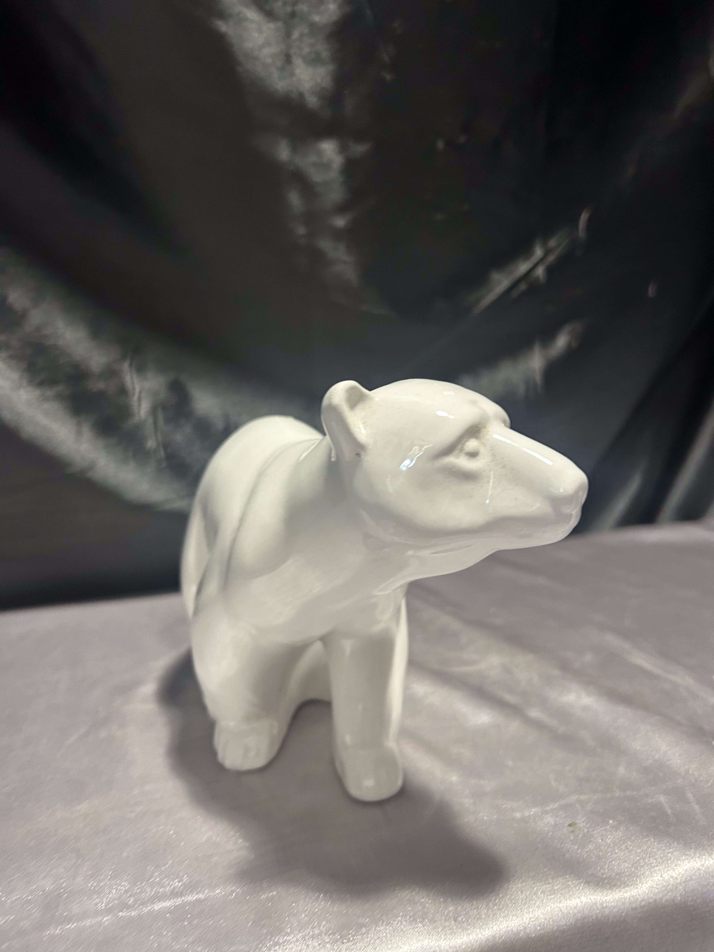 Stylowa figurka przedstawiająca niedźwiedzia, wykonana z białej, szkliwionej porcelany. Rzeźba ukazuje zwierzę w dynamicznej, lekko pochylonej pozie, z dbałością o naturalne proporcje i wyważoną sylwetkę.