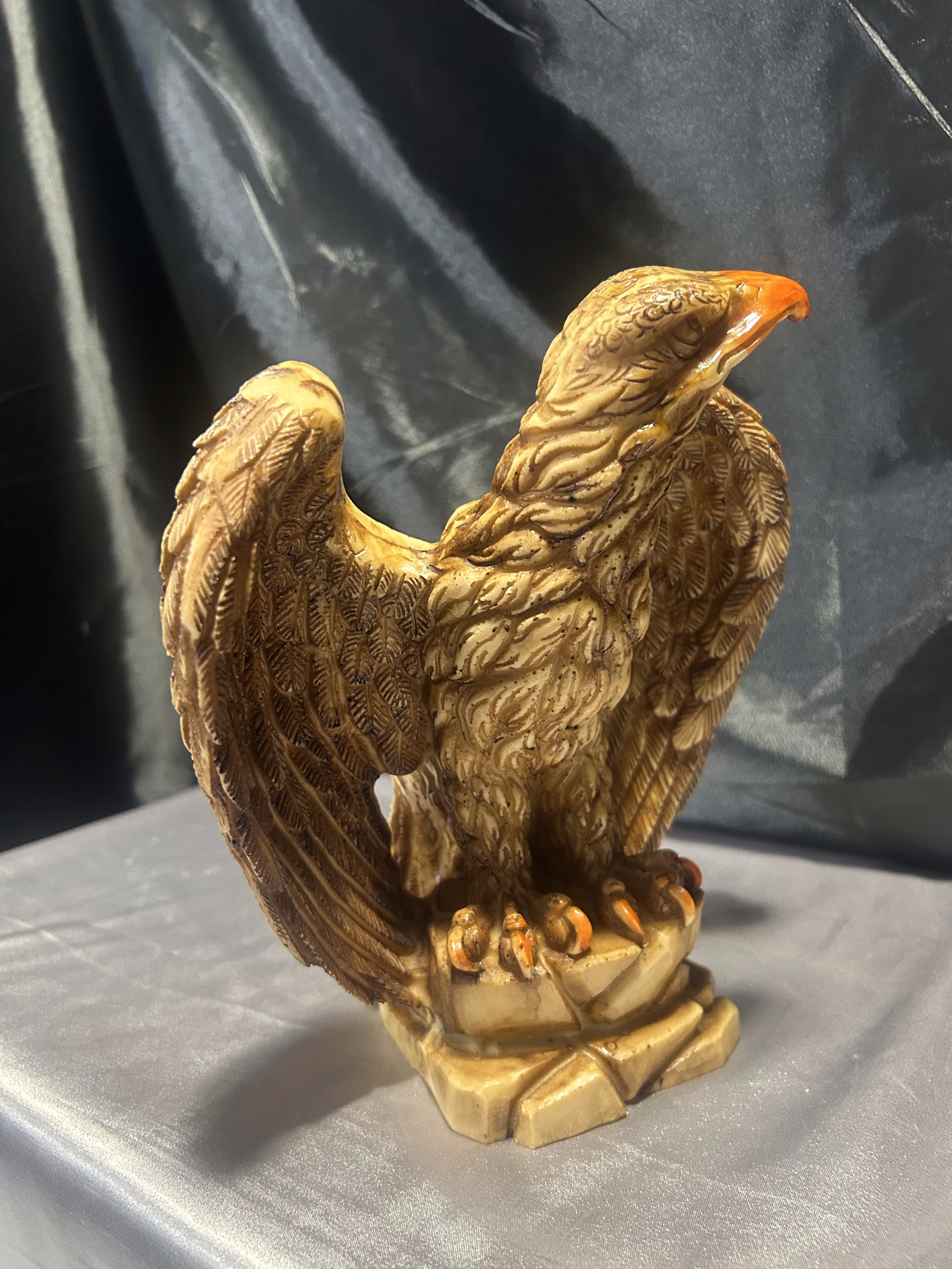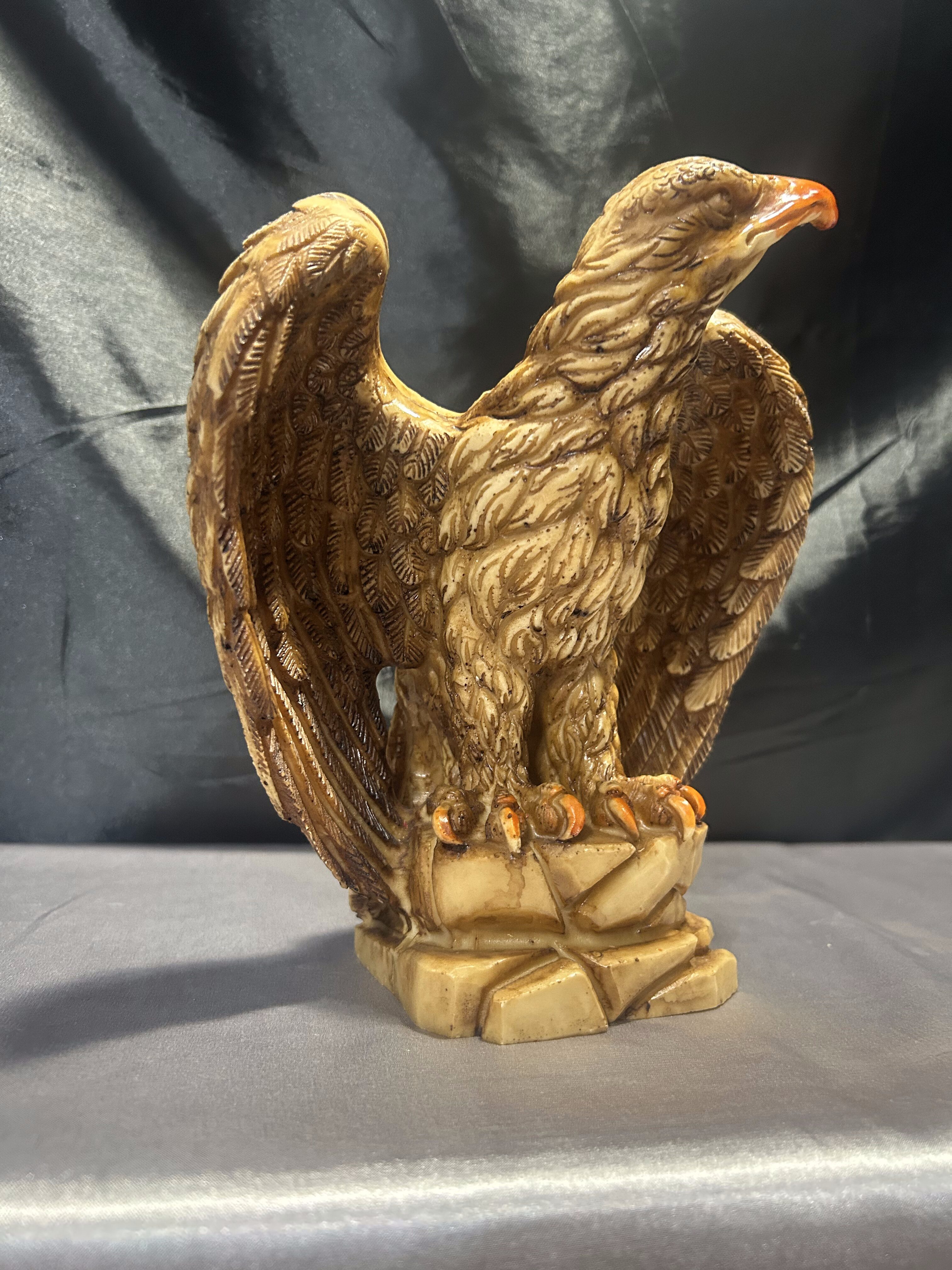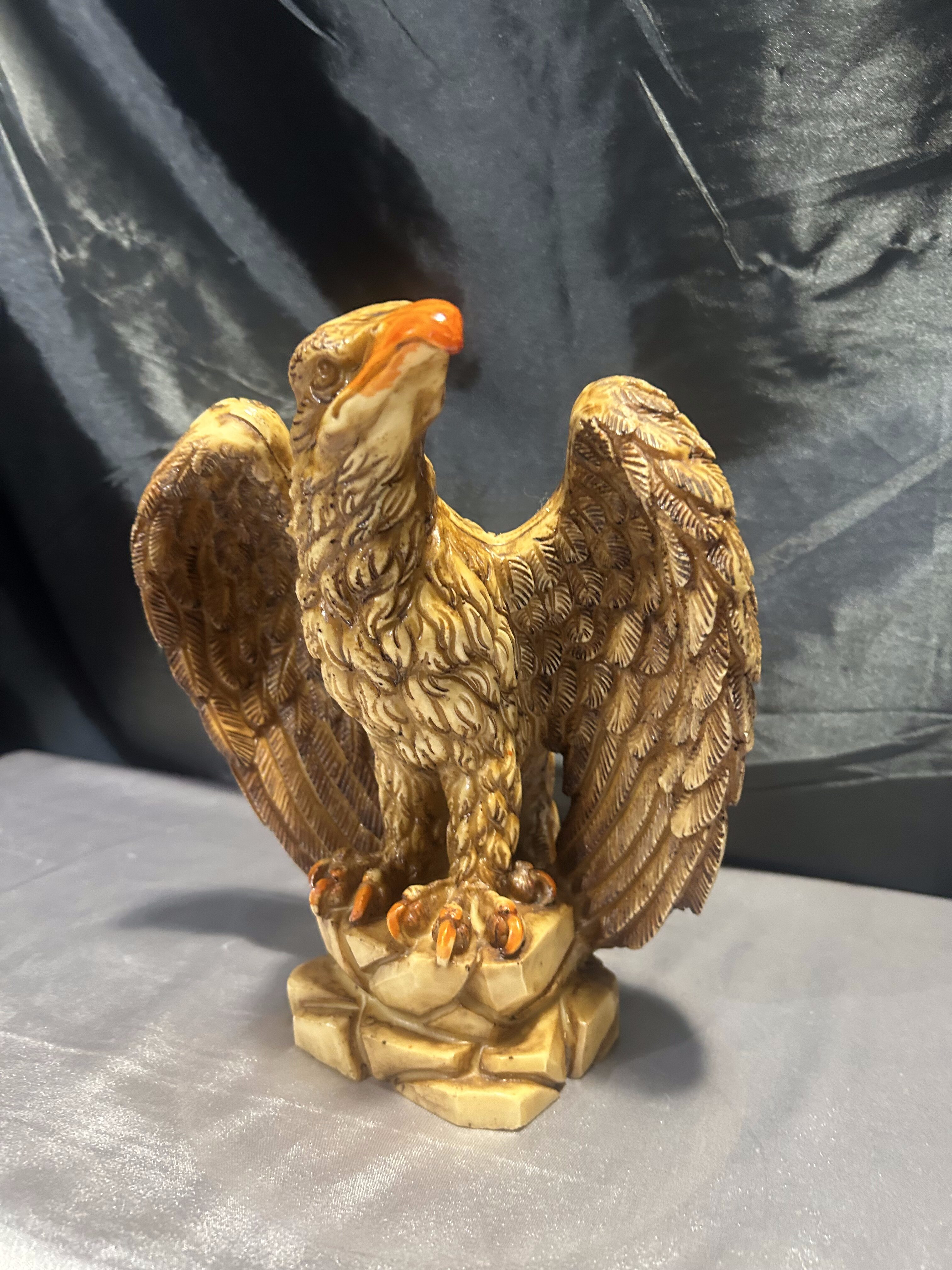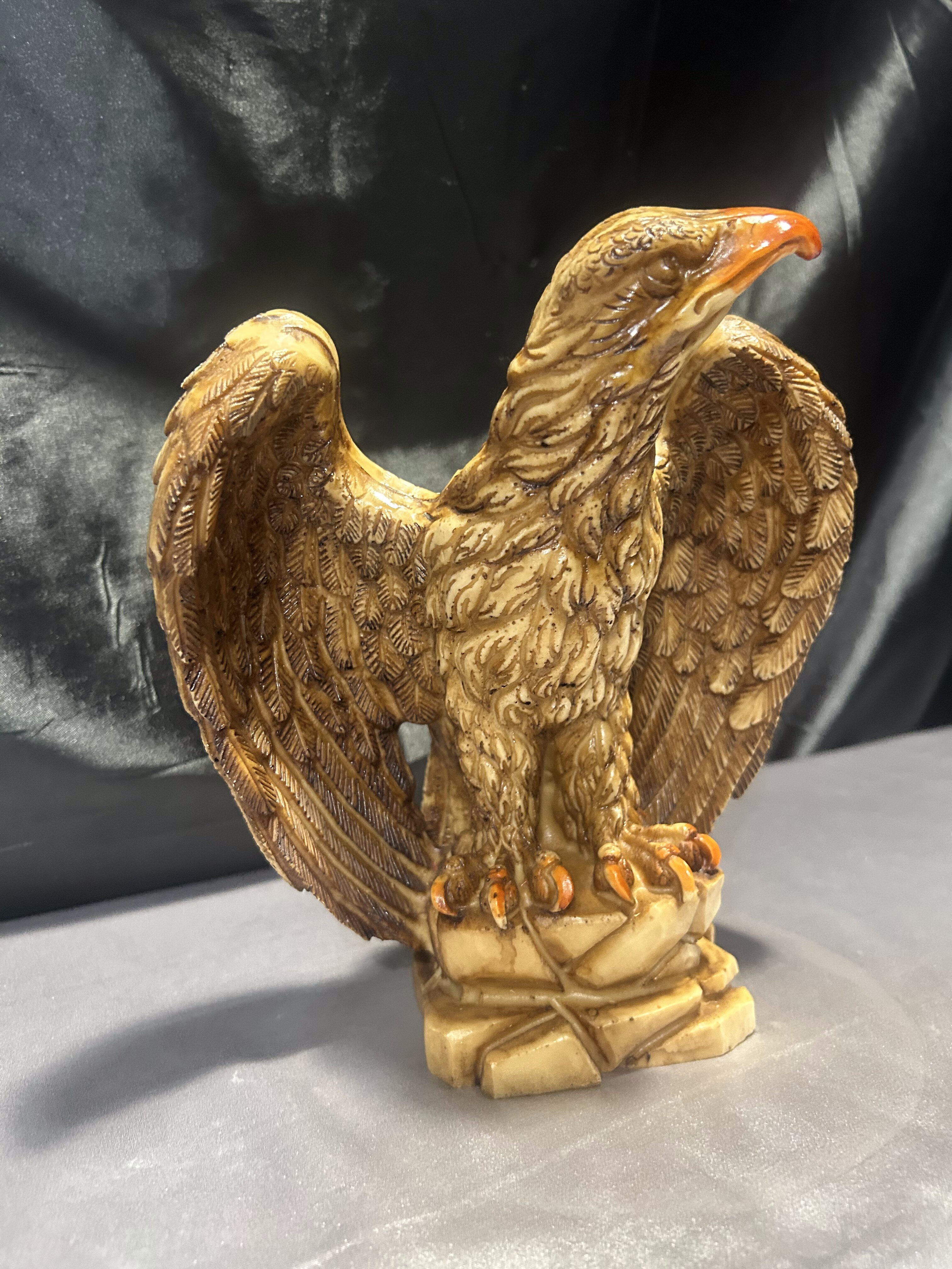 Dekoracyjna figurka przedstawiająca dumnie prezentującego się orła z rozpostartymi skrzydłami, stojącego na skalistym podłożu. Rzeźba została wykonana z dbałością o detale – precyzyjnie zaznaczone pióra, dynamiczna sylwetka i wyrazisty dziób podkreślają potęgę i majestat tego ptaka. Wykonana prawdopodobnie z konglomeratu, dzięki czemu ma solidną wagę i stabilną formę.