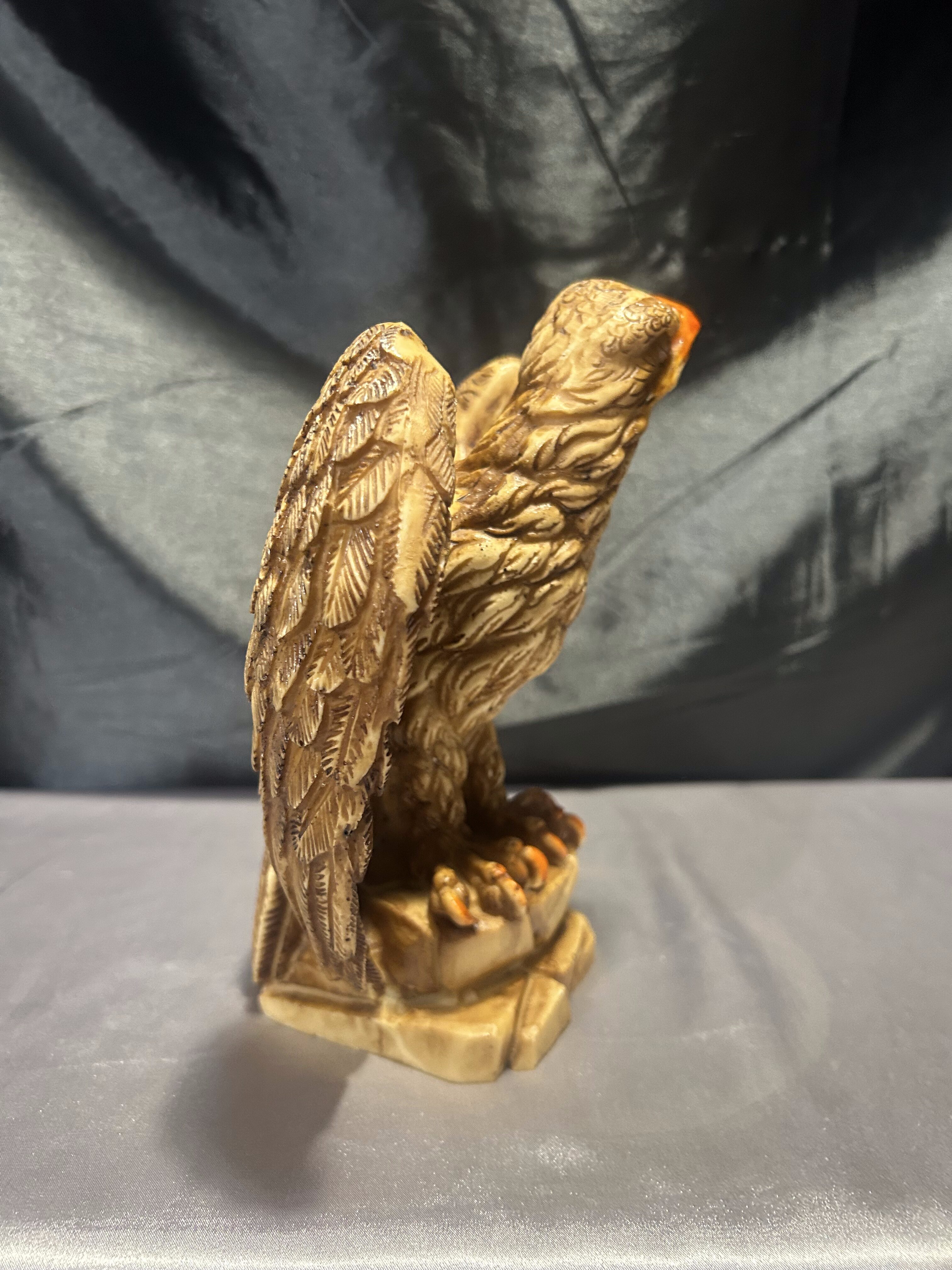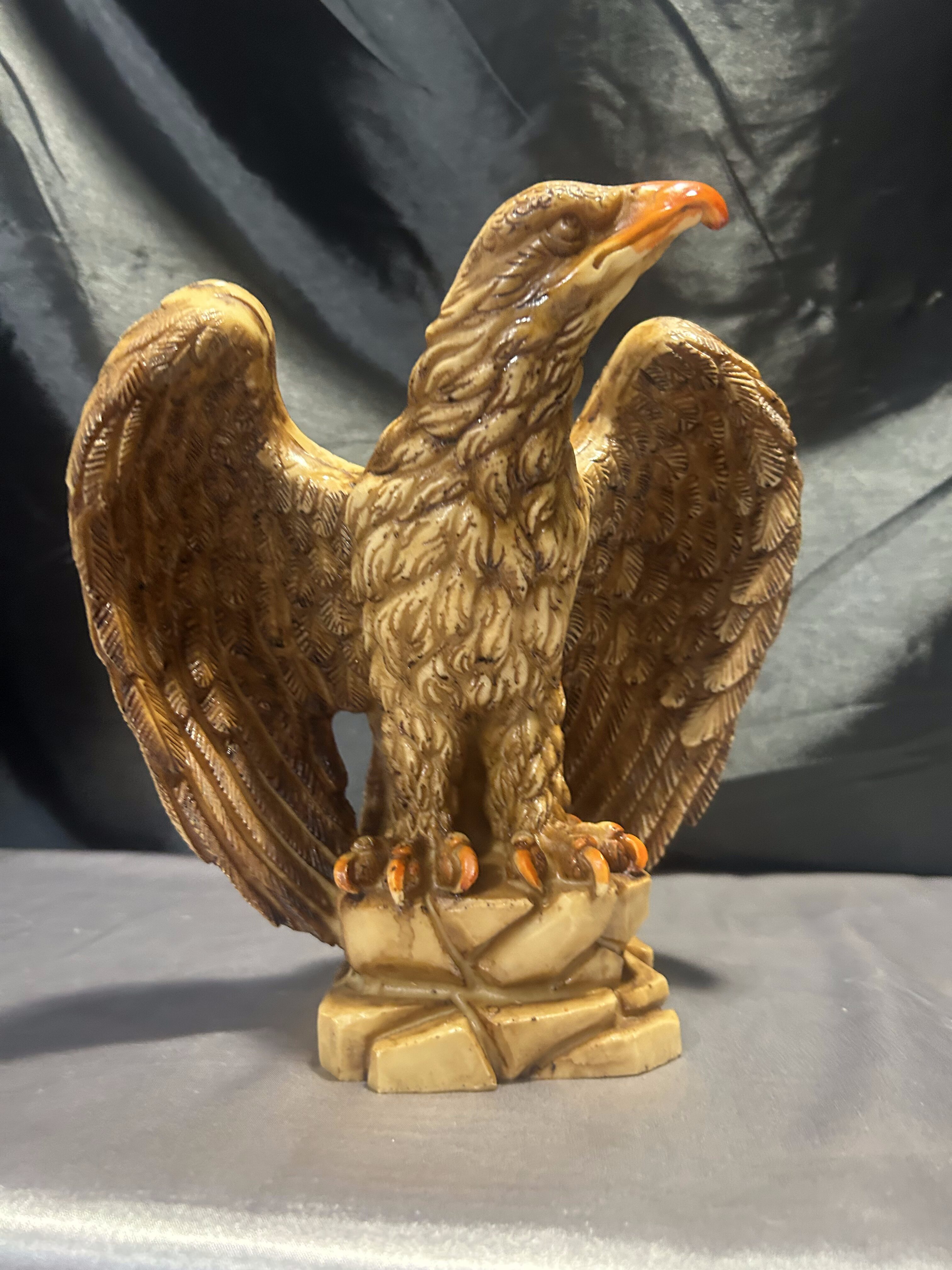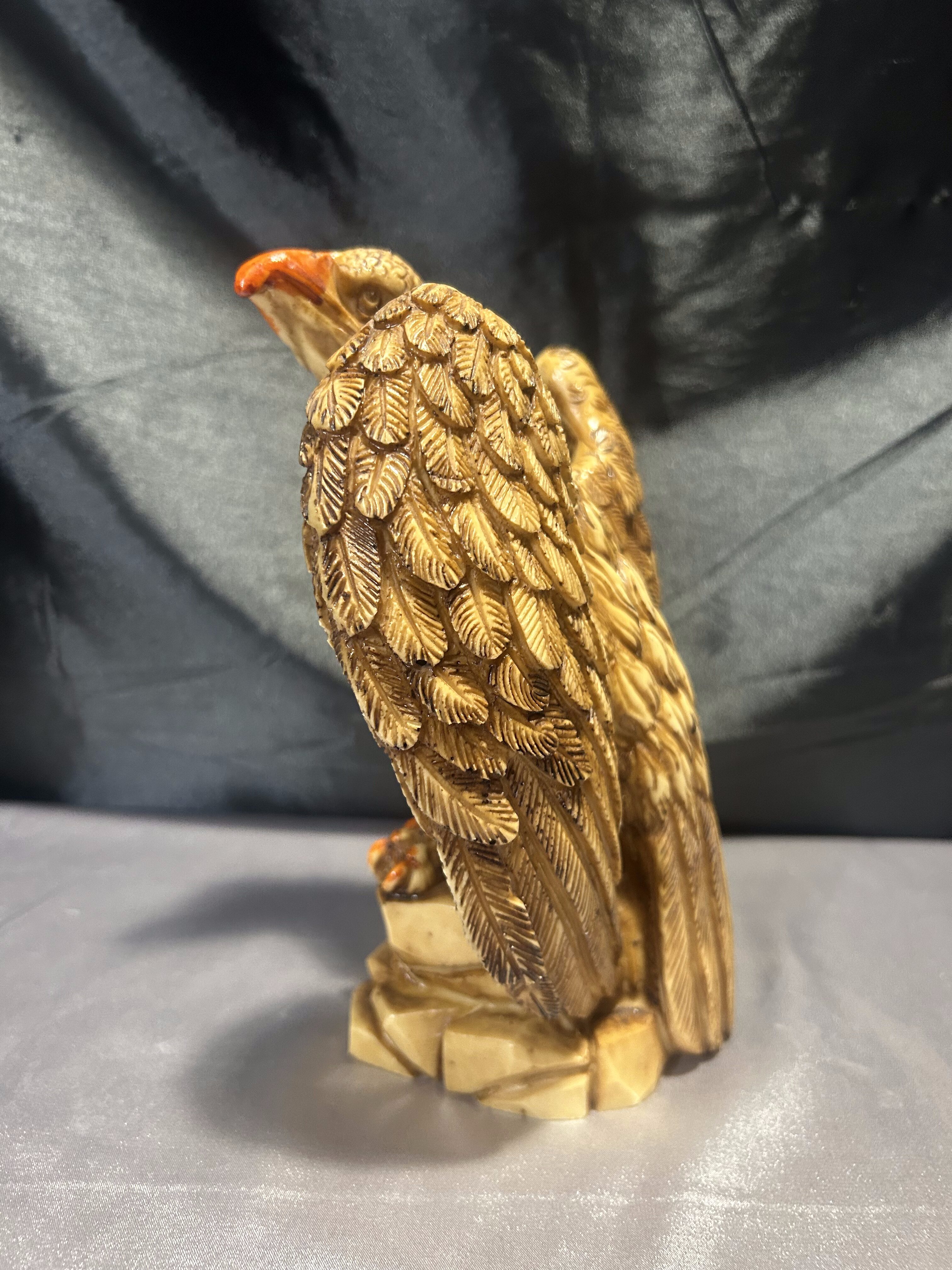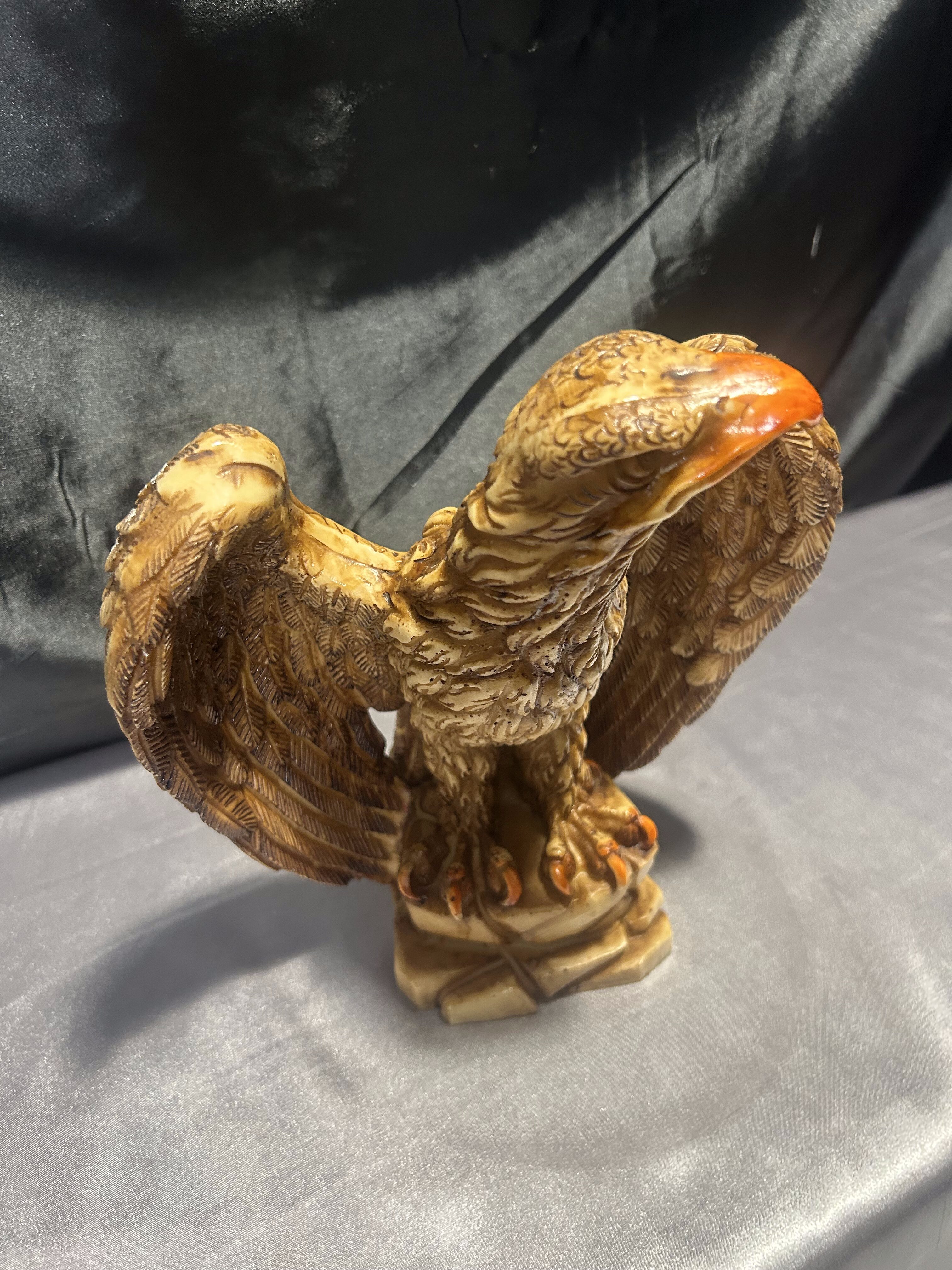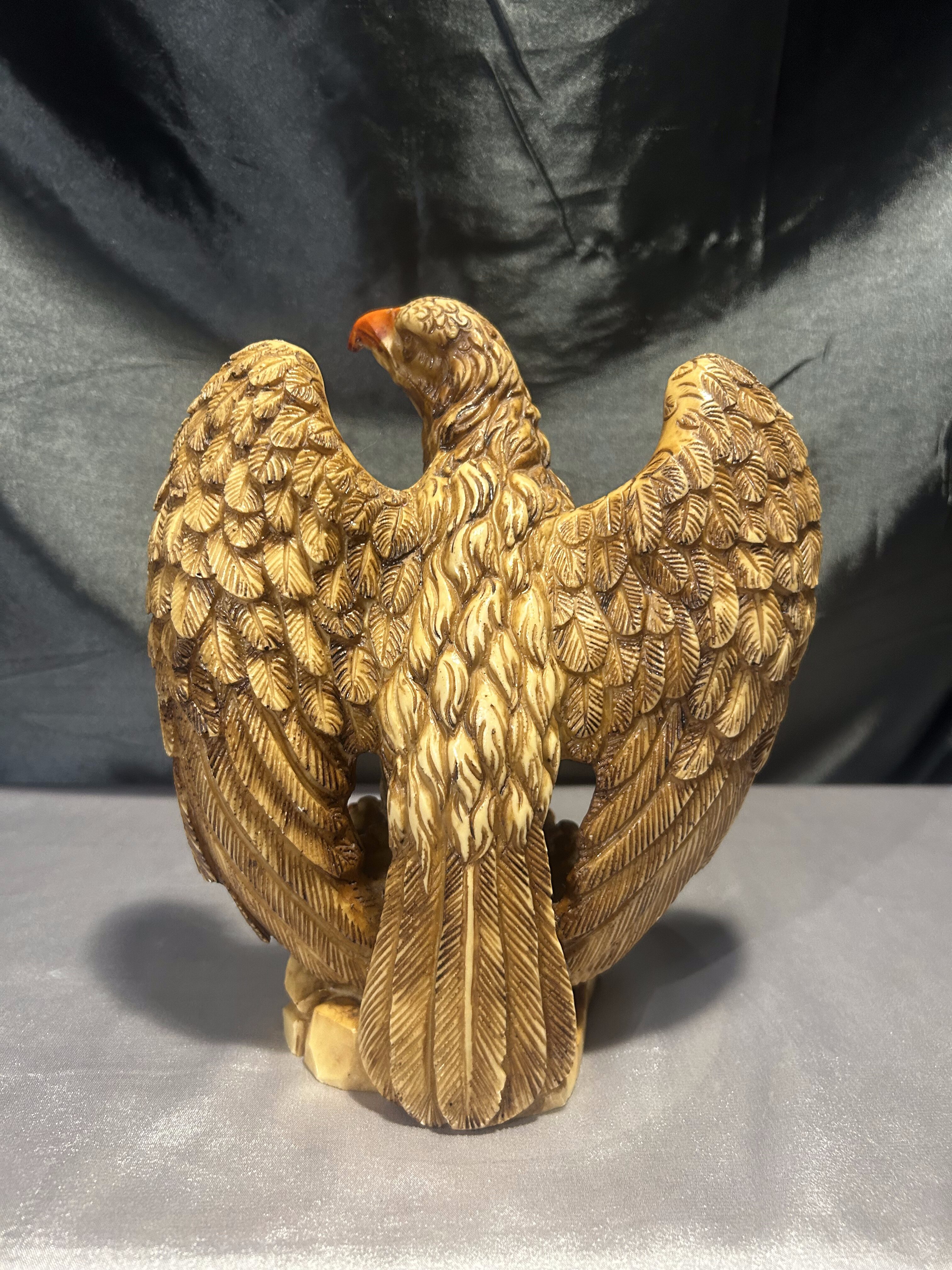 Dekoracyjna figurka przedstawiająca dumnie prezentującego się orła z rozpostartymi skrzydłami, stojącego na skalistym podłożu. Rzeźba została wykonana z dbałością o detale – precyzyjnie zaznaczone pióra, dynamiczna sylwetka i wyrazisty dziób podkreślają potęgę i majestat tego ptaka. Wykonana prawdopodobnie z konglomeratu, dzięki czemu ma solidną wagę i stabilną formę.