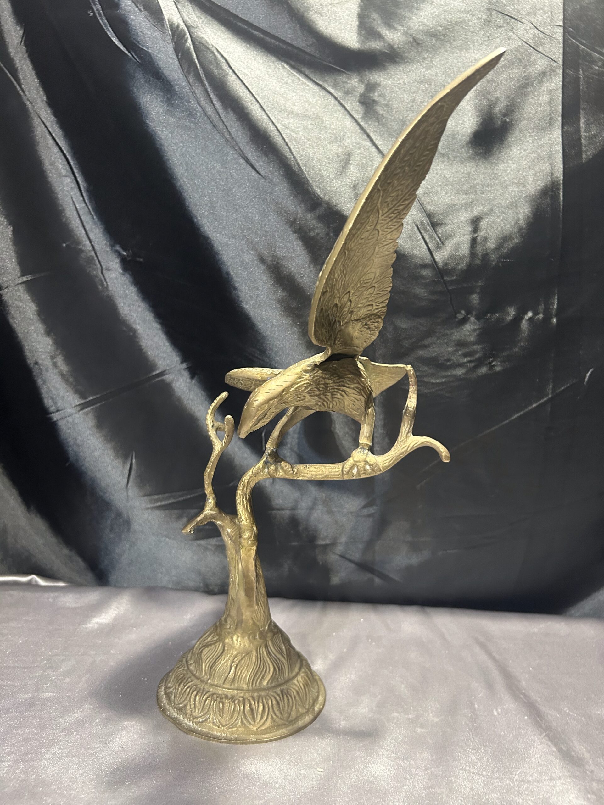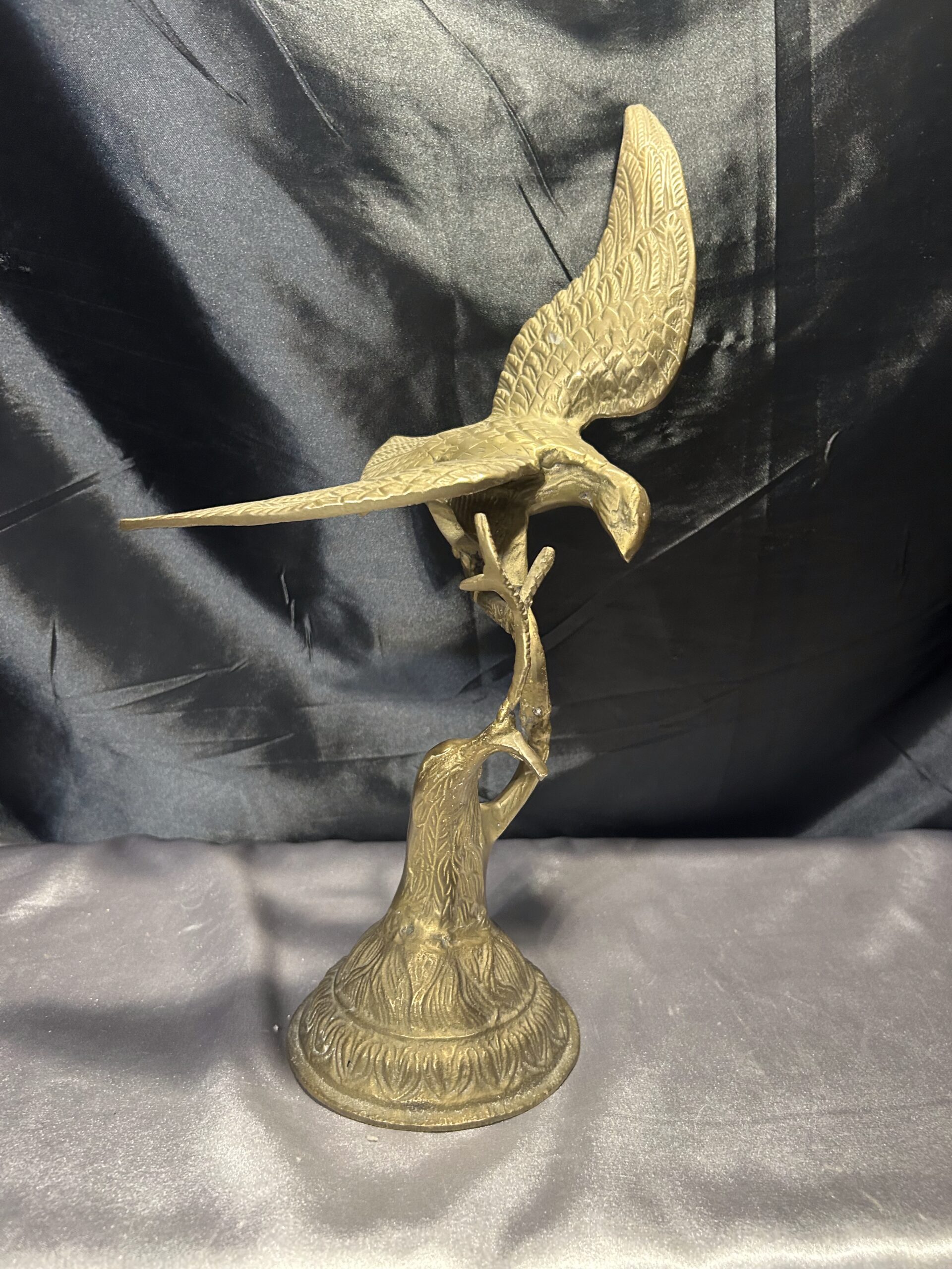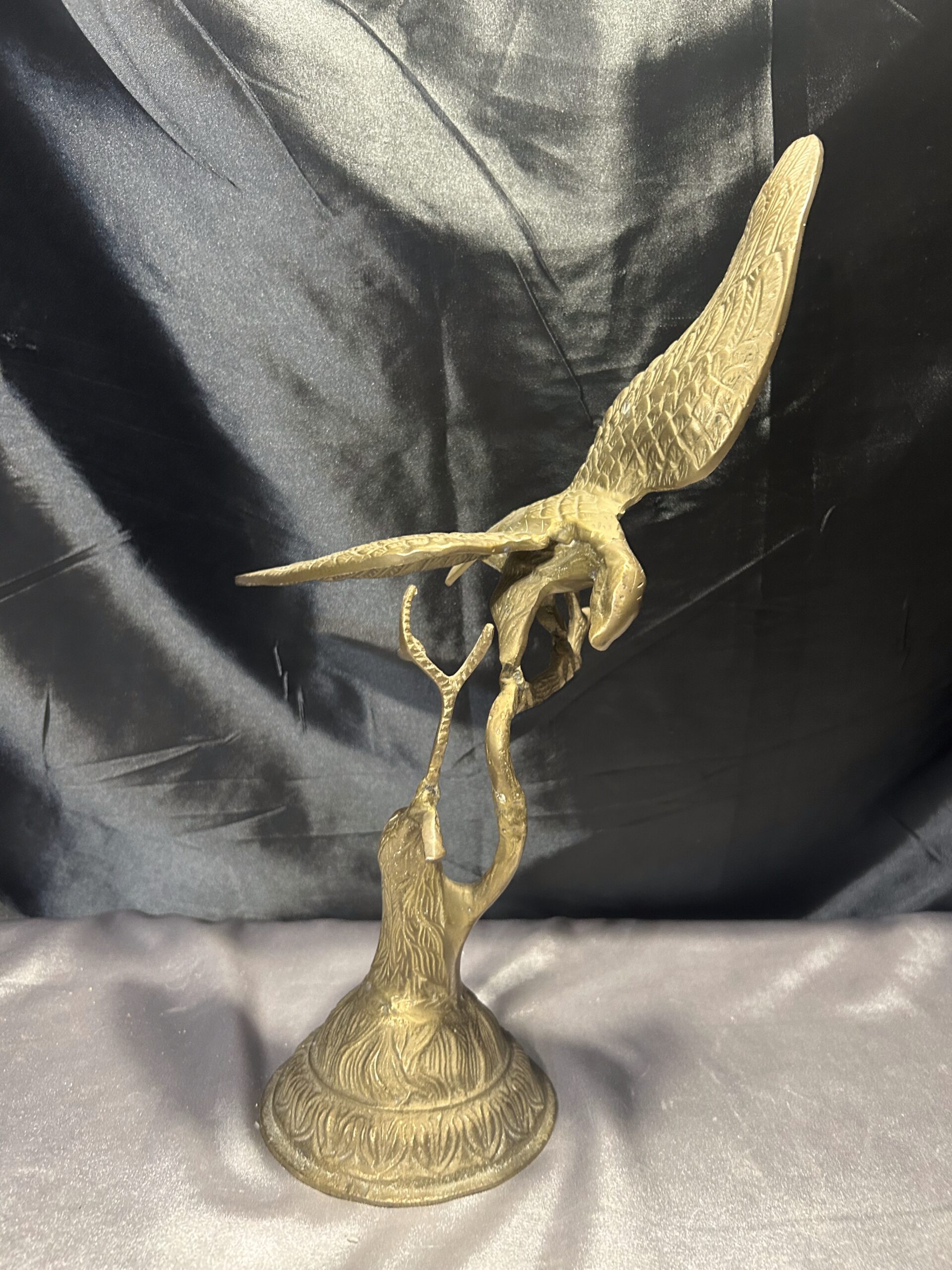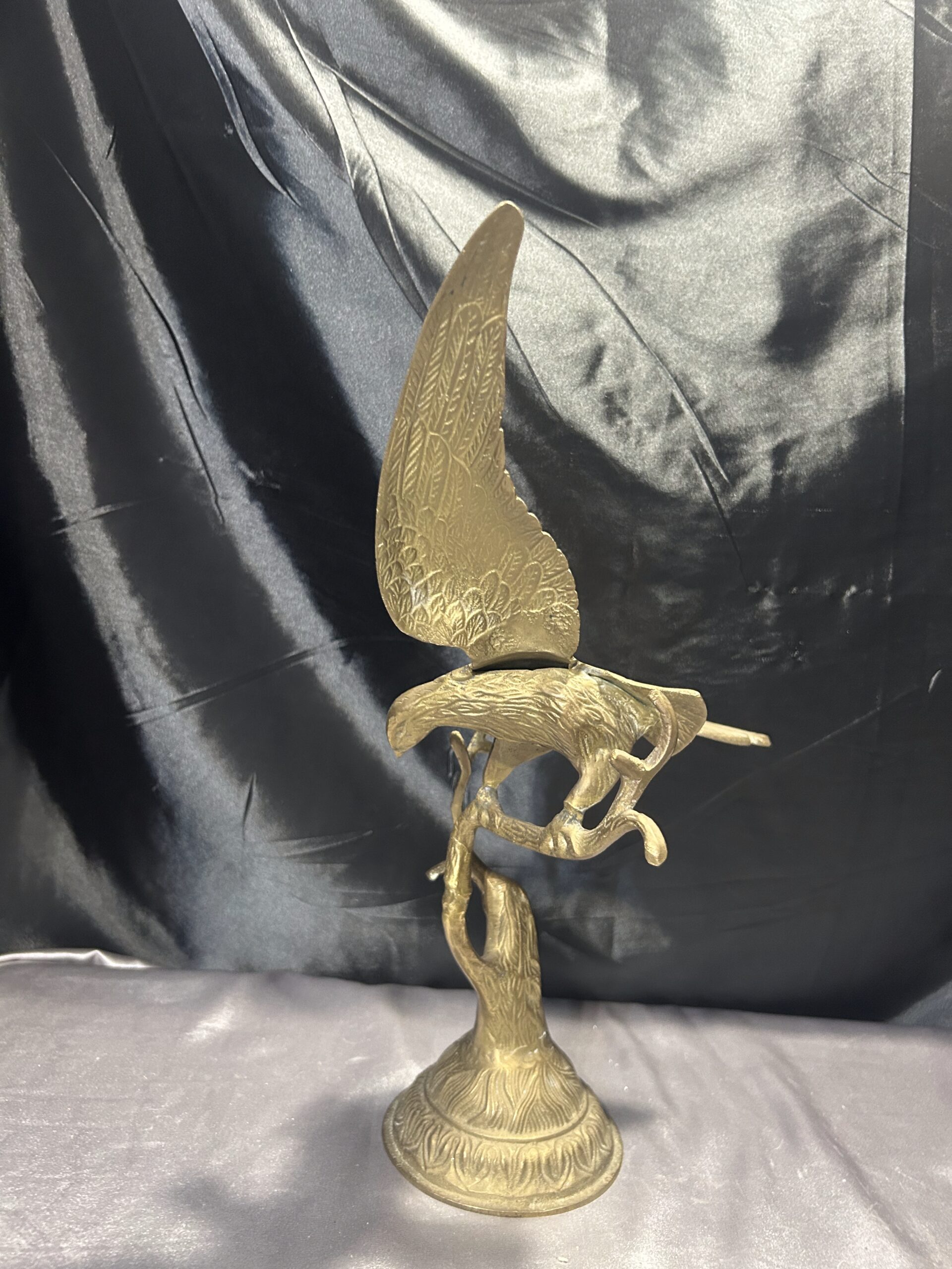 Przedstawiamy imponującą figurkę orła, wykonaną z mosiądzu, przedstawiającą ptaka z rozpostartymi skrzydłami, siedzącego na gałęzi. Ten majestatyczny symbol siły i wolności zachwyca dynamiczną formą oraz precyzyjnym wykonaniem, co czyni go nie tylko elegancką dekoracją, ale także wyjątkowym elementem kolekcjonerskim.