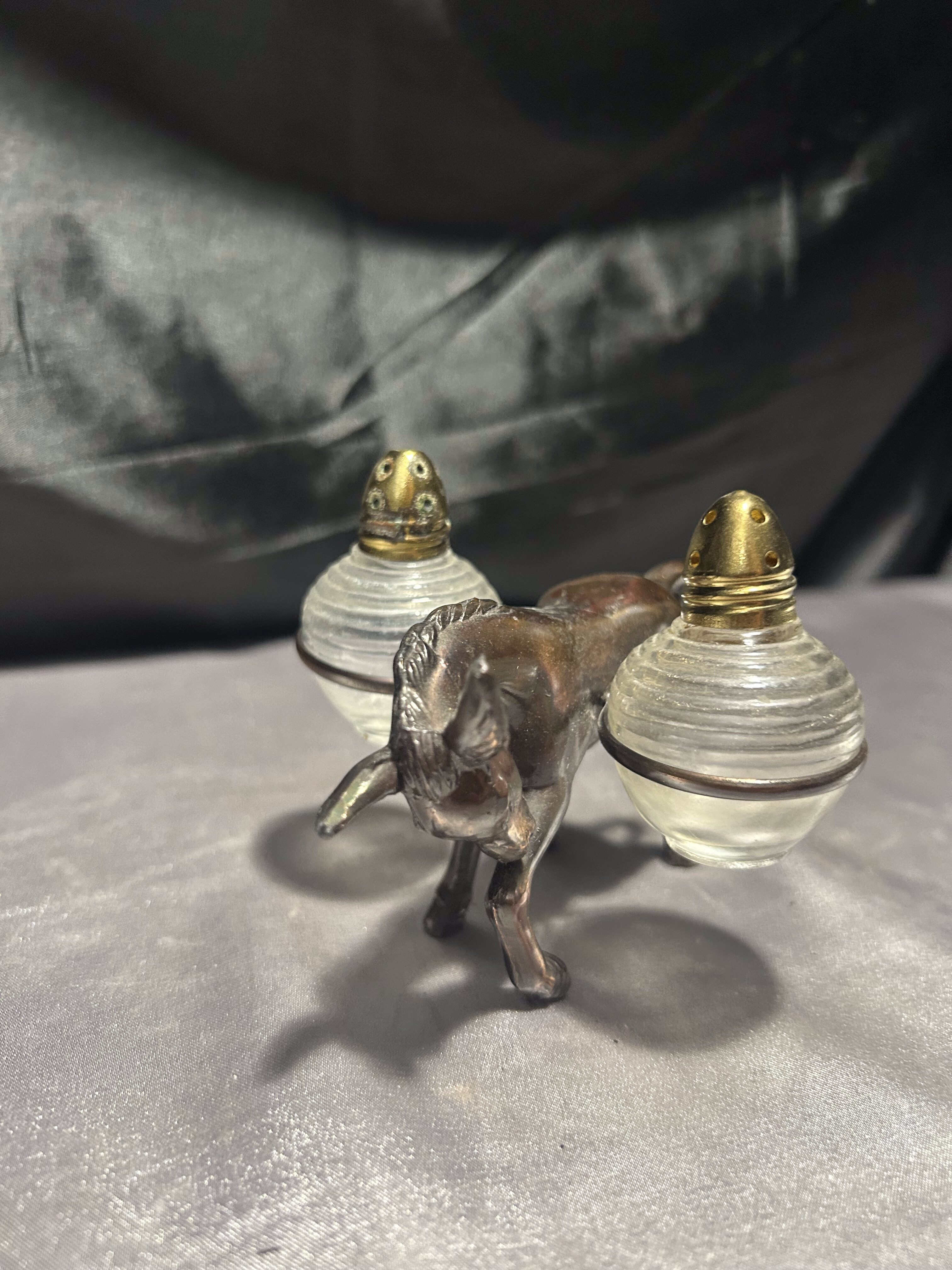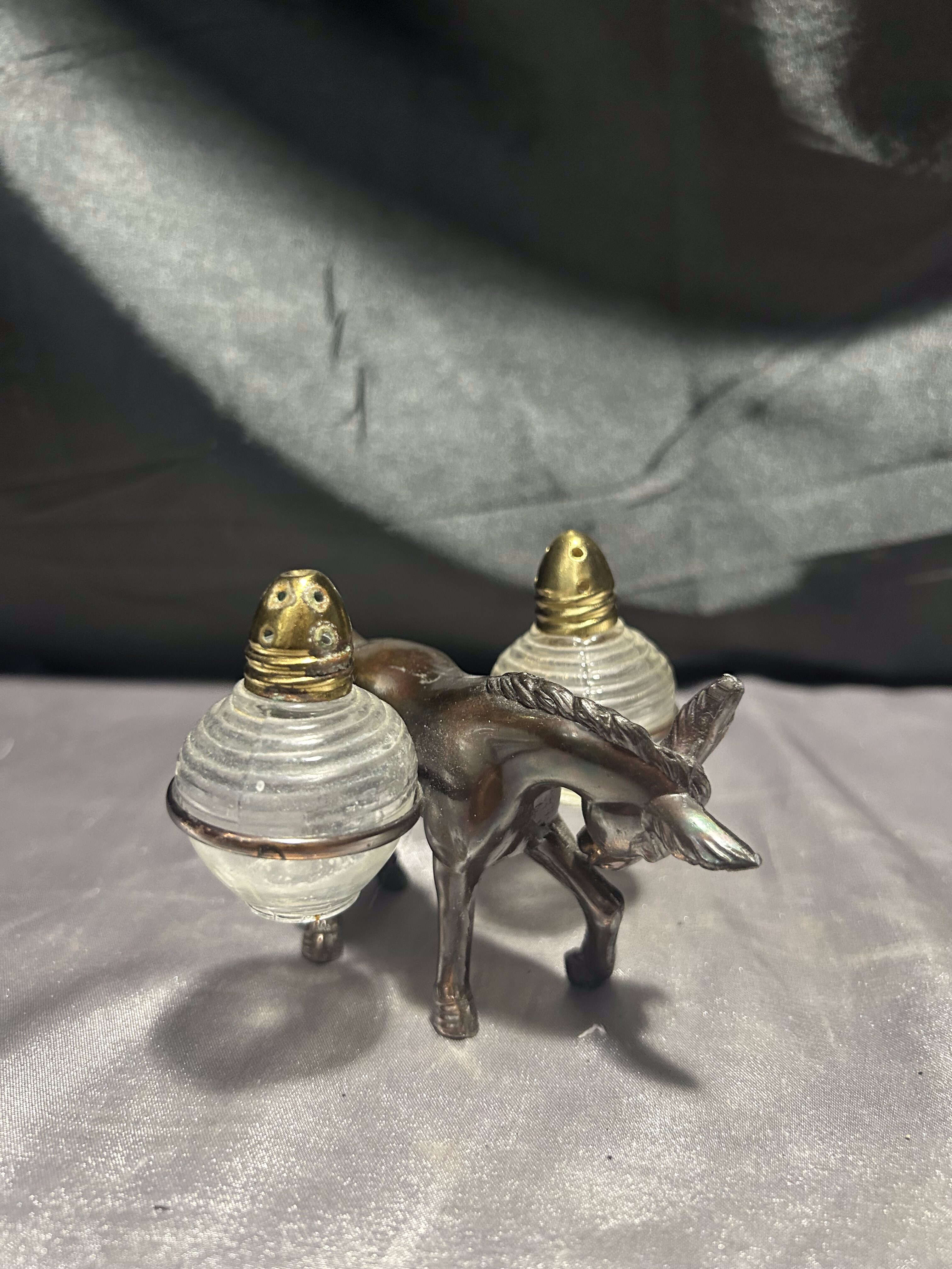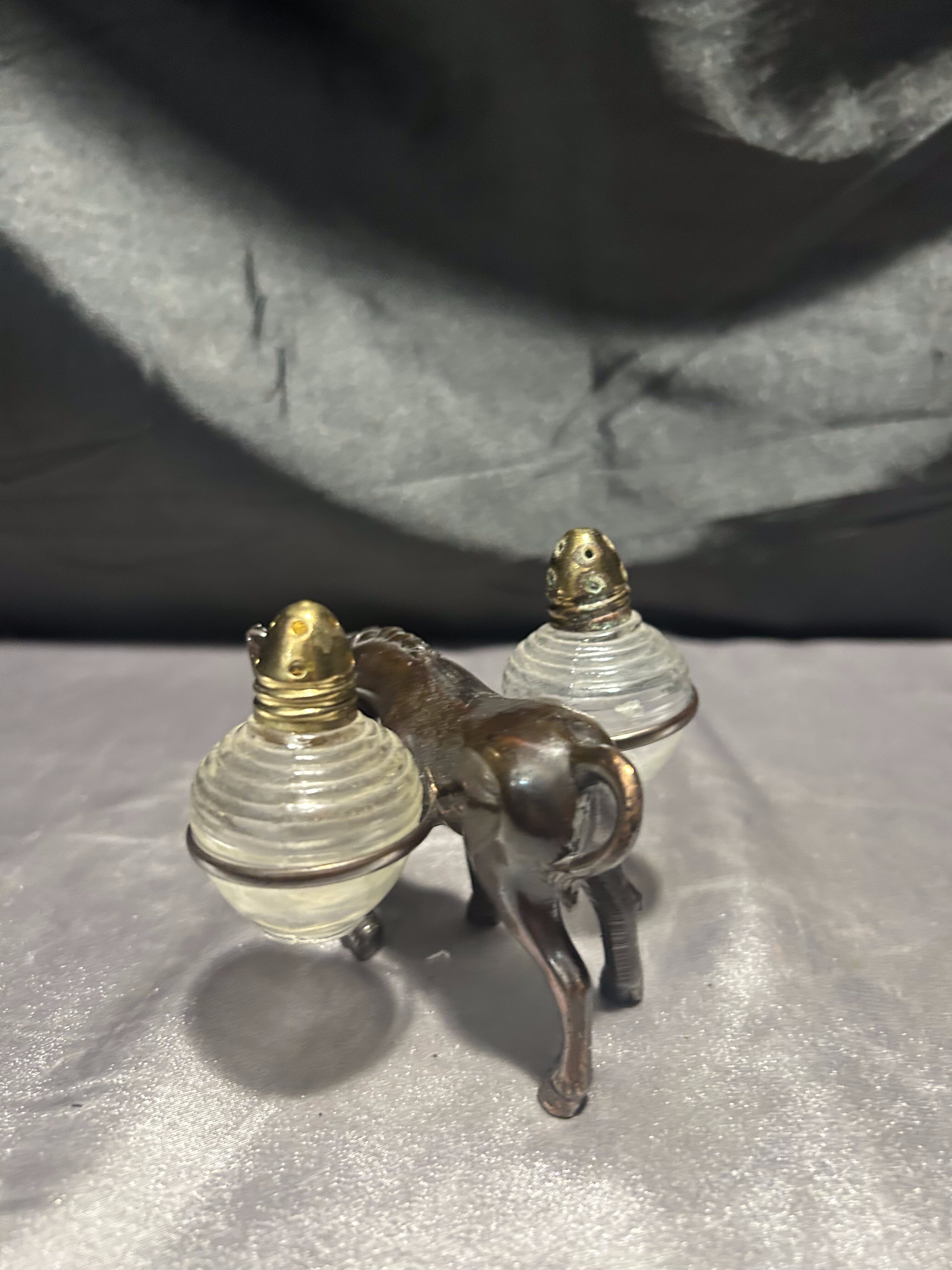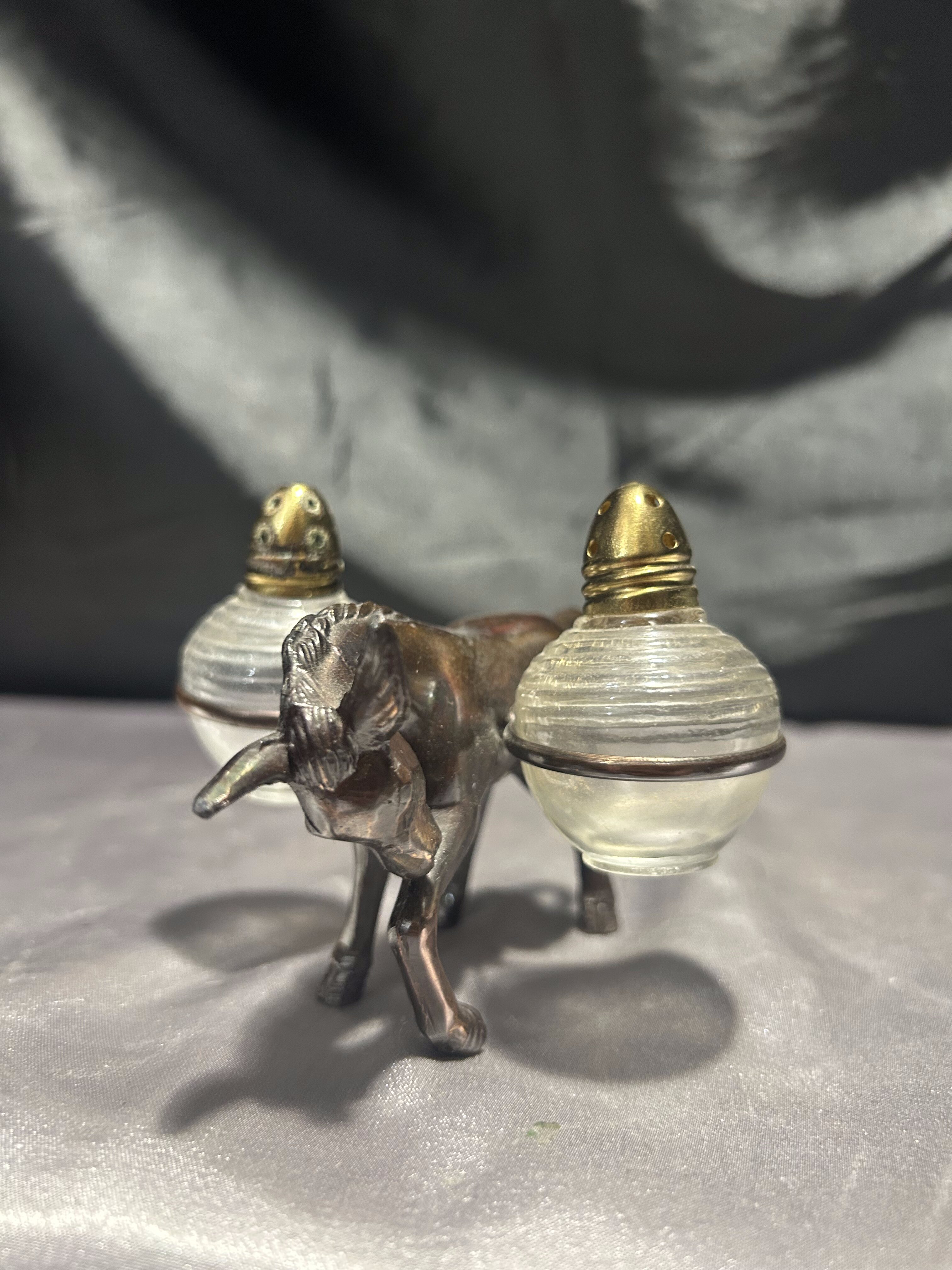 Unikalny zestaw przyprawników w formie uroczej figurki osiołka, który „niesie” na grzbiecie dwie okrągłe solniczki – jedną na sól, drugą na pieprz. Pojemniki wykonane są z grubego szkła z metalowymi (mosiężnymi) zakrętkami, a sam osiołek z metalu o pięknym odcieniu starego brązu.