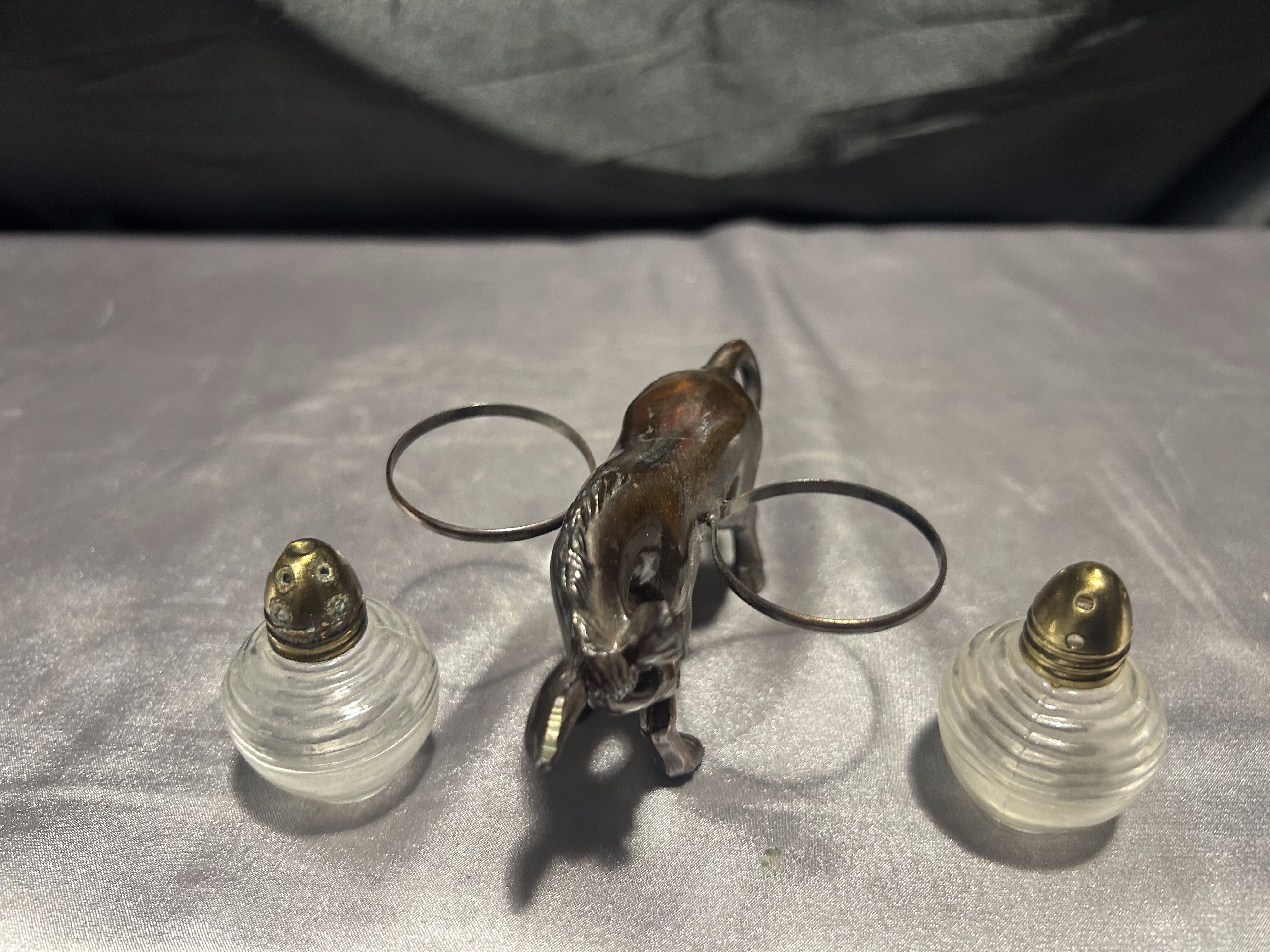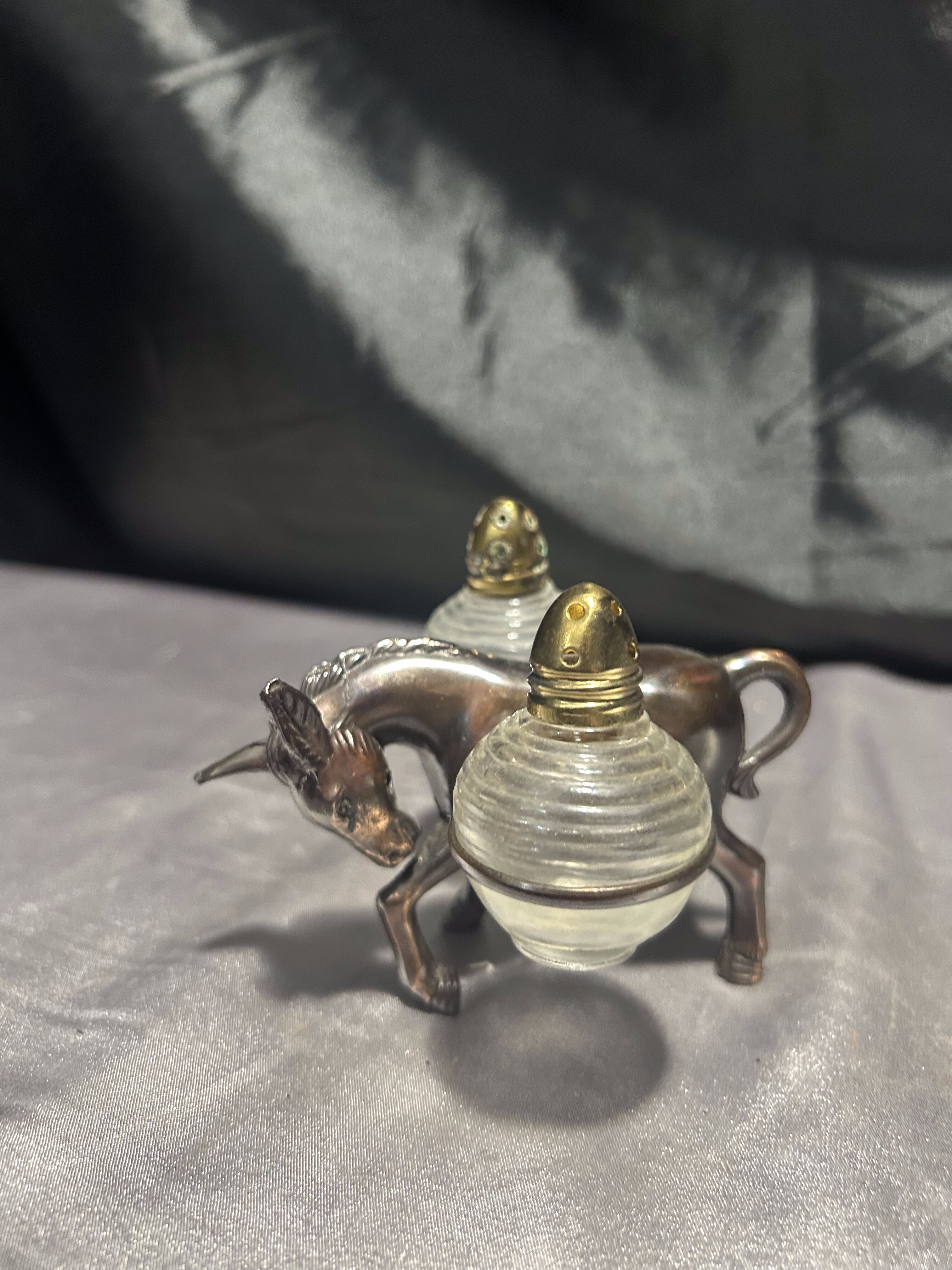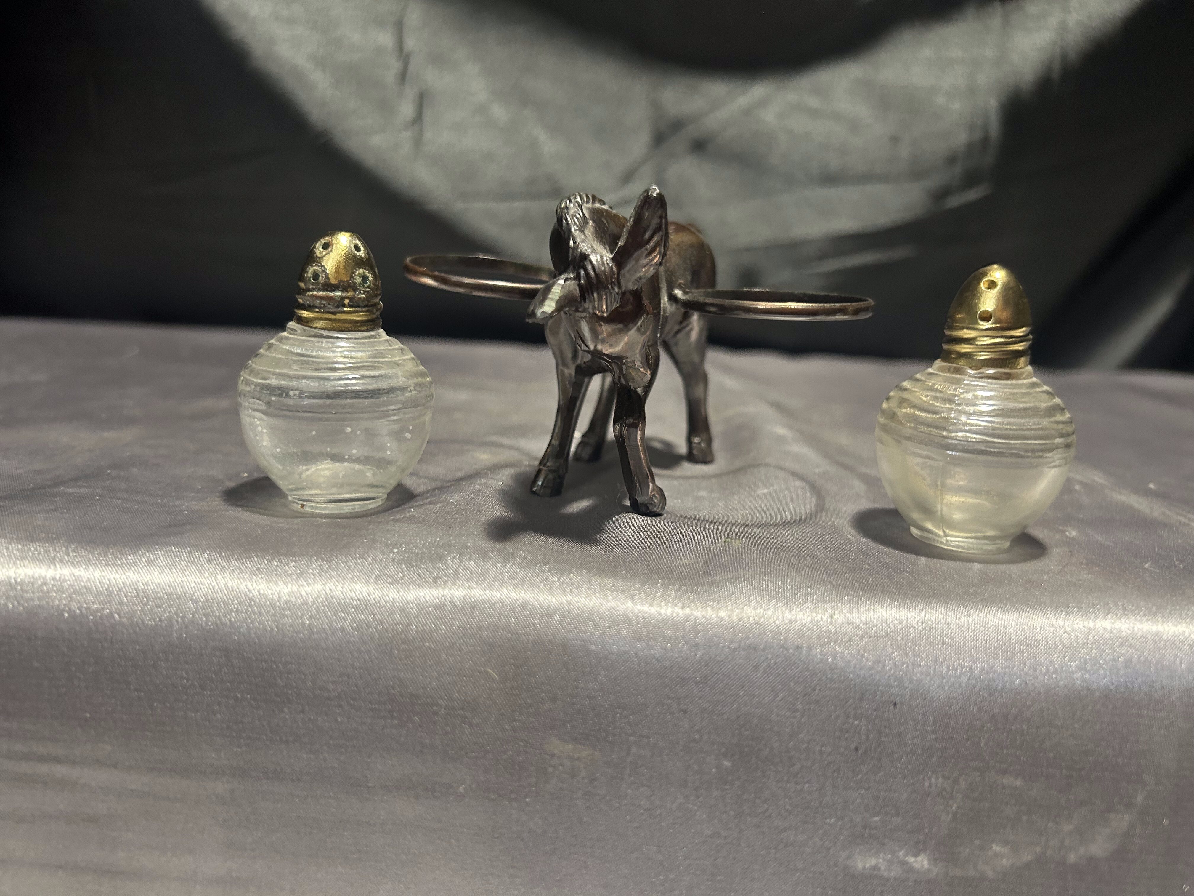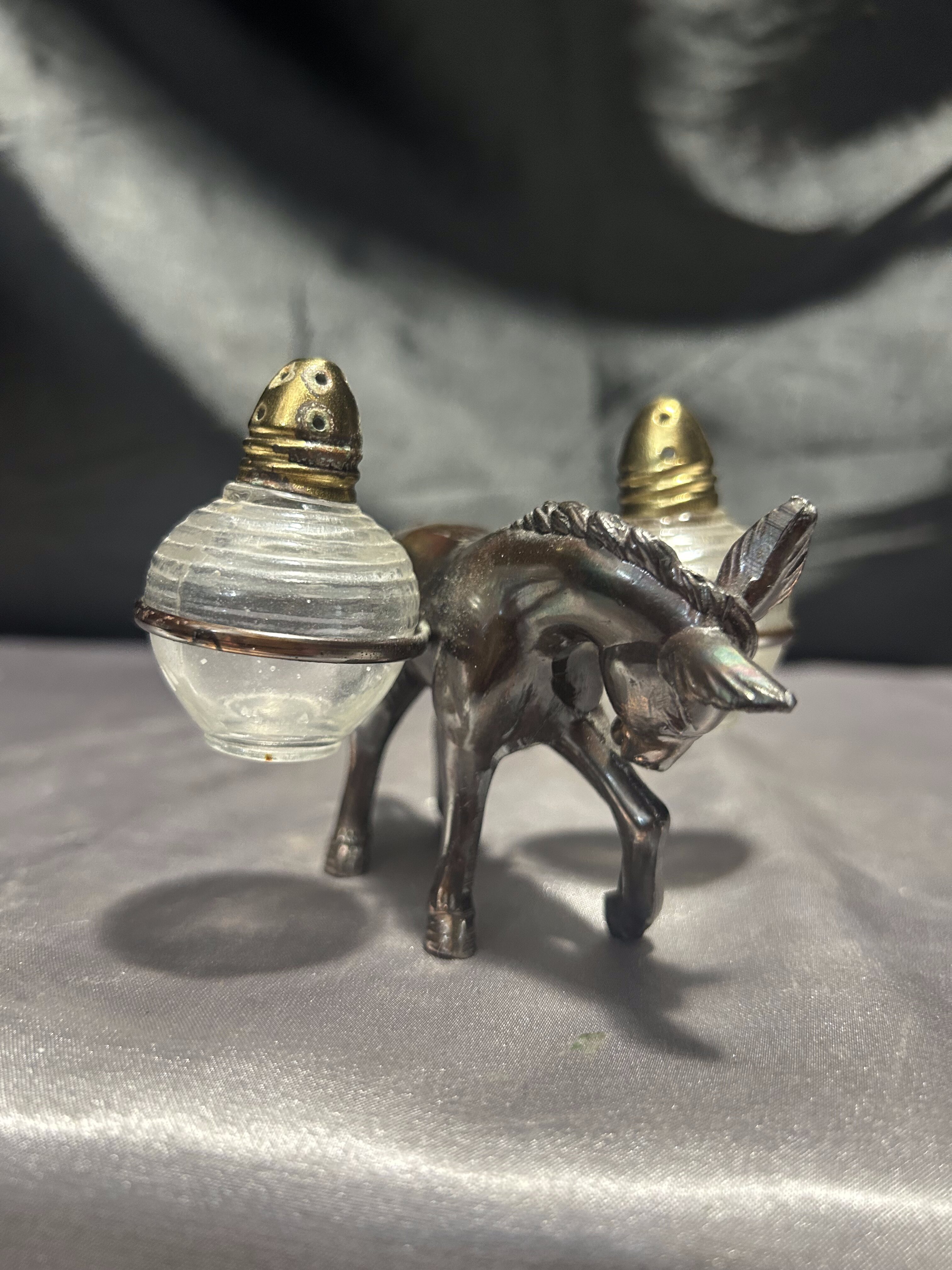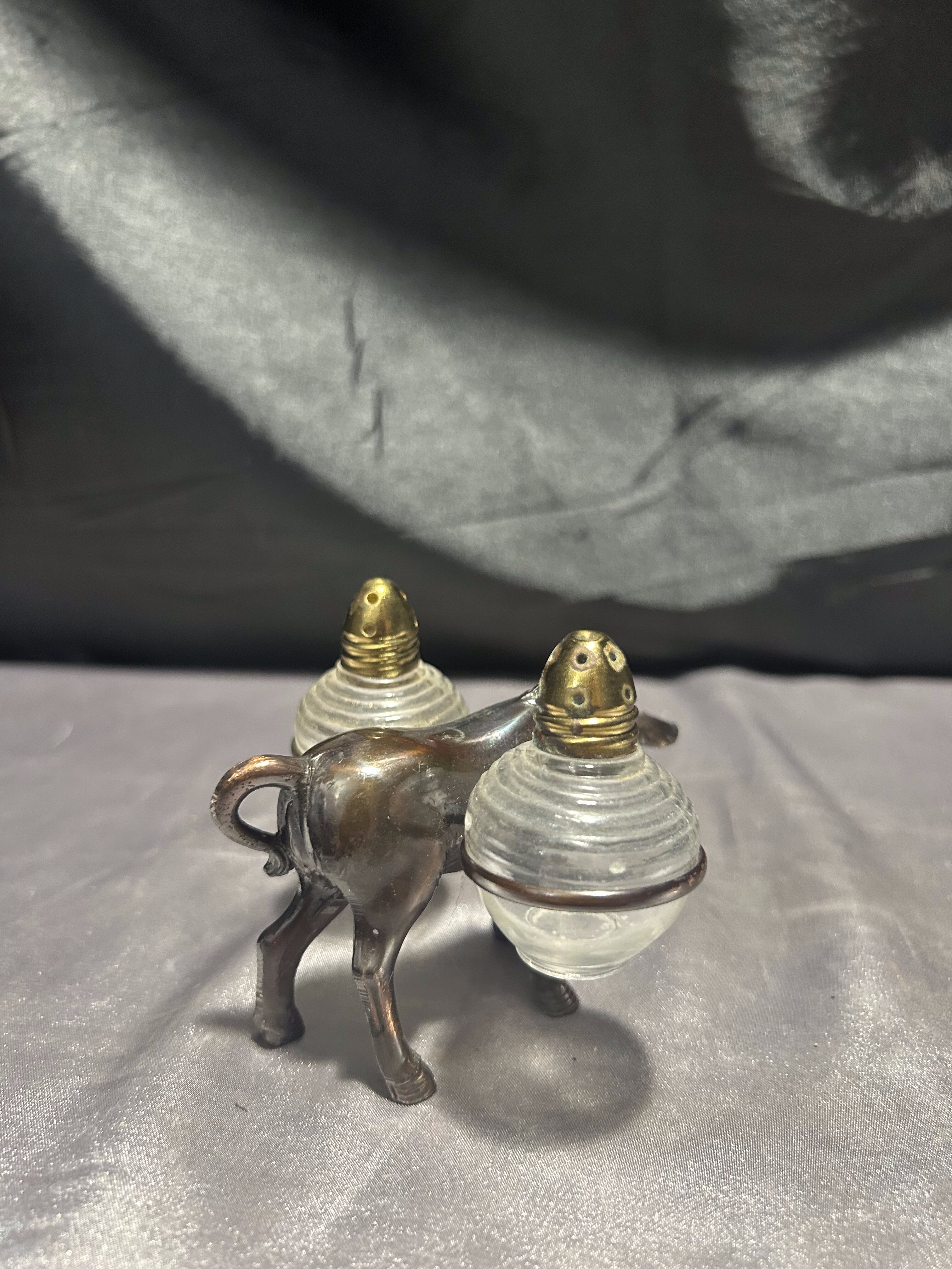 Unikalny zestaw przyprawników w formie uroczej figurki osiołka, który „niesie” na grzbiecie dwie okrągłe solniczki – jedną na sól, drugą na pieprz. Pojemniki wykonane są z grubego szkła z metalowymi (mosiężnymi) zakrętkami, a sam osiołek z metalu o pięknym odcieniu starego brązu.