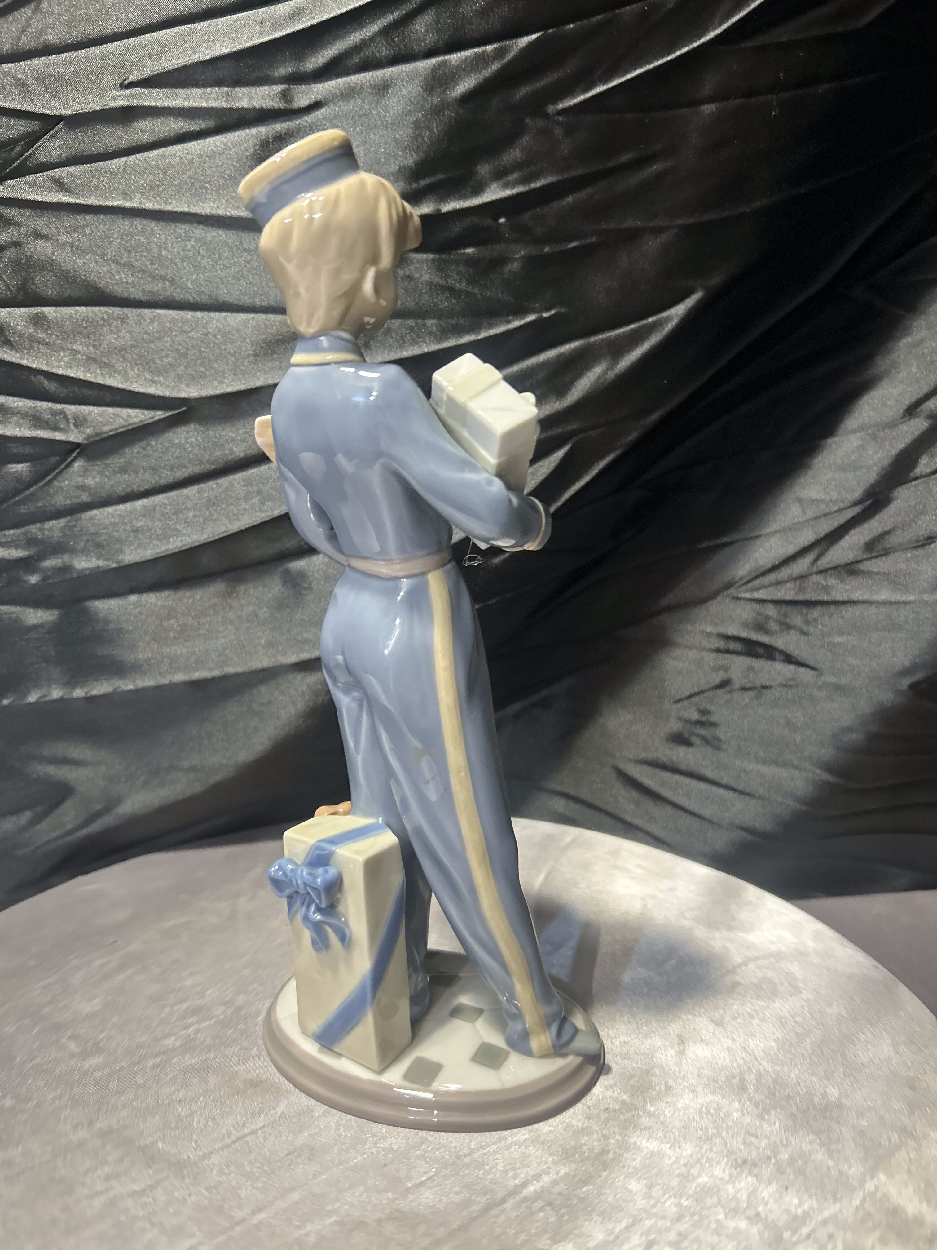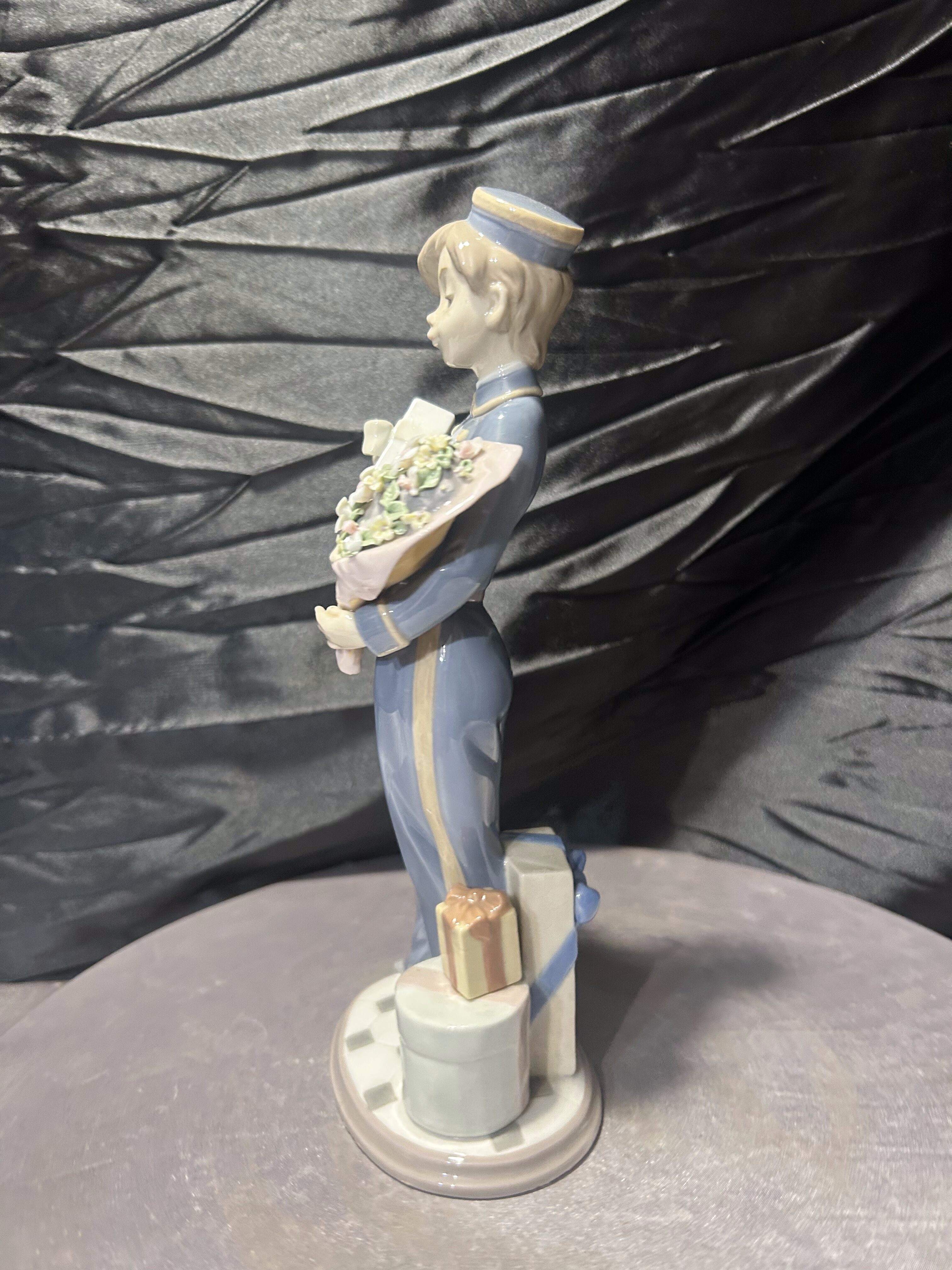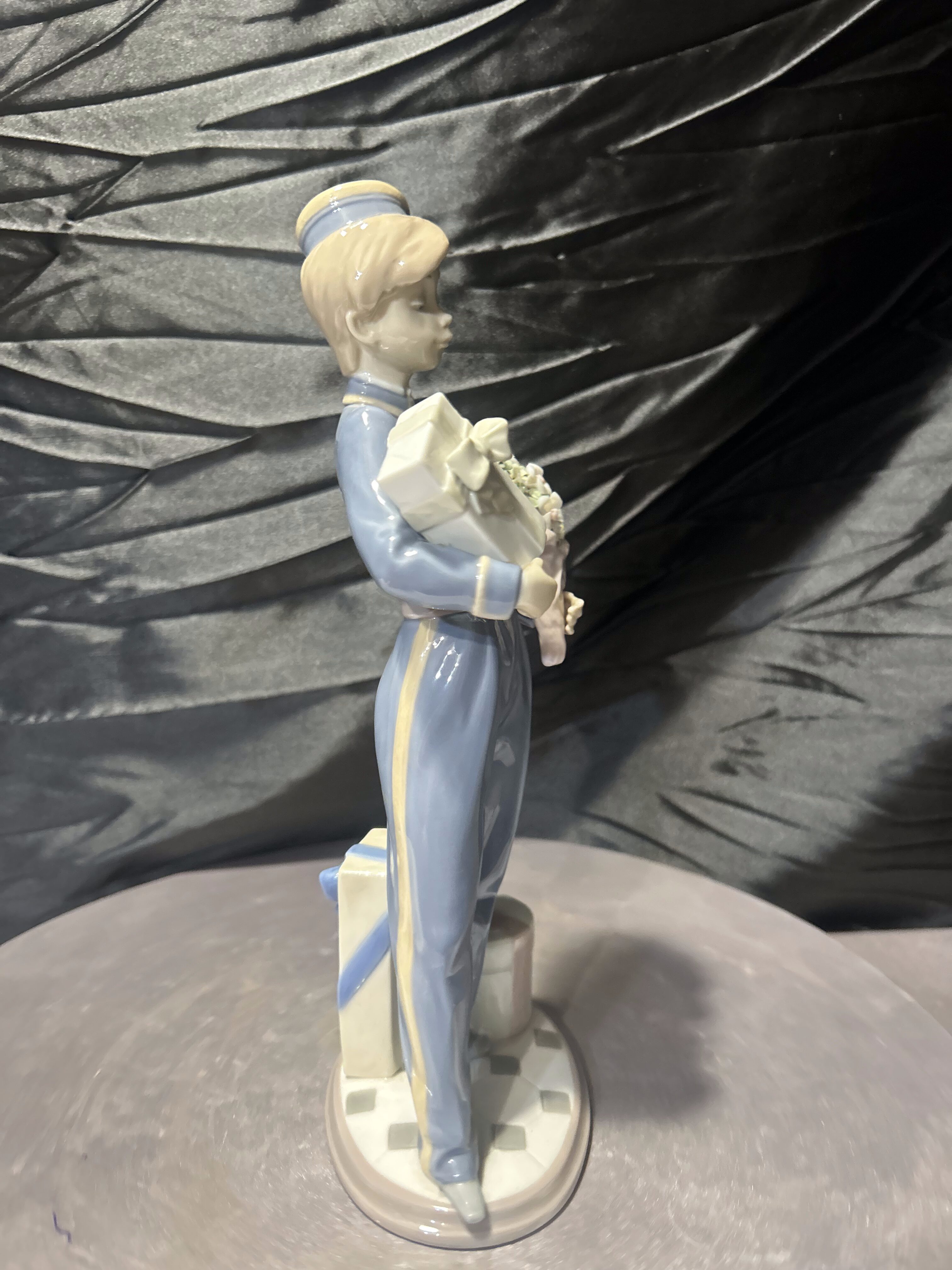 Elegancka figurka porcelanowa przedstawiająca chłopca niosącego prezent oraz bukiet kwiatów. Subtelna, pełna wdzięku kompozycja została wykonana z charakterystycznej dla hiszpańskiej manufaktury Lladró porcelany o delikatnej, pastelowej kolorystyce.