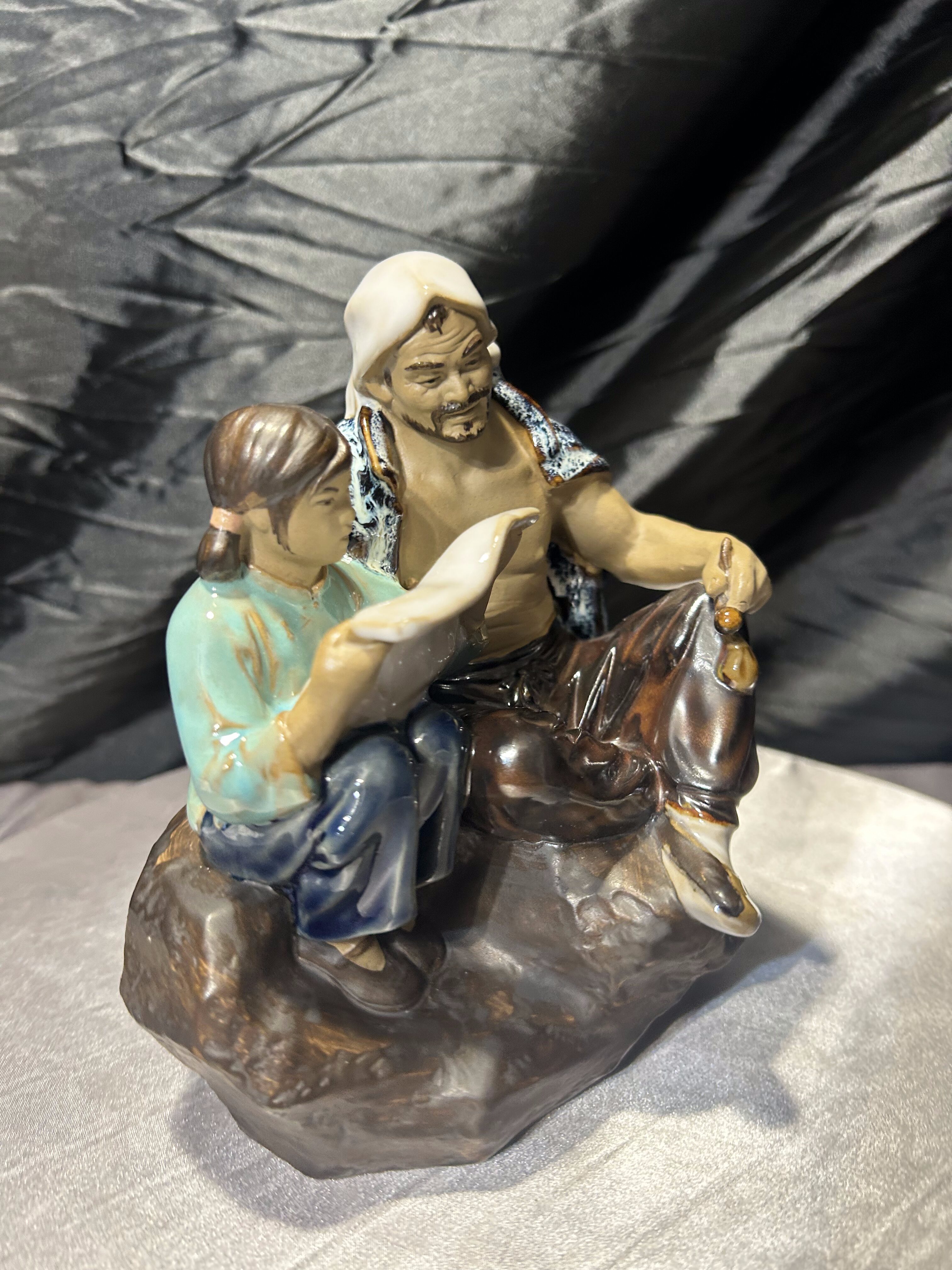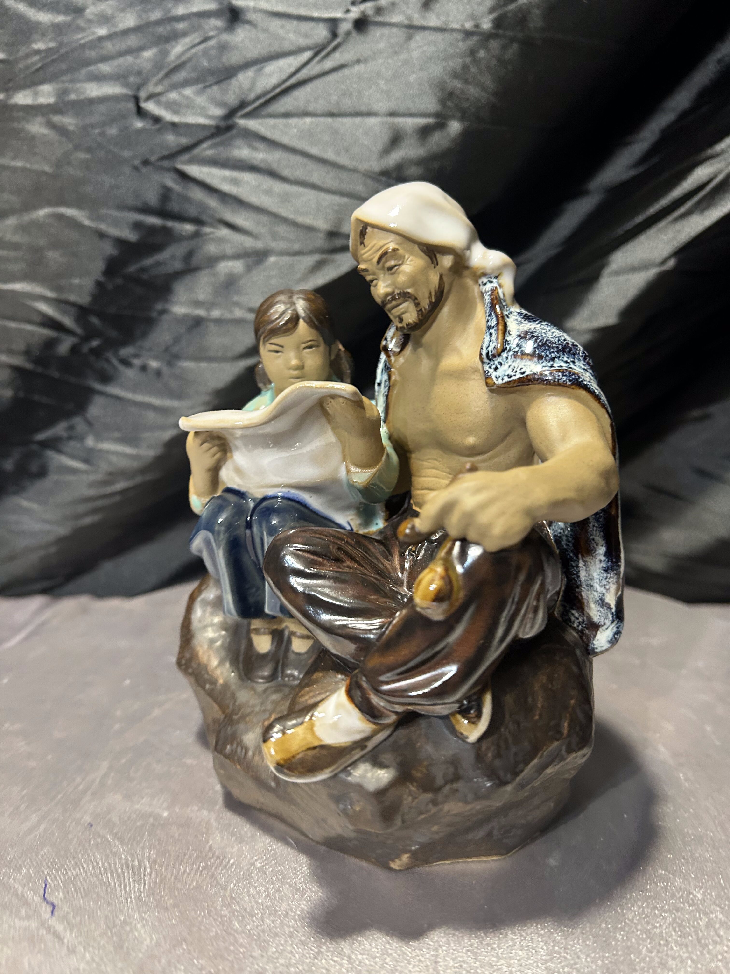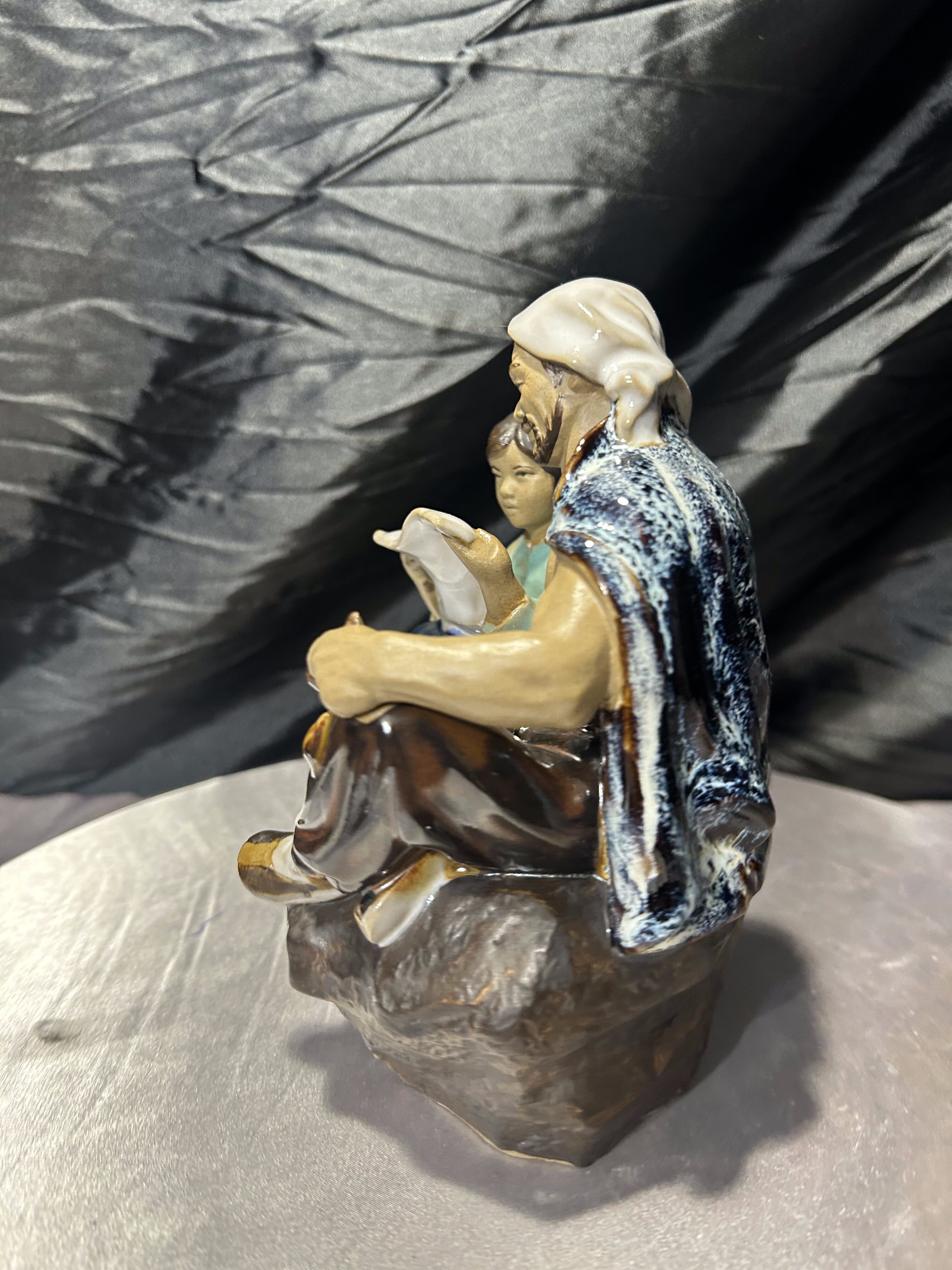Porcelanowa figurka przedstawiająca siedzącego mężczyznę oraz dziecko, które wspólnie pochylają się nad mapą lub zwitkiem papieru. Scena utrzymana jest w stylistyce dalekowschodniej, z pięknie oddanymi detalami twarzy, ubrania oraz dynamiczną kompozycją postaci.