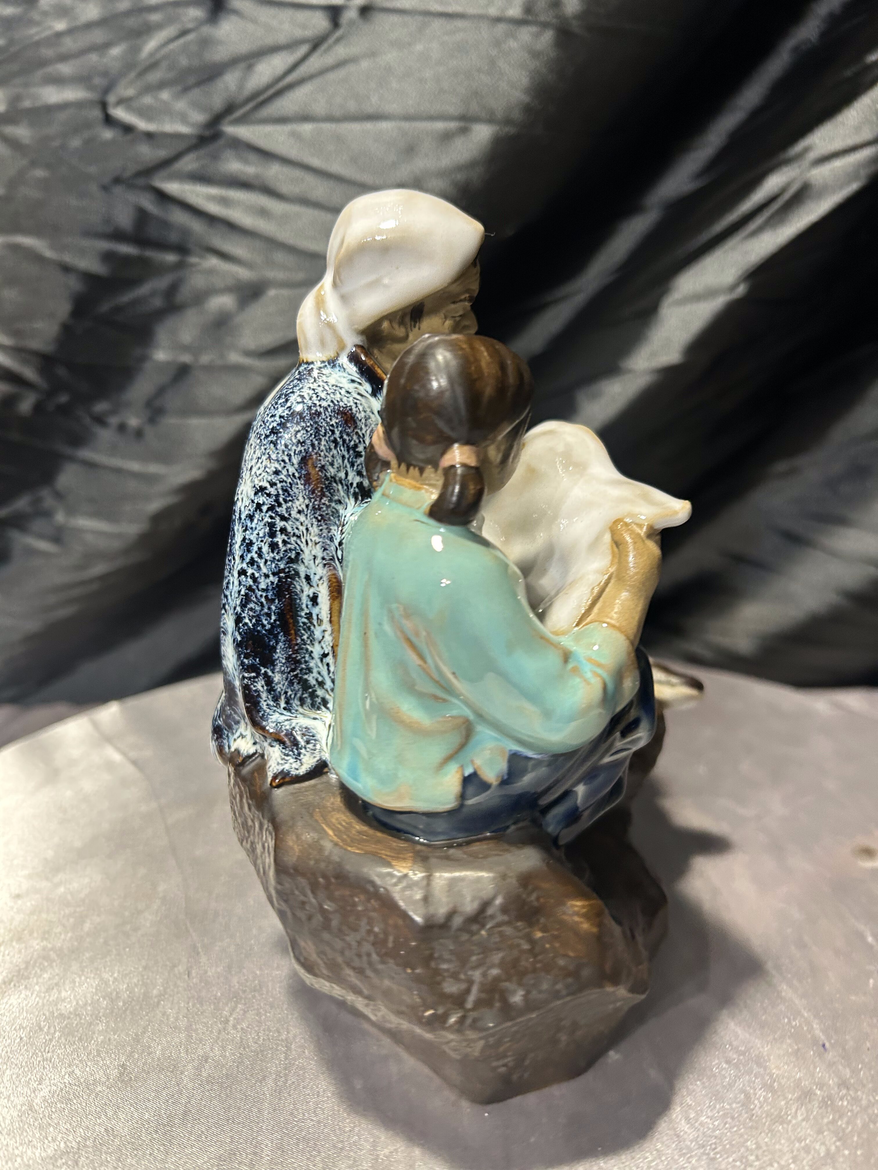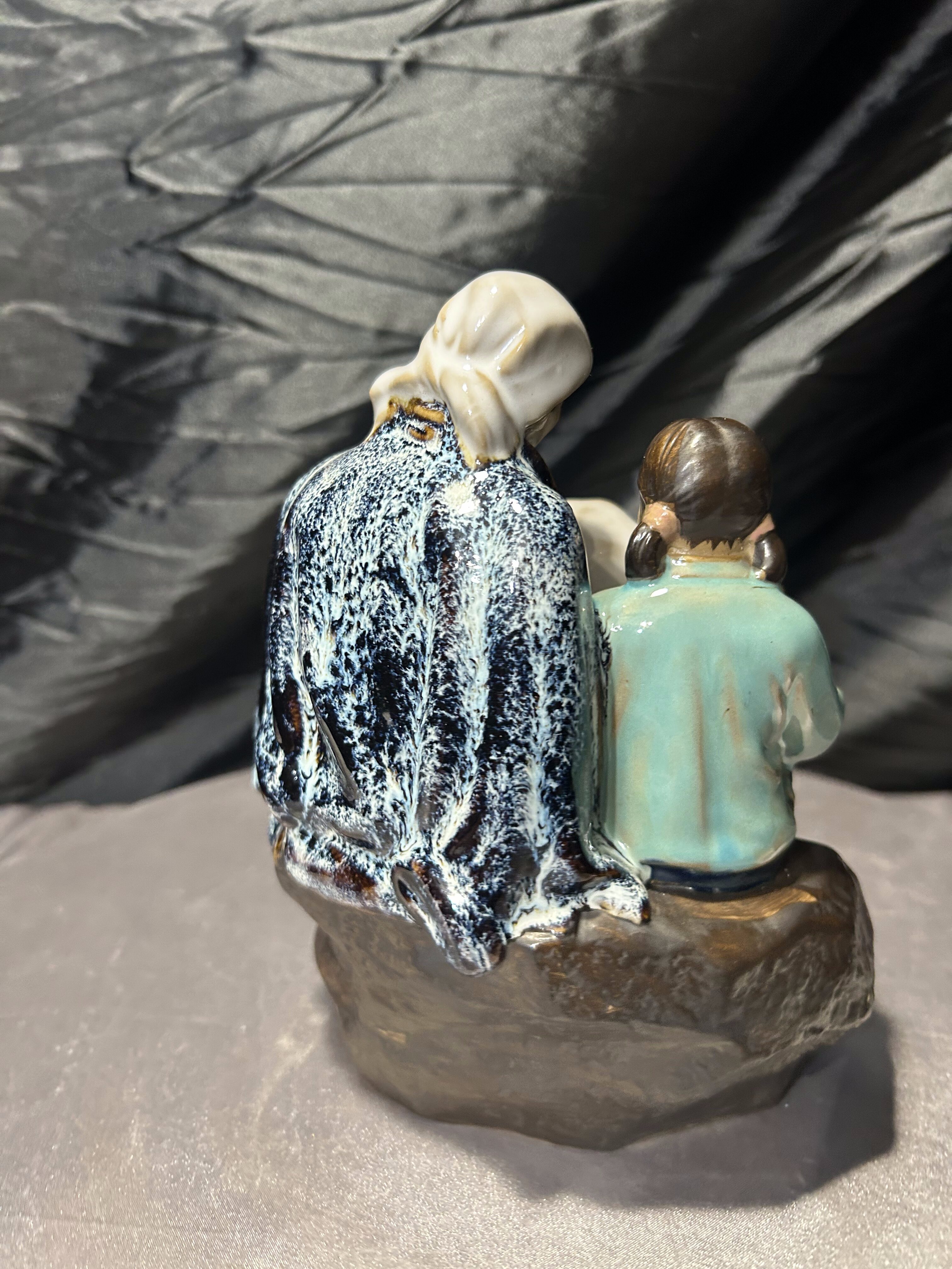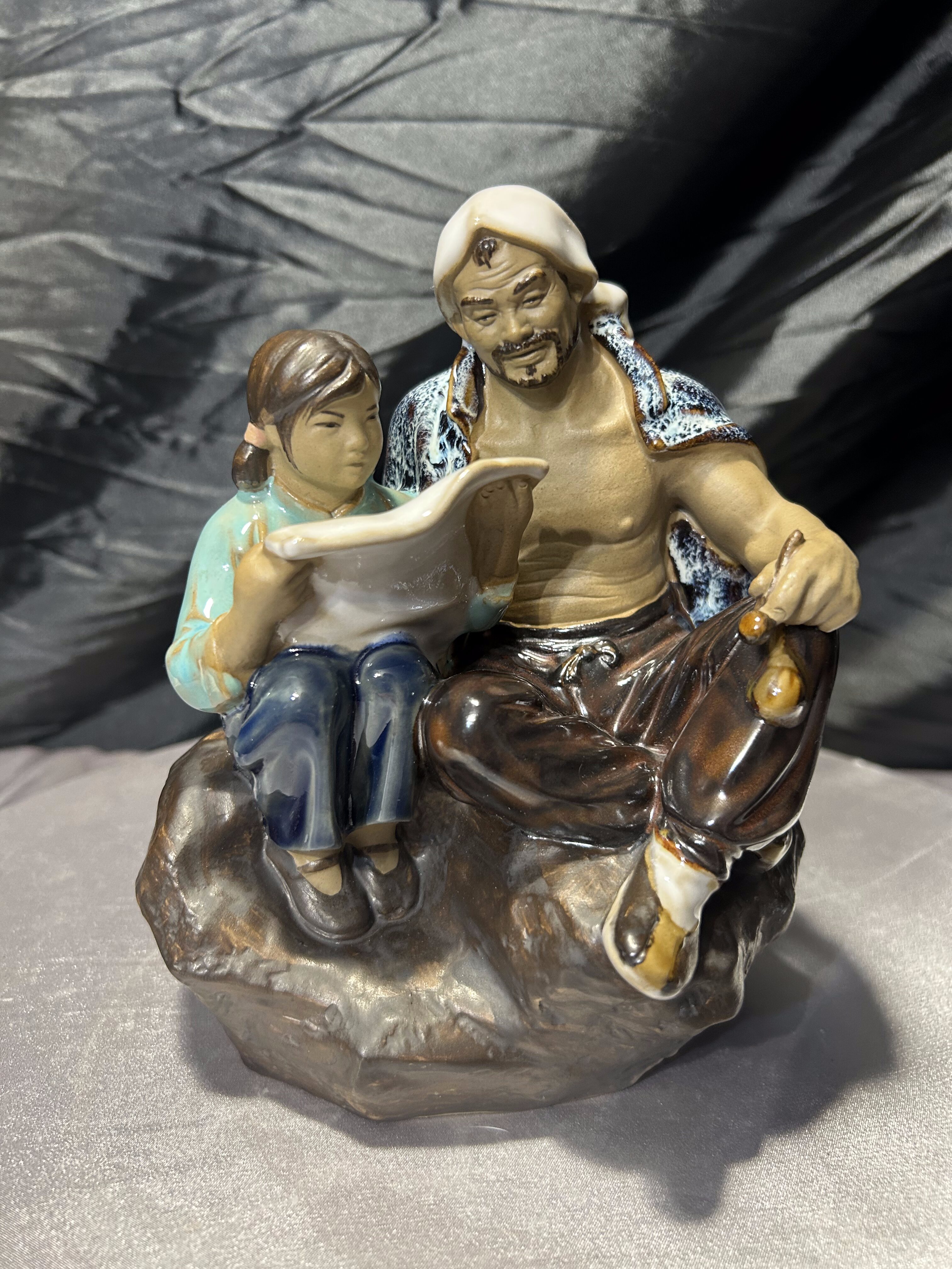 Porcelanowa figurka przedstawiająca siedzącego mężczyznę oraz dziecko, które wspólnie pochylają się nad mapą lub zwitkiem papieru. Scena utrzymana jest w stylistyce dalekowschodniej, z pięknie oddanymi detalami twarzy, ubrania oraz dynamiczną kompozycją postaci.