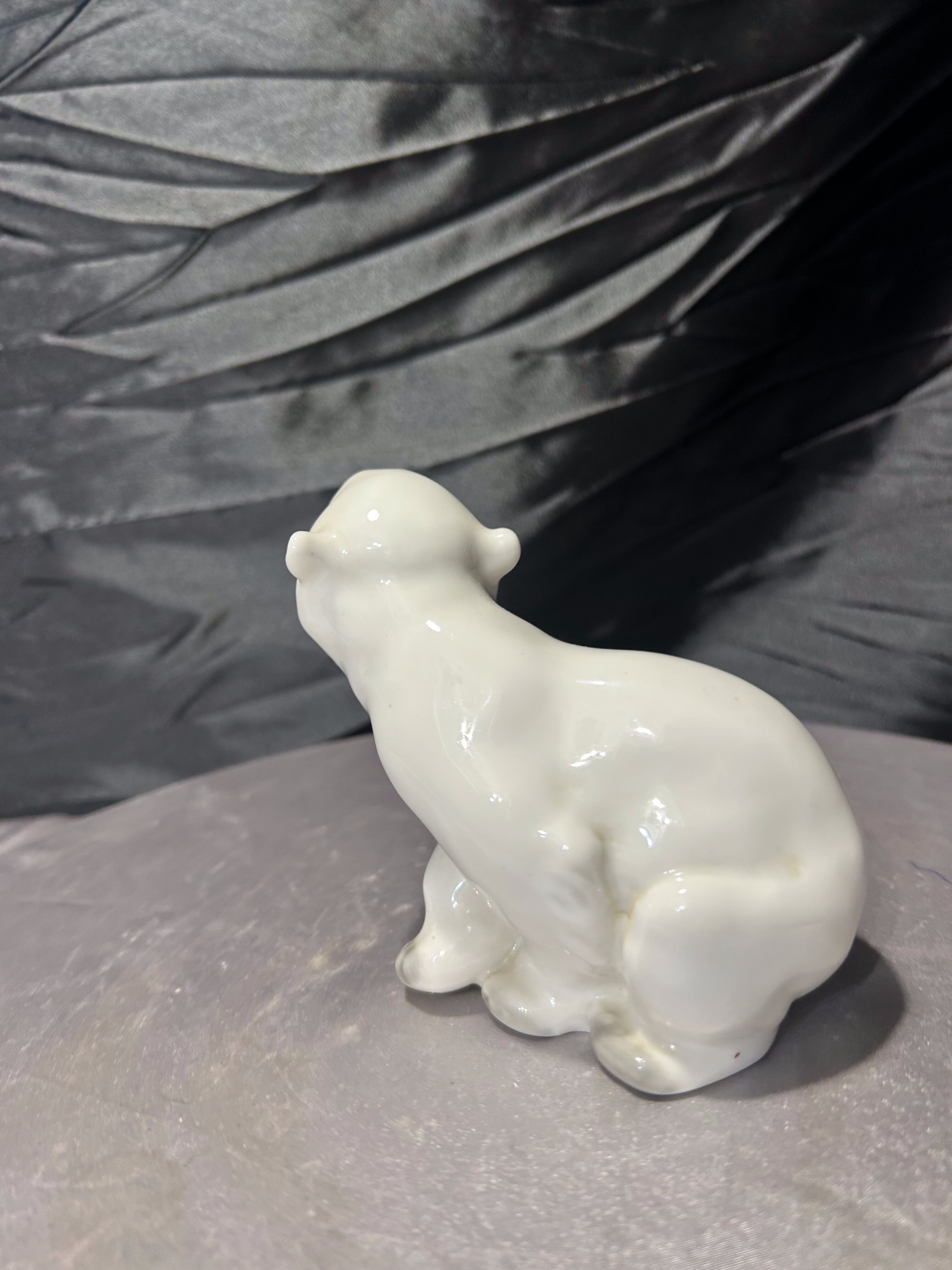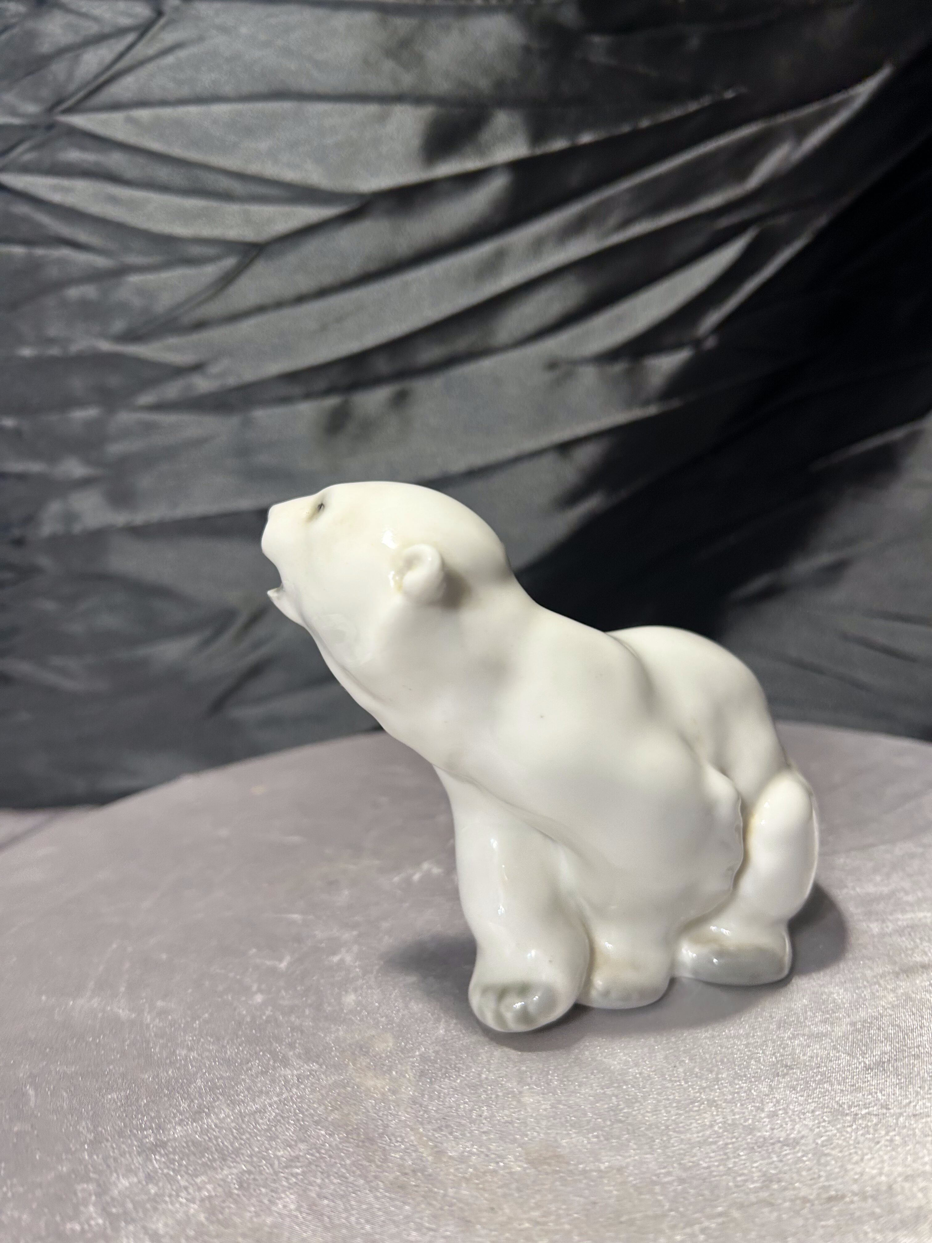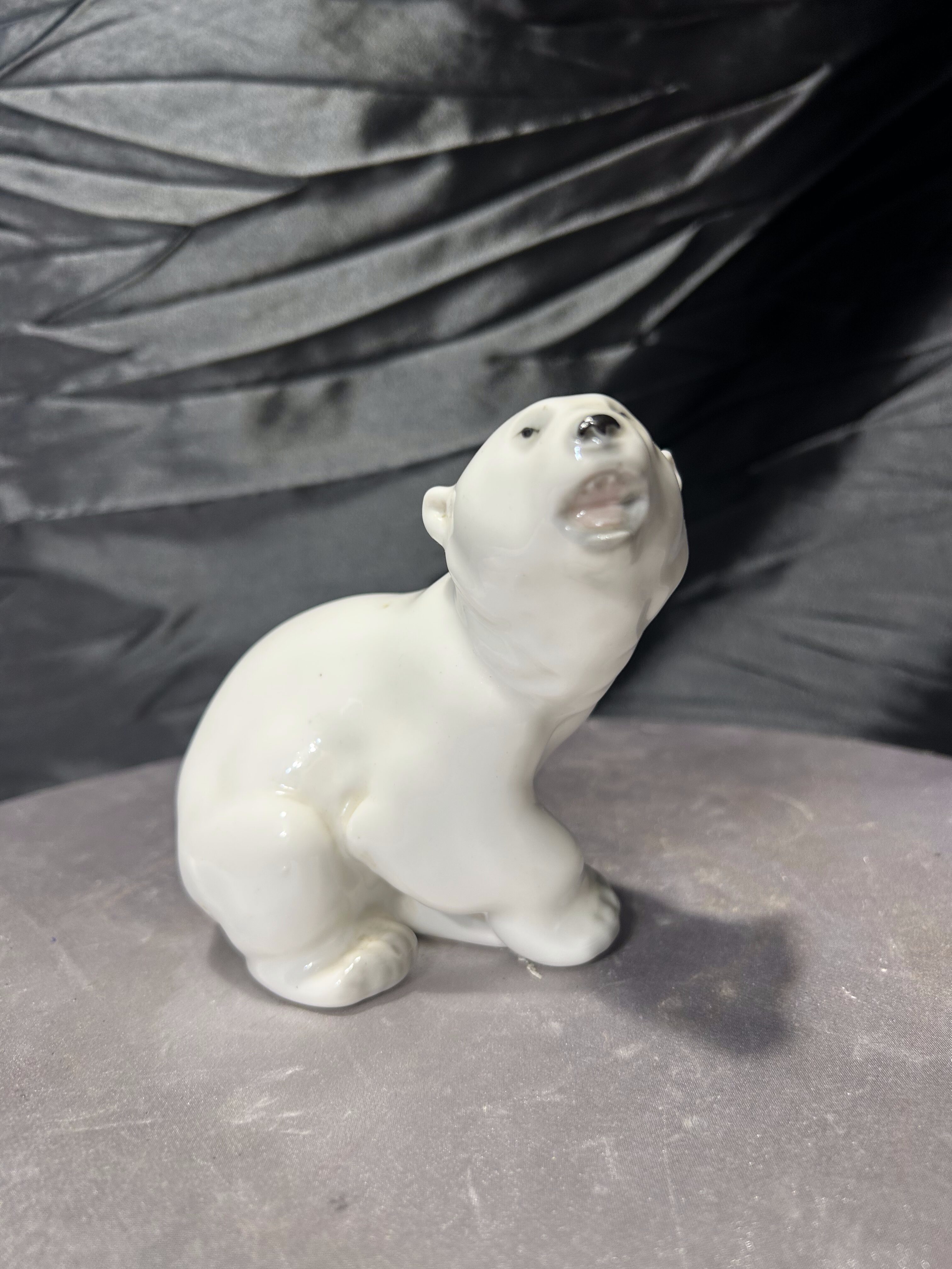 Porcelanowa figurka przedstawiająca niedźwiedzia w charakterystycznej, dynamicznej pozie. Model o wyraźnie zaznaczonej sylwetce i dopracowanych detalach, utrzymany w klasycznej, białej szkliwionej porcelanie. Figurki zwierząt z okresu ZSRR cieszą się dużym zainteresowaniem wśród kolekcjonerów ze względu na swoją formę, trwałość oraz rozpoznawalny styl produkcji.