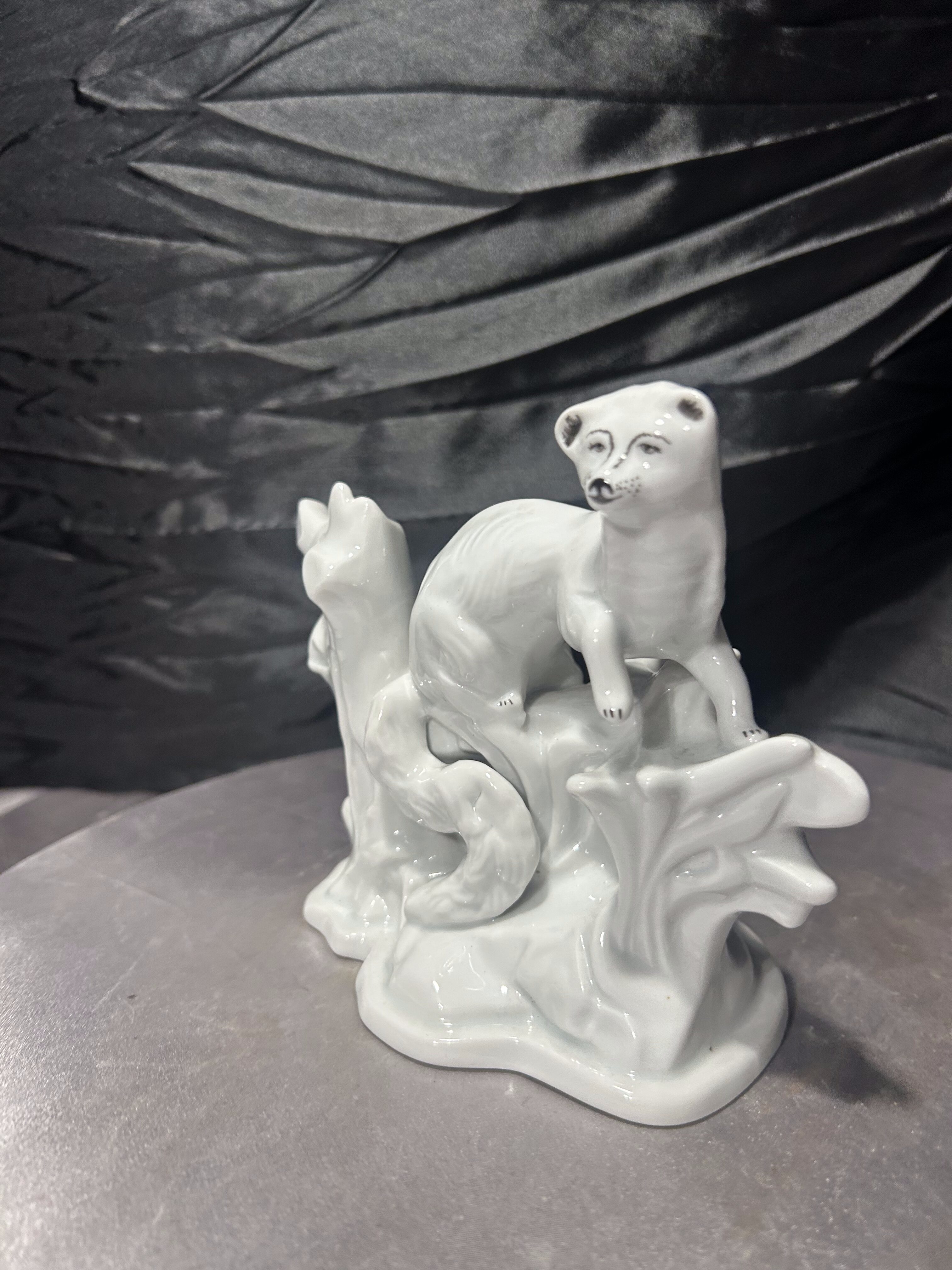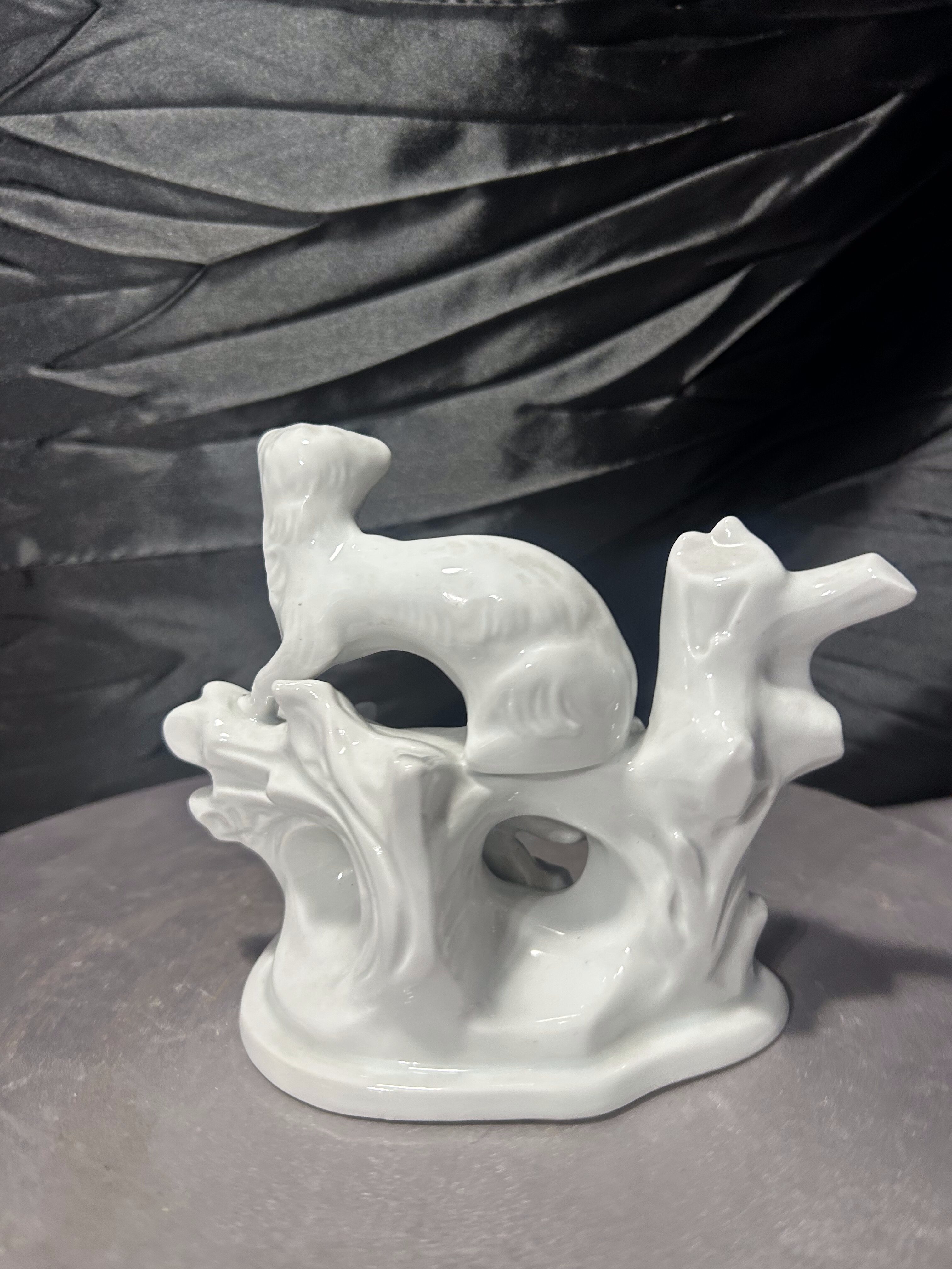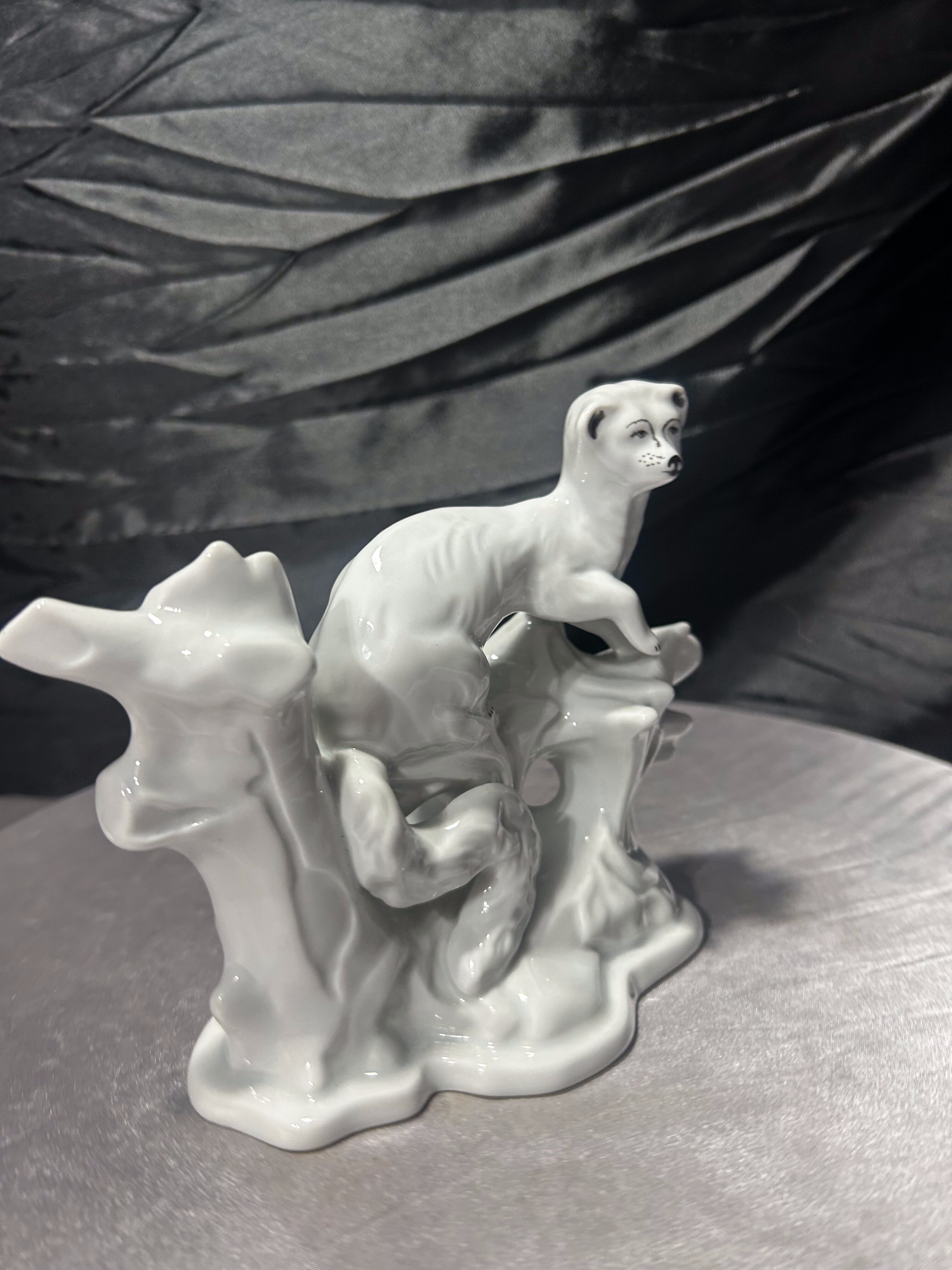 Elegancka, biała figurka porcelanowa przedstawiająca smukłe zwierzątko (typ łasica, fretka lub gronostaj) ułożone na stylizowanej gałęzi. Całość ma spokojny, klasyczny charakter i pięknie prezentuje się w aranżacji vintage lub w kolekcji figurek zwierzęcych. Figurka jest sygnowana pod spodem znakiem ARPO oraz napisem „Made in Romania” i „Curtea de Arges Fine Porcelain”, co wskazuje na rumuńską wytwórnię porcelany ARPO z Curtea de Arges.