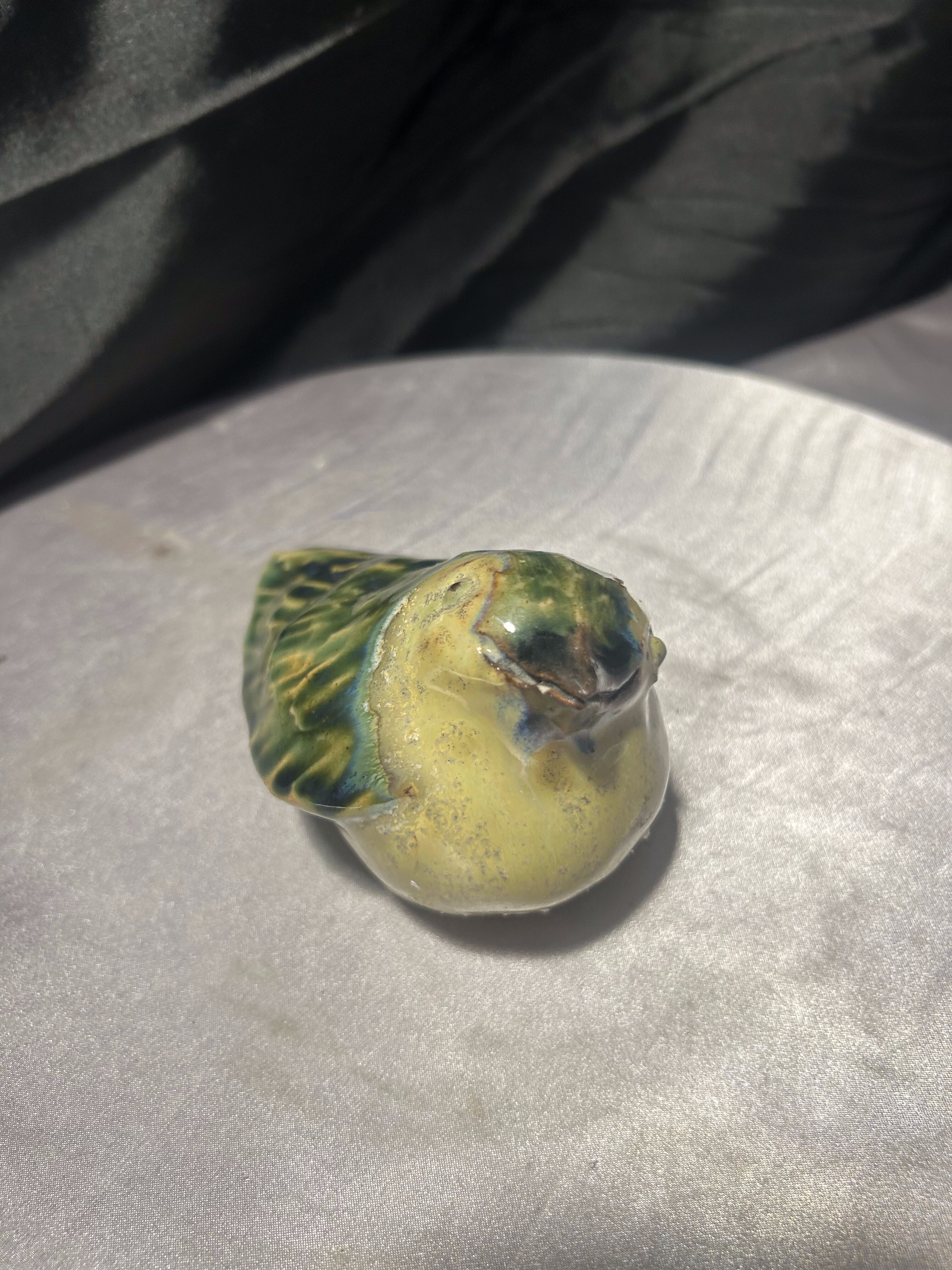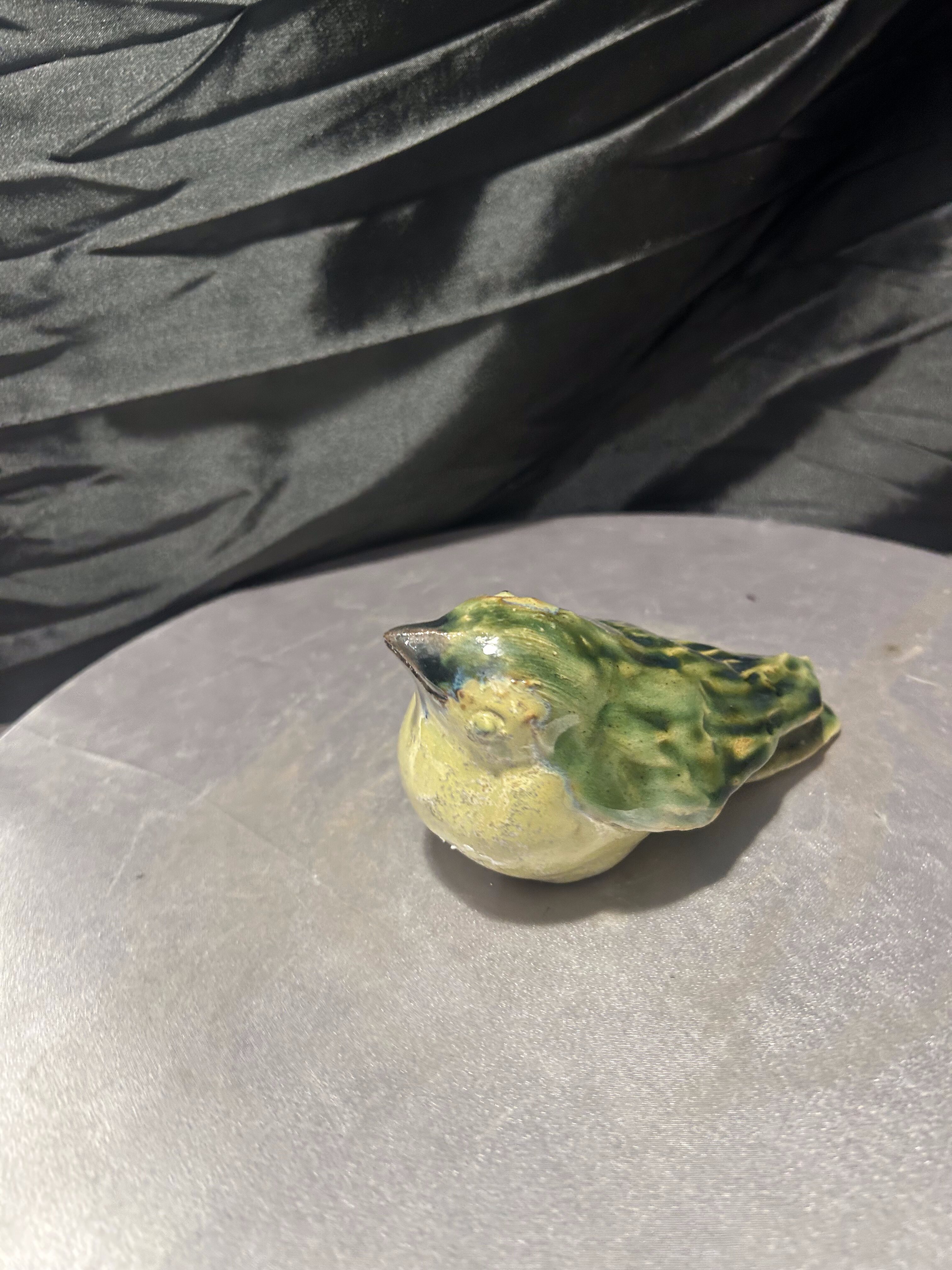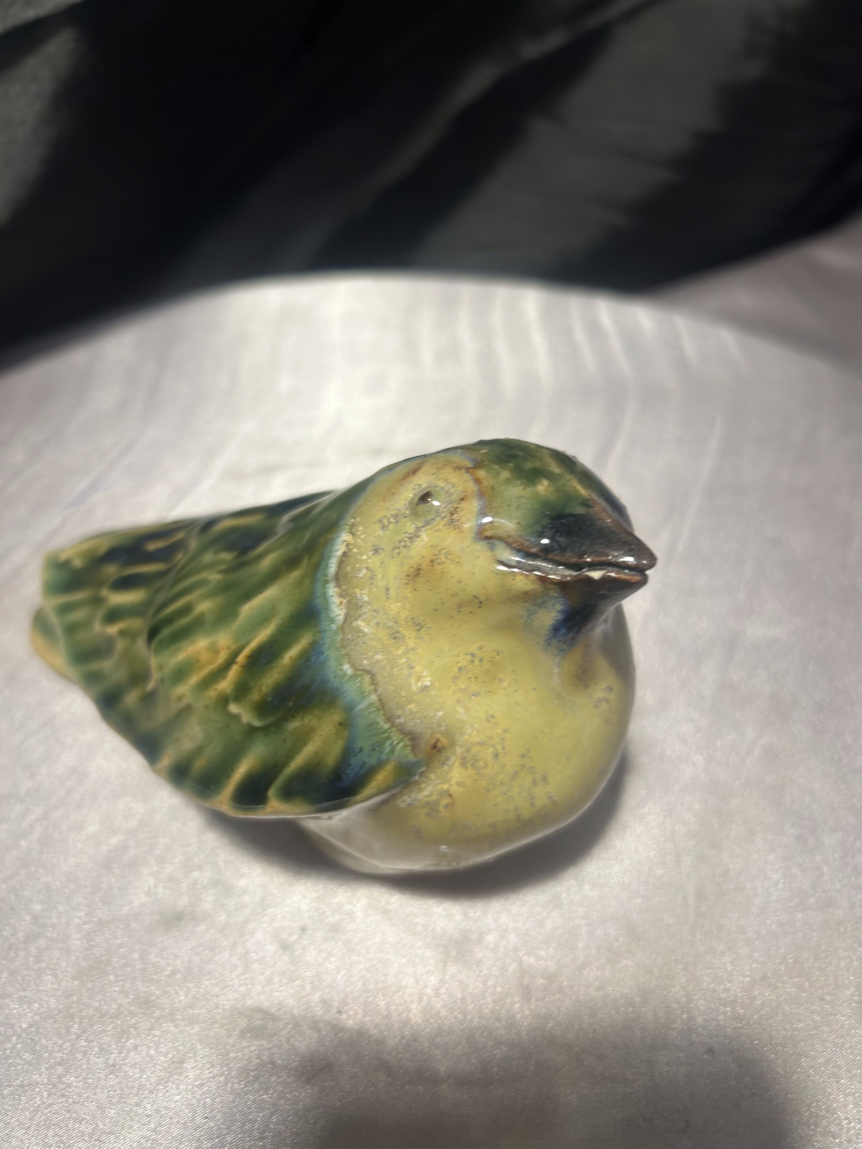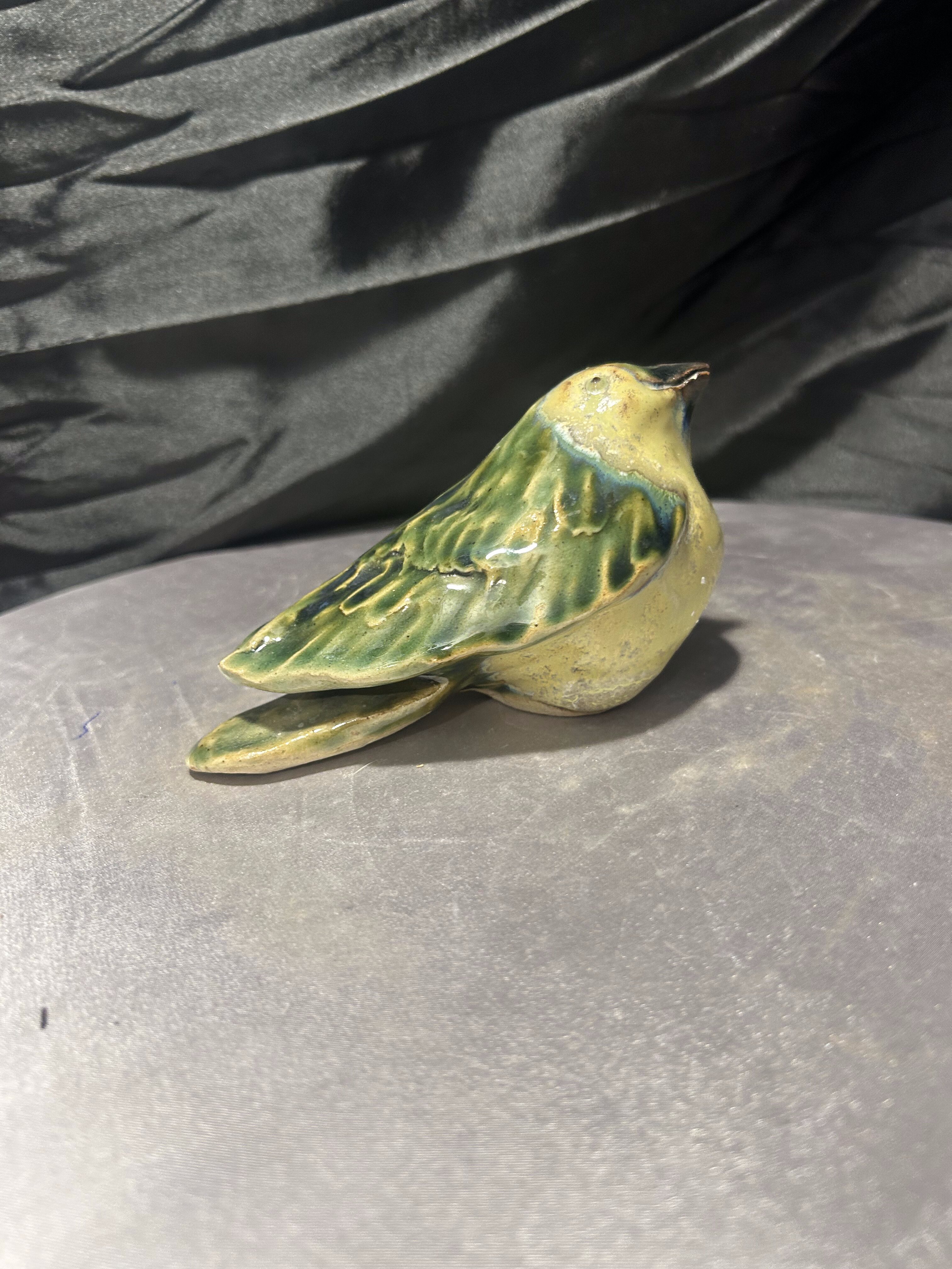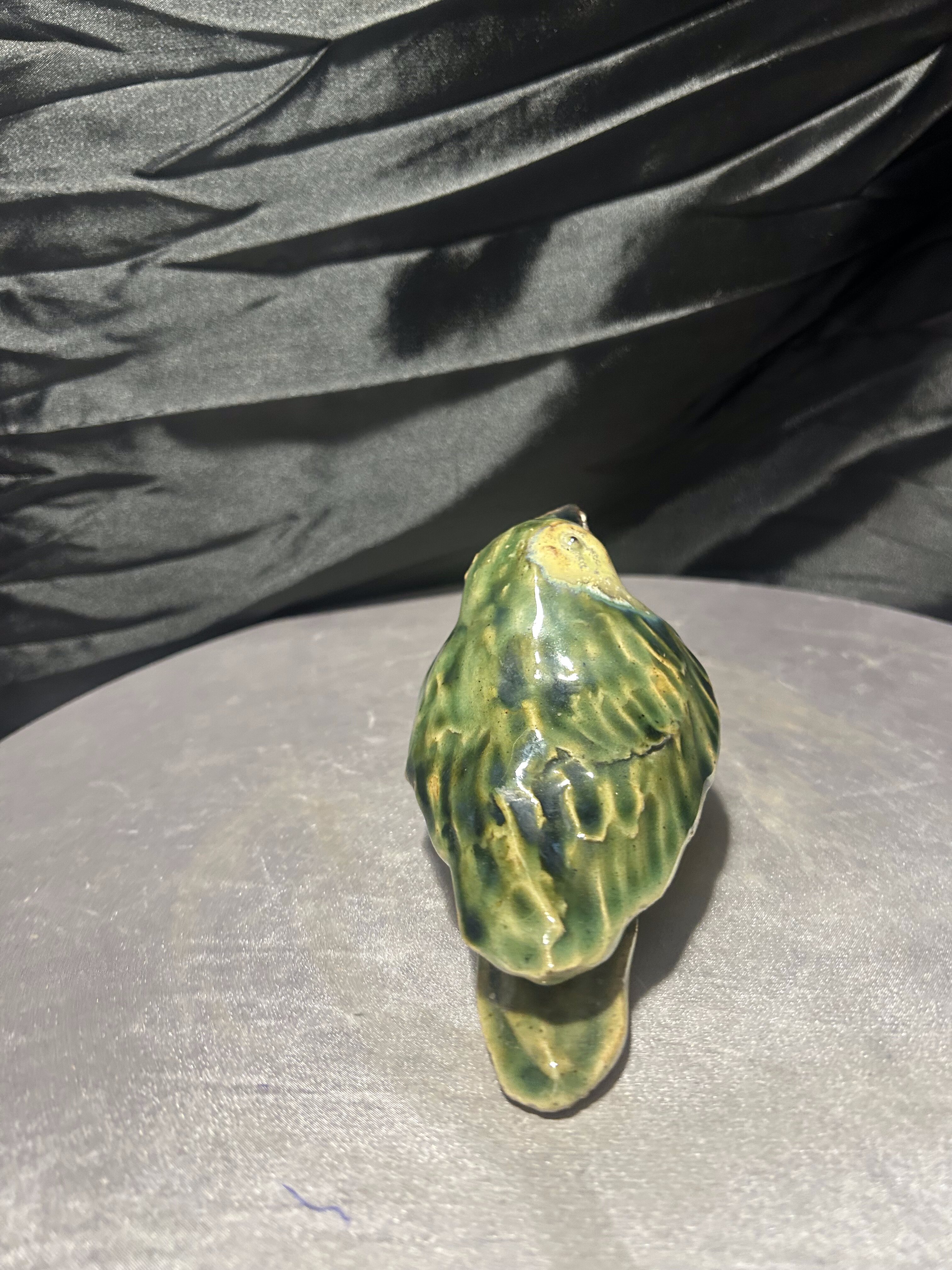 Dekoracyjna figurka ceramicznego ptaszka wykonana w artystycznym stylu charakterystycznym dla skandynawskiego rzemiosła użytkowego. Egzemplarz posiada oryginalną naklejkę producenta Bjørn Løiten z Oslo, co potwierdza jego norweskie pochodzenie. Subtelnie modelowana forma oraz ręcznie nakładane szkliwa w odcieniach zieleni, żółci i delikatnych przejść tonalnych nadają figurce naturalny i bardzo dekoracyjny charakter.
