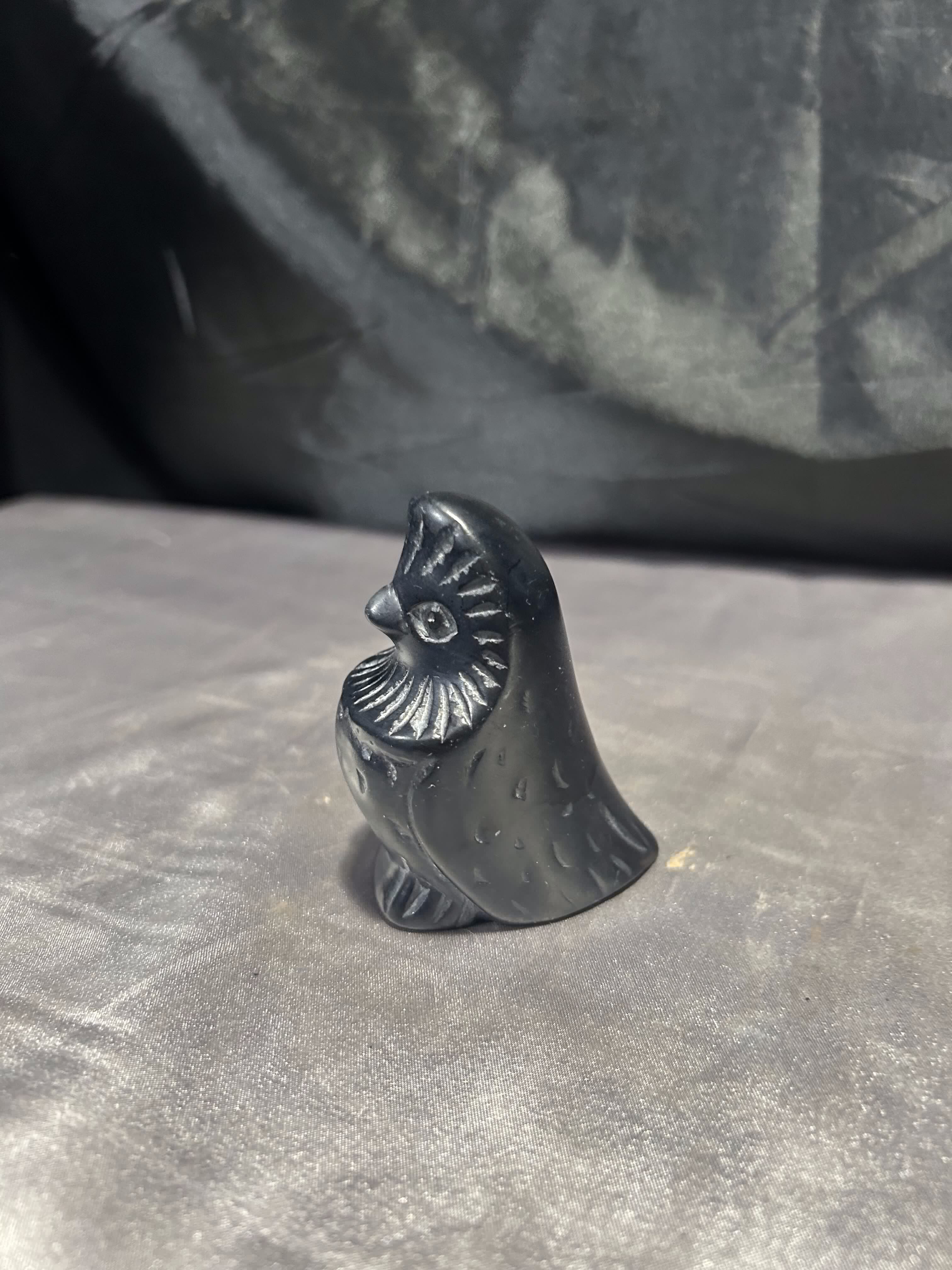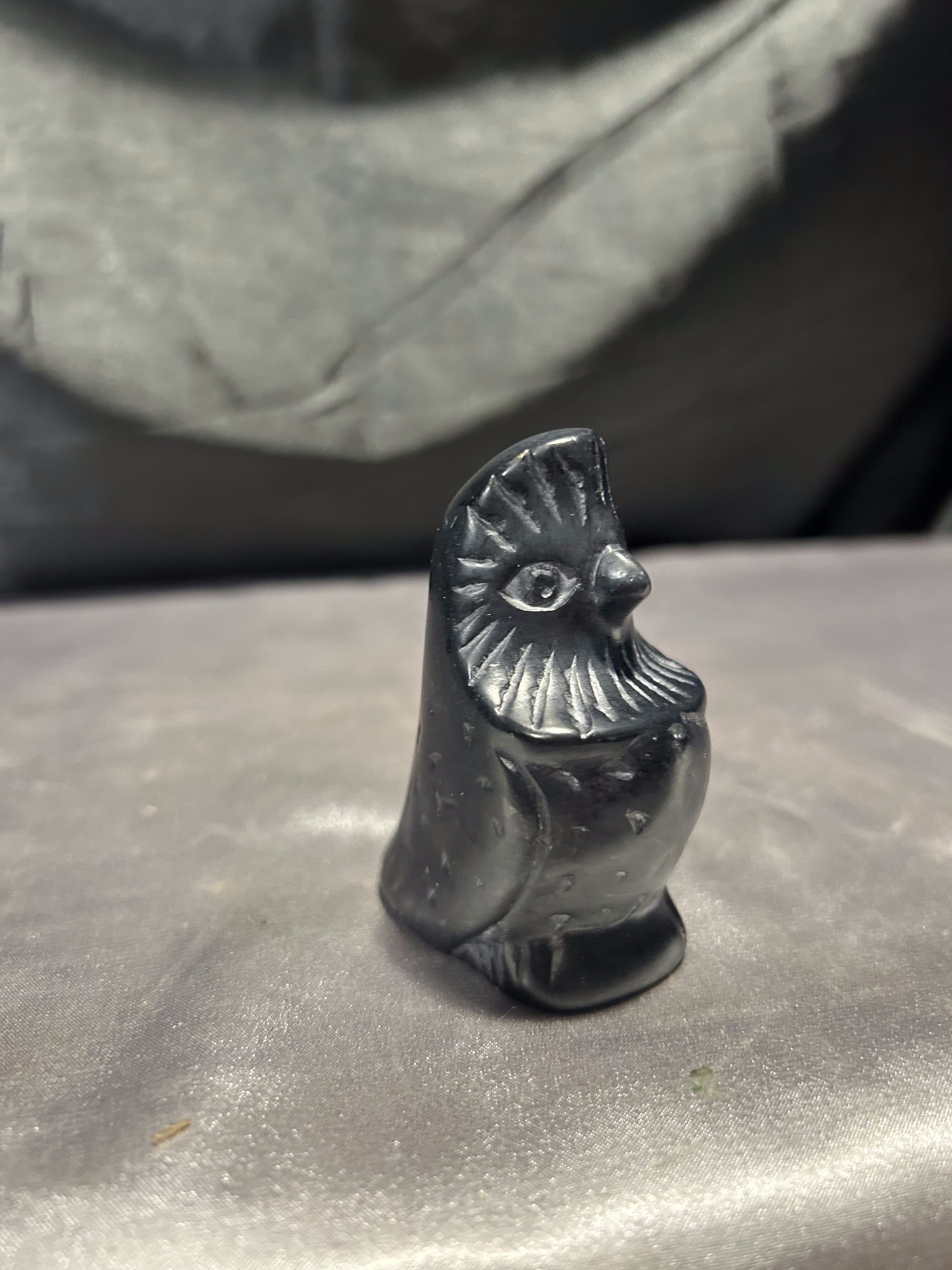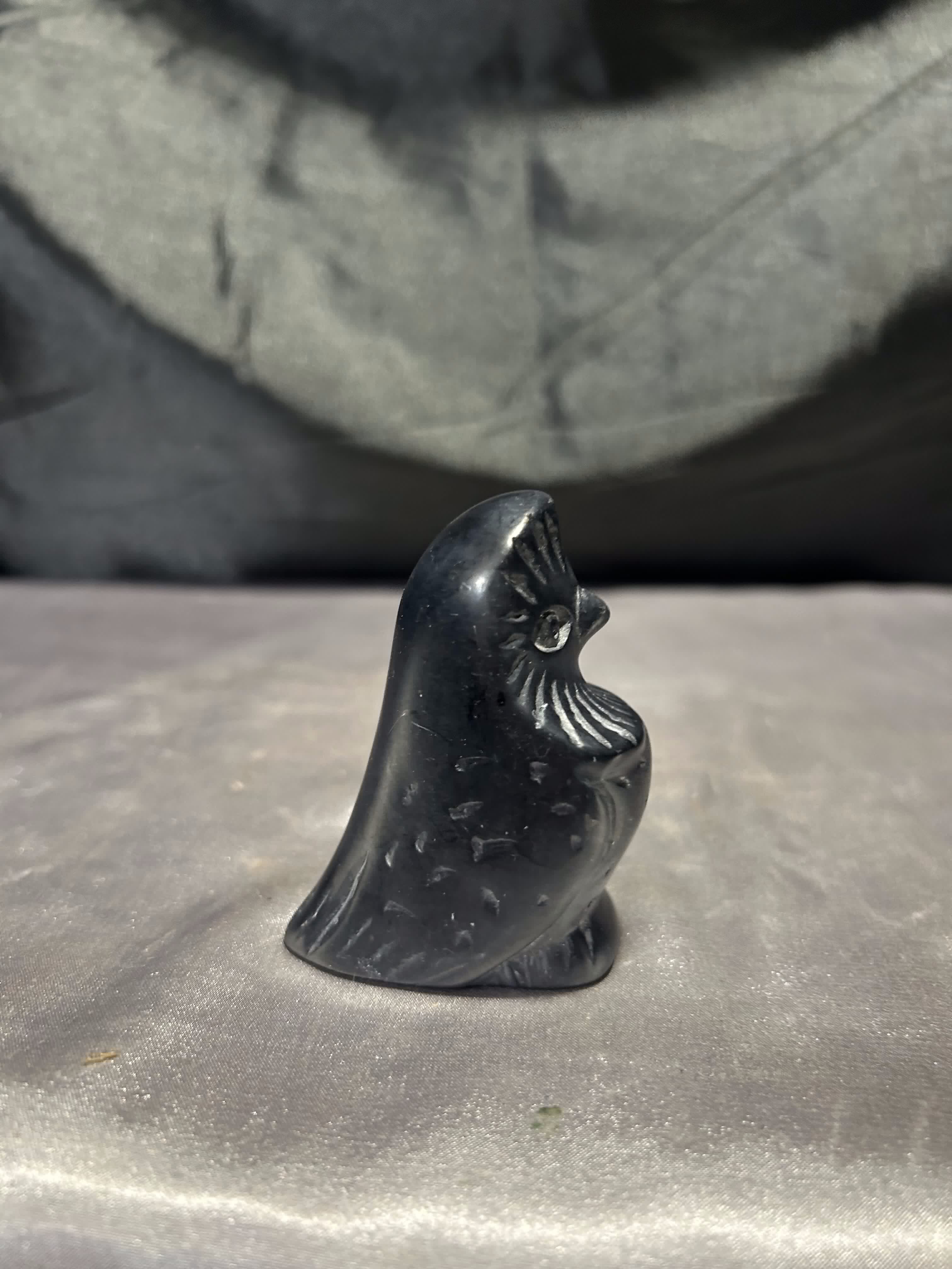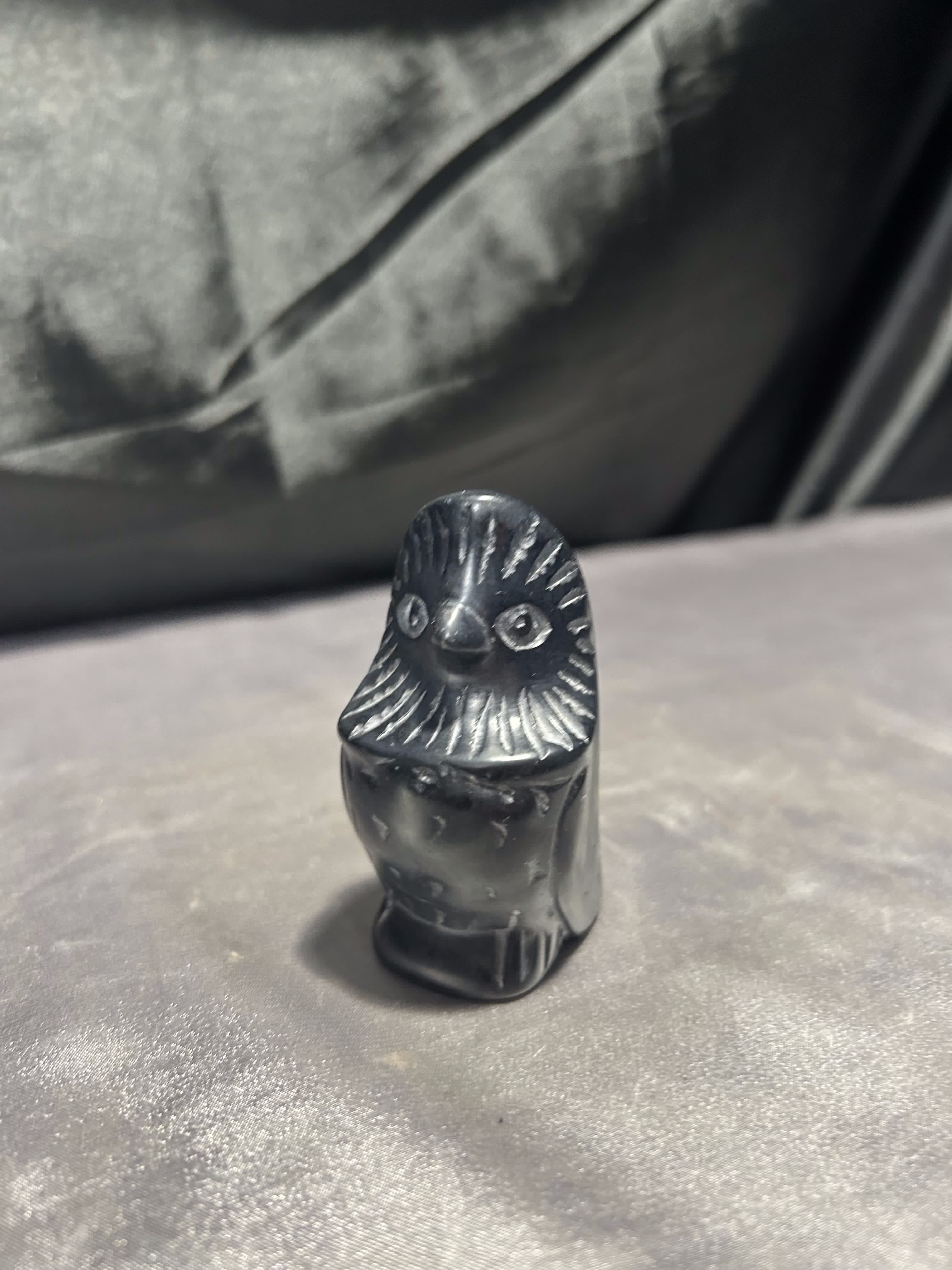 Niewielka figurka przedstawiająca siedzącego ptaka, wykonana z kamienia w czarnym kolorze. Forma surowa i oszczędna, z topornymi rycinami podkreślającymi skrzydła, dziób i kontury sylwetki.