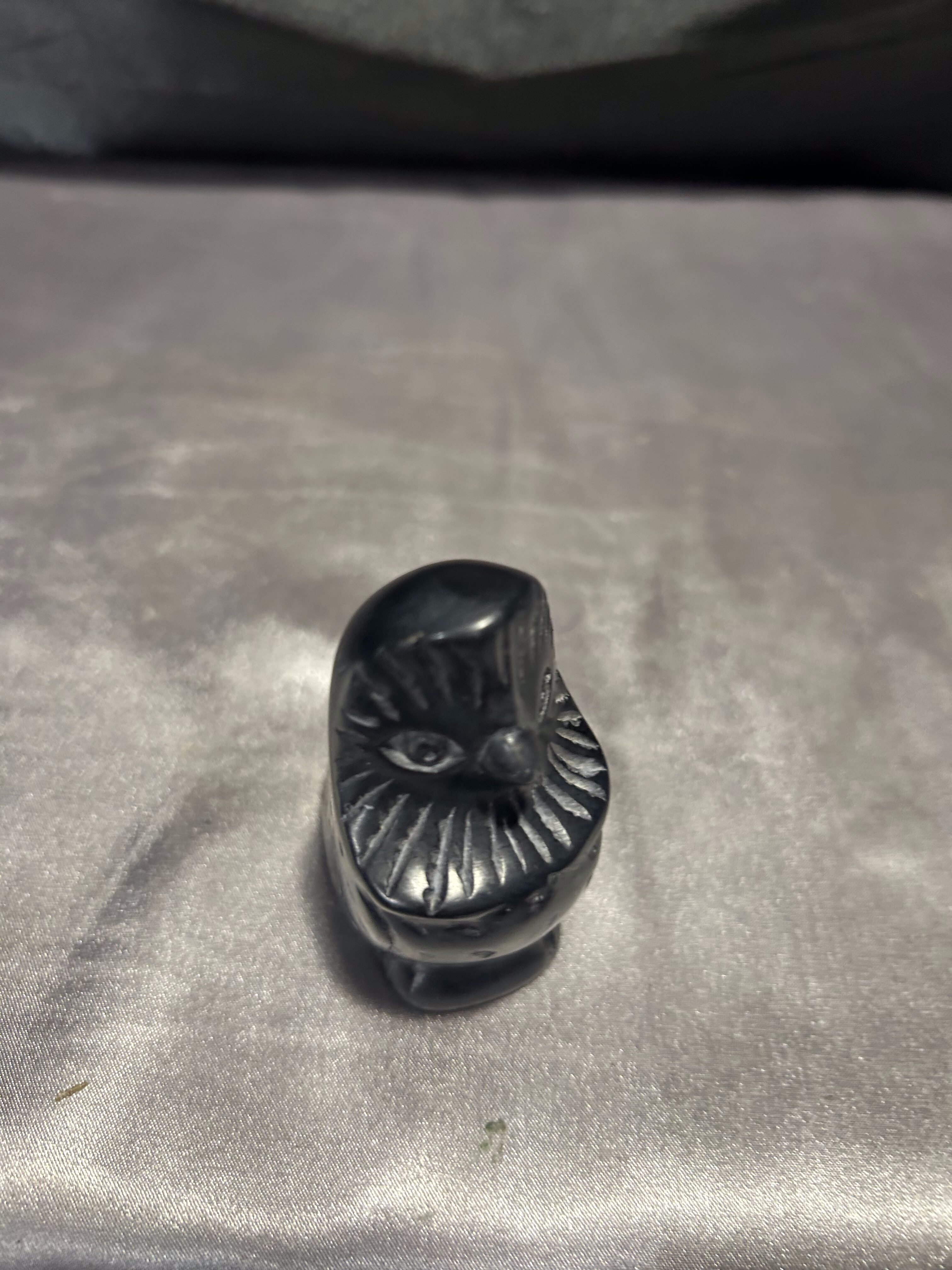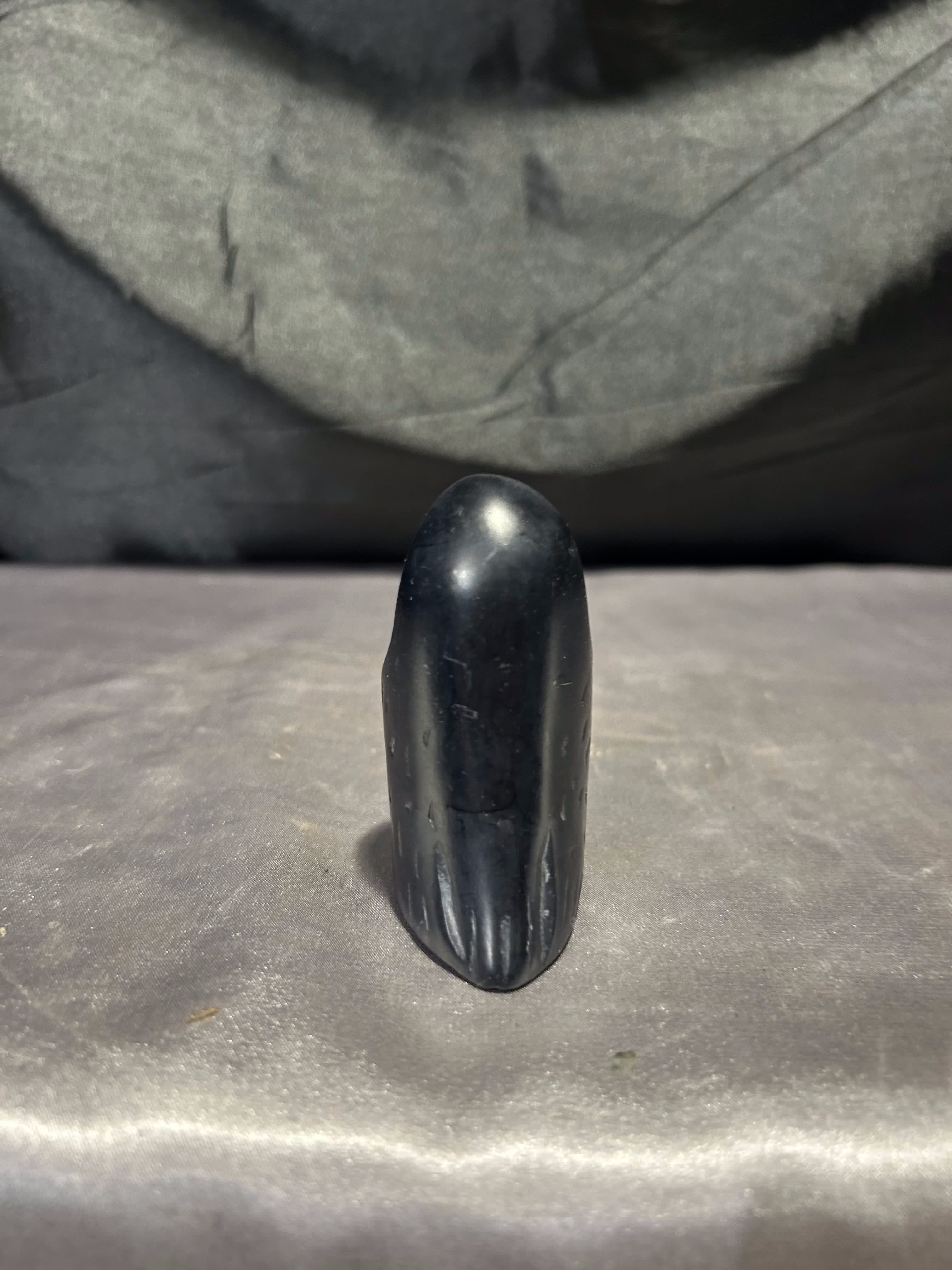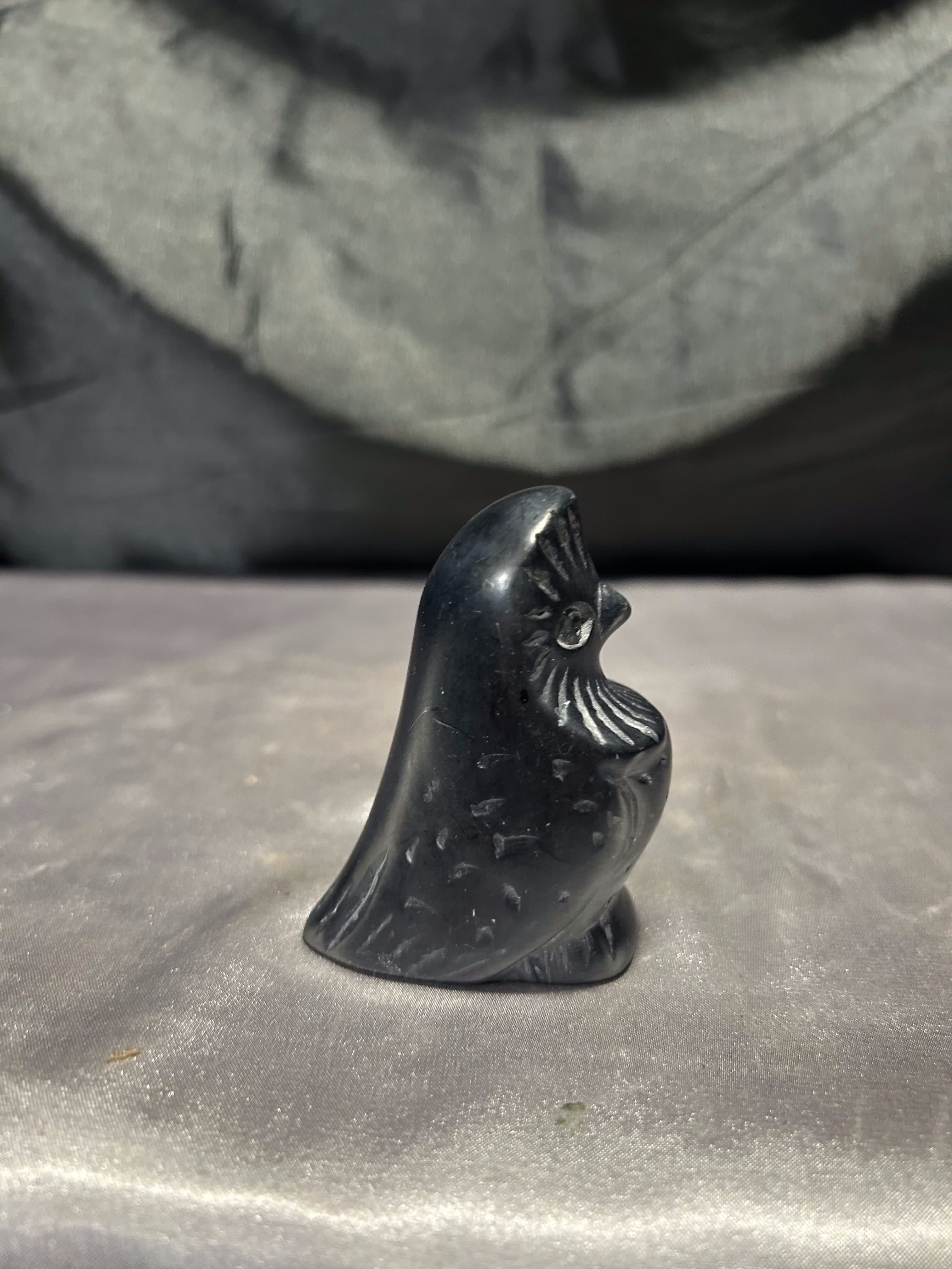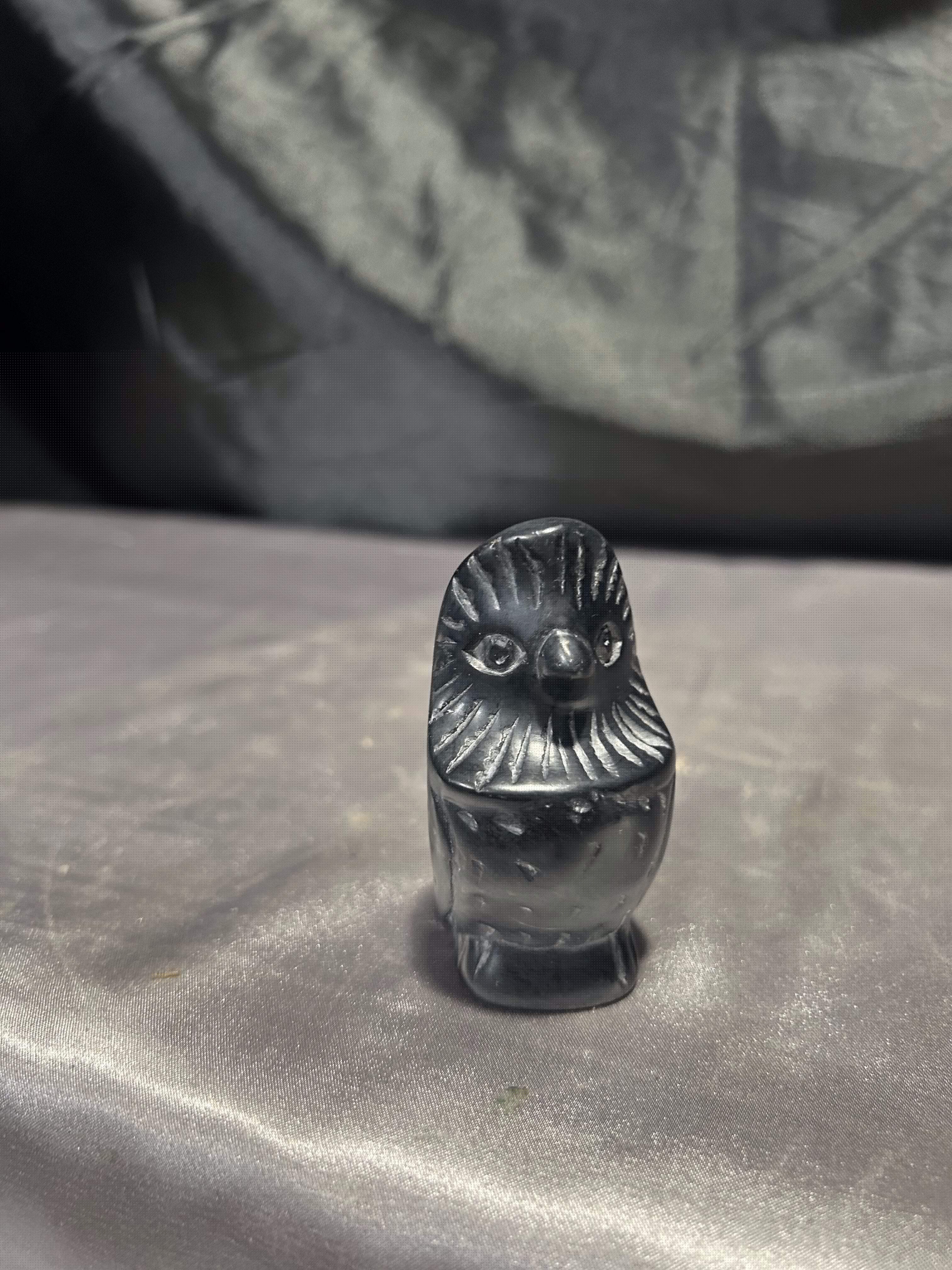 Niewielka figurka przedstawiająca siedzącego ptaka, wykonana z kamienia w czarnym kolorze. Forma surowa i oszczędna, z topornymi rycinami podkreślającymi skrzydła, dziób i kontury sylwetki.