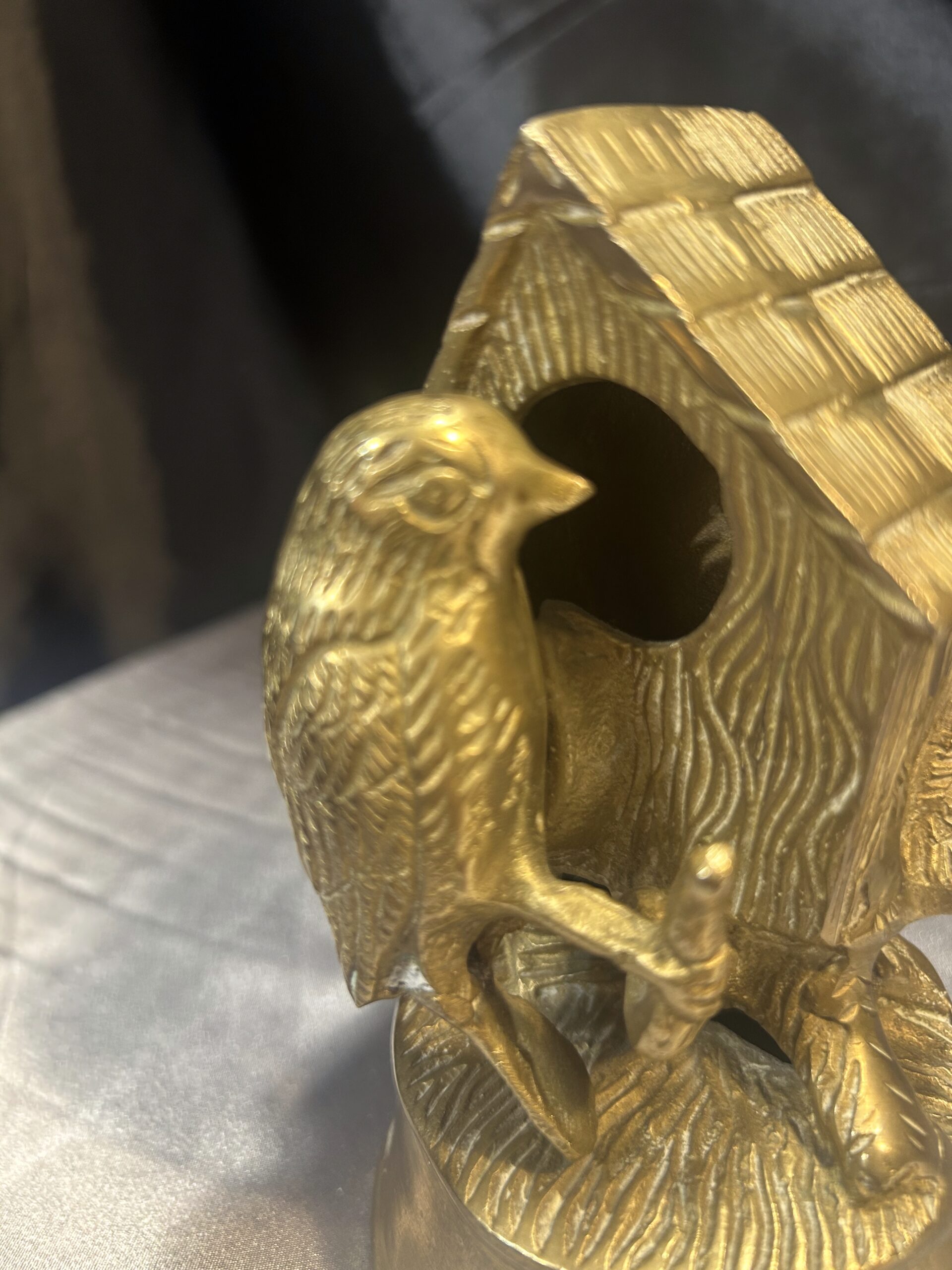 Przedstawiamy śliczną figurkę ptaszka, siedzącego na żerdzi przy budce dla ptaków, osadzonej na misternie wykonanej gałęzi. Figurka wykonana z mosiądzu zachwyca precyzyjnym odwzorowaniem detali, co czyni ją niepowtarzalnym elementem dekoracyjnym.