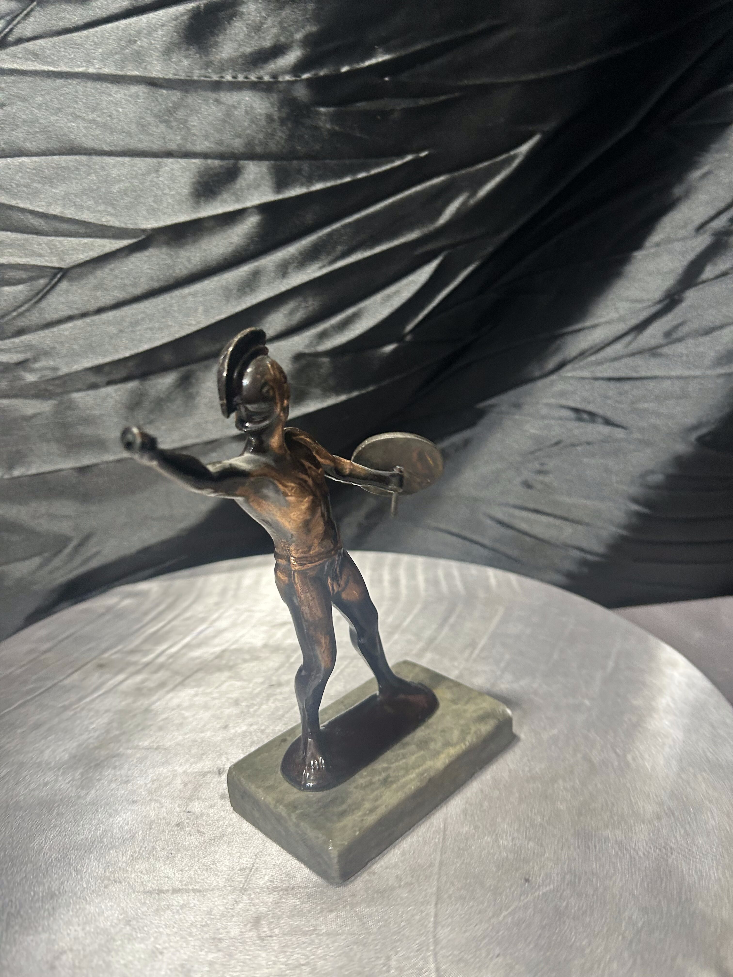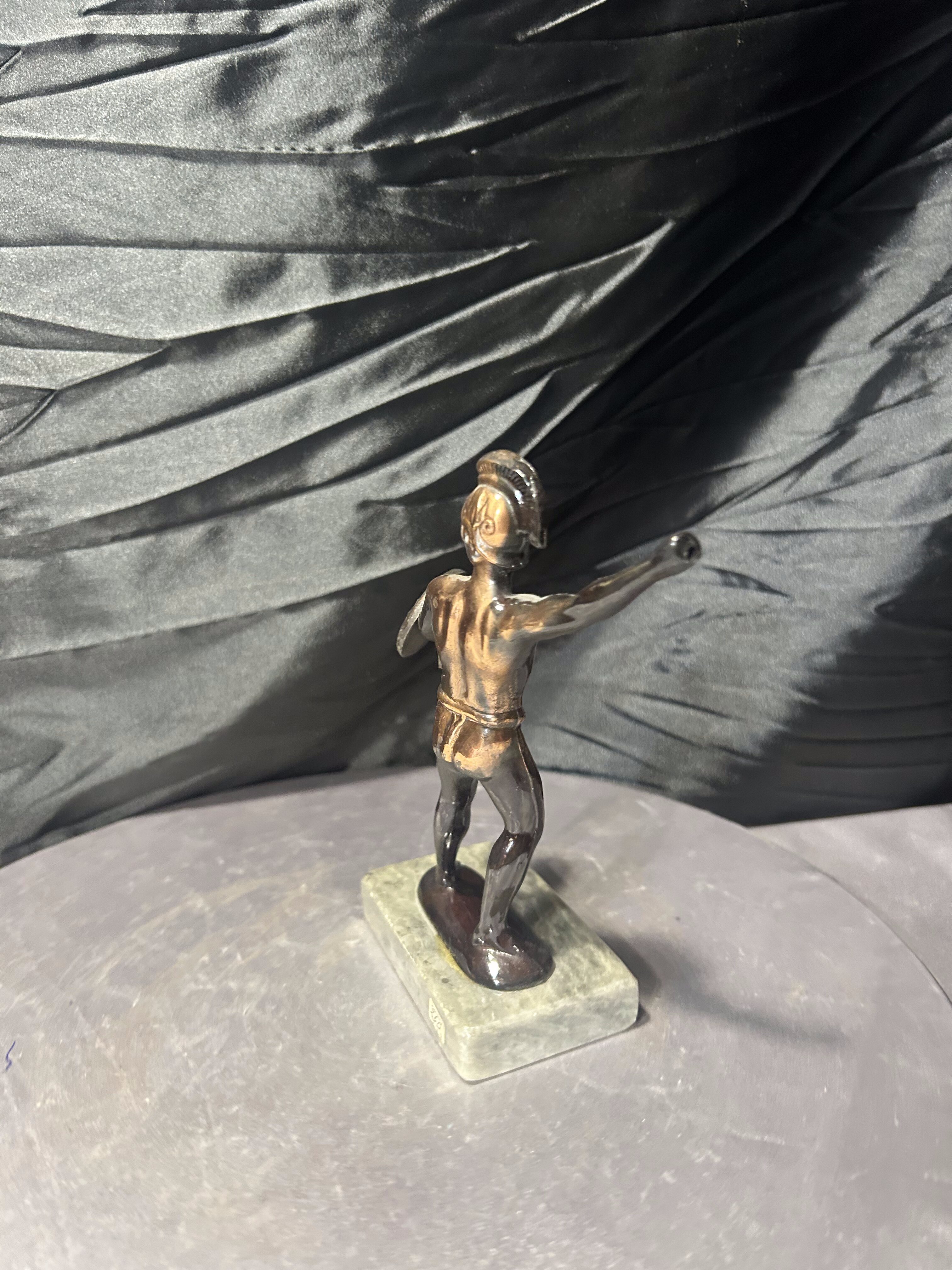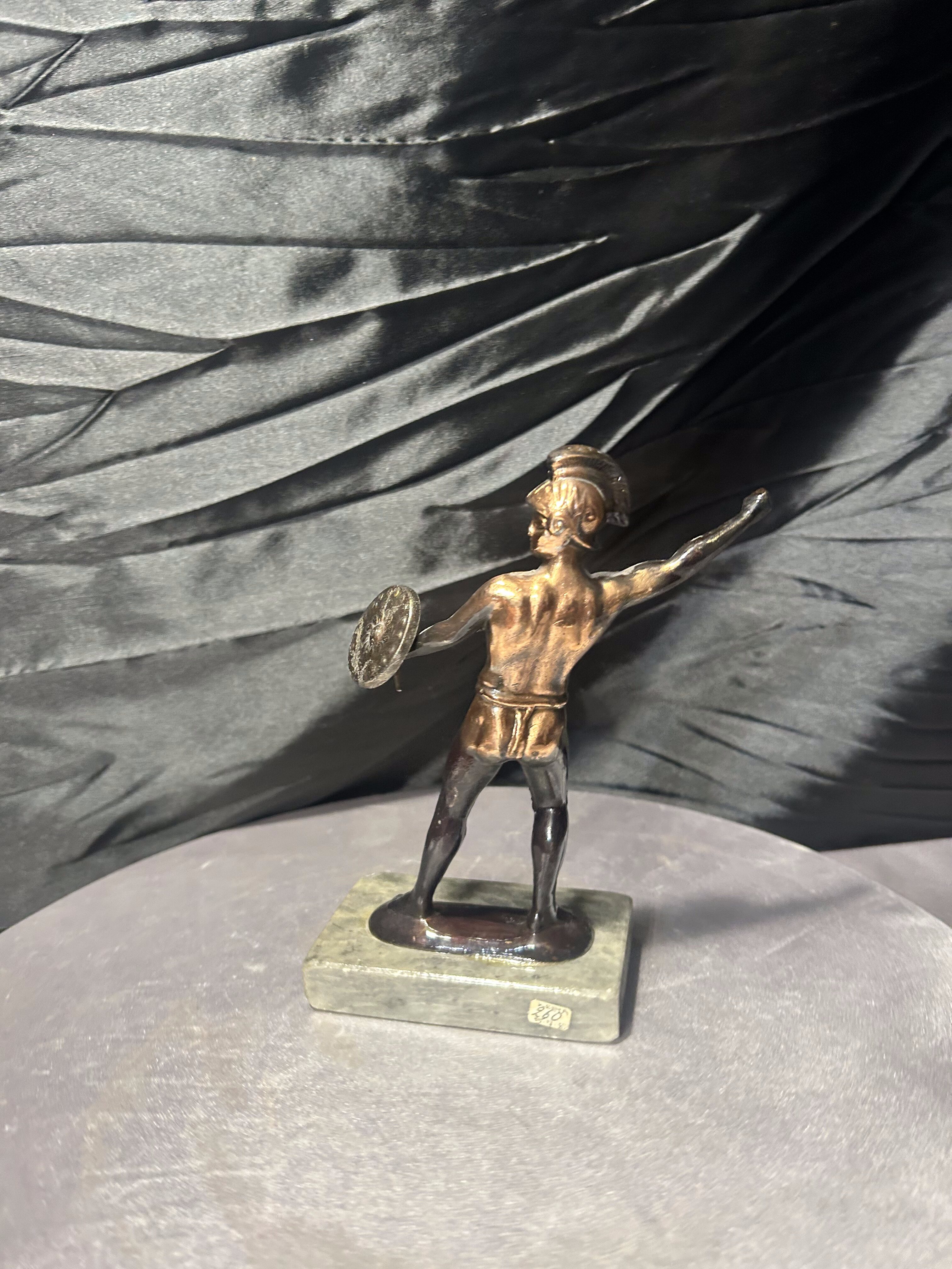 Dekoracyjna figurka rzymianina przedstawiona w dynamicznej pozie, wykonana z metalu z patyną, osadzona na kamiennej podstawie. Postać trzyma tarczę, sylwetka oddana z dbałością o detale anatomiczne i historyczny charakter. Styl nawiązuje do klasycznych przedstawień wojowników starożytnego Rzymu. (bez włóczni)
