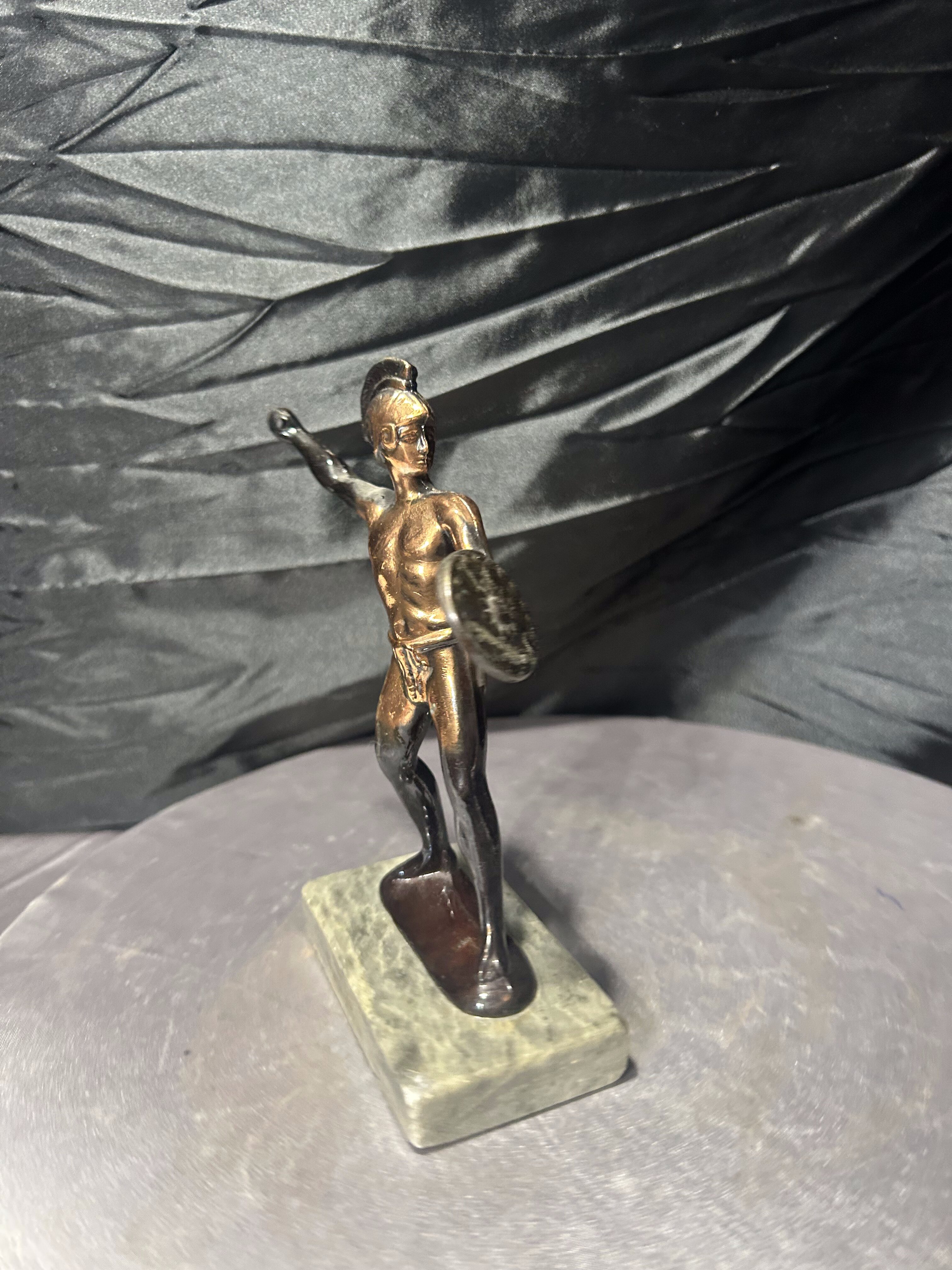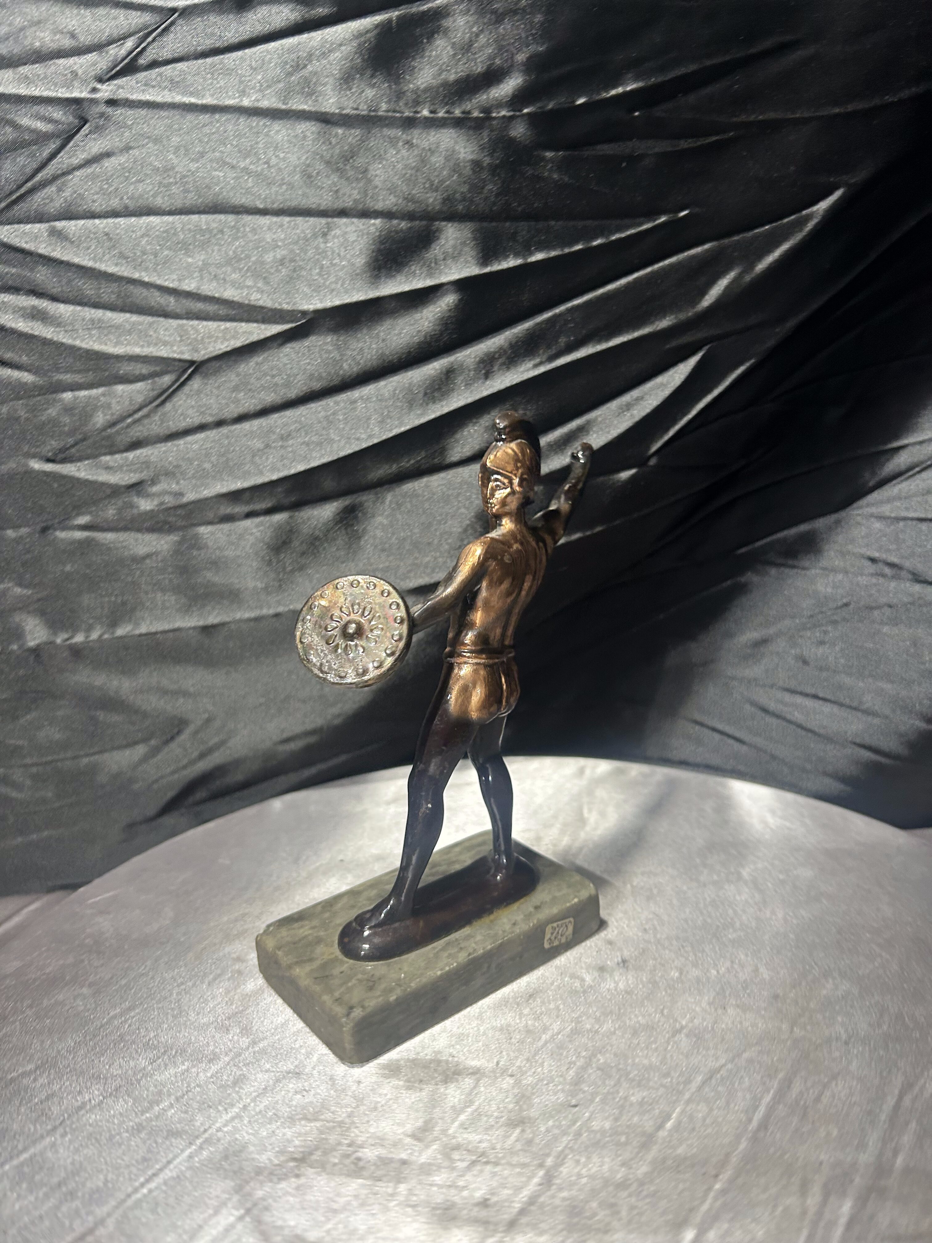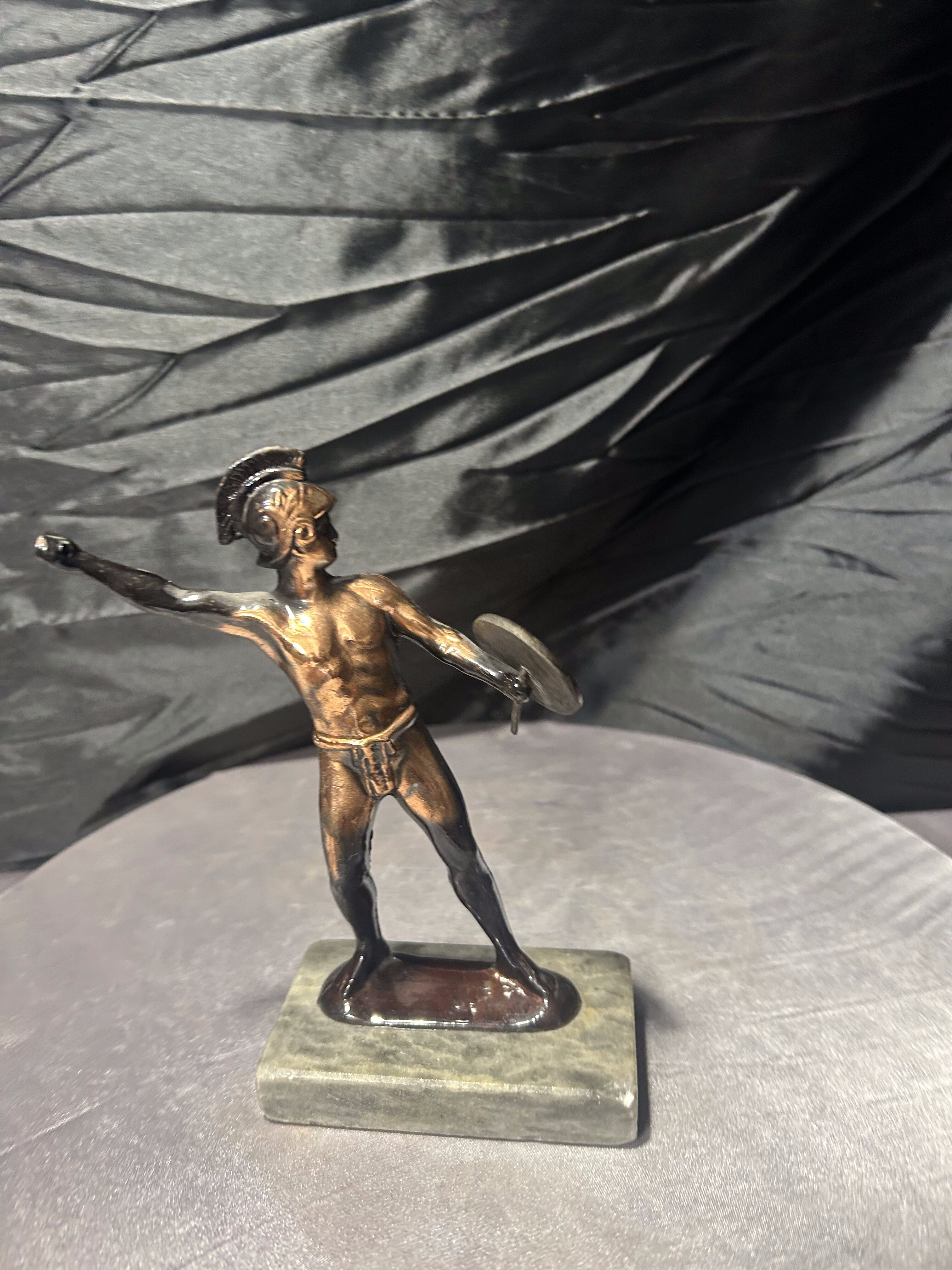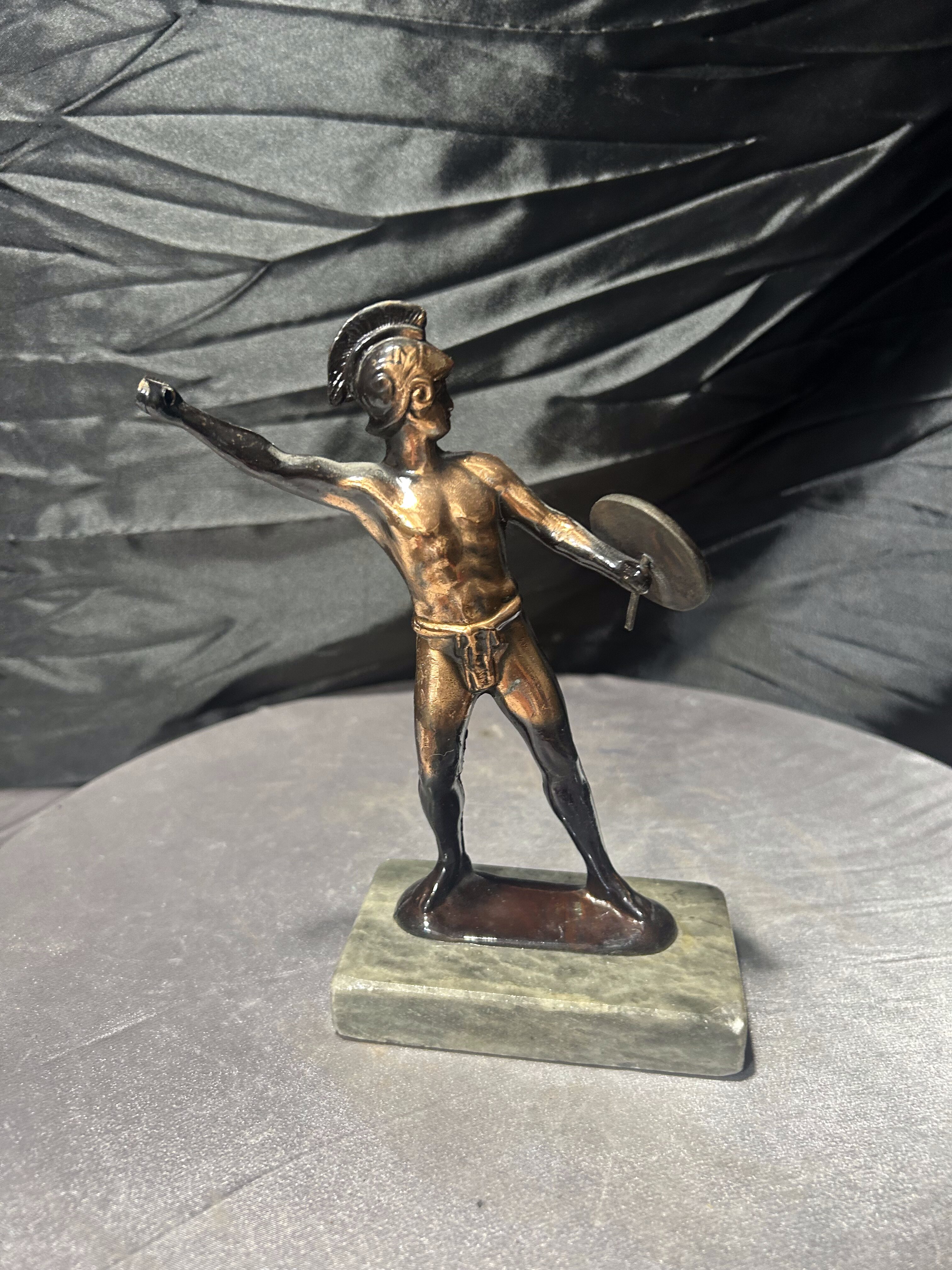 Dekoracyjna figurka rzymianina przedstawiona w dynamicznej pozie, wykonana z metalu z patyną, osadzona na kamiennej podstawie. Postać trzyma tarczę, sylwetka oddana z dbałością o detale anatomiczne i historyczny charakter. Styl nawiązuje do klasycznych przedstawień wojowników starożytnego Rzymu. (bez włóczni)