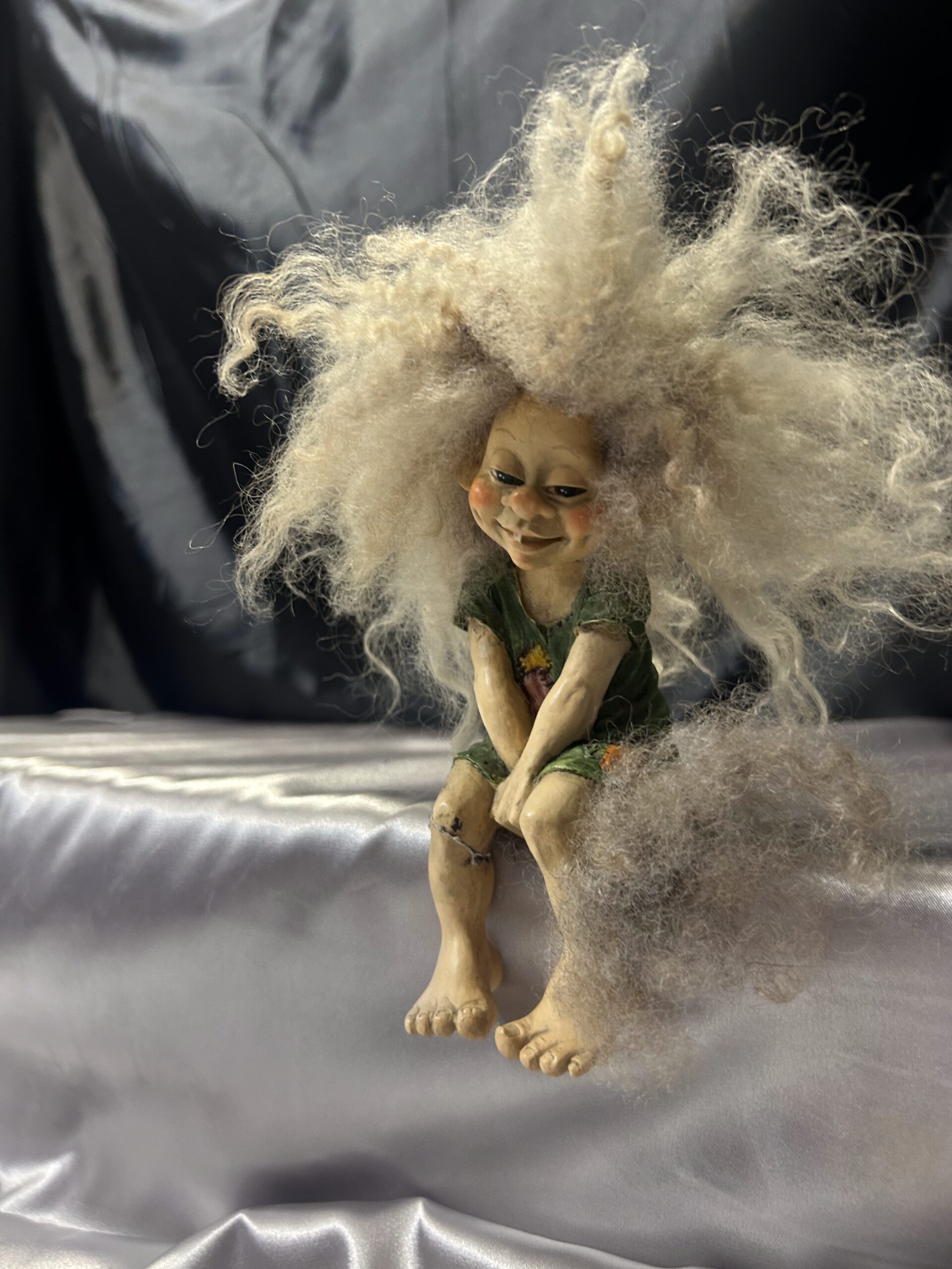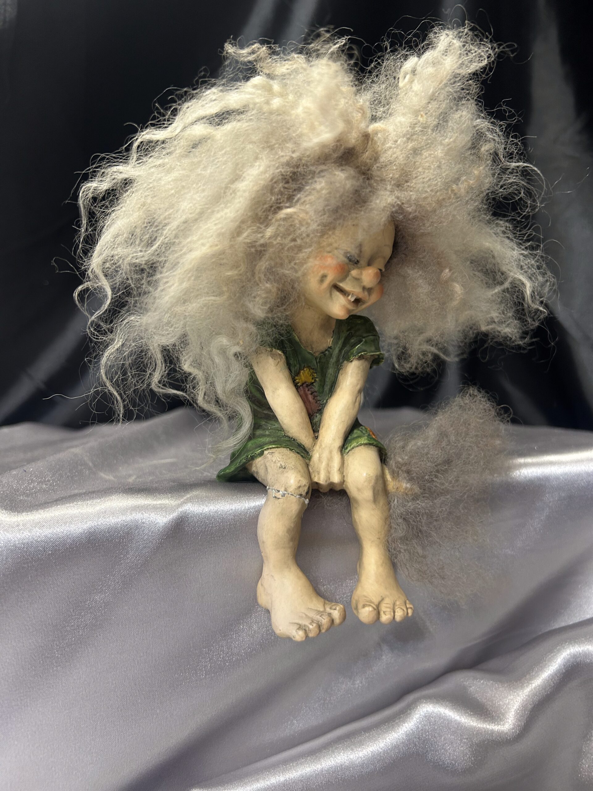 Figurka Siedzącej Dziewczyny Trolla – Realistyczna, z Rozczochranymi Loki i Włochatym Ogonkiem
