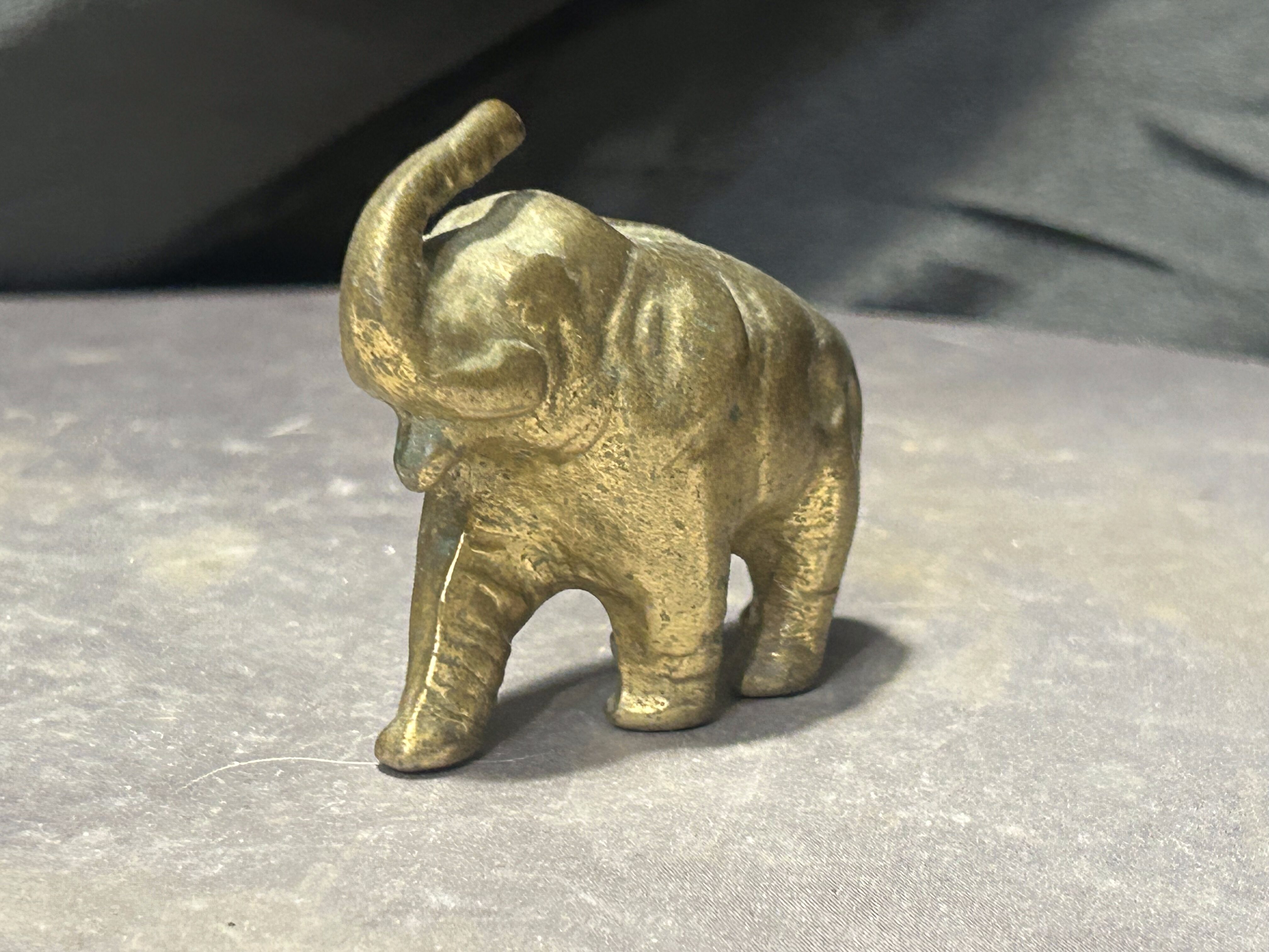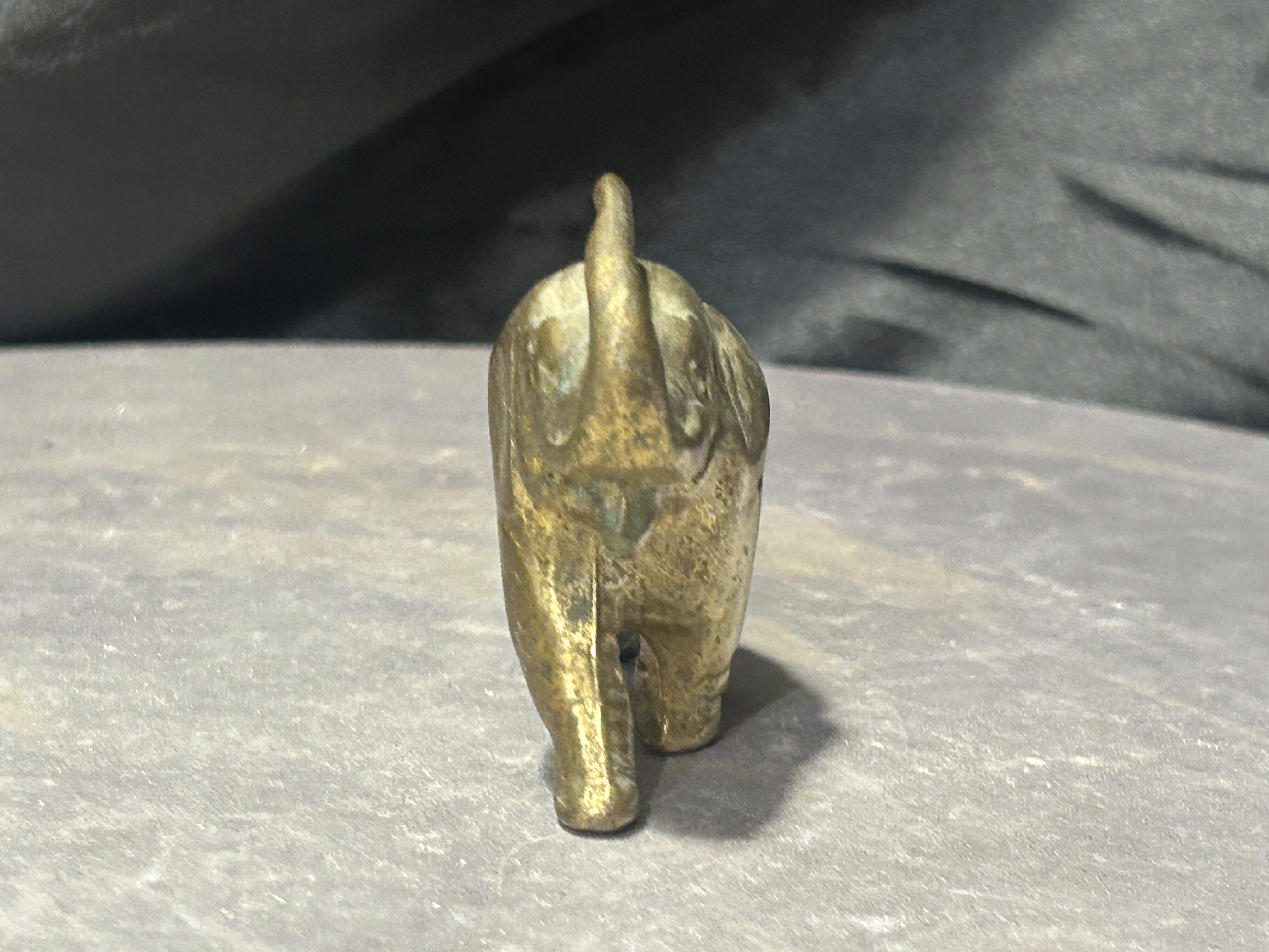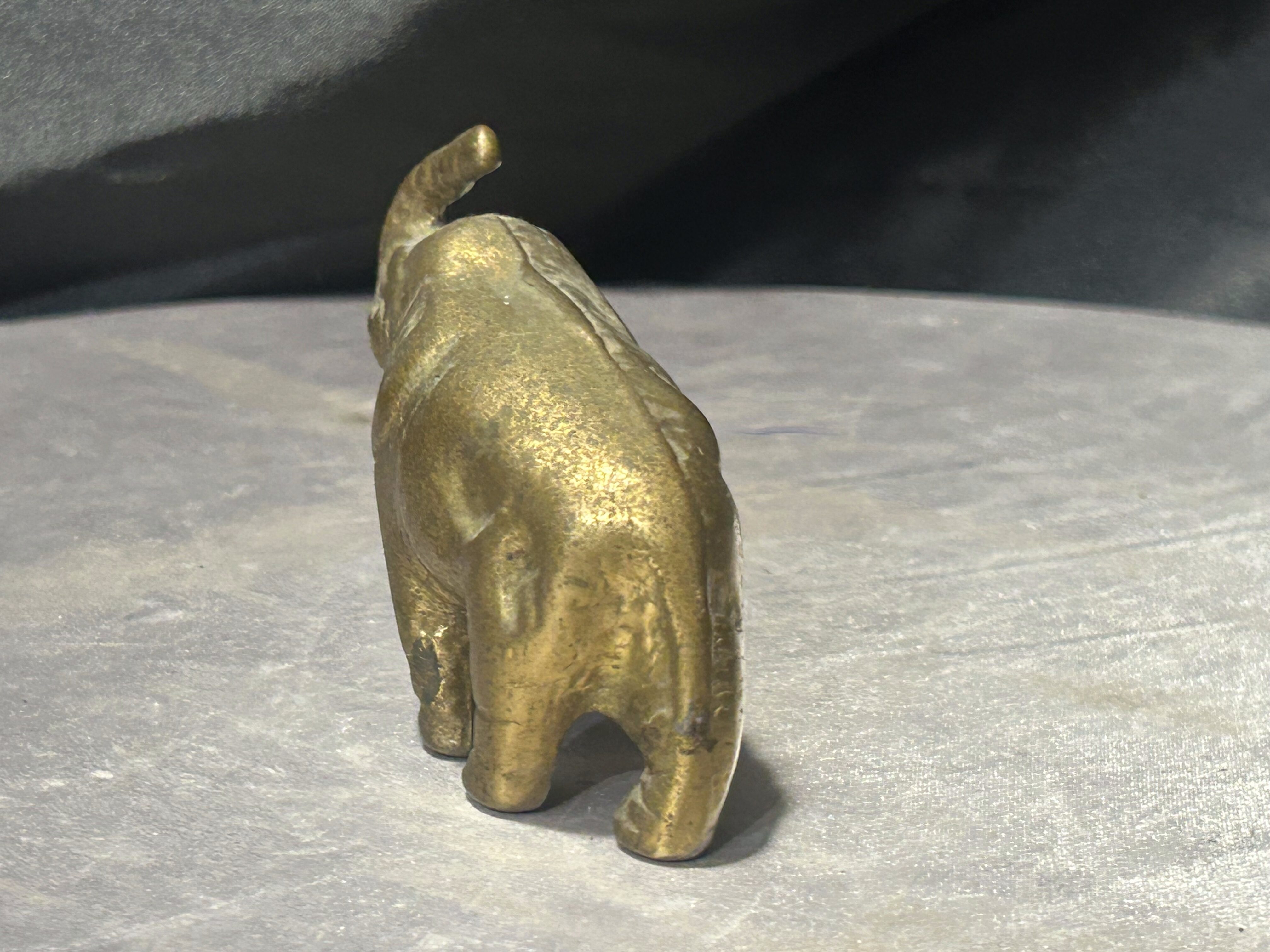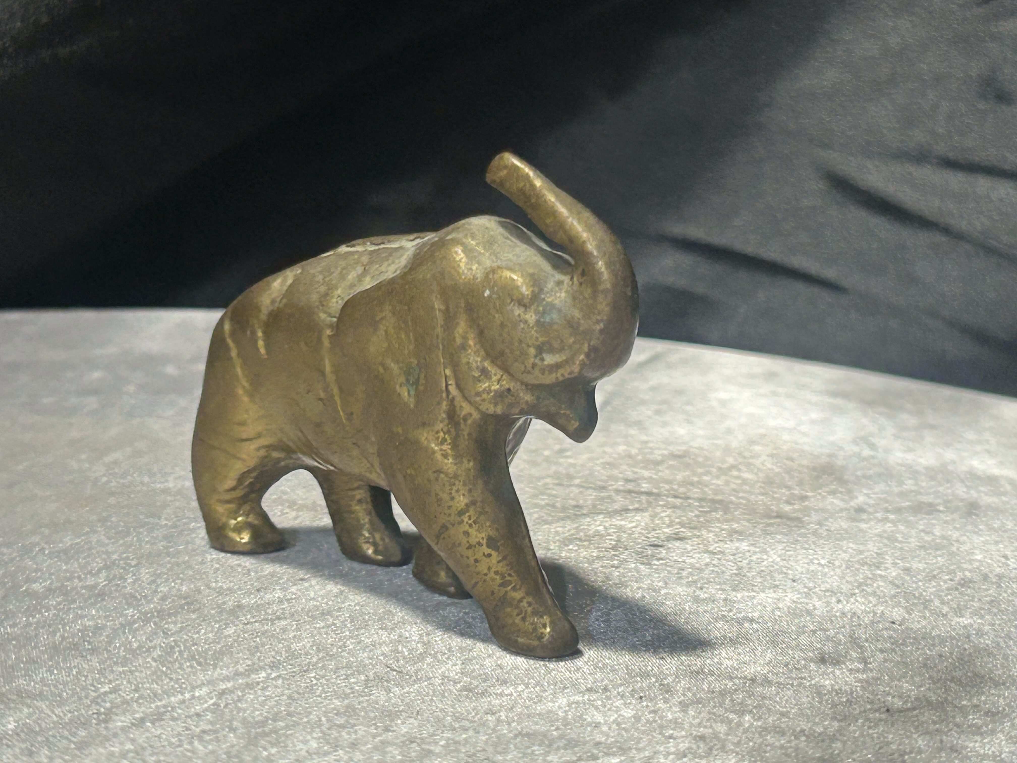 Dekoracyjna figurka przedstawiająca słonia wykonana z mosiądzu. Przedmiot posiada zwartą, rzeźbiarską formę oraz naturalną patynę metalu, która podkreśla jego charakter i nadaje mu szlachetny, vintage wygląd.