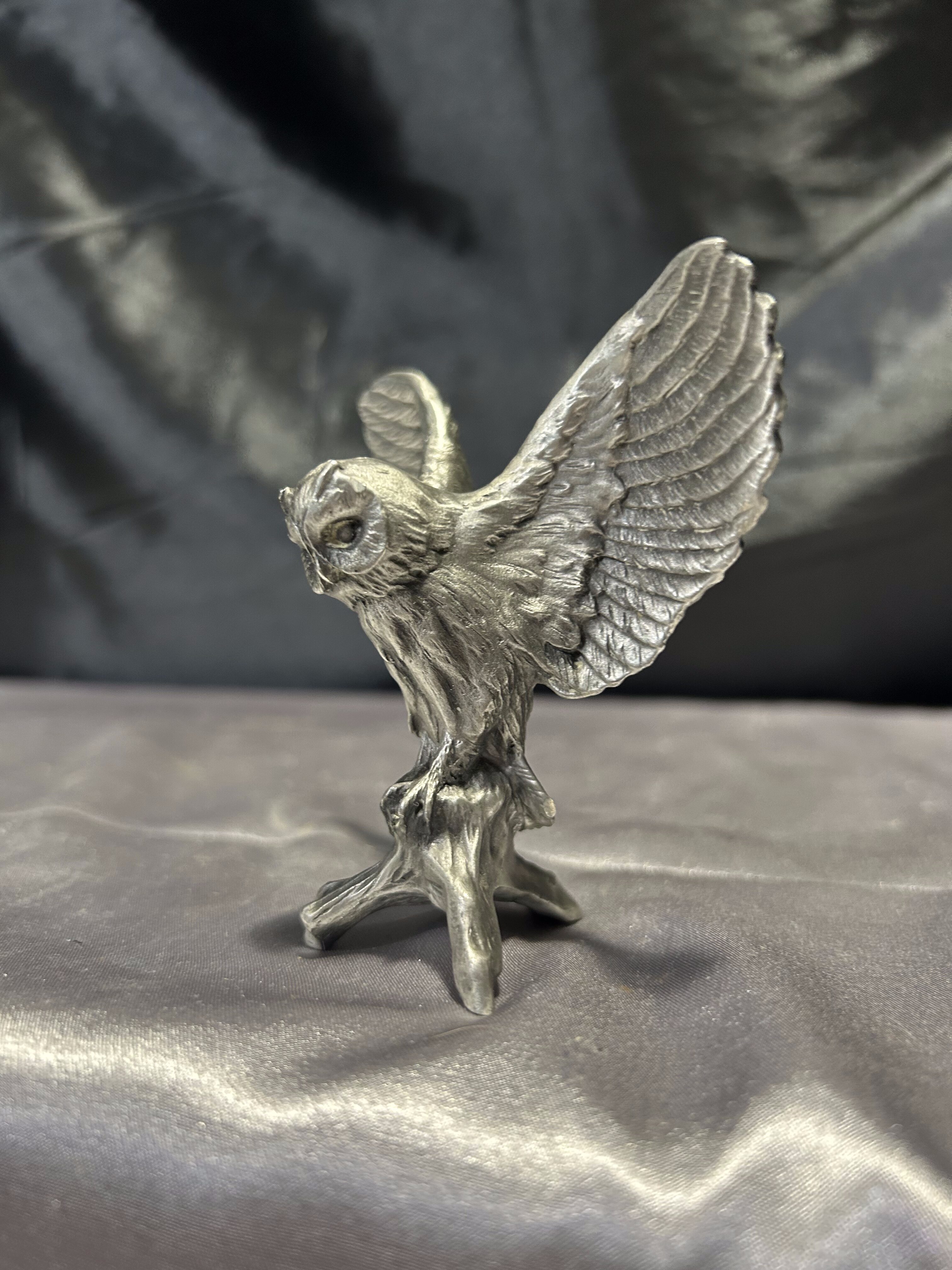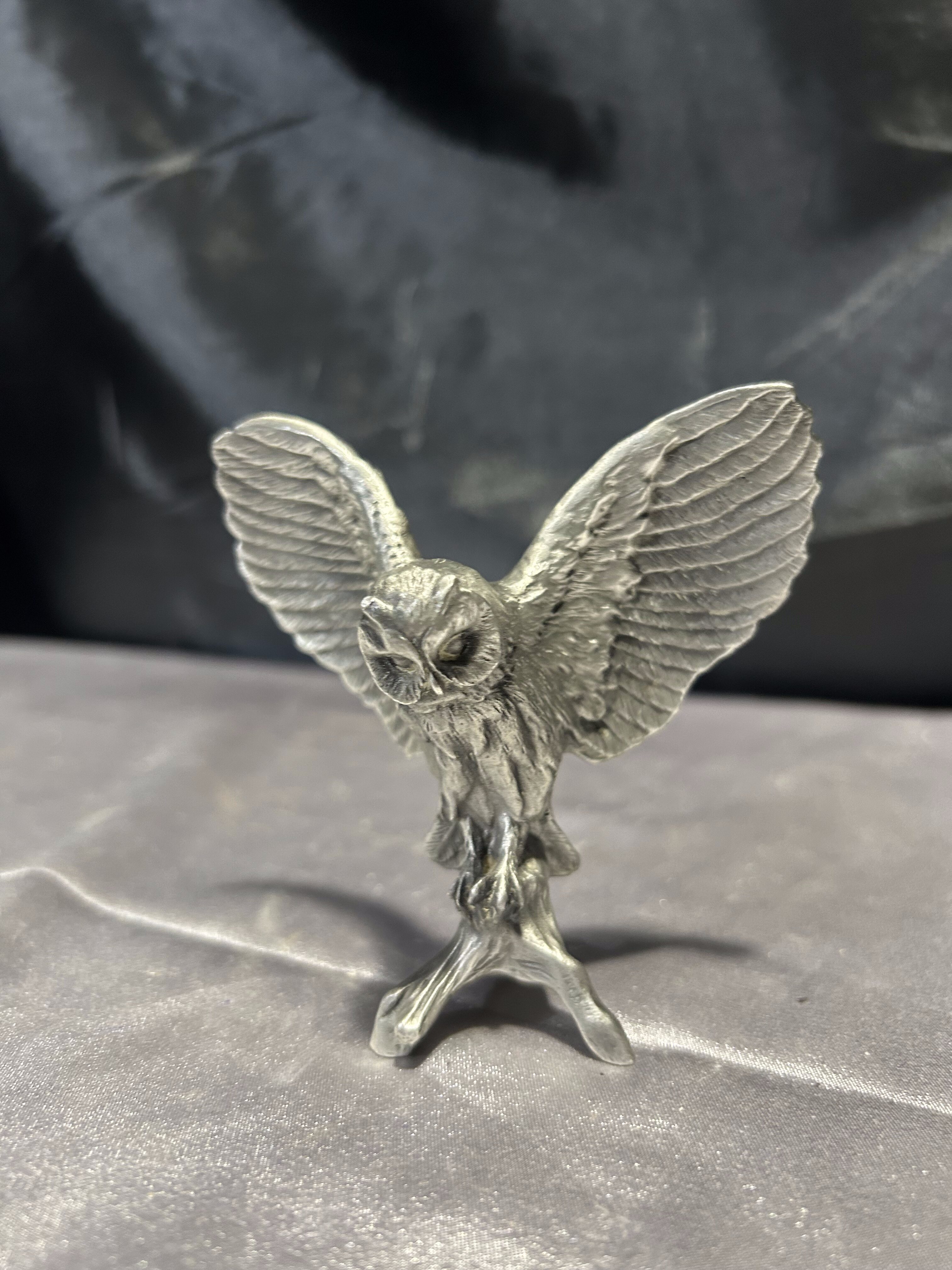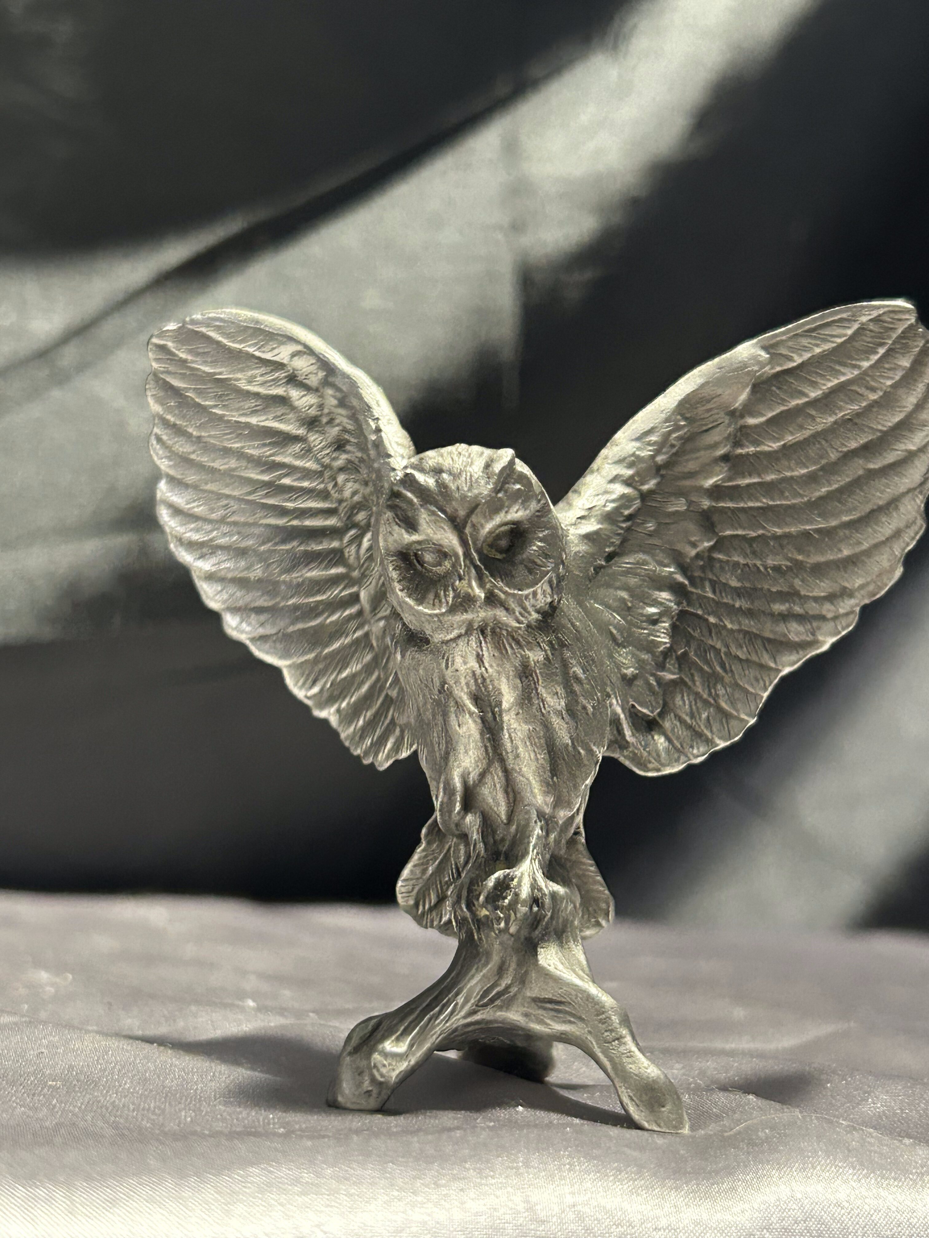 Pięknie odwzorowana figurka sowy z rozpostartymi skrzydłami, wykonana z mosiądzu pobiał. Sygnowany egzemplarz o realistycznej formie i precyzyjnych detalach, oddających naturalny charakter ptaka. Idealna jako ozdoba wnętrza w stylu klasycznym, rustykalnym czy vintage. Niewielka, ale bardzo wyrazista – przyciąga wzrok i dodaje przestrzeni wyjątkowego charakteru.
