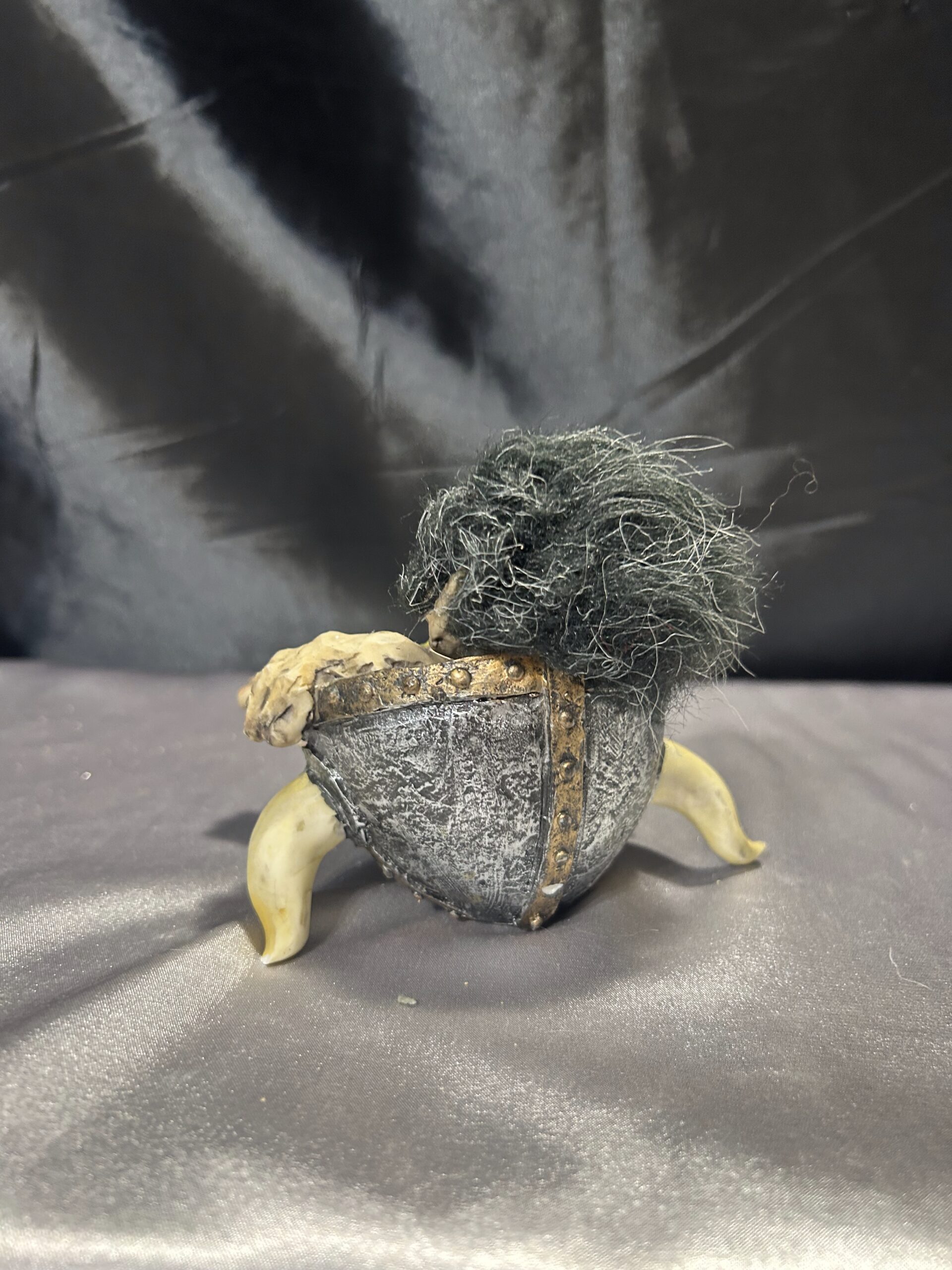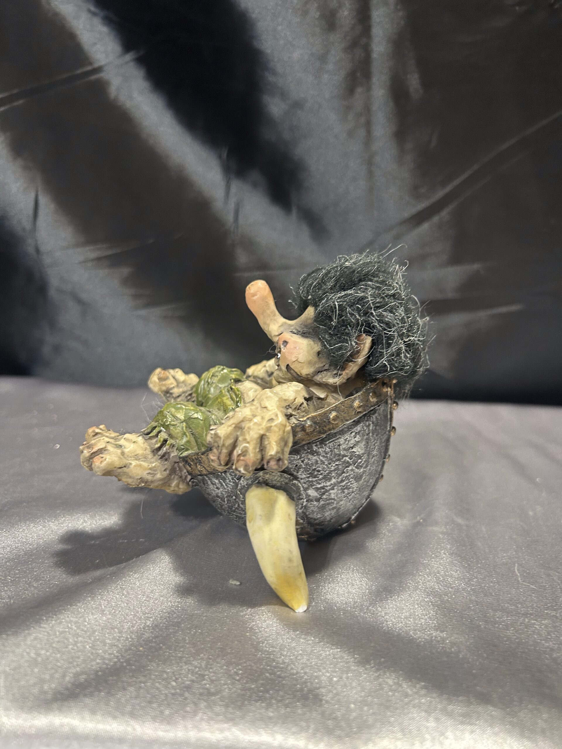 - Motyw: troll leżący w hełmie wikinga z rogami