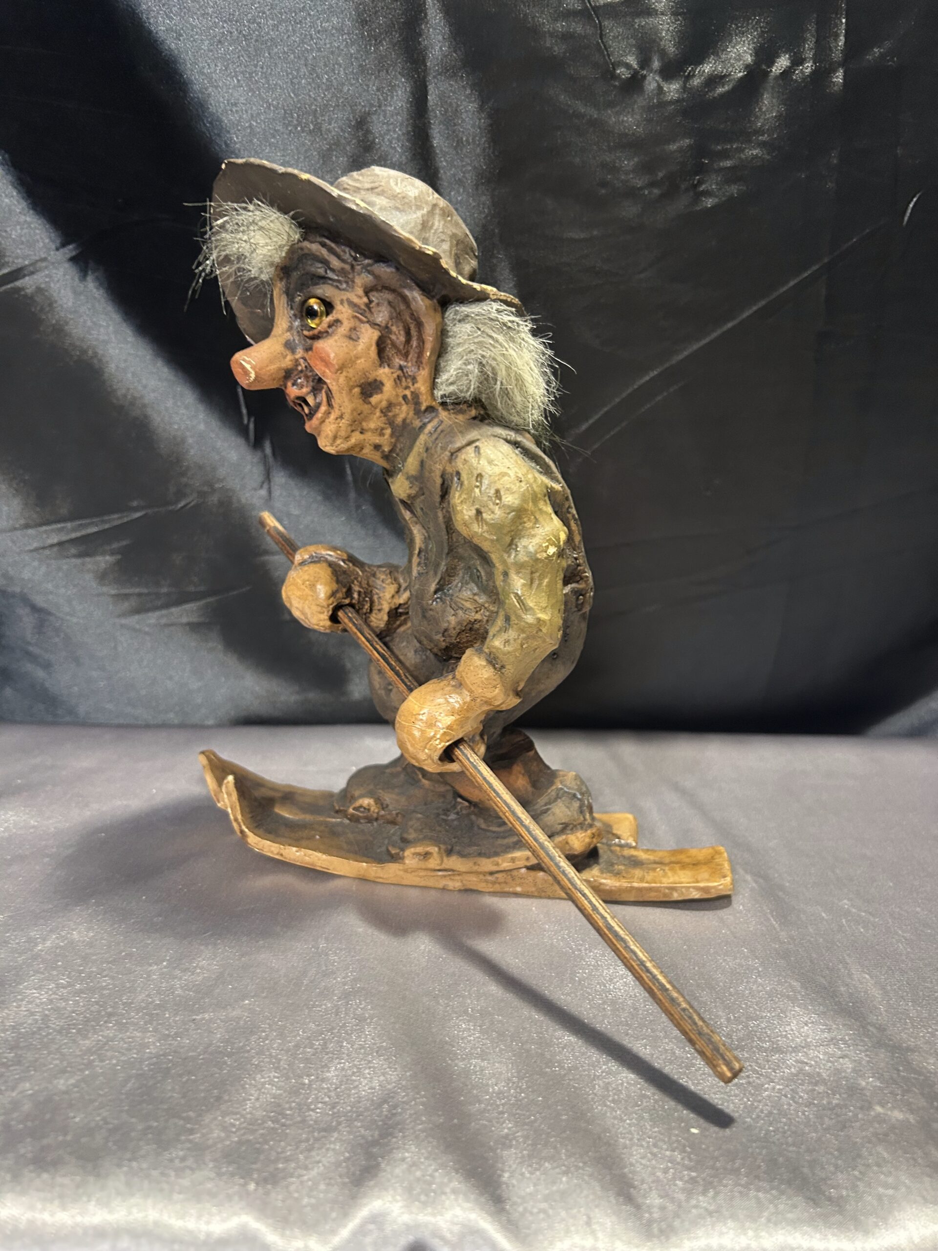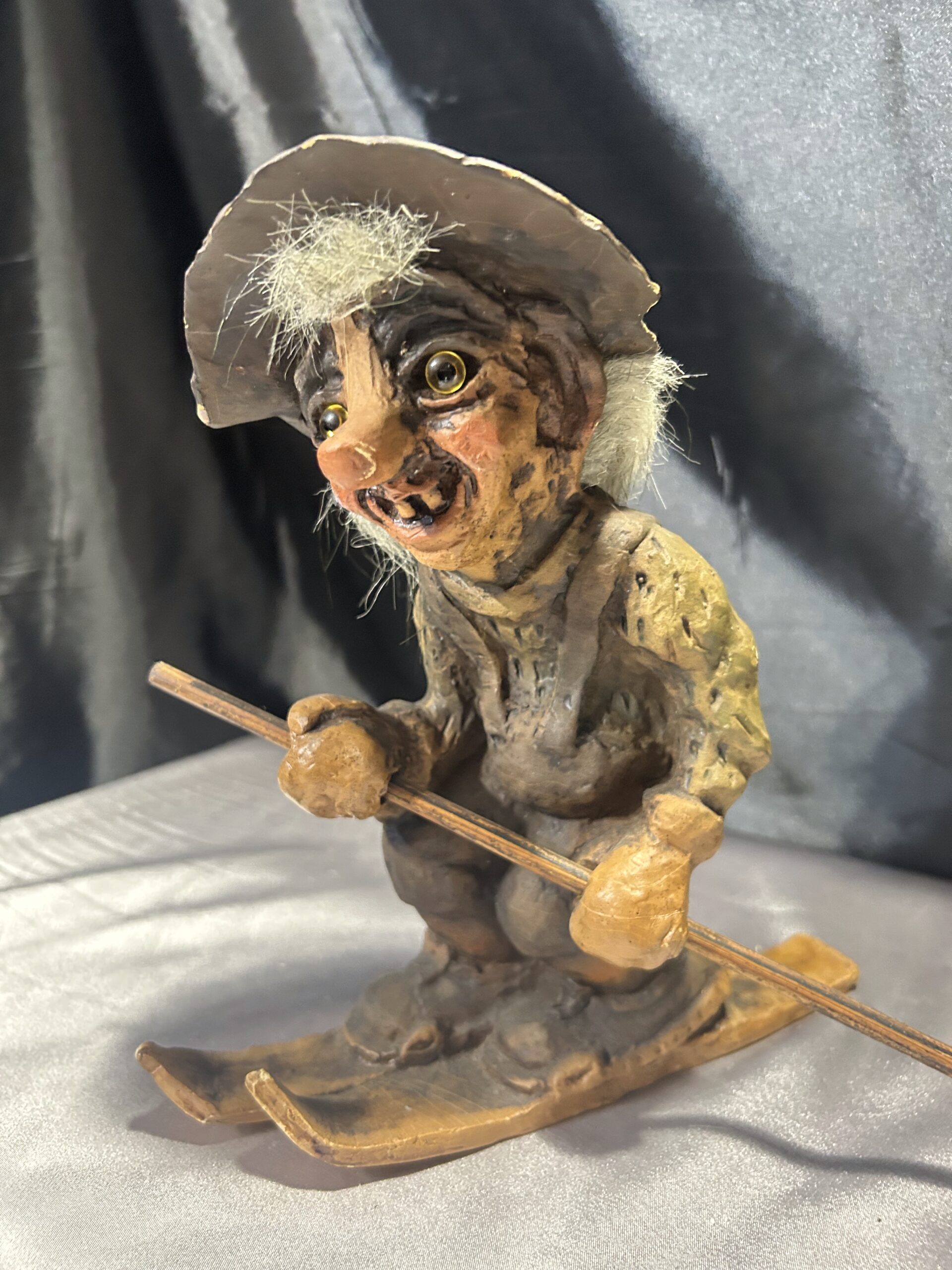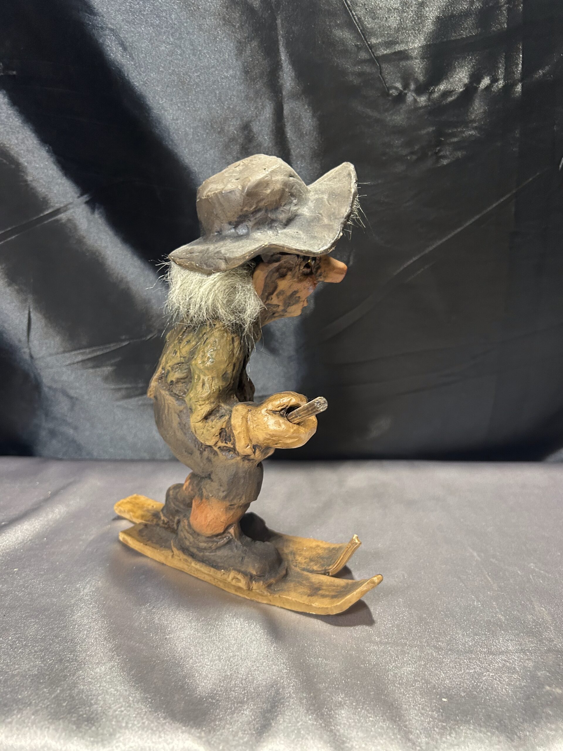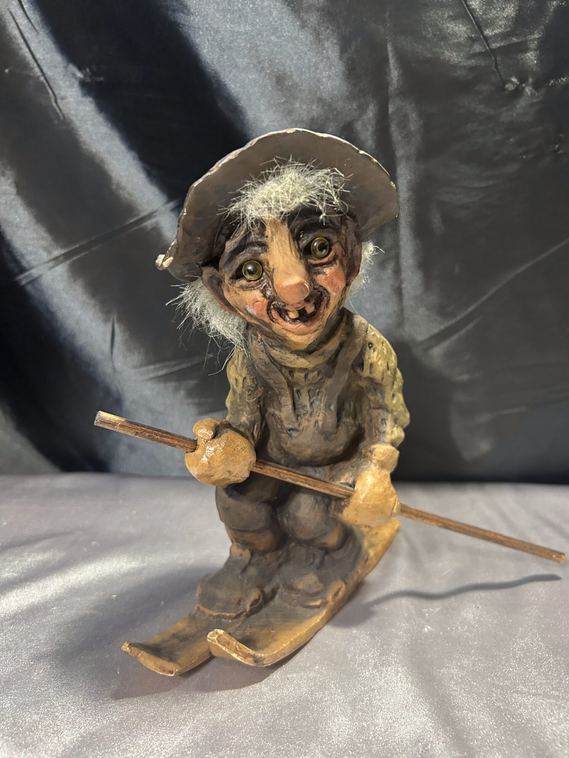Oferujemy unikatową figurkę trolla, przywiezioną prosto z Norwegii. Przedstawia charakterystycznego, szczerbatego trolla w kapeluszu, sunącego na nartach z jednym kijem do odpychania. Jego zabawna, lekko psotna mimika oraz klasyczny skandynawski styl sprawiają, że jest to doskonały element kolekcjonerski lub oryginalna ozdoba wnętrza.