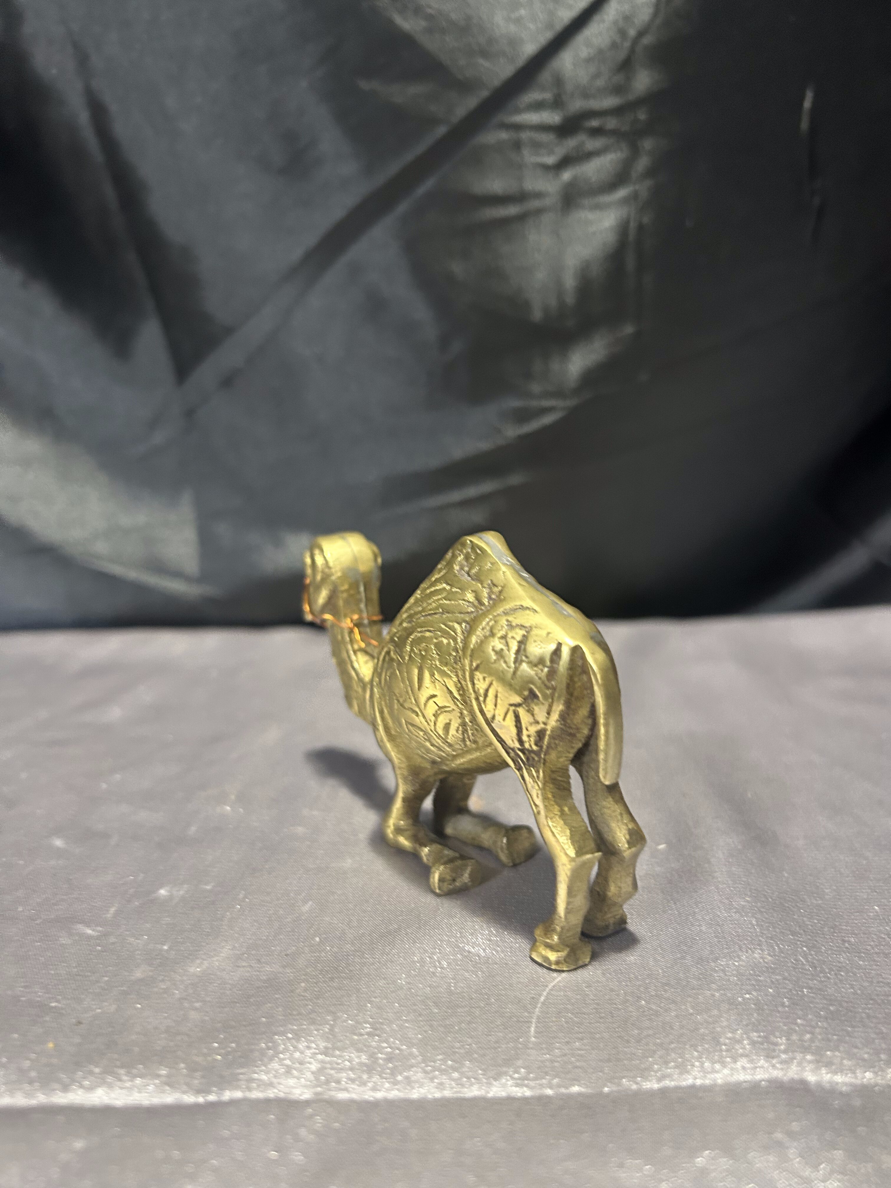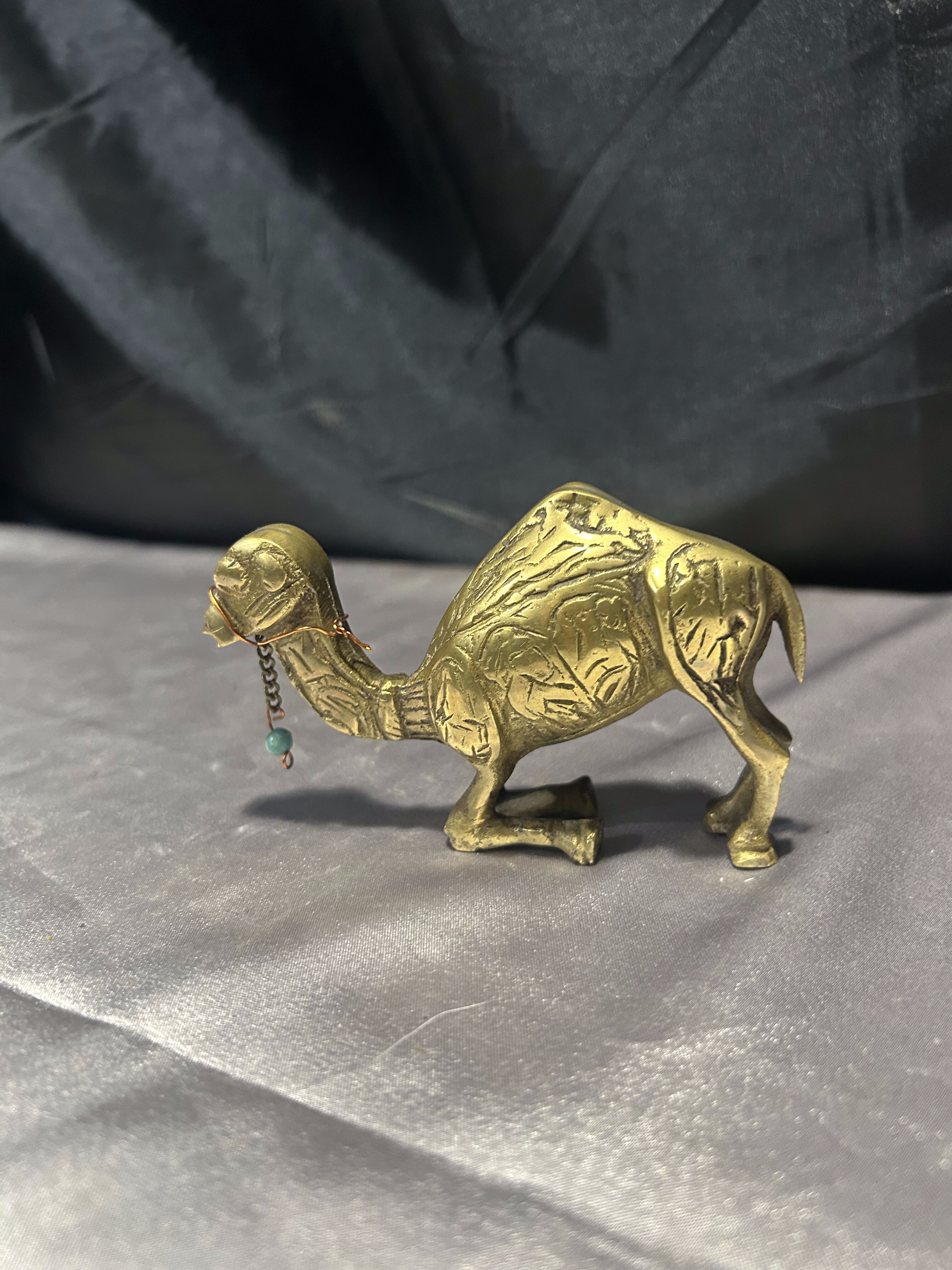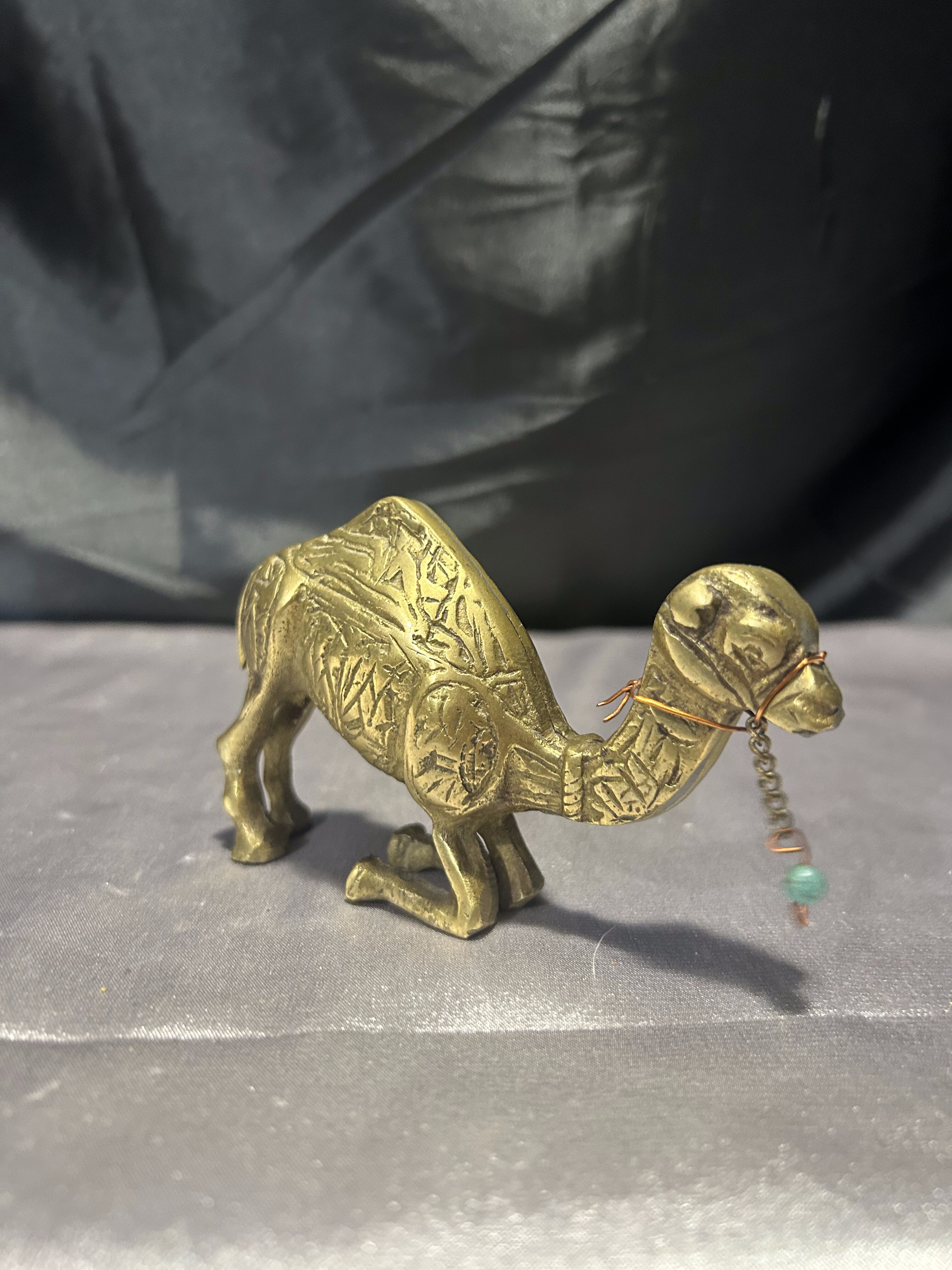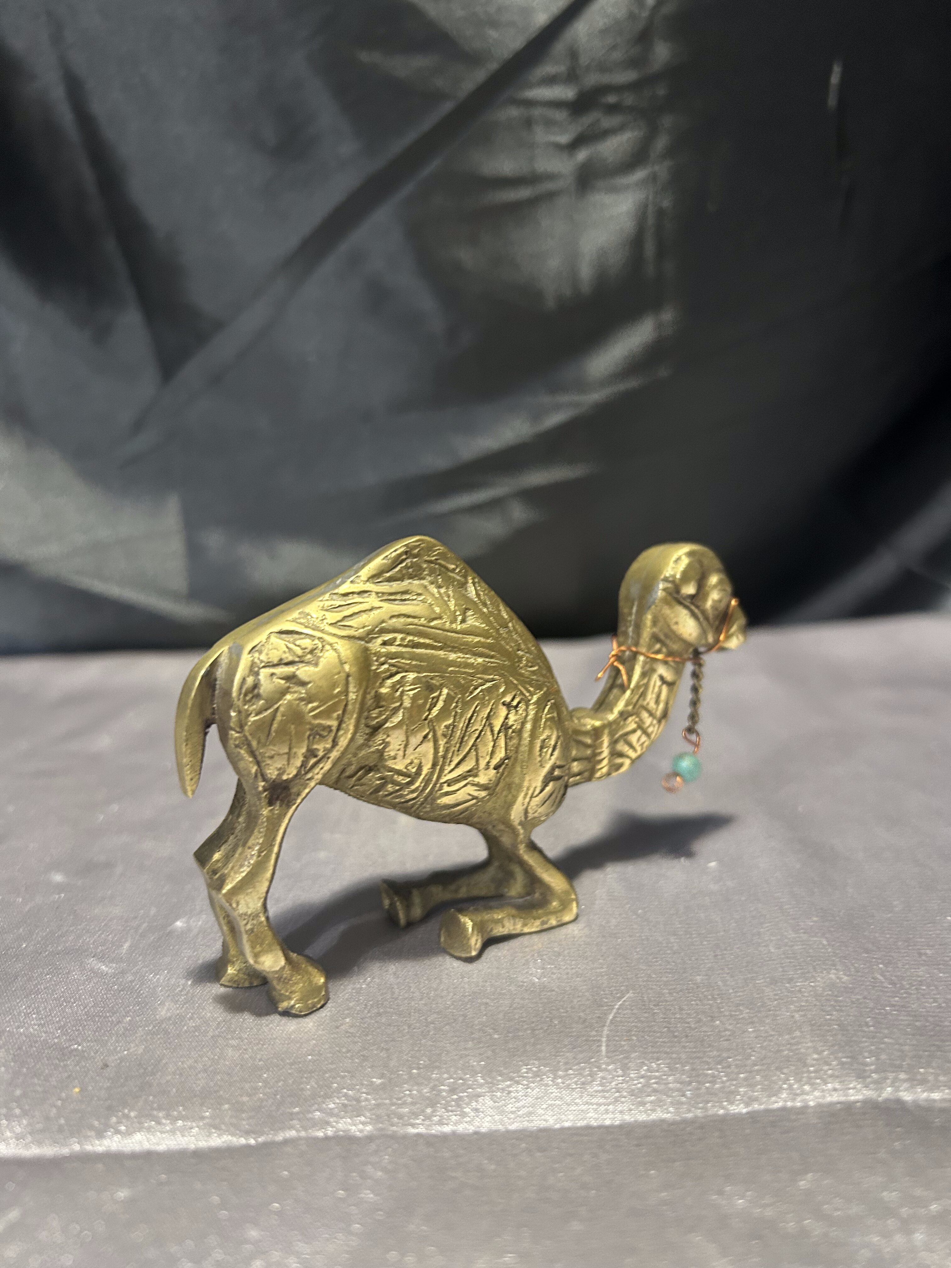Urokliwa figurka wielbłąda wykonana z mosiądzu, przedstawiająca zwierzę w realistycznej pozie – klęczącego na przednich kolanach. Rzeźbiona z dbałością o szczegóły, z delikatnym zdobieniem w postaci dekoracyjnego łańcuszka z koralikami. Idealna jako element wystroju wnętrz inspirowanych orientem, pustynną symboliką lub jako prezent z przesłaniem wytrwałości i siły.