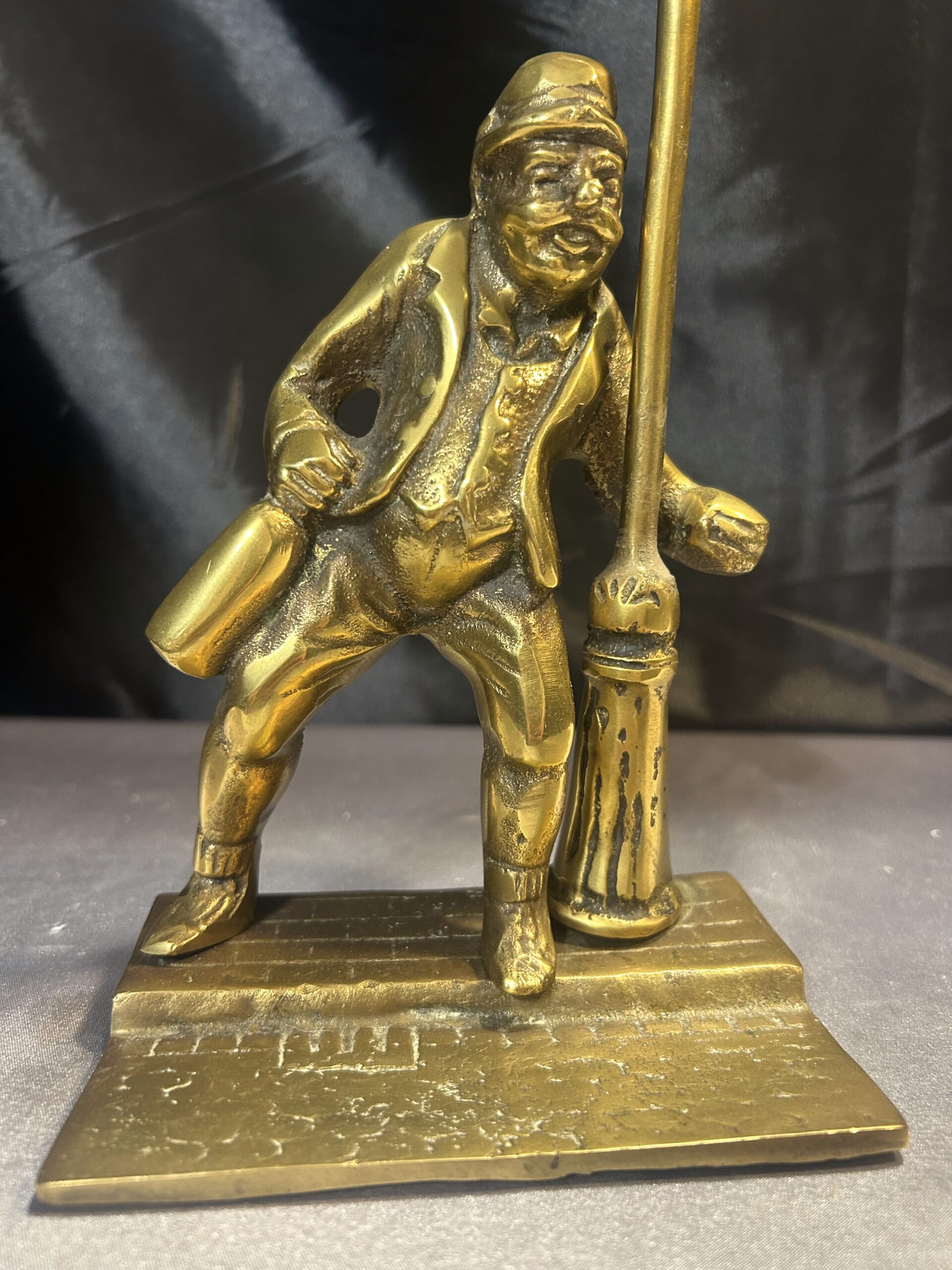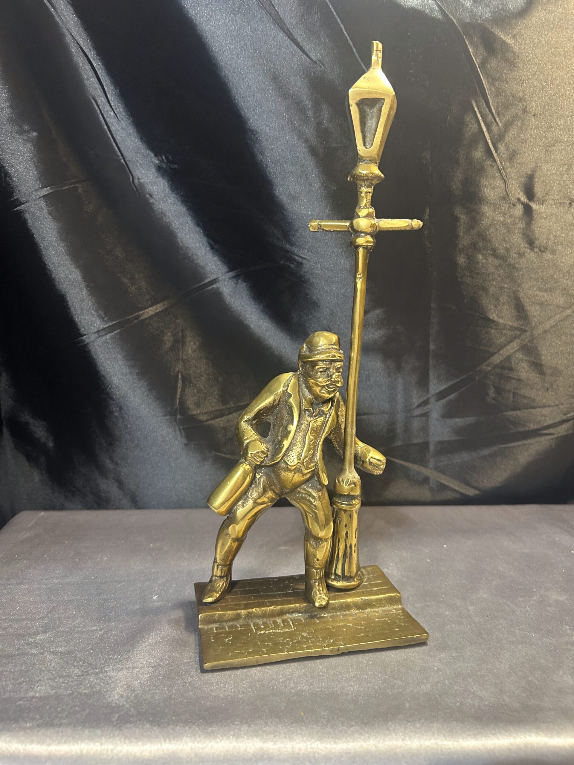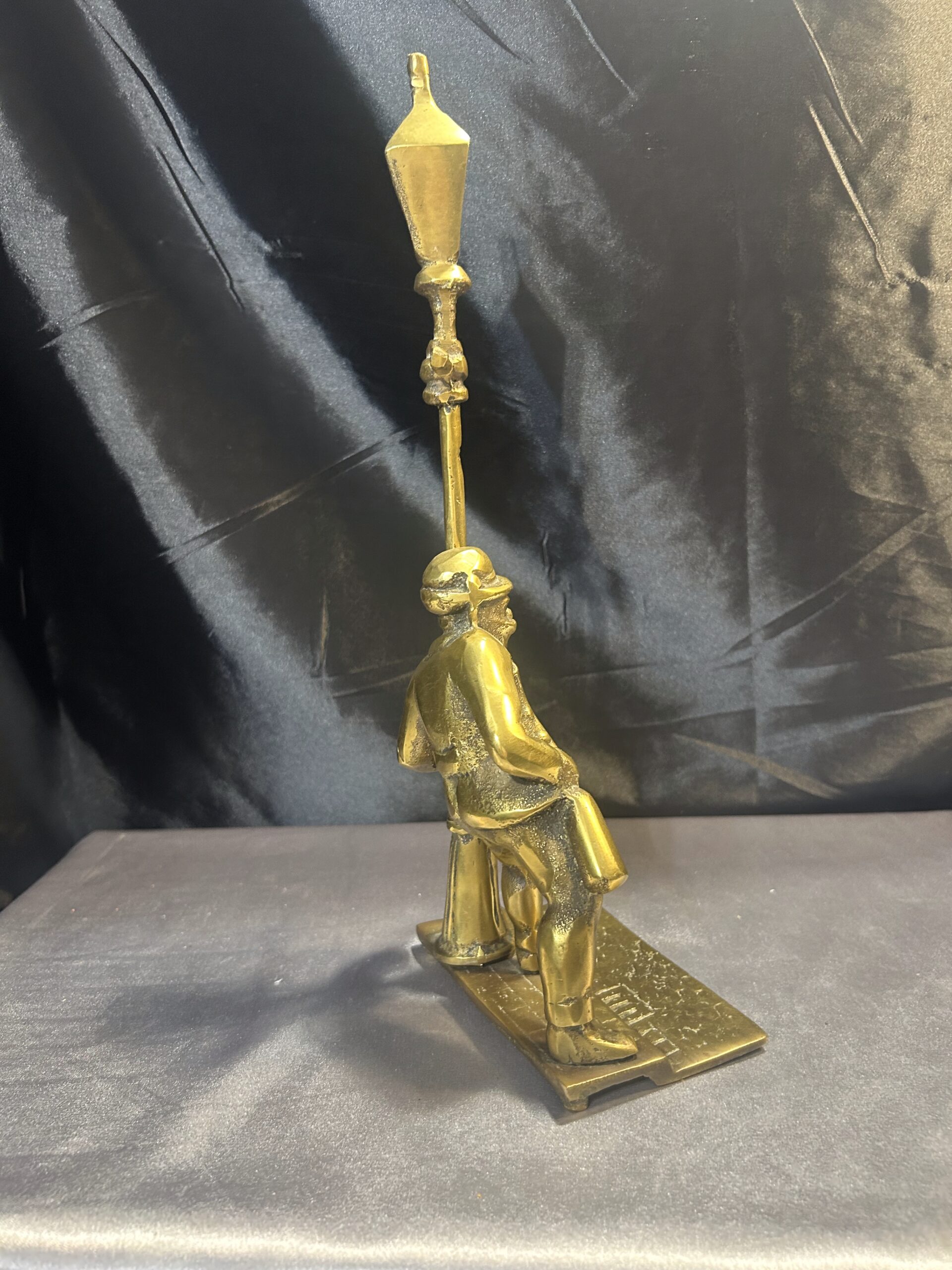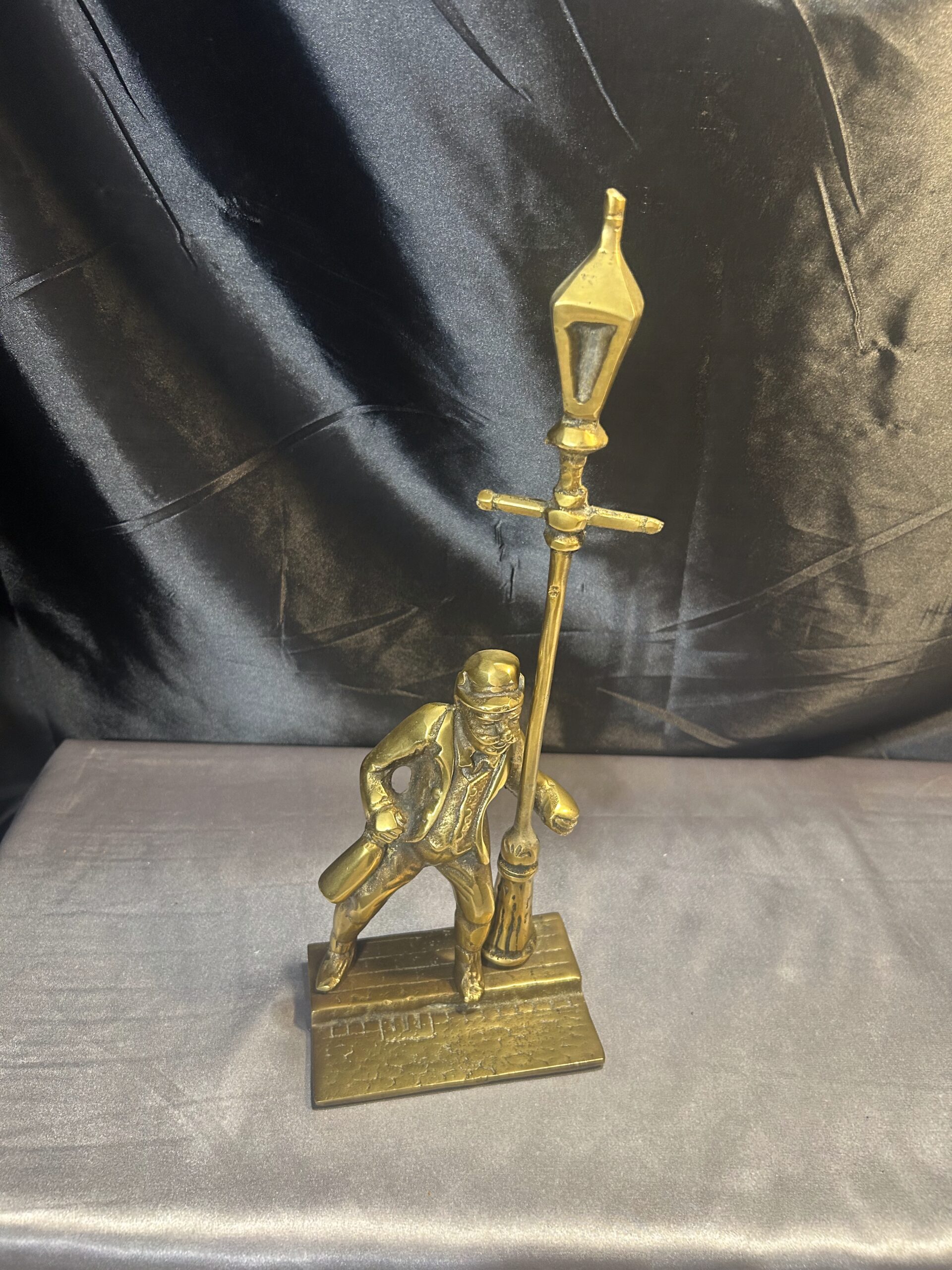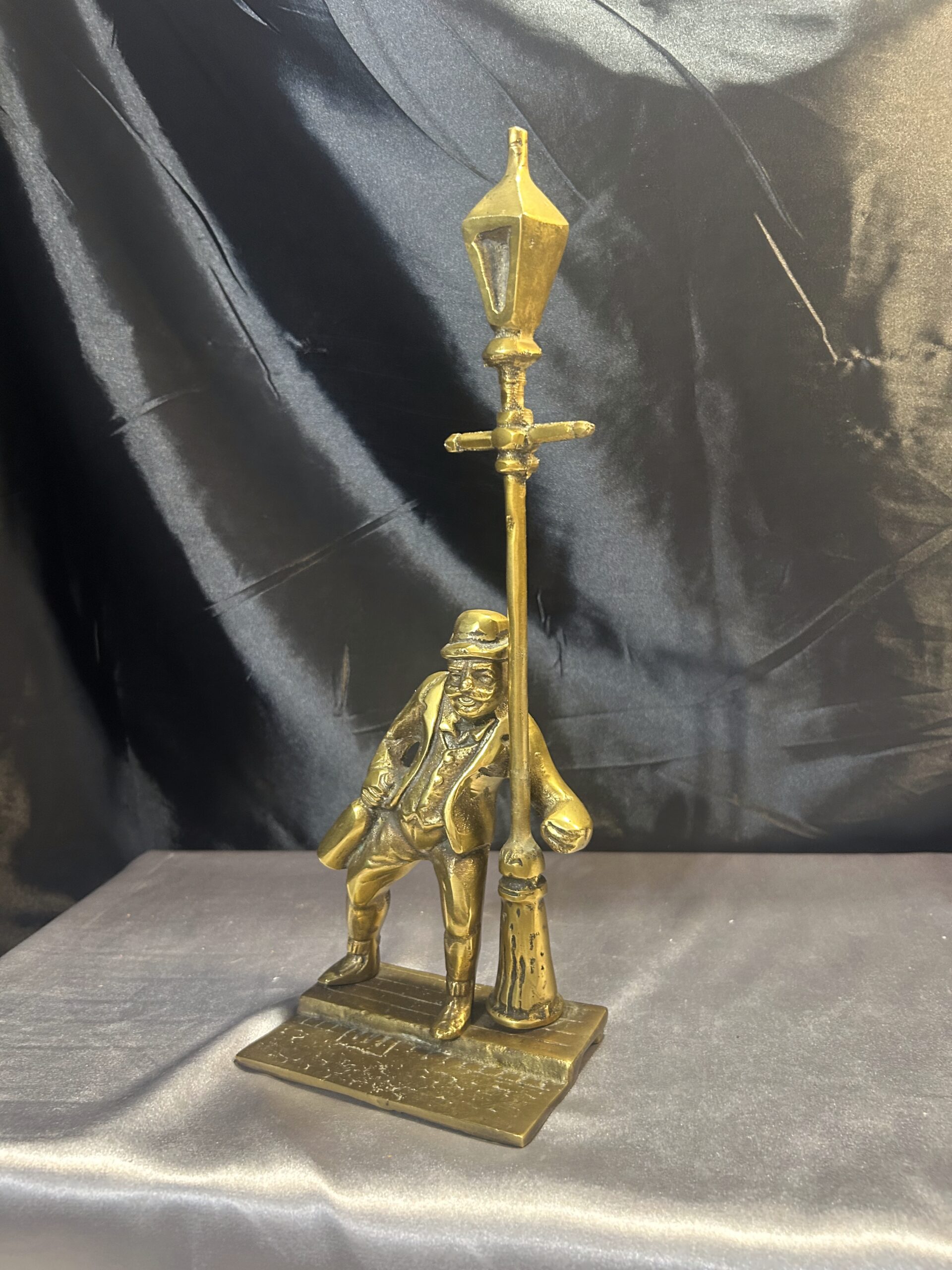 Przedstawiamy oryginalną figurkę z mosiądzu, przedstawiającą pijaka z butelką w ręce, stojącego przy ulicznej latarni. Figurka wyróżnia się bogatymi detalami, takimi jak tekstura ulicznego bruku, co nadaje jej realistyczny charakter i unikalny styl.