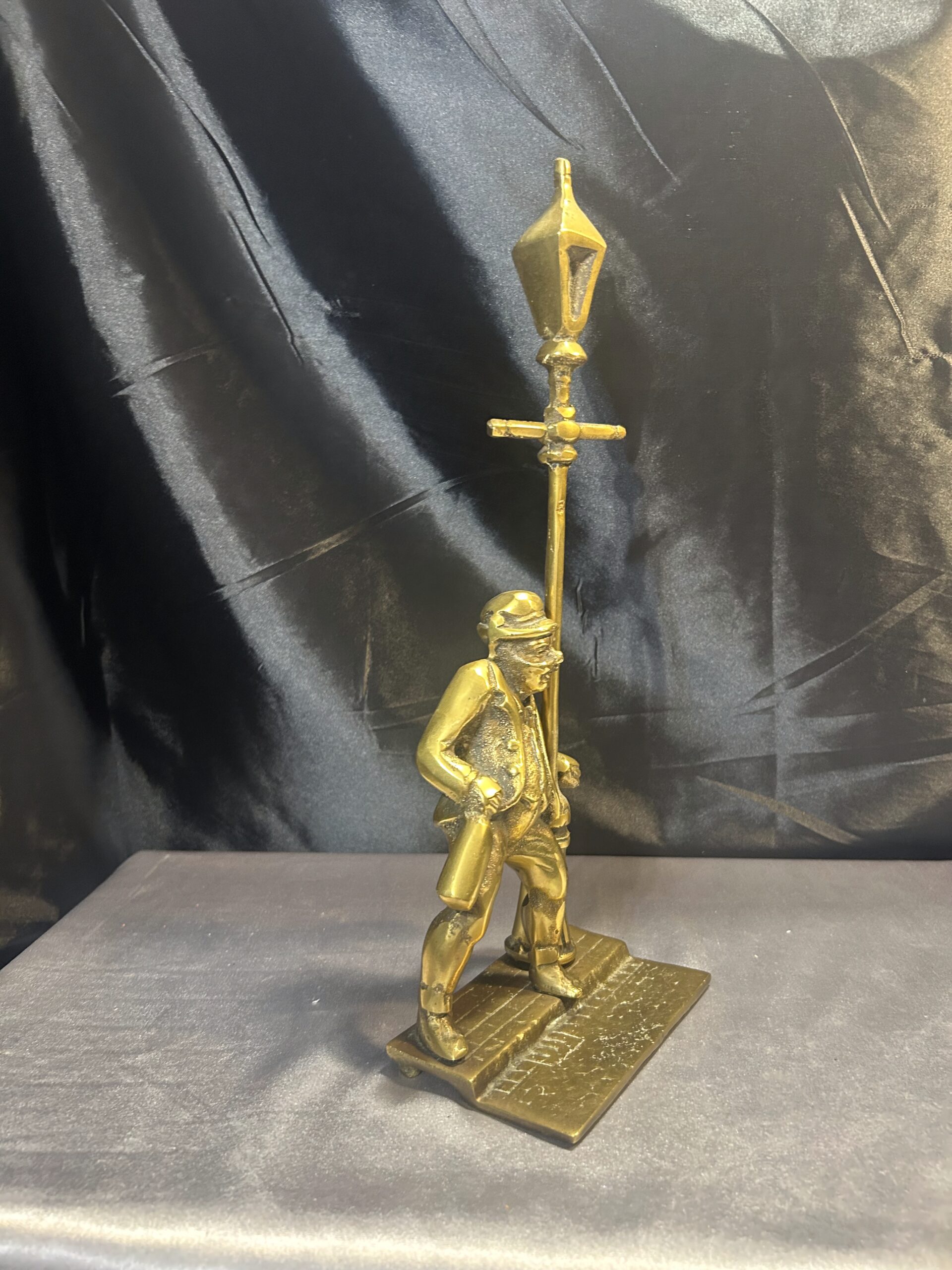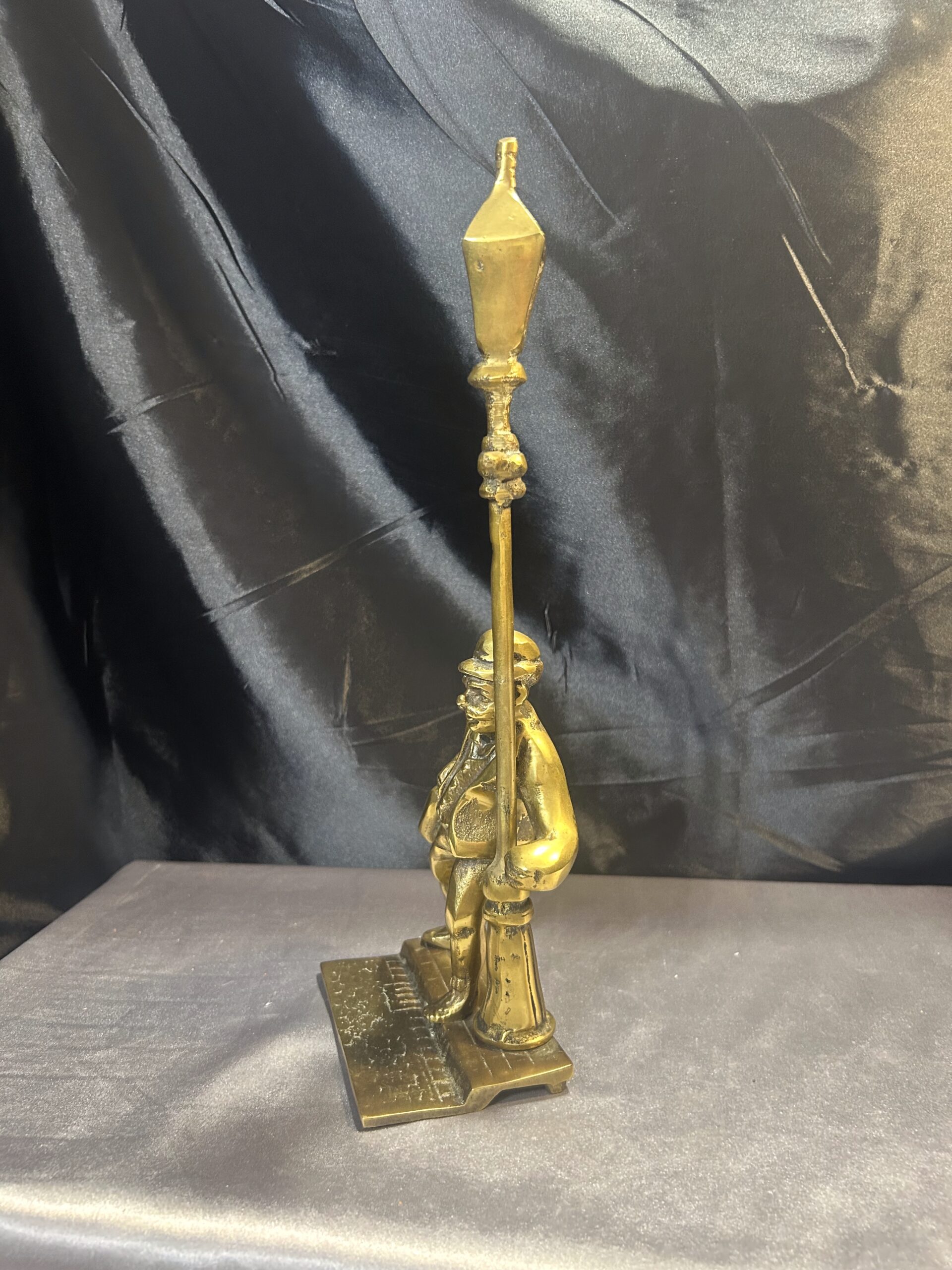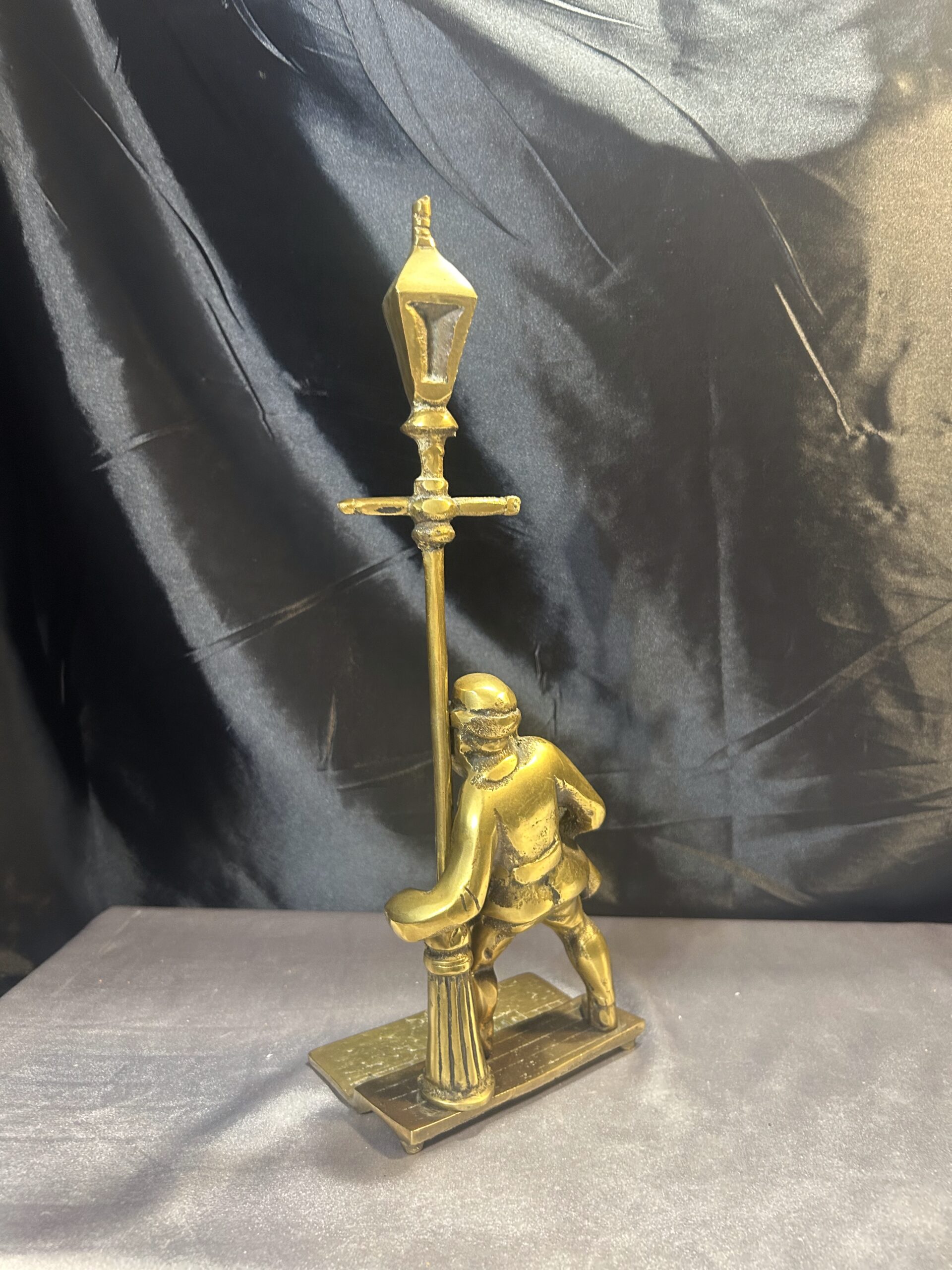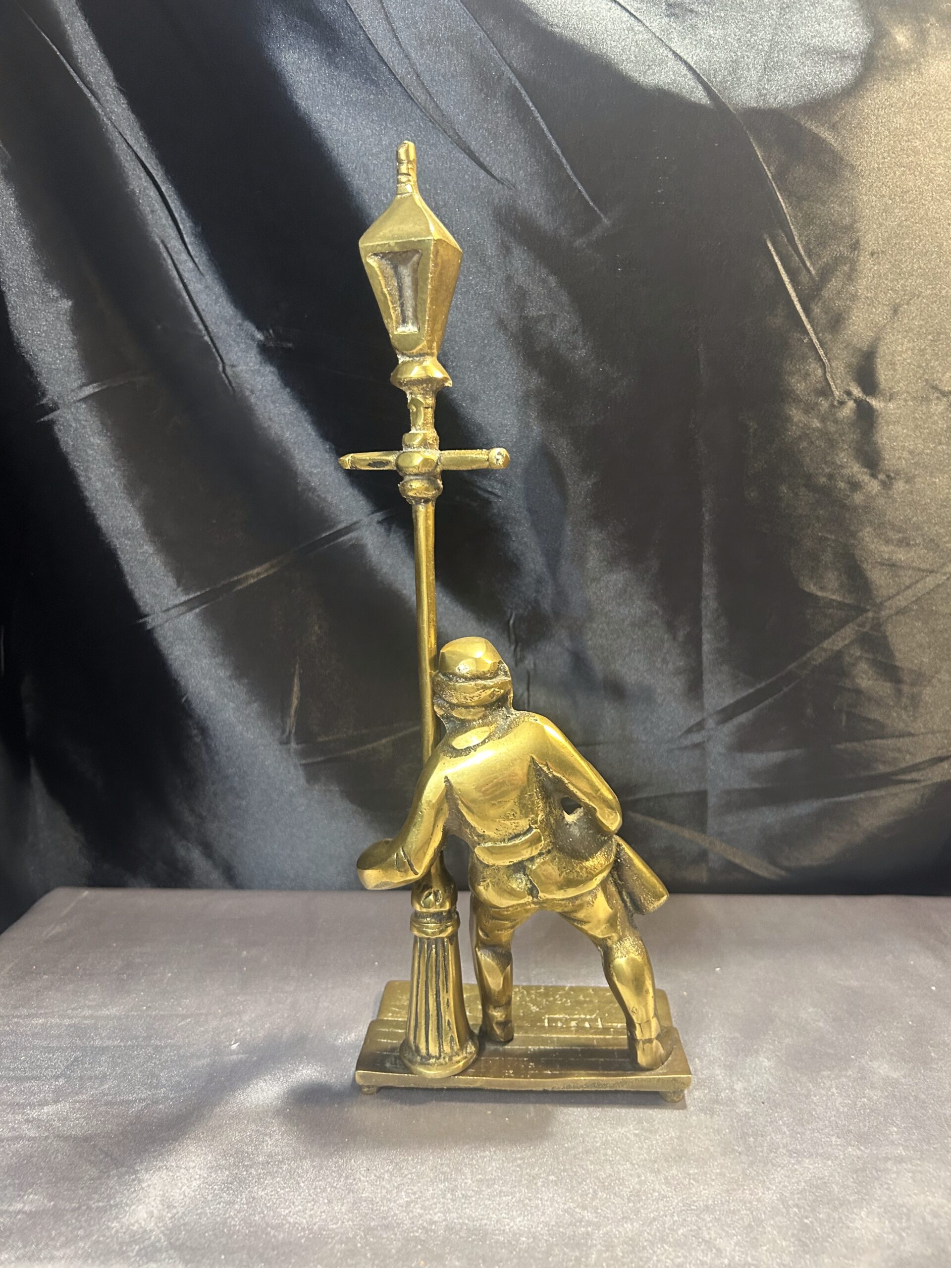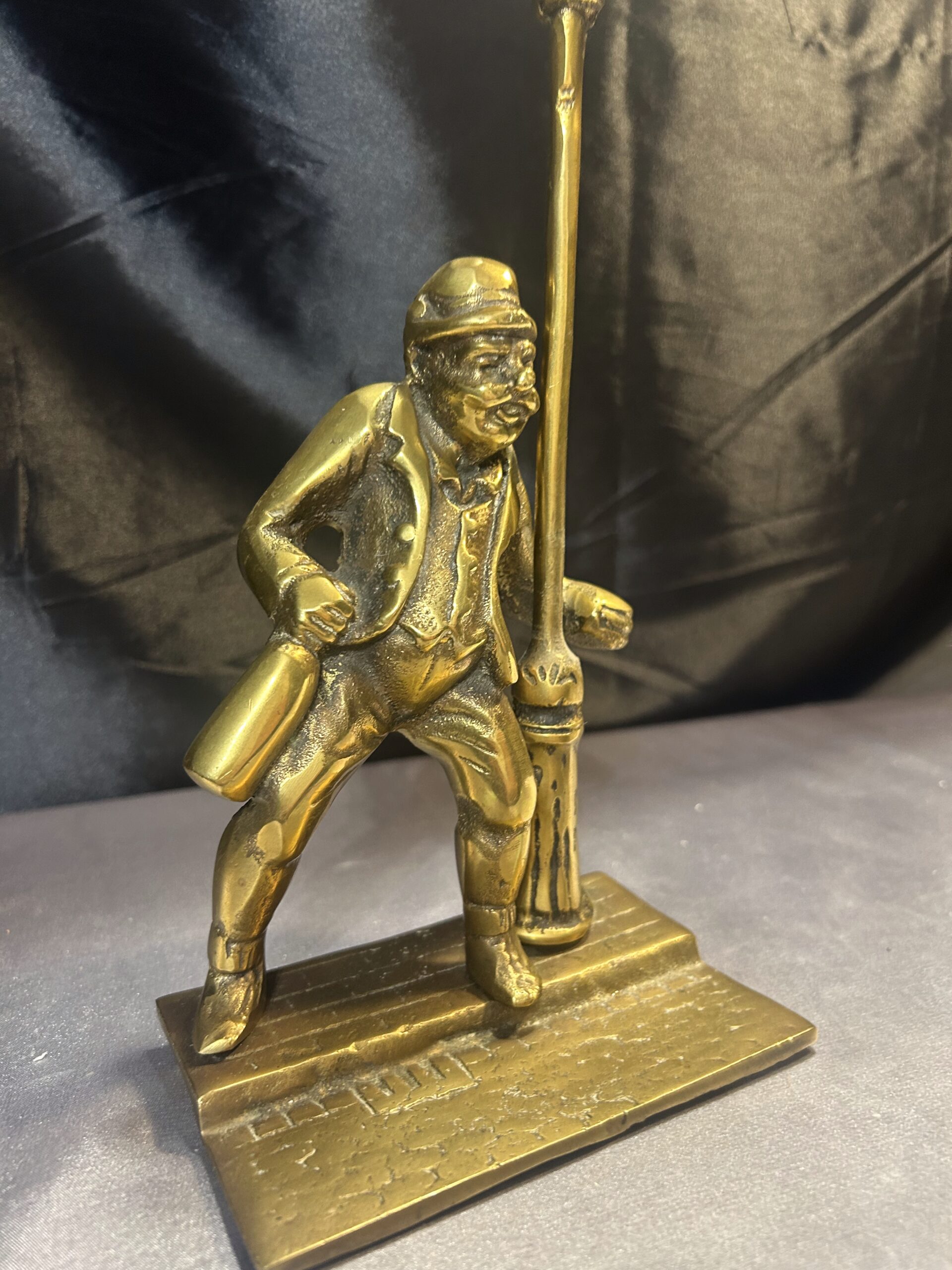 Przedstawiamy oryginalną figurkę z mosiądzu, przedstawiającą pijaka z butelką w ręce, stojącego przy ulicznej latarni. Figurka wyróżnia się bogatymi detalami, takimi jak tekstura ulicznego bruku, co nadaje jej realistyczny charakter i unikalny styl.