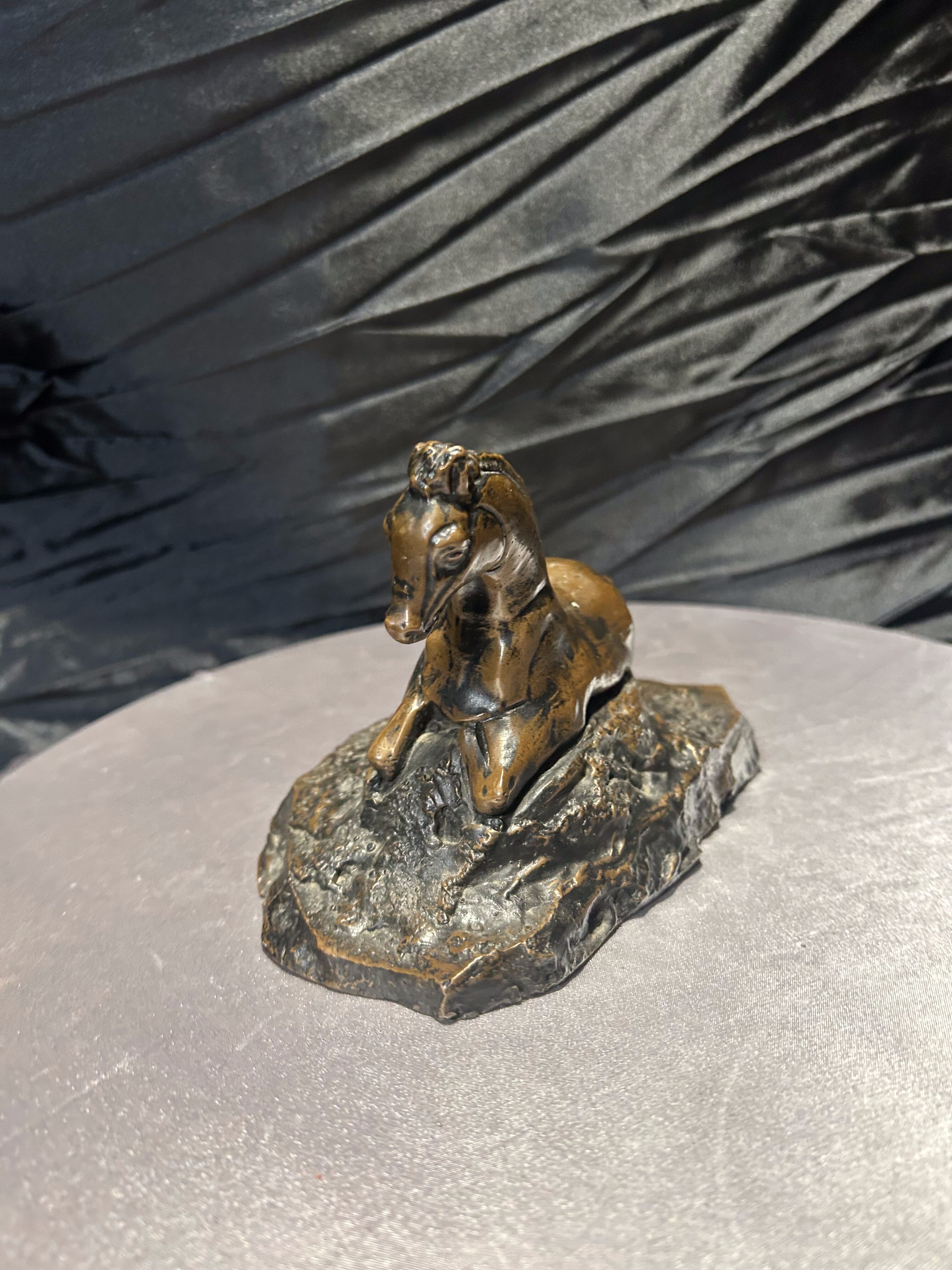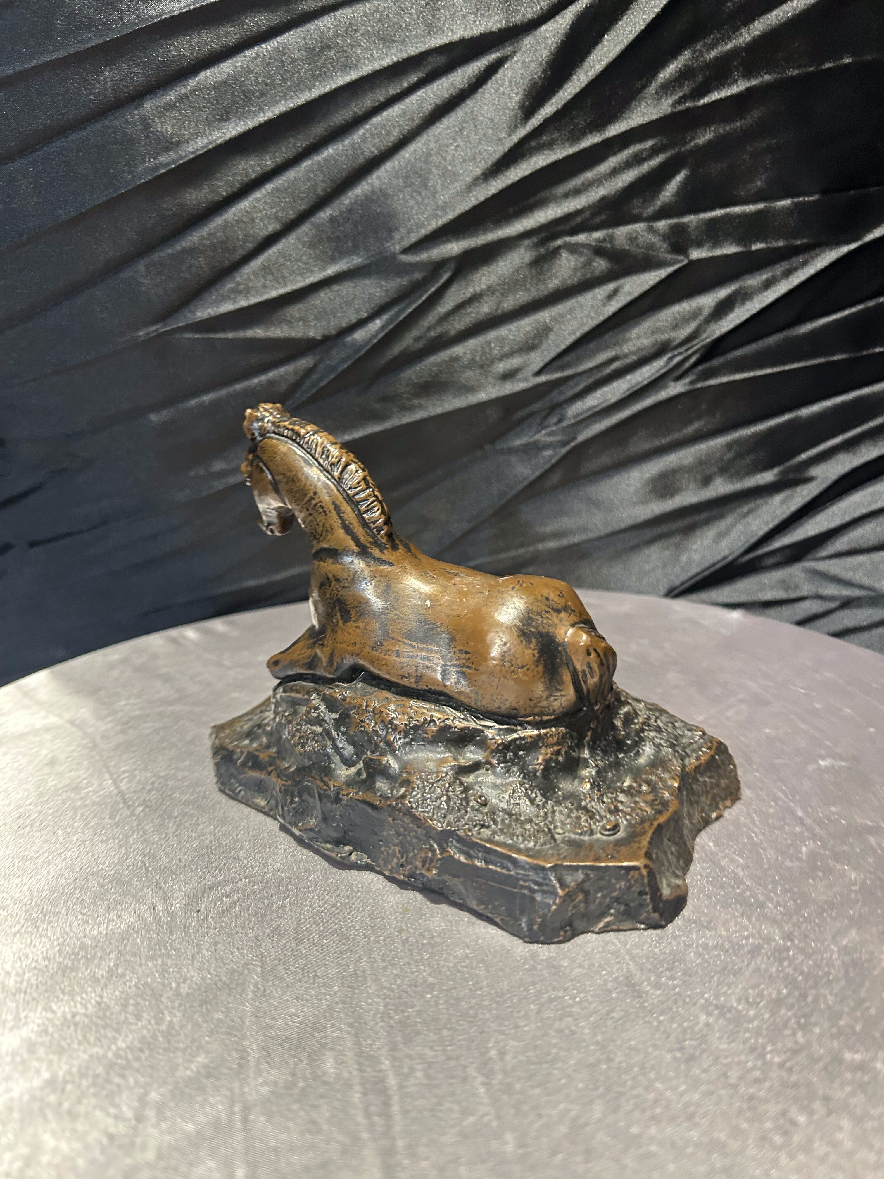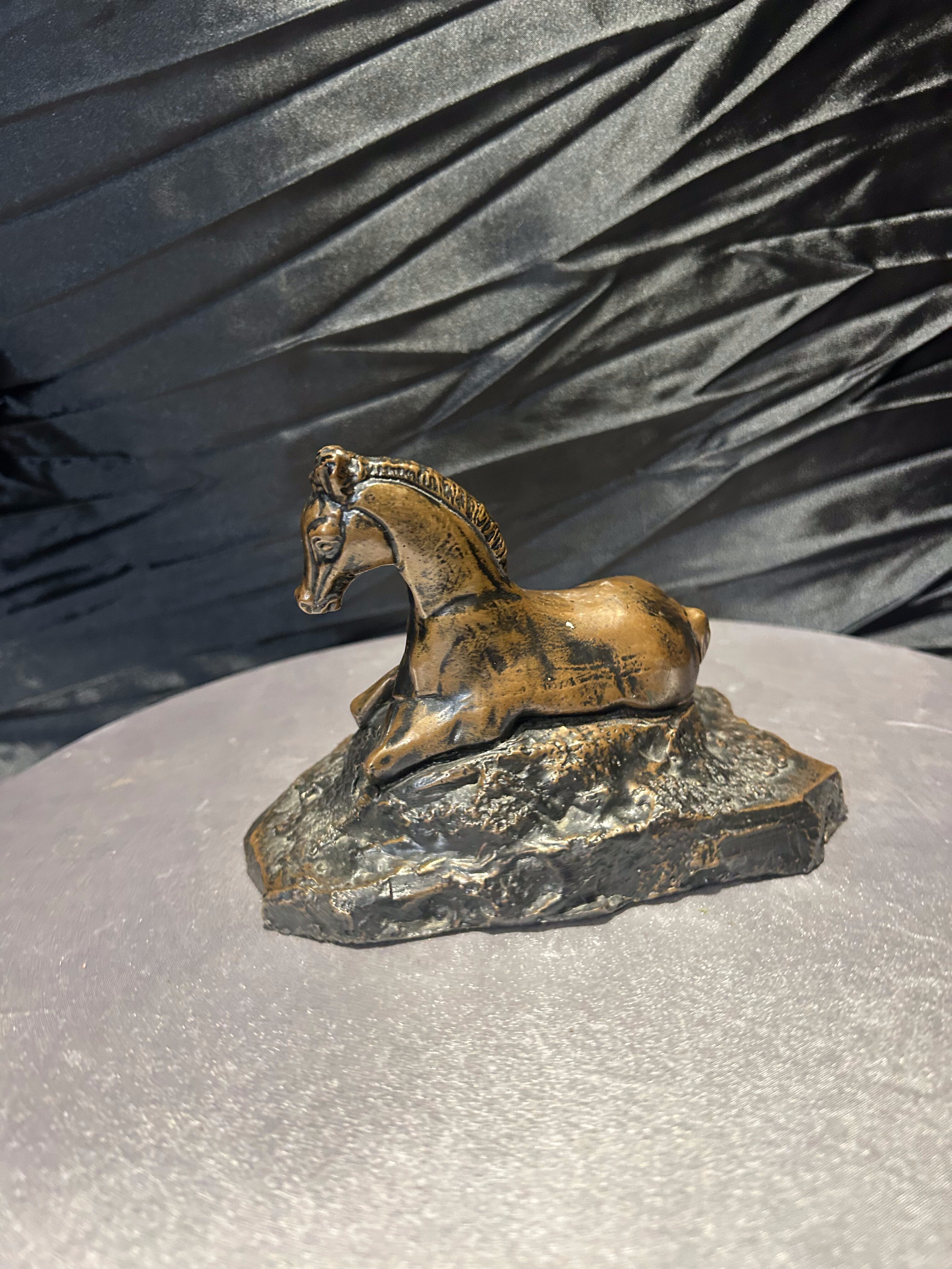 Subtelna rzeźba przedstawiająca leżącego źrebaka, wykonana z dbałością o detale. Powierzchnia w odcieniach brązu pięknie podkreśla miękką linię sylwetki i naturalność przedstawienia. To nie tylko figurka, ale także elegancka dekoracja, która wprowadzi do wnętrza harmonię i klasyczne piękno. Idealna dla miłośników koni i kolekcjonerów wyjątkowych ozdób.