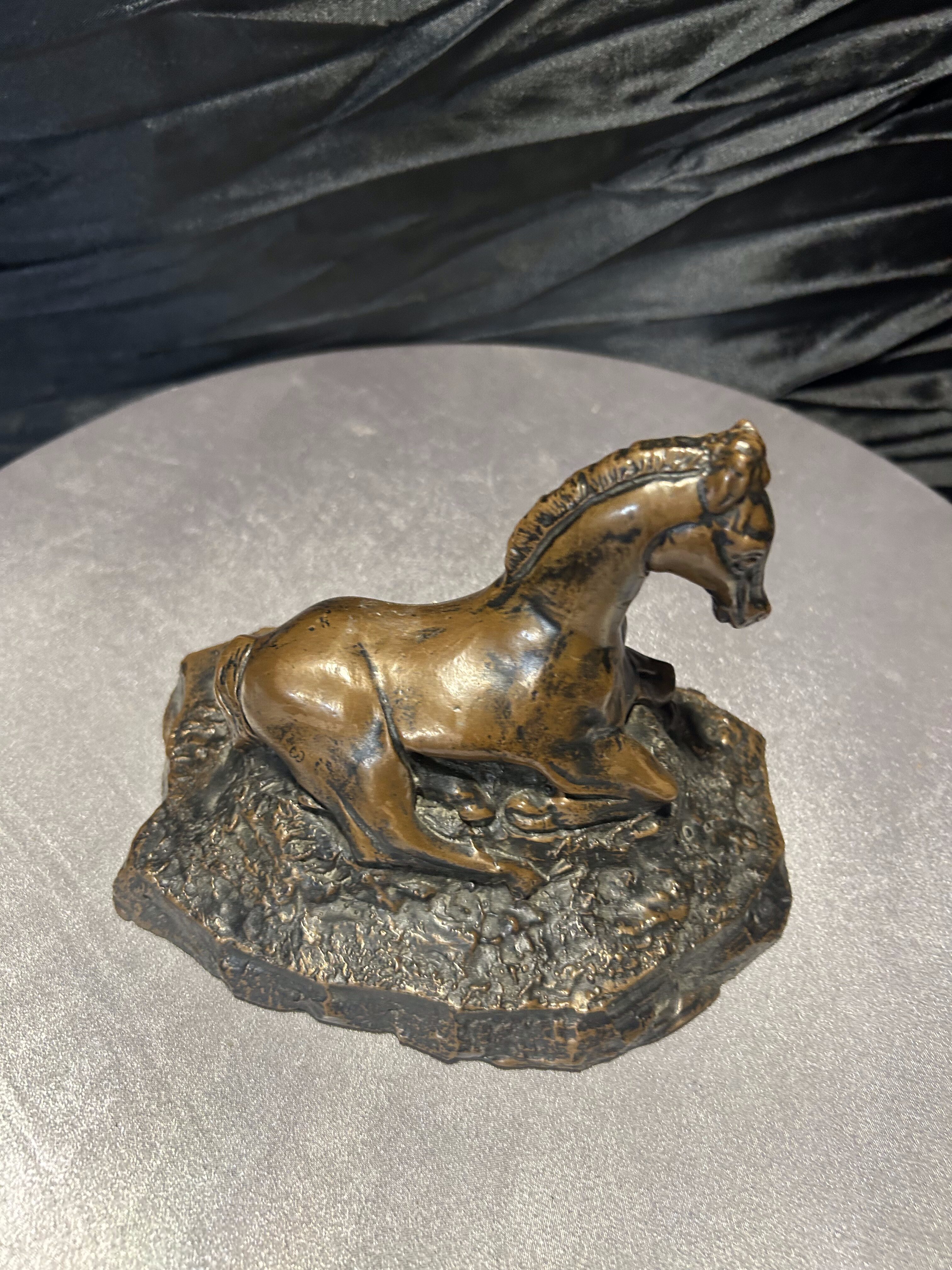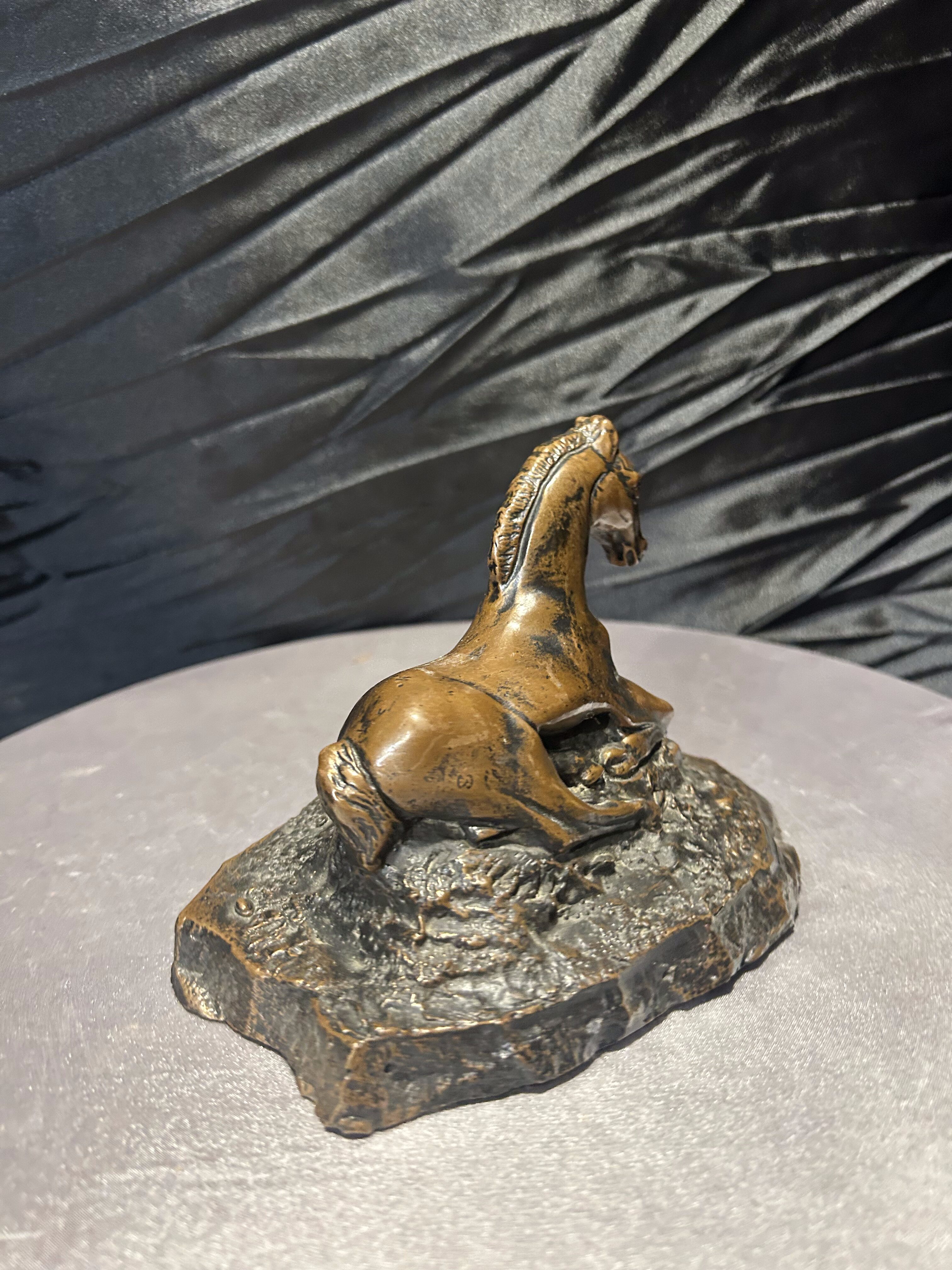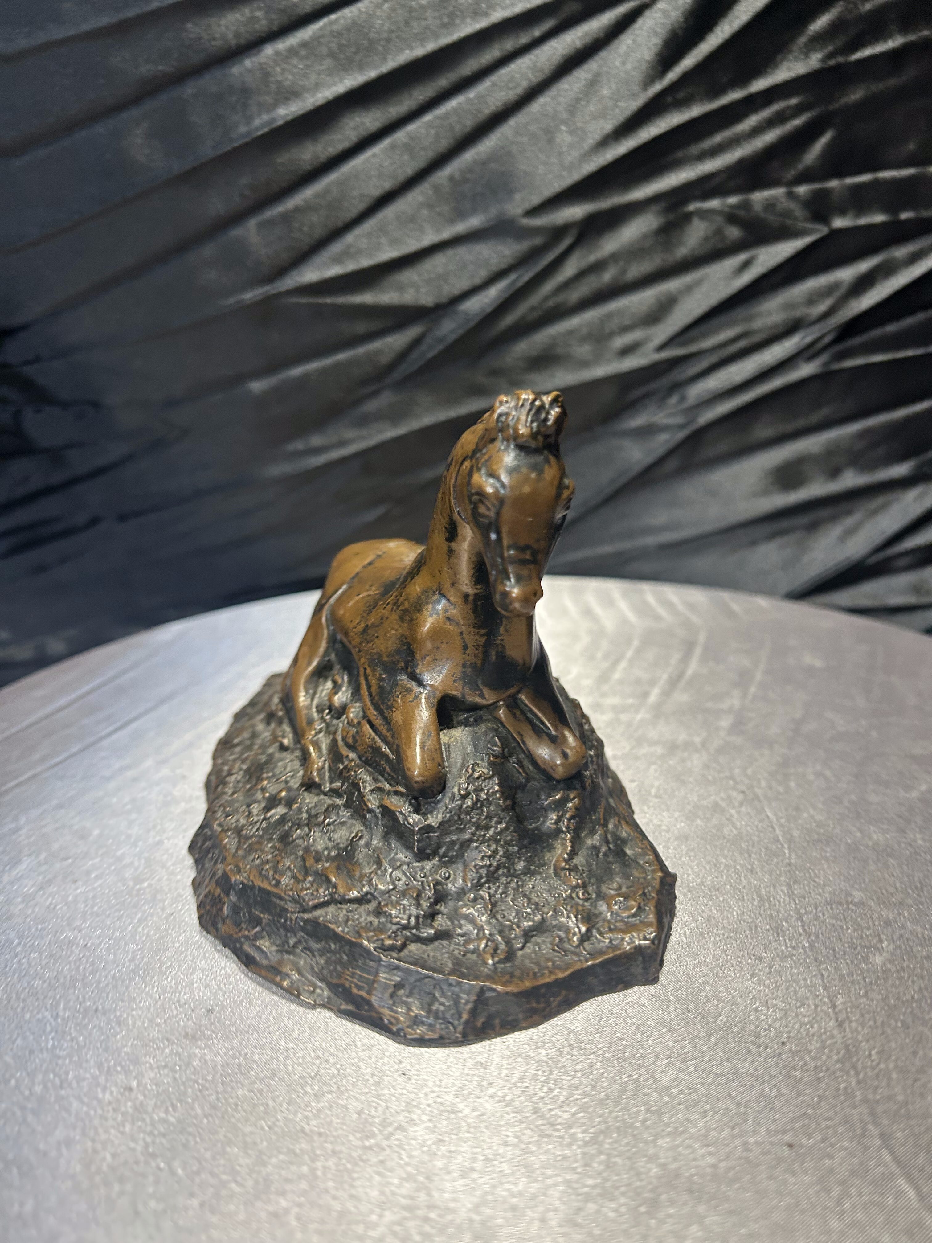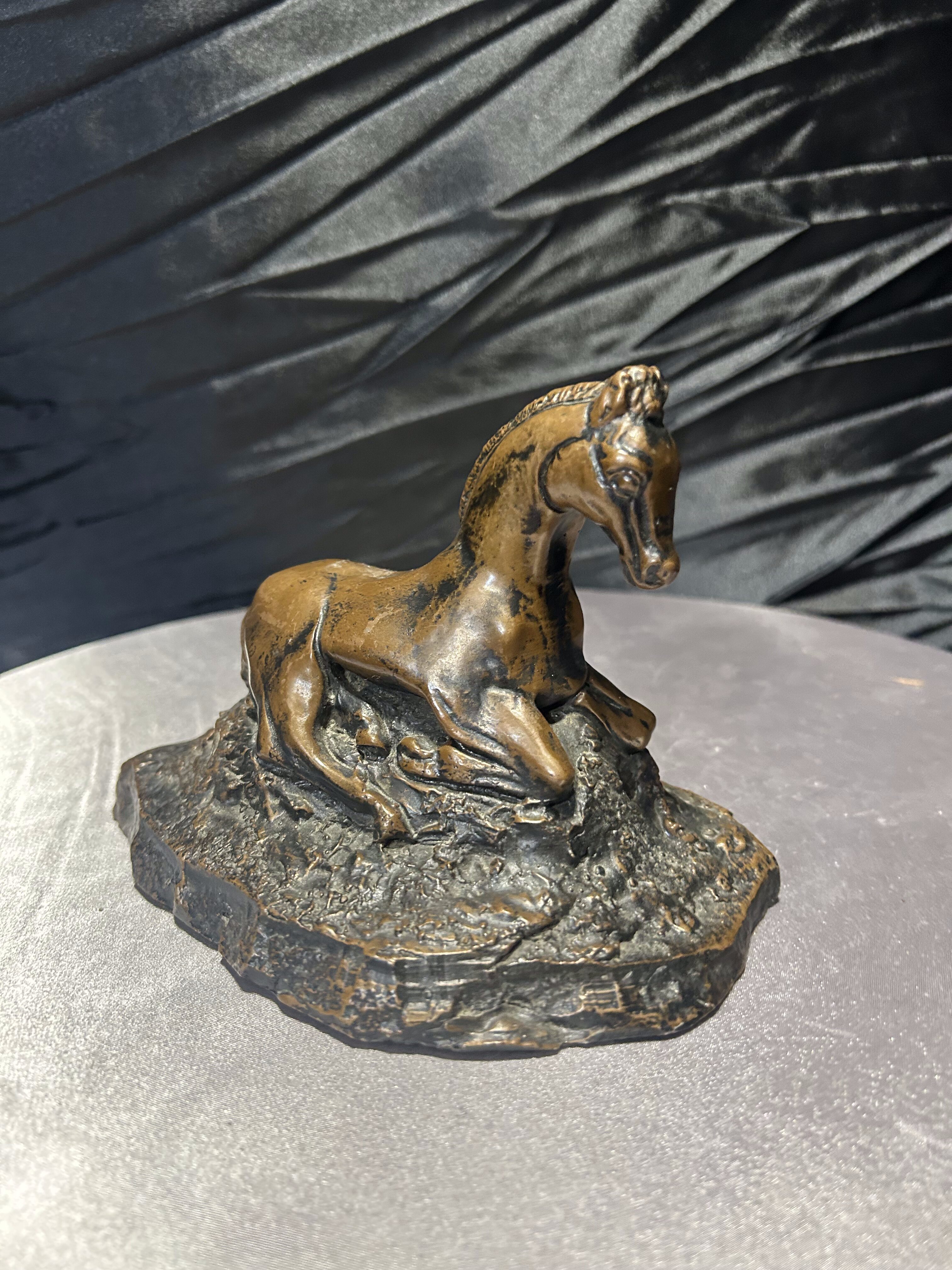 Subtelna rzeźba przedstawiająca leżącego źrebaka, wykonana z dbałością o detale. Powierzchnia w odcieniach brązu pięknie podkreśla miękką linię sylwetki i naturalność przedstawienia. To nie tylko figurka, ale także elegancka dekoracja, która wprowadzi do wnętrza harmonię i klasyczne piękno. Idealna dla miłośników koni i kolekcjonerów wyjątkowych ozdób.
