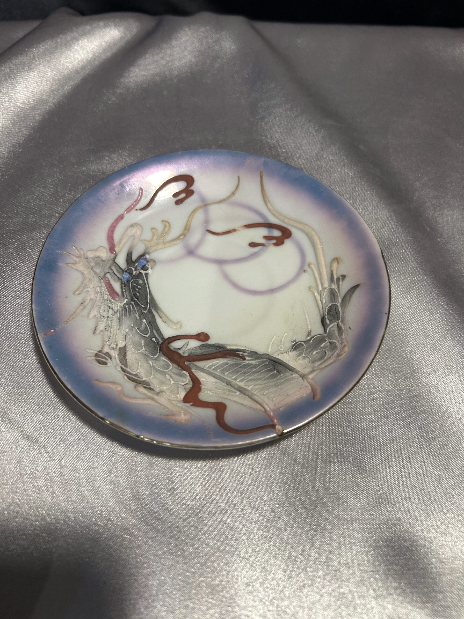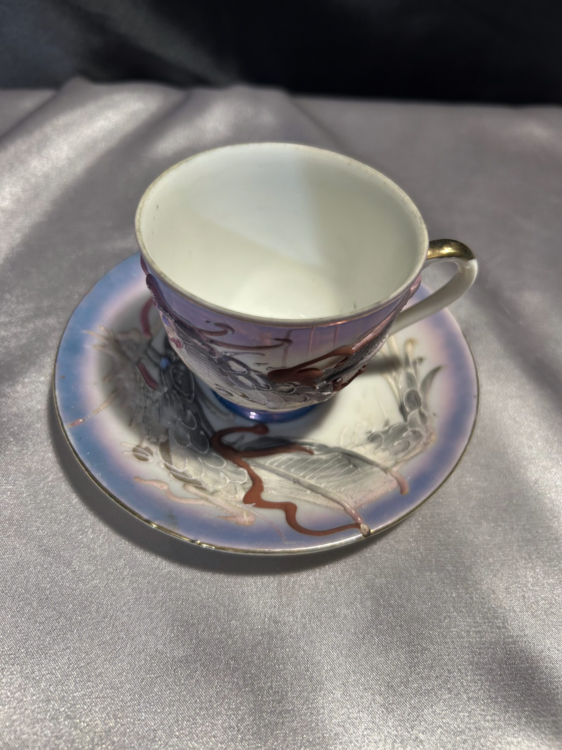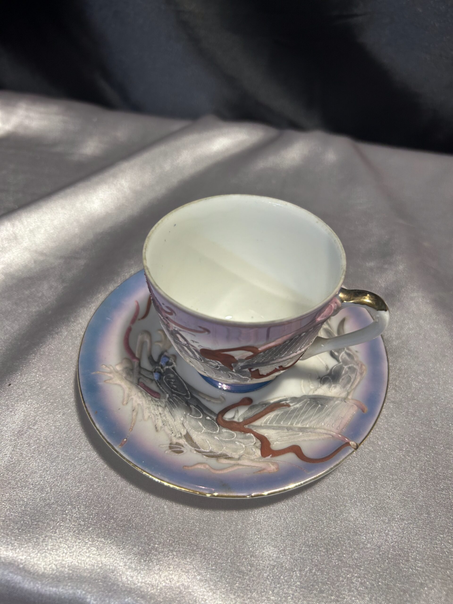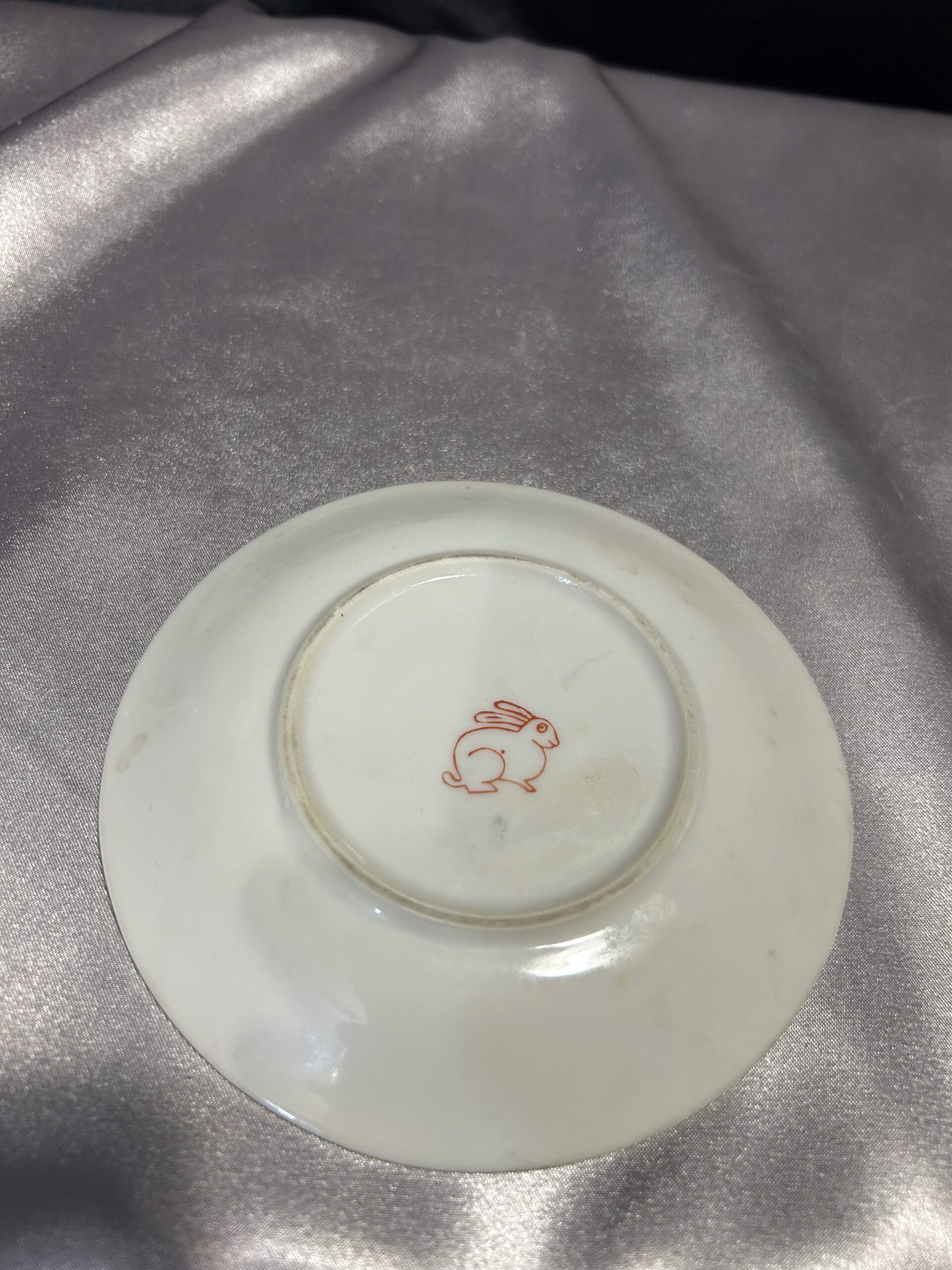 - Zdobienia: wypukłe wzory chińskiego smoka, tajemnicza twarz kobiety na spodzie filiżanki, pieczątka króliczka na spodzie spodeczka, złota obwódka