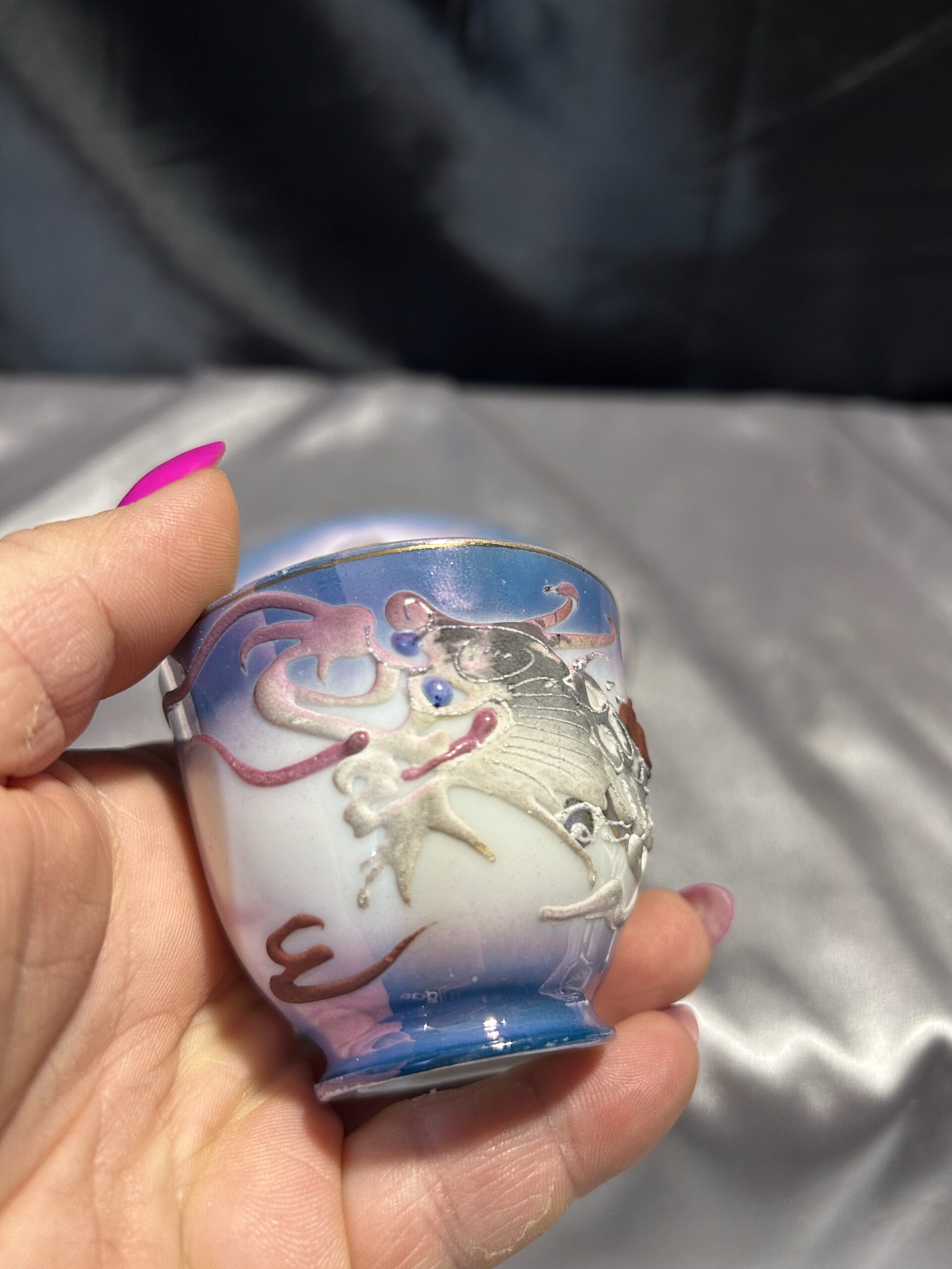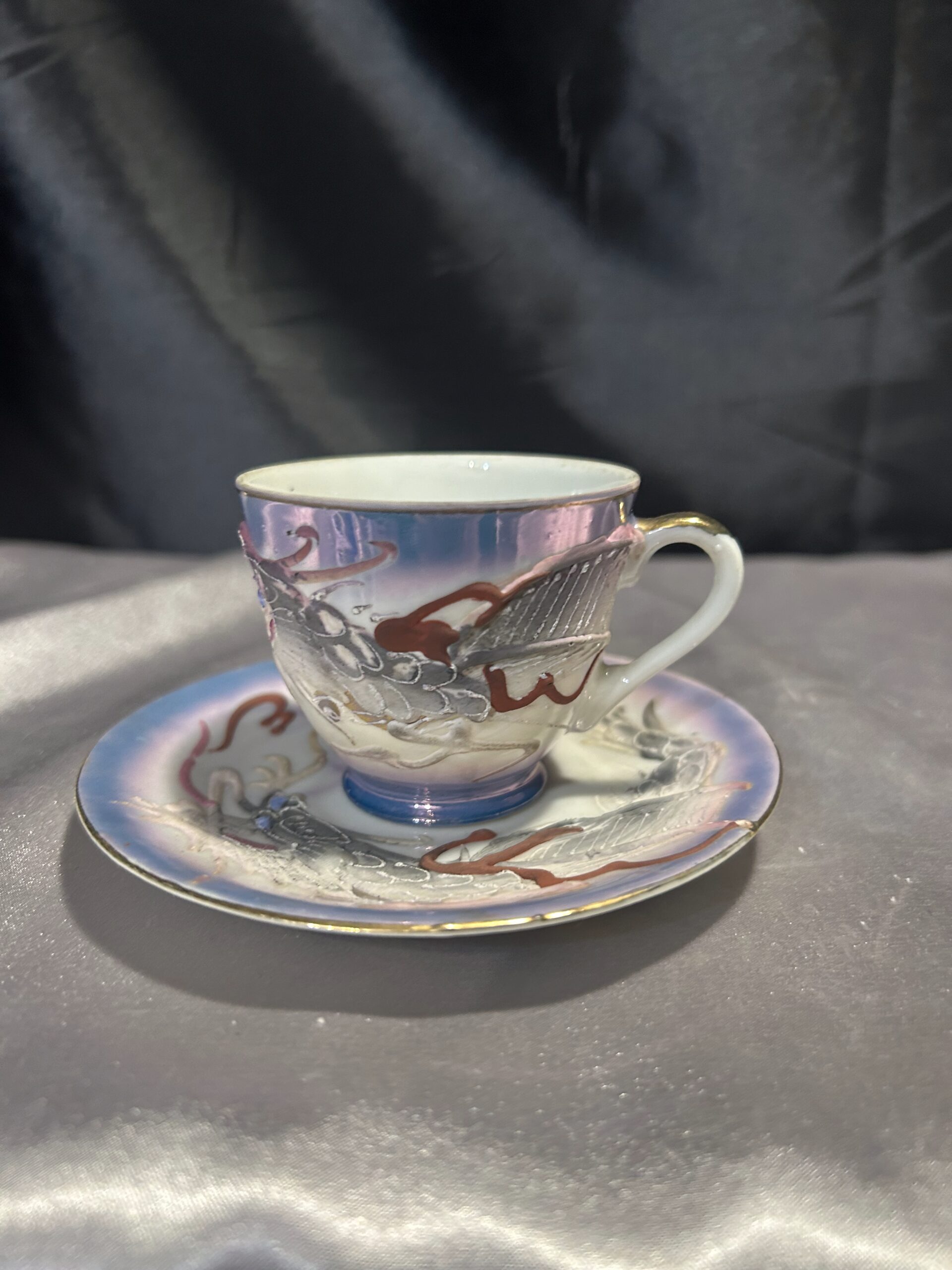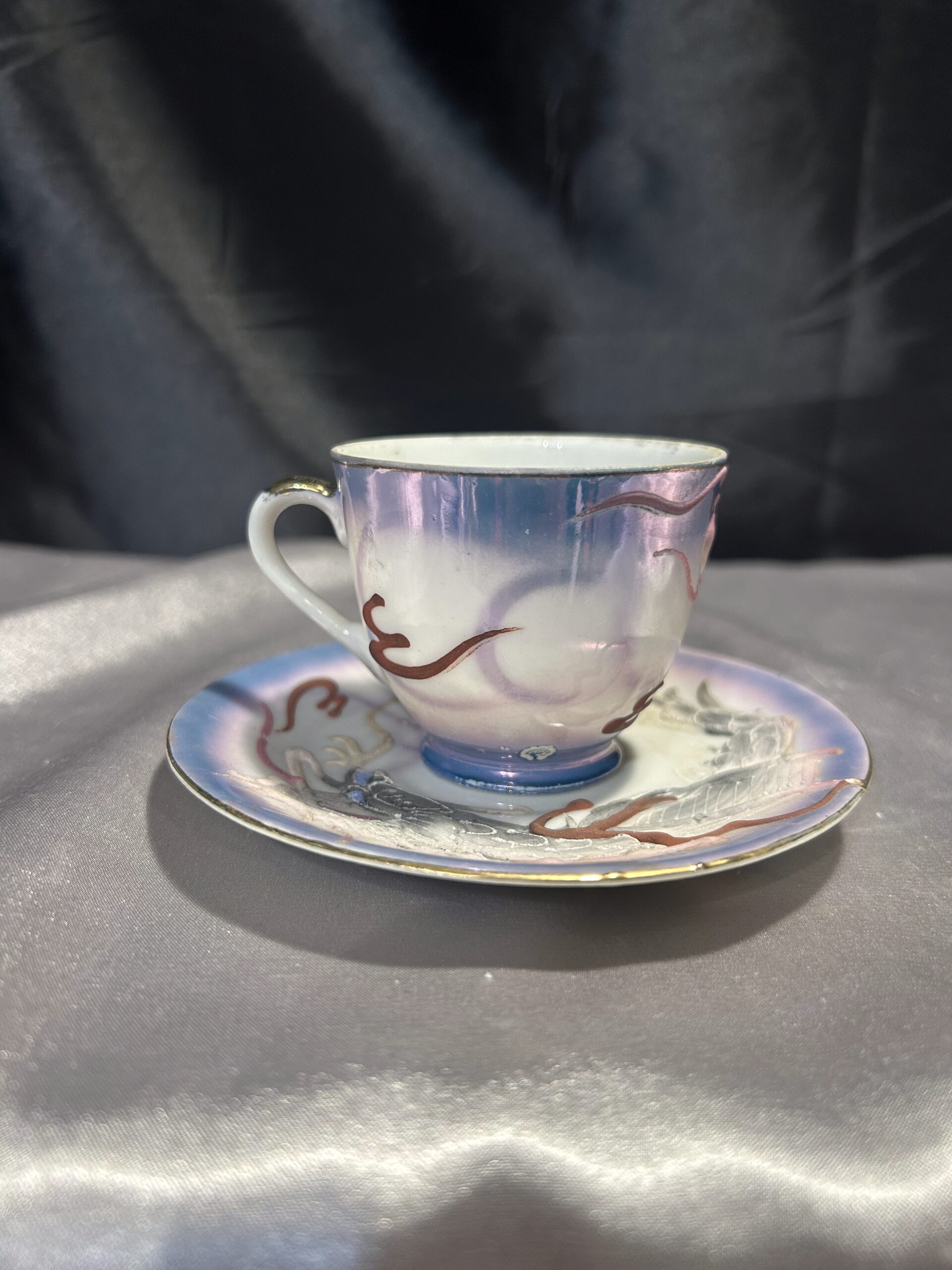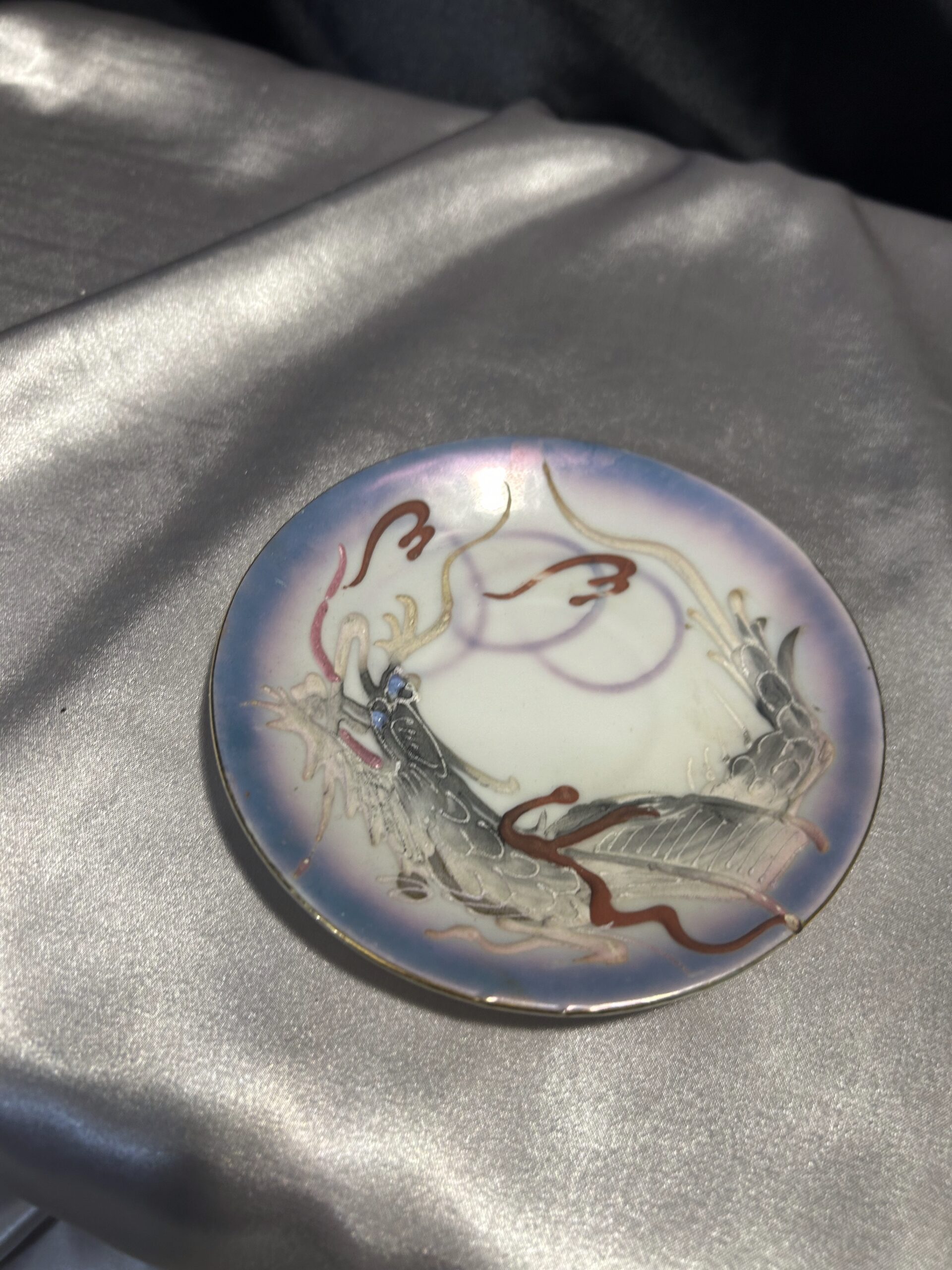 - Zdobienia: wypukłe wzory chińskiego smoka, tajemnicza twarz kobiety na spodzie filiżanki, pieczątka króliczka na spodzie spodeczka, złota obwódka
