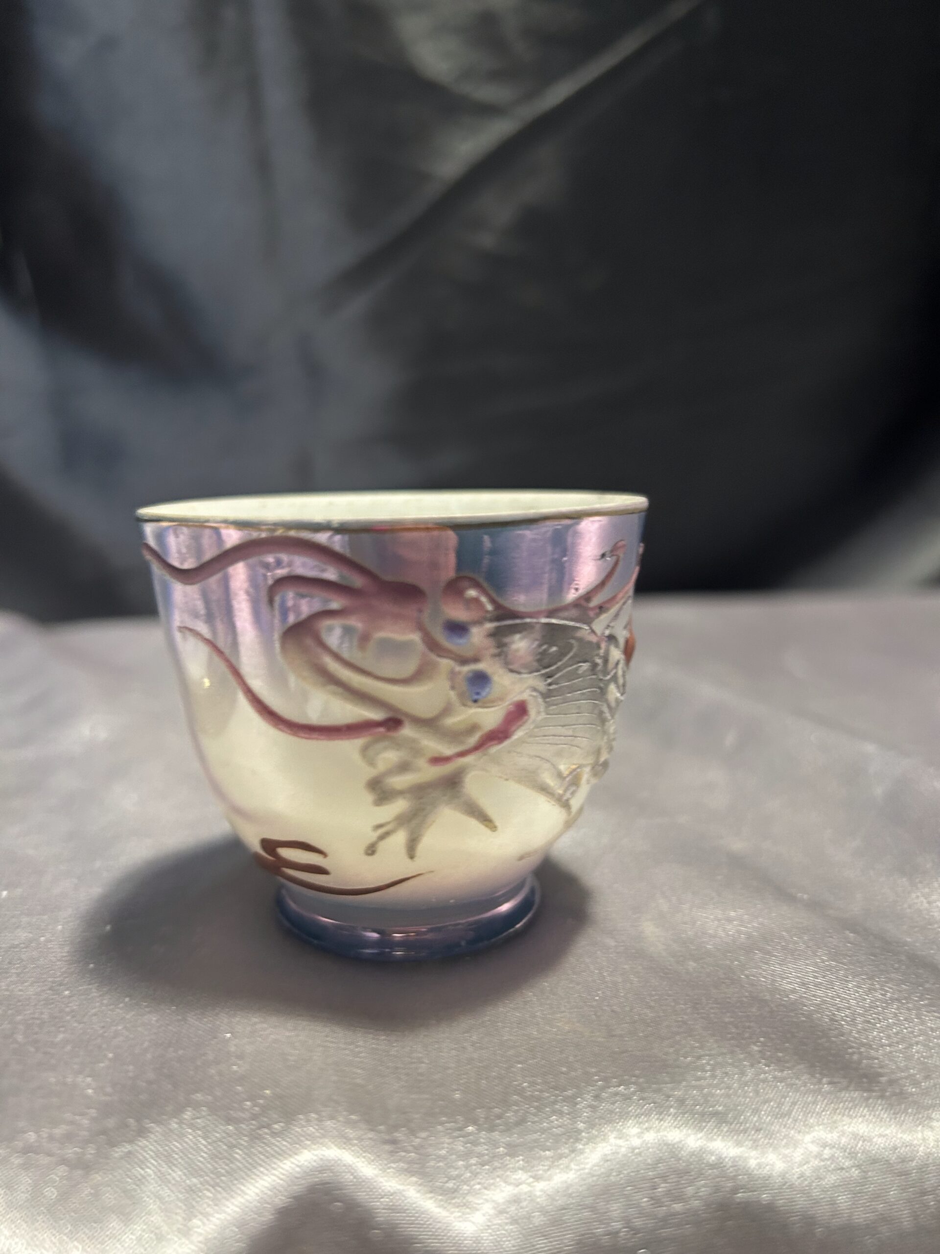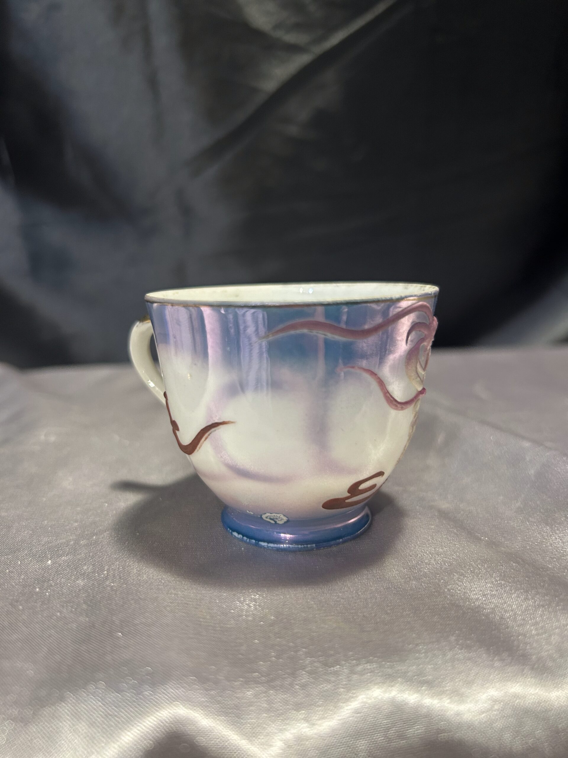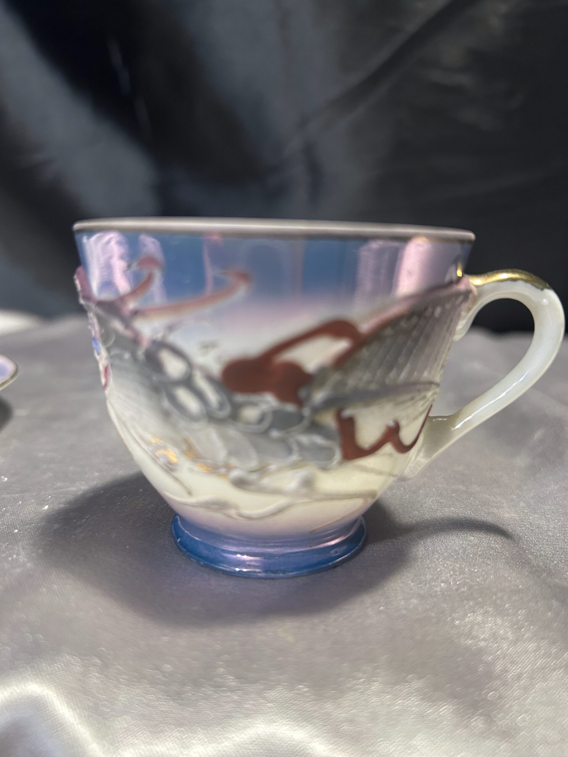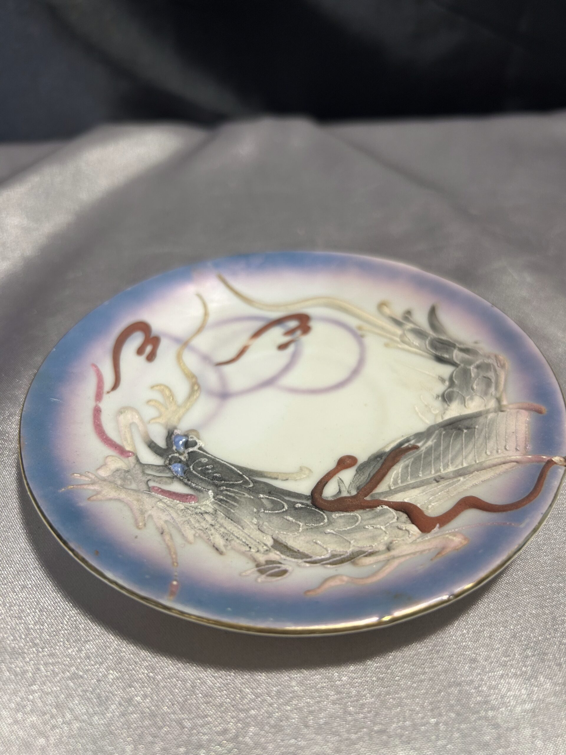 - Zdobienia: wypukłe wzory chińskiego smoka, tajemnicza twarz kobiety na spodzie filiżanki, pieczątka króliczka na spodzie spodeczka, złota obwódka