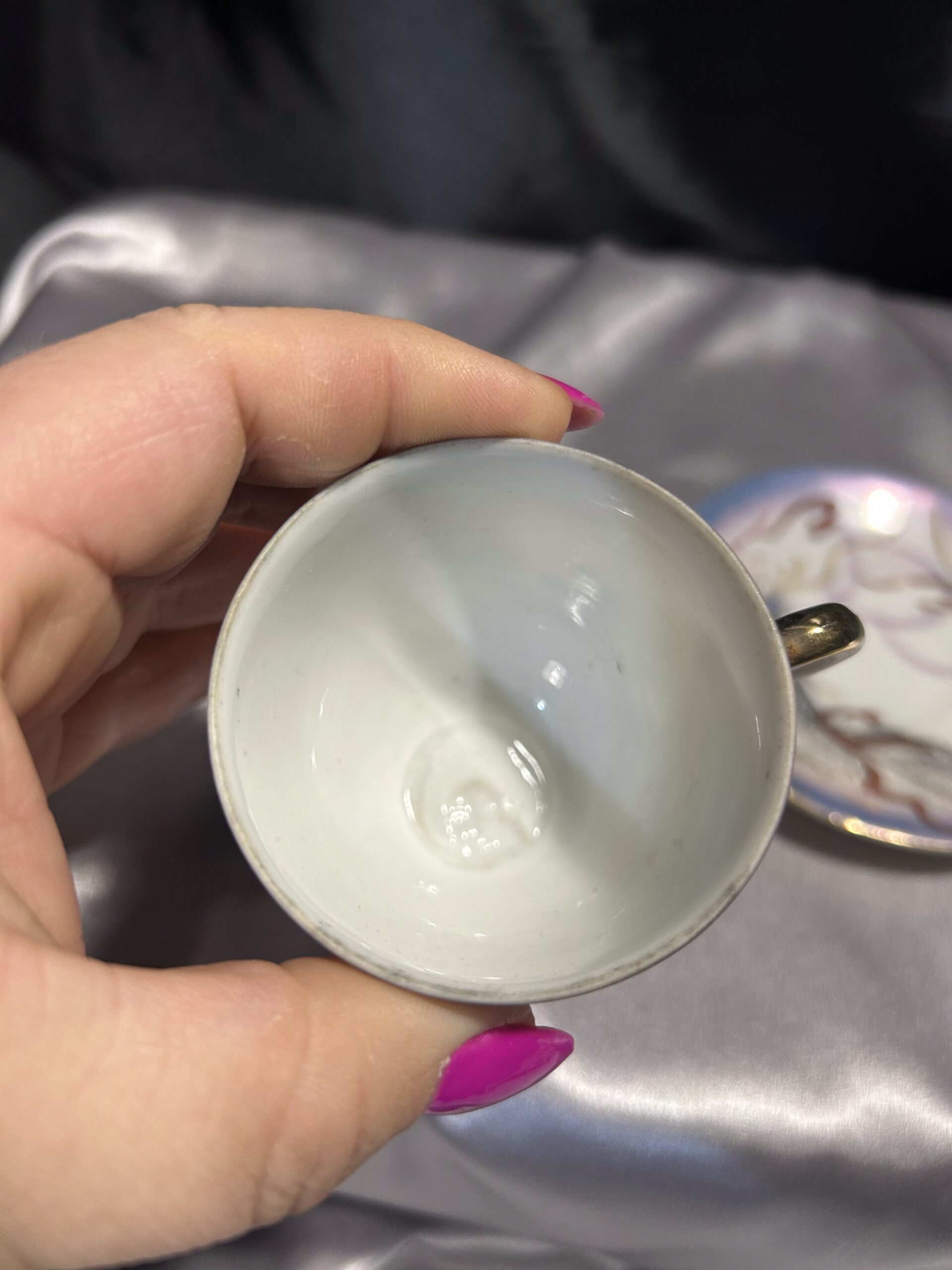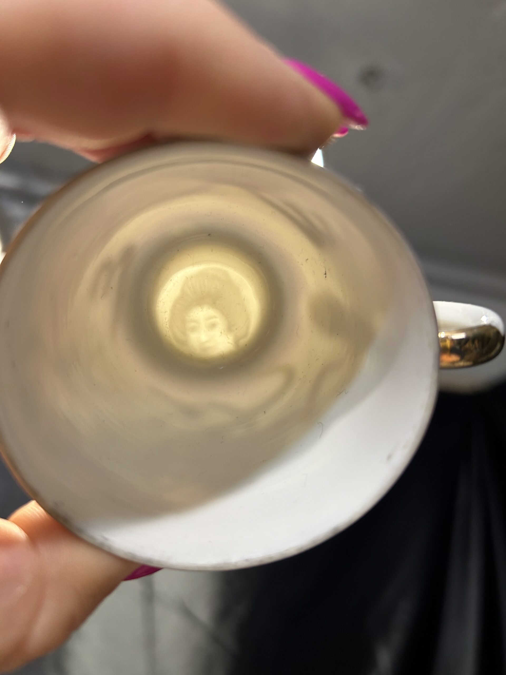 Prawdziwa niespodzianka kryje się na spodzie filiżanki – pod odpowiednim kątem światła można dostrzec delikatnie zarysowaną twarz kobiety, co czyni ten egzemplarz jeszcze bardziej niezwykłym. Na spodzie spodeczka umieszczona jest sygnatura w postaci pieczątki króliczka, podkreślając jej unikalność i kolekcjonerską wartość. Całość dopełnia elegancka złota obwódka, która dodaje filiżance wyrafinowanego charakteru.