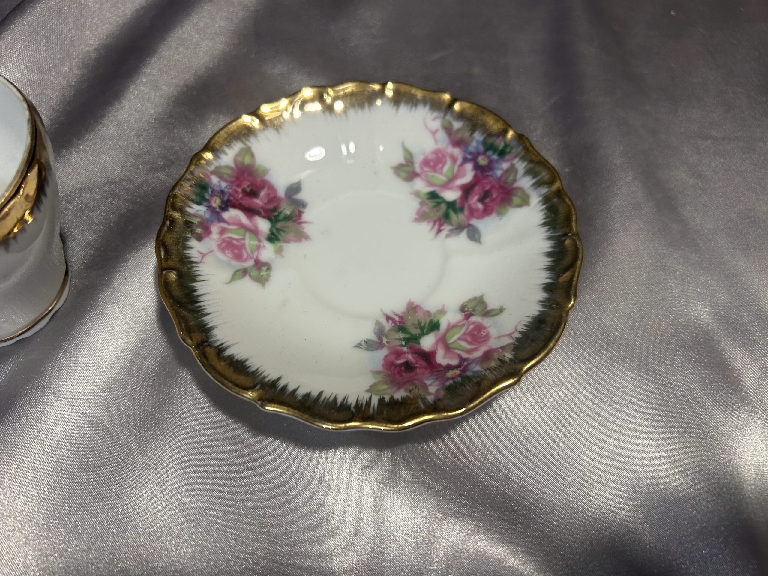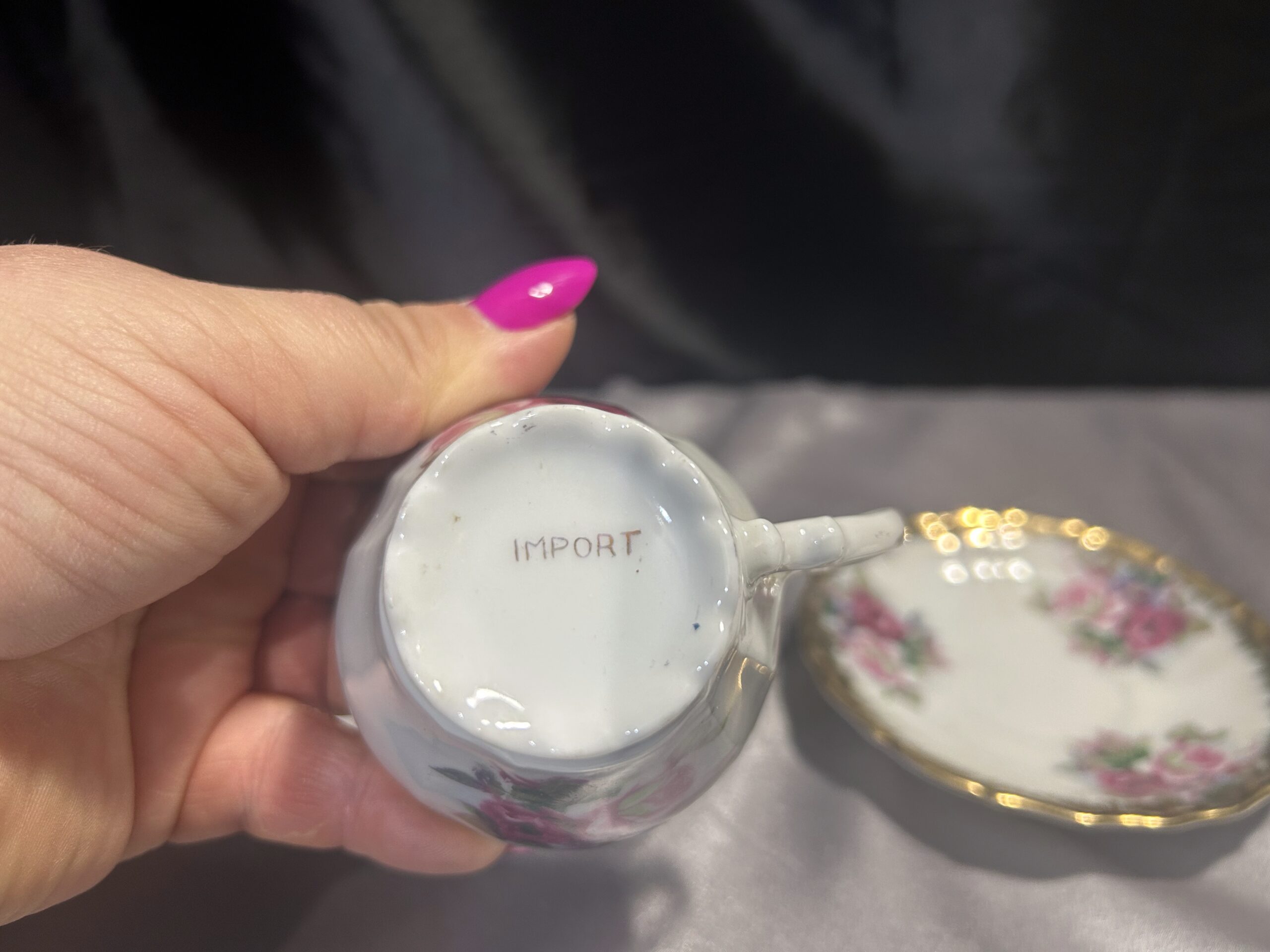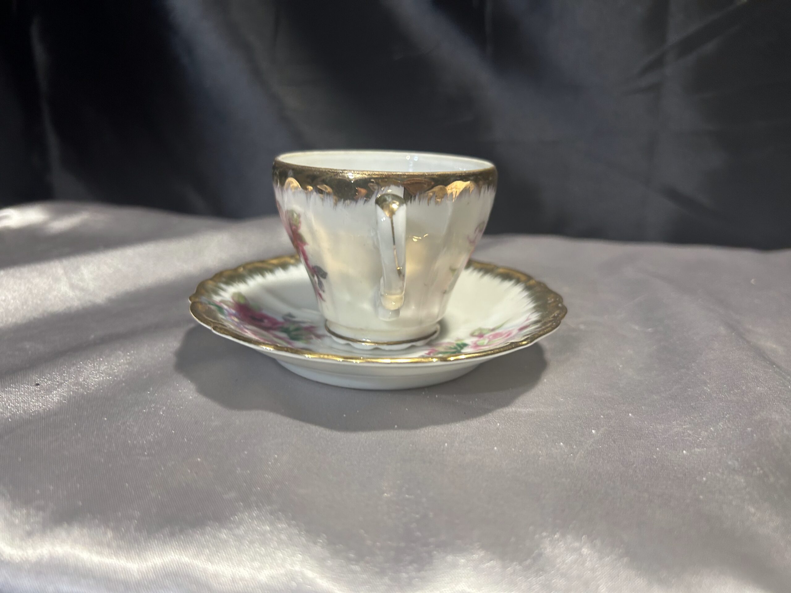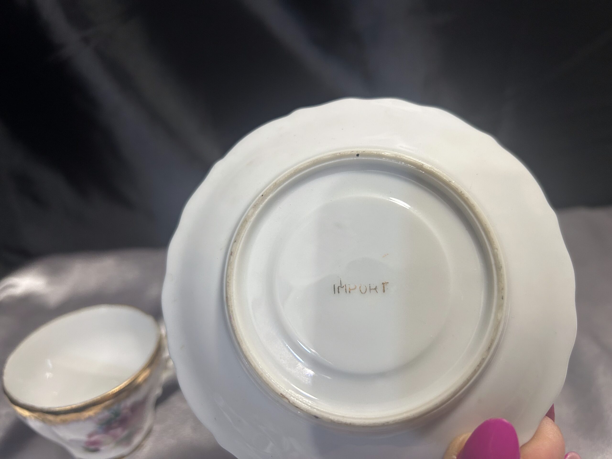 Prezentujemy elegancką filiżankę z podstawką, wykonaną z delikatnej porcelany i zdobioną misternymi, ręcznie malowanymi kwiatami. Złote obwódki dodają jej subtelnej elegancji i podkreślają wyjątkowy charakter. Na spodzie widnieje sygnatura IMPORT, co potwierdza jej unikalność i wysoką jakość wykonania.