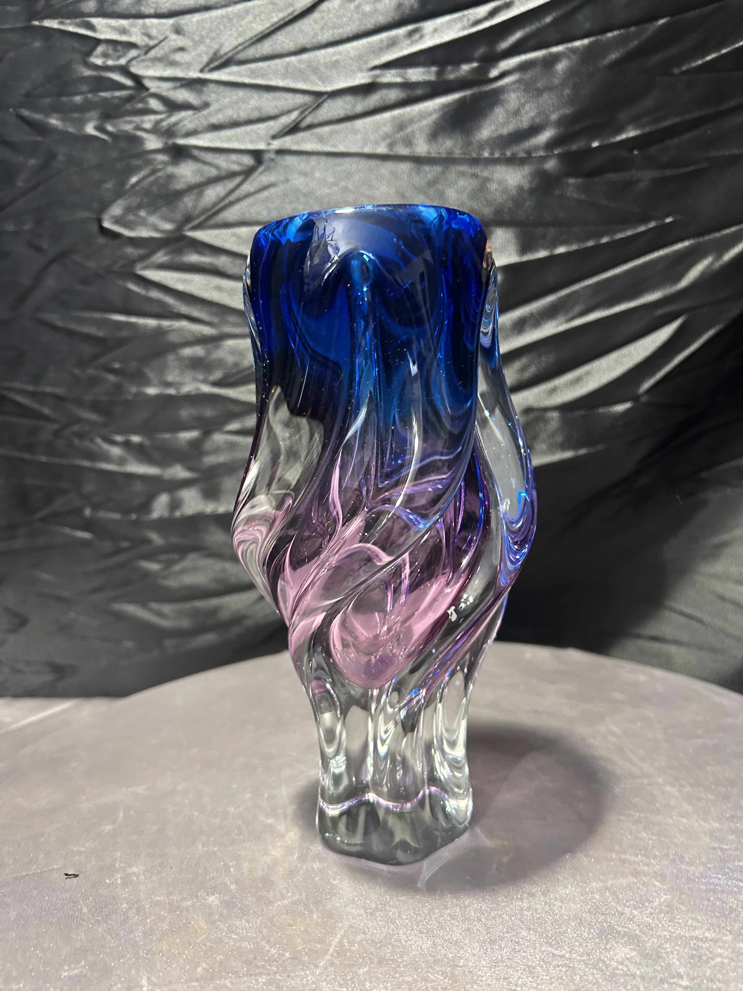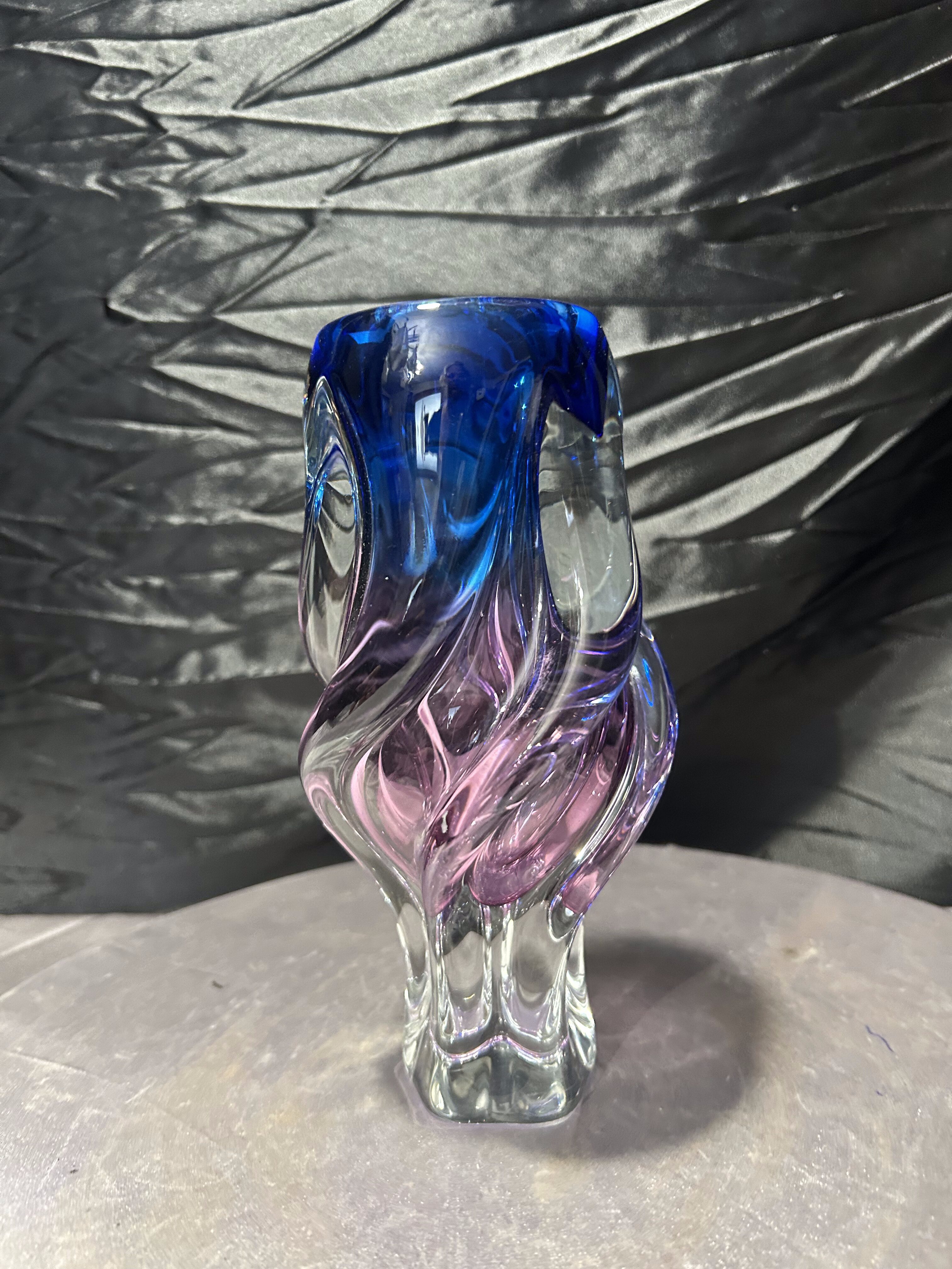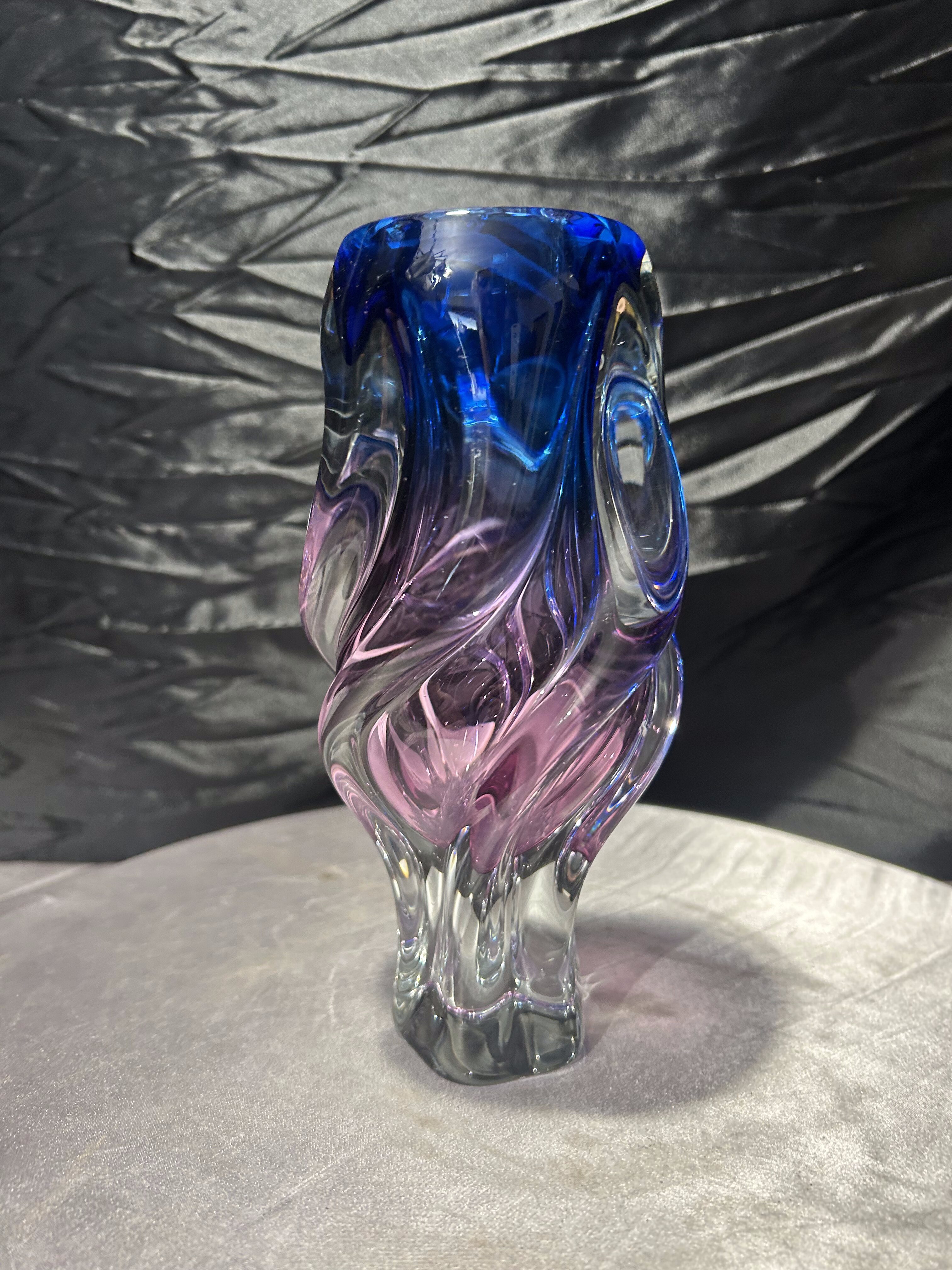 Wyjątkowy flakon wykonany z efektownego szkła artystycznego w stylu charakterystycznym dla czeskiej huty Bohemia. Dynamiczna, spiralna forma oraz płynne przejście kolorów od głębokiego granatu do subtelnego fioletu tworzą niezwykle dekoracyjny efekt przestrzenny. Grube, masywne szkło pięknie załamuje światło, podkreślając ruch i falującą strukturę wzoru.