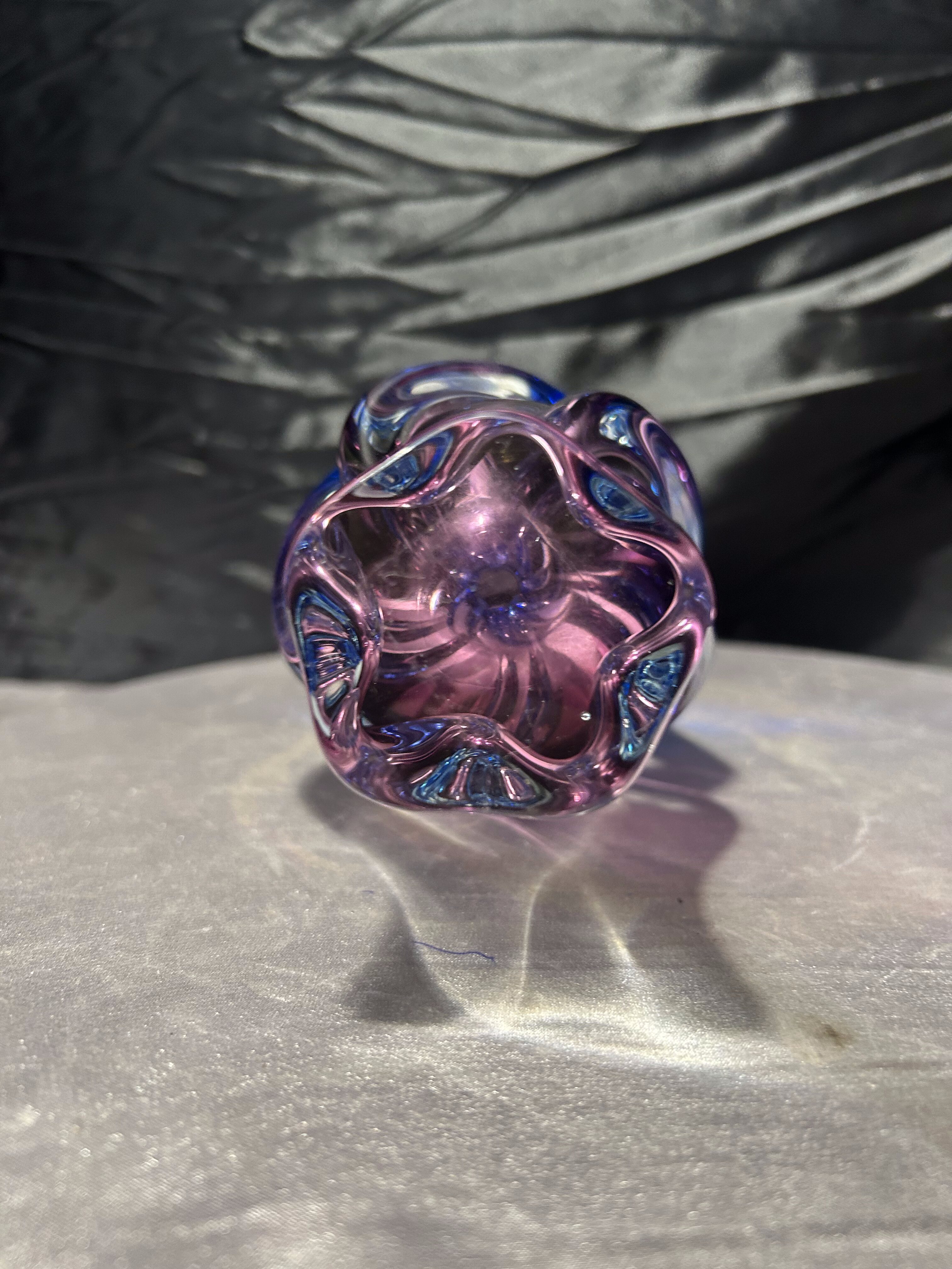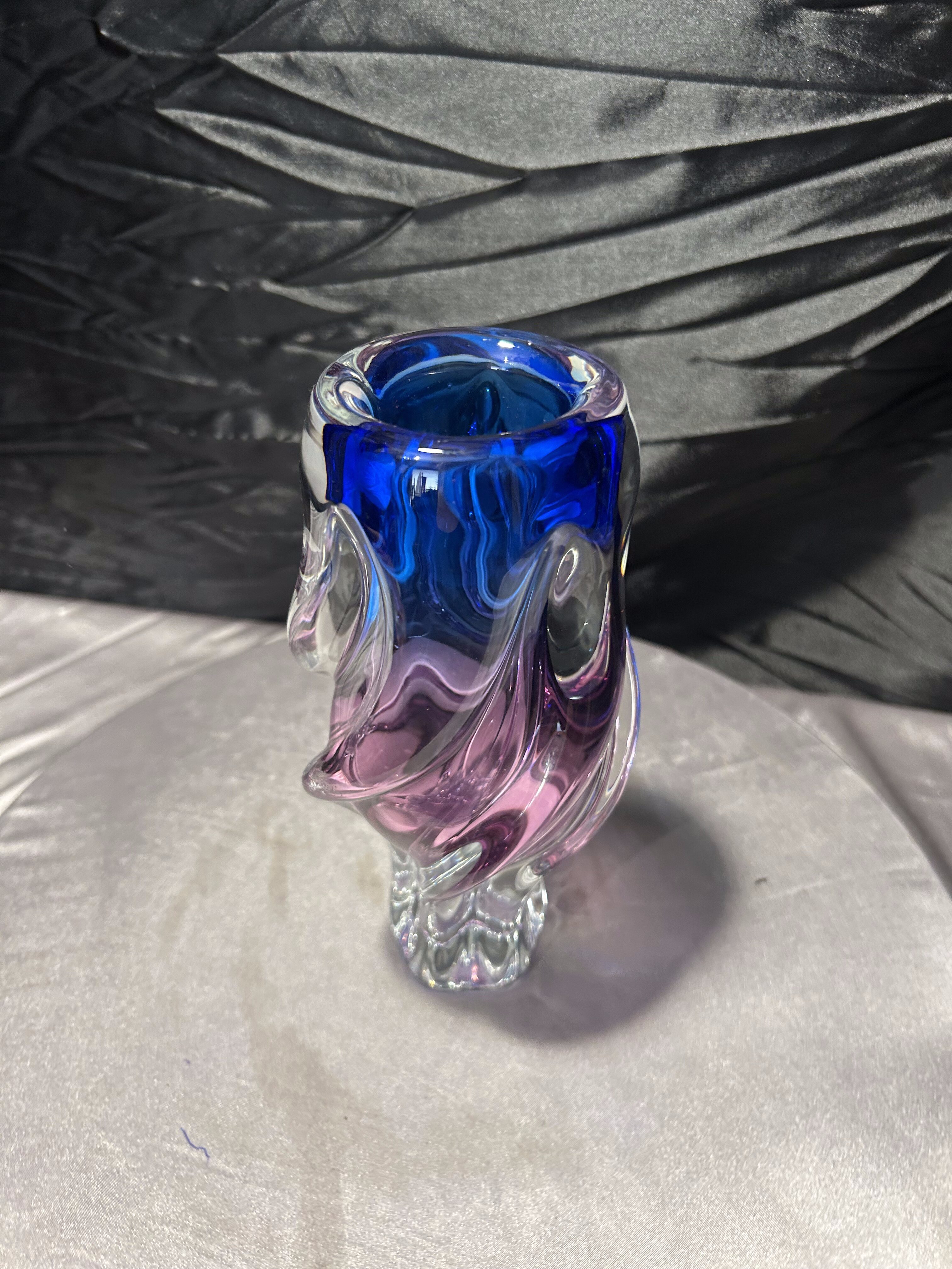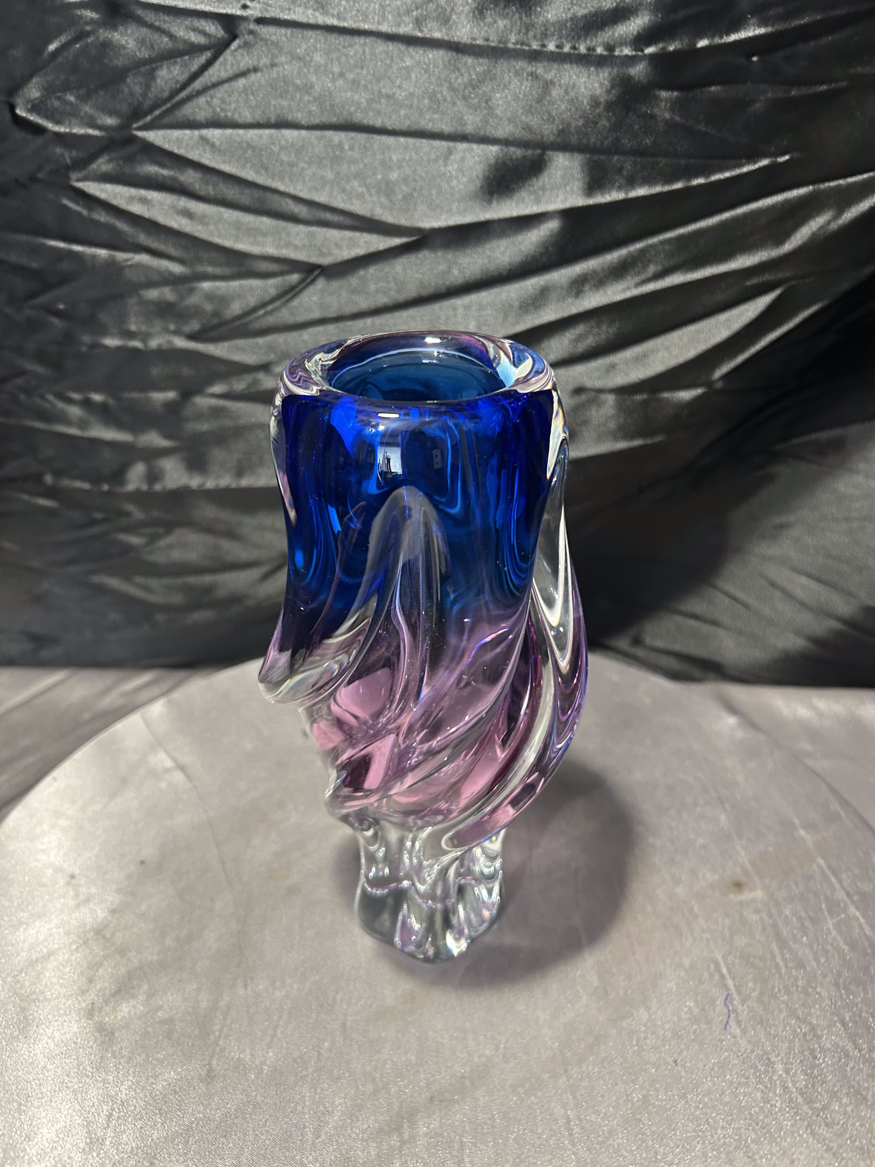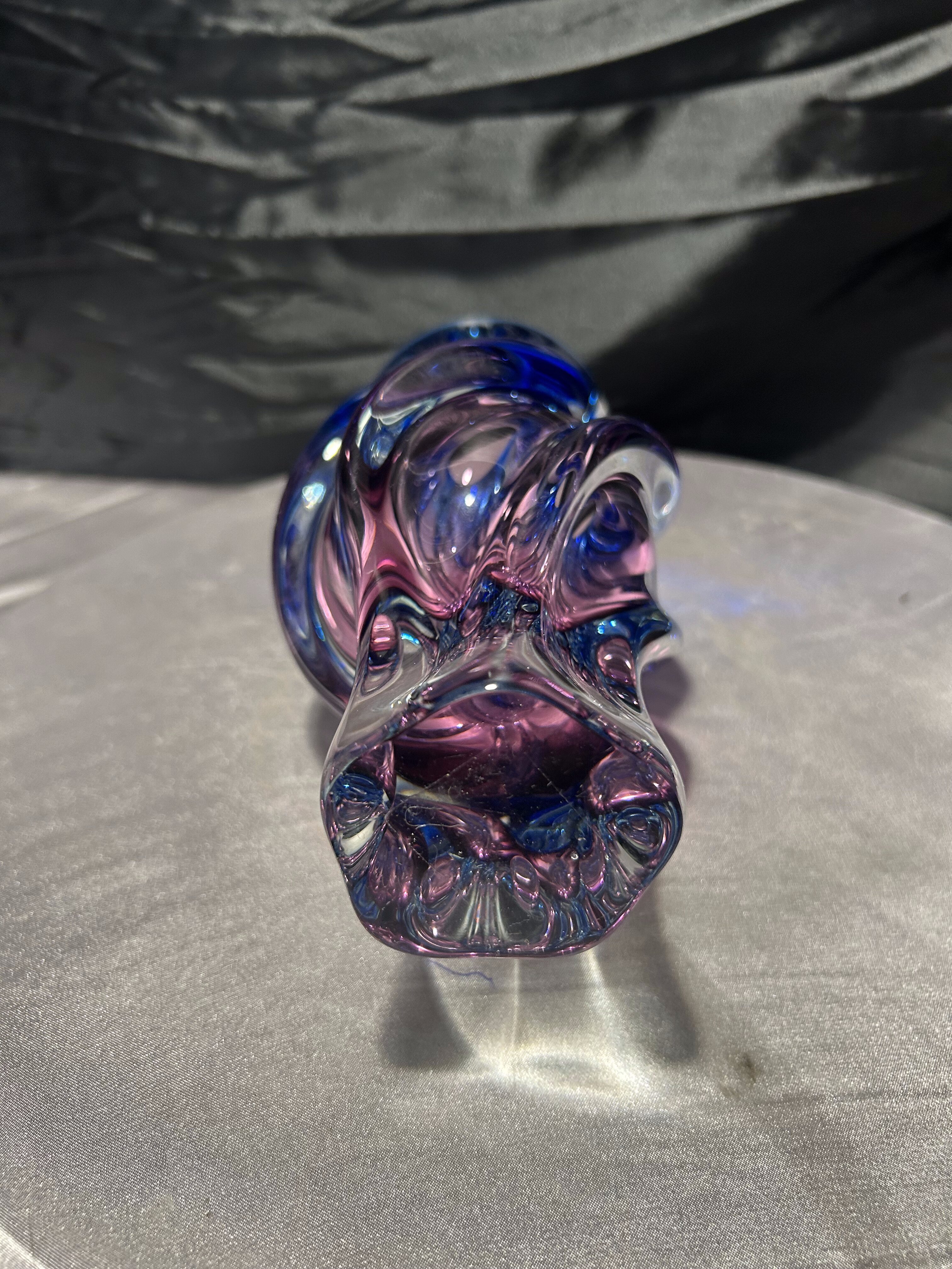 Wyjątkowy flakon wykonany z efektownego szkła artystycznego w stylu charakterystycznym dla czeskiej huty Bohemia. Dynamiczna, spiralna forma oraz płynne przejście kolorów od głębokiego granatu do subtelnego fioletu tworzą niezwykle dekoracyjny efekt przestrzenny. Grube, masywne szkło pięknie załamuje światło, podkreślając ruch i falującą strukturę wzoru.