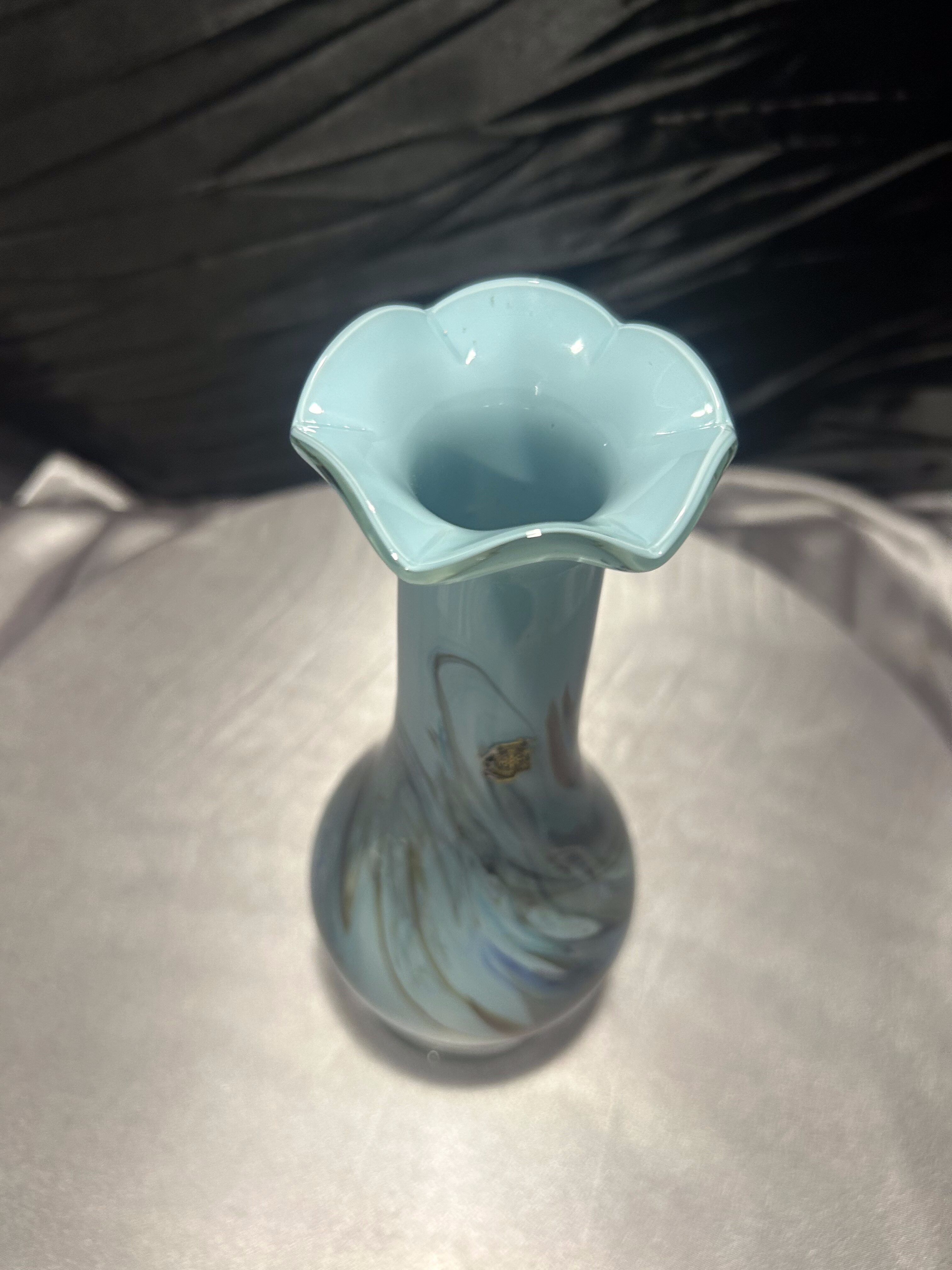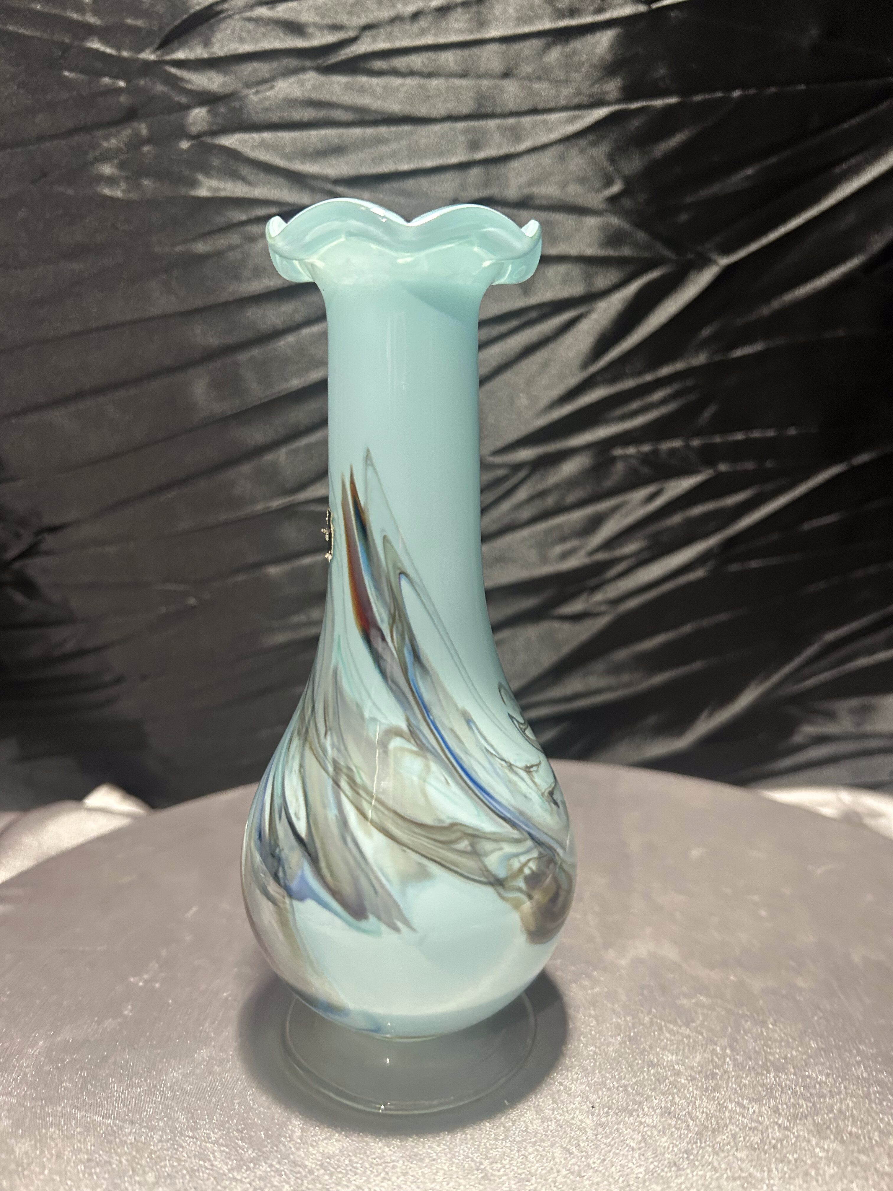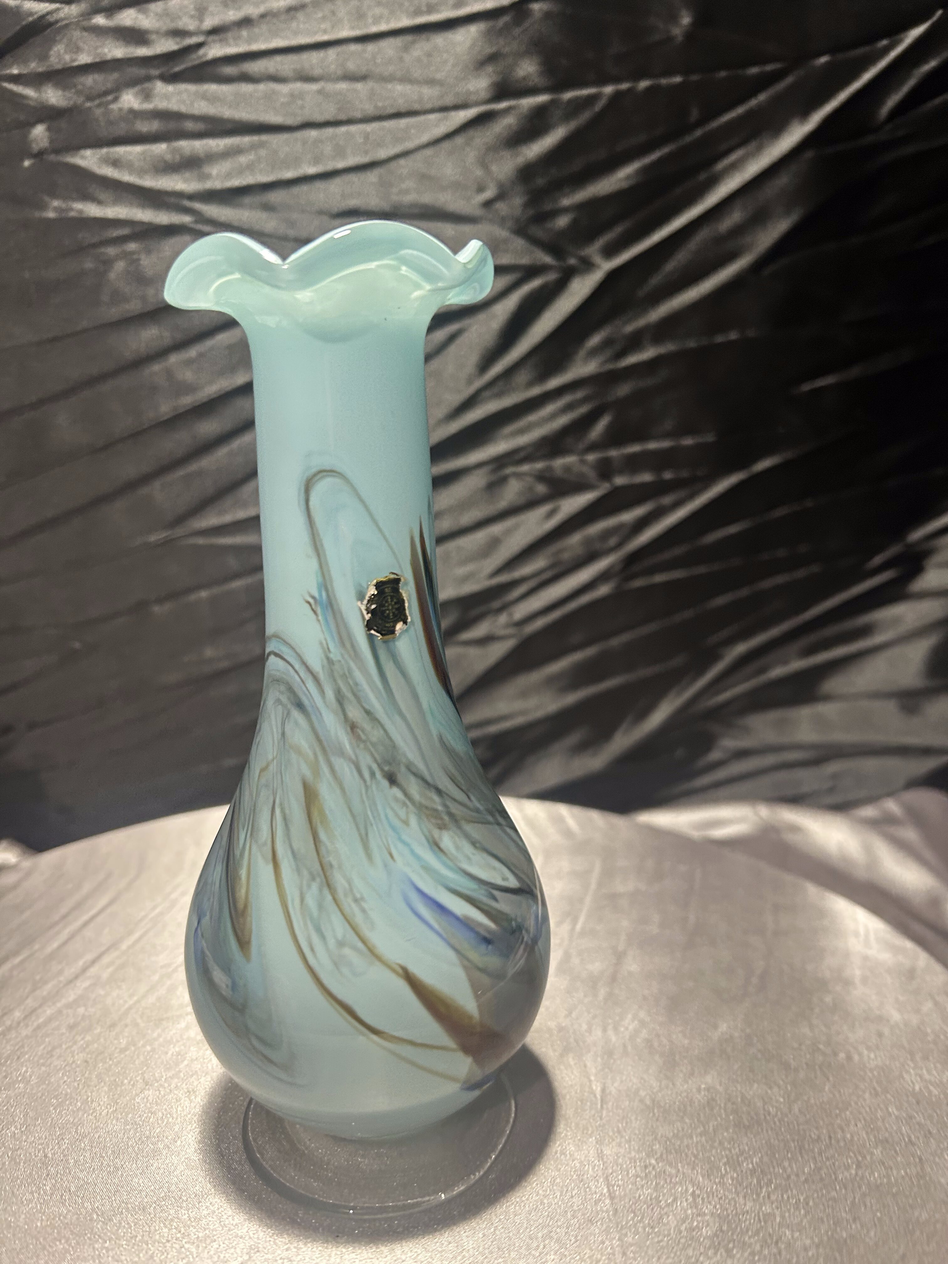 Wyjątkowy flakon artystyczny ze szkła Murano, ręcznie wykonany we Włoszech. Na korpusie zachowała się oryginalna złota naklejka z napisem “Hand Made – Murano Glass – Italy”, potwierdzająca autentyczność wyrobu. Szkło w odcieniu jasnego błękitu z zatopionymi smugami barw – brązowej, szarej i błękitnej – tworzy efekt ruchu i głębi charakterystyczny dla tradycyjnego włoskiego szkła artystycznego. Górna część zwieńczona falbanką o miękkiej linii, która dodaje lekkości całej formie.