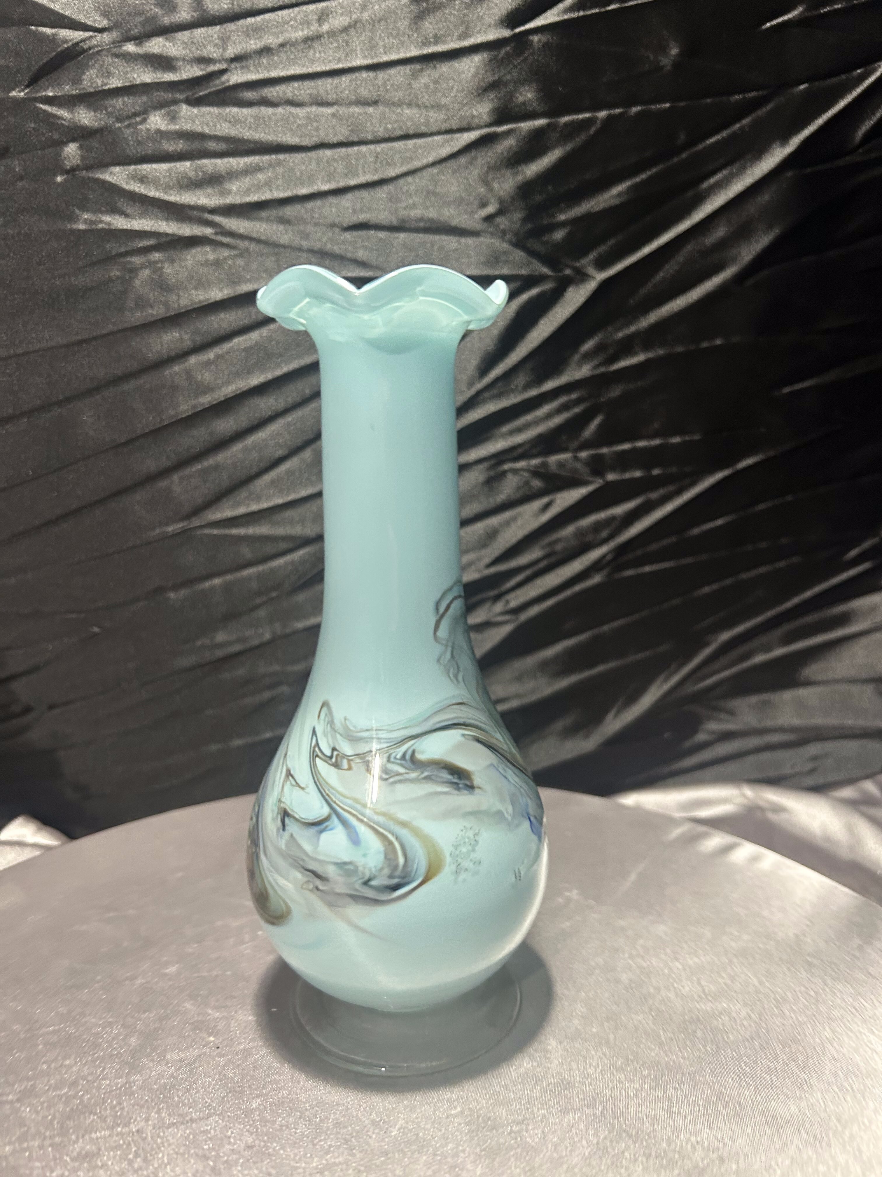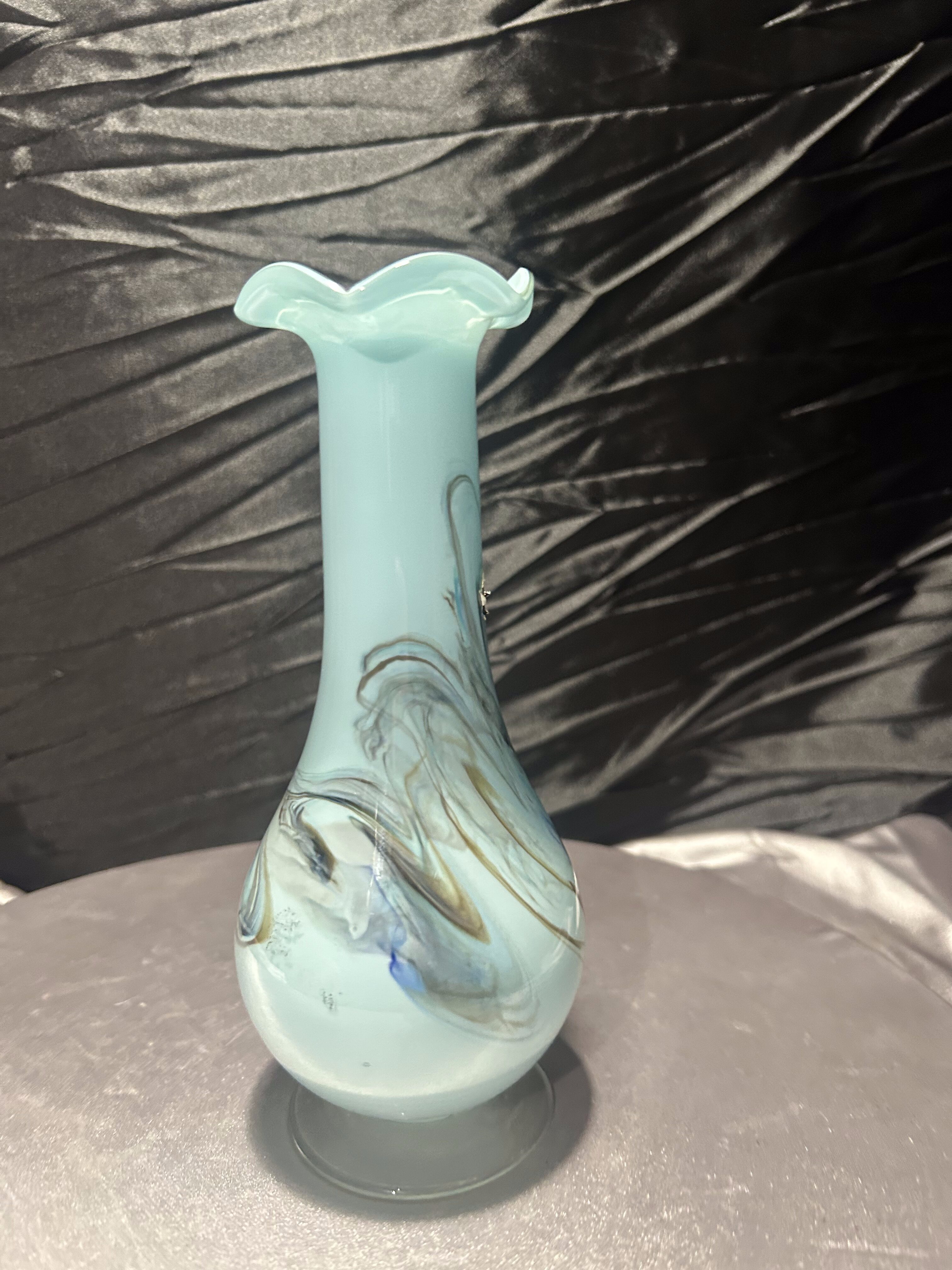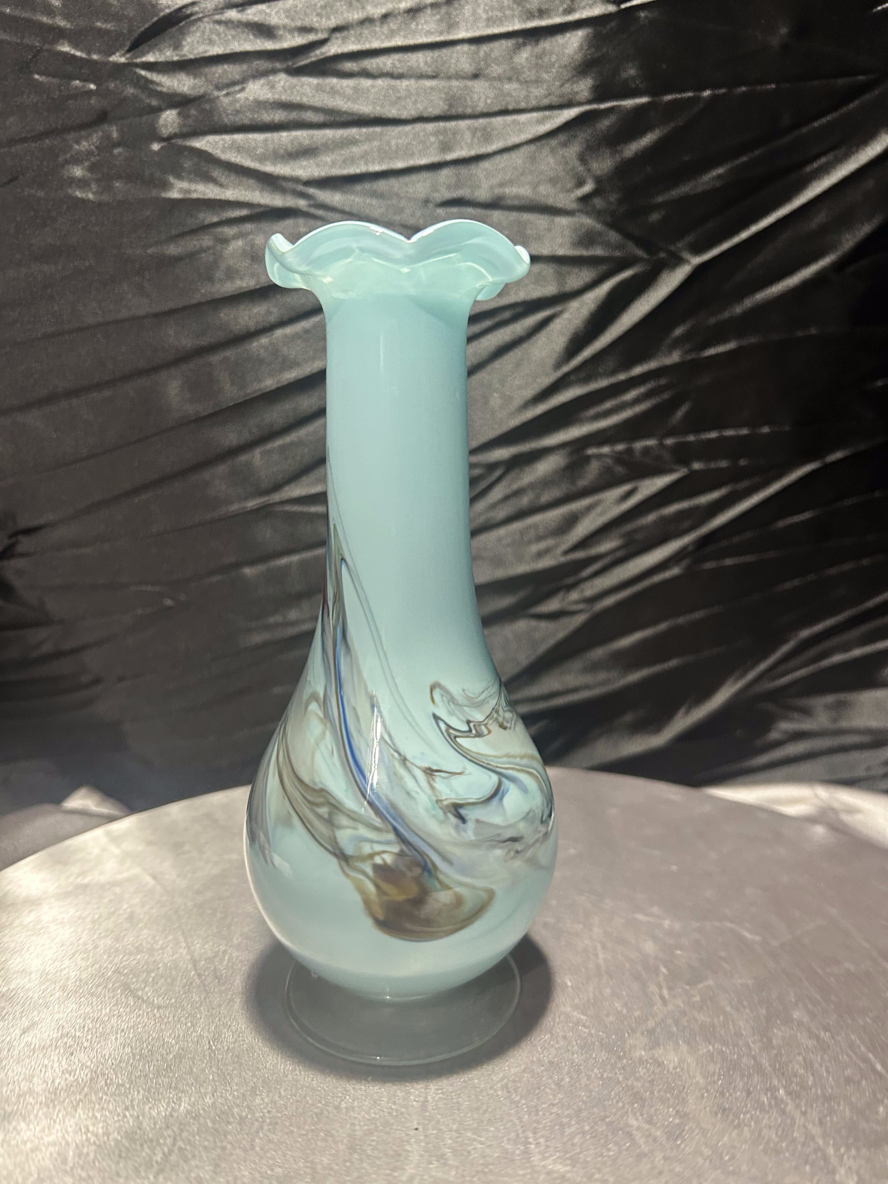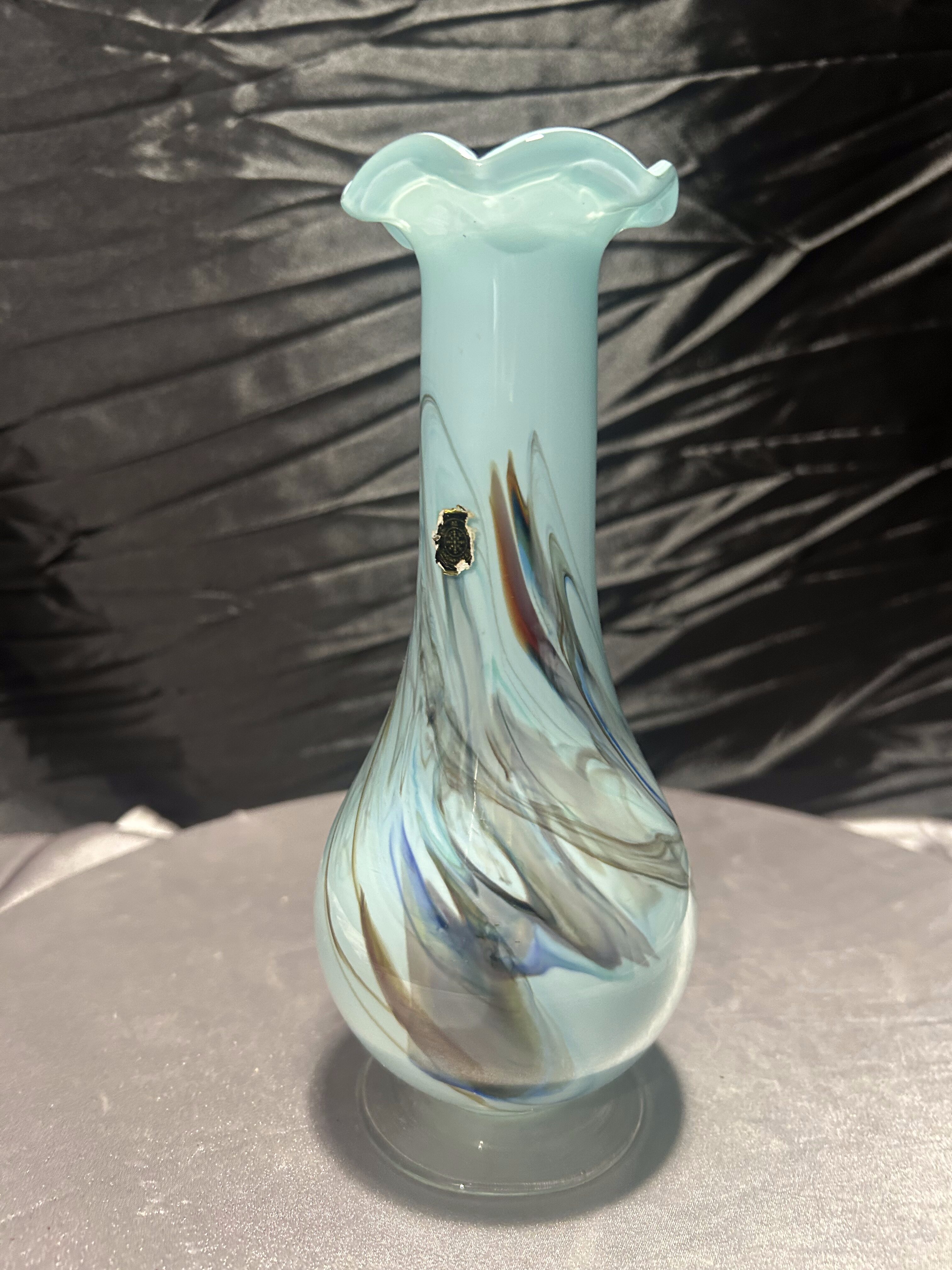 Wyjątkowy flakon artystyczny ze szkła Murano, ręcznie wykonany we Włoszech. Na korpusie zachowała się oryginalna złota naklejka z napisem “Hand Made – Murano Glass – Italy”, potwierdzająca autentyczność wyrobu. Szkło w odcieniu jasnego błękitu z zatopionymi smugami barw – brązowej, szarej i błękitnej – tworzy efekt ruchu i głębi charakterystyczny dla tradycyjnego włoskiego szkła artystycznego. Górna część zwieńczona falbanką o miękkiej linii, która dodaje lekkości całej formie.