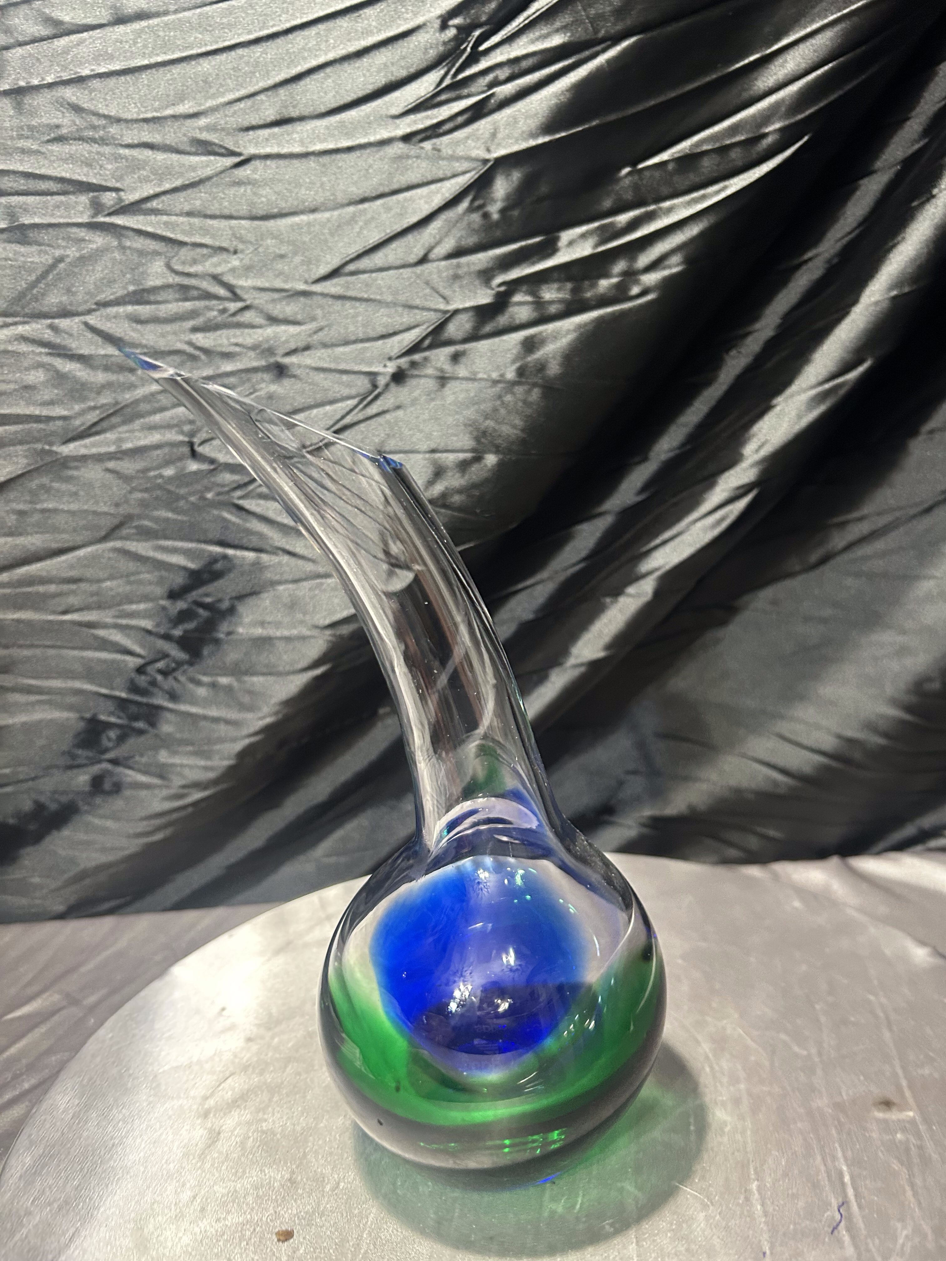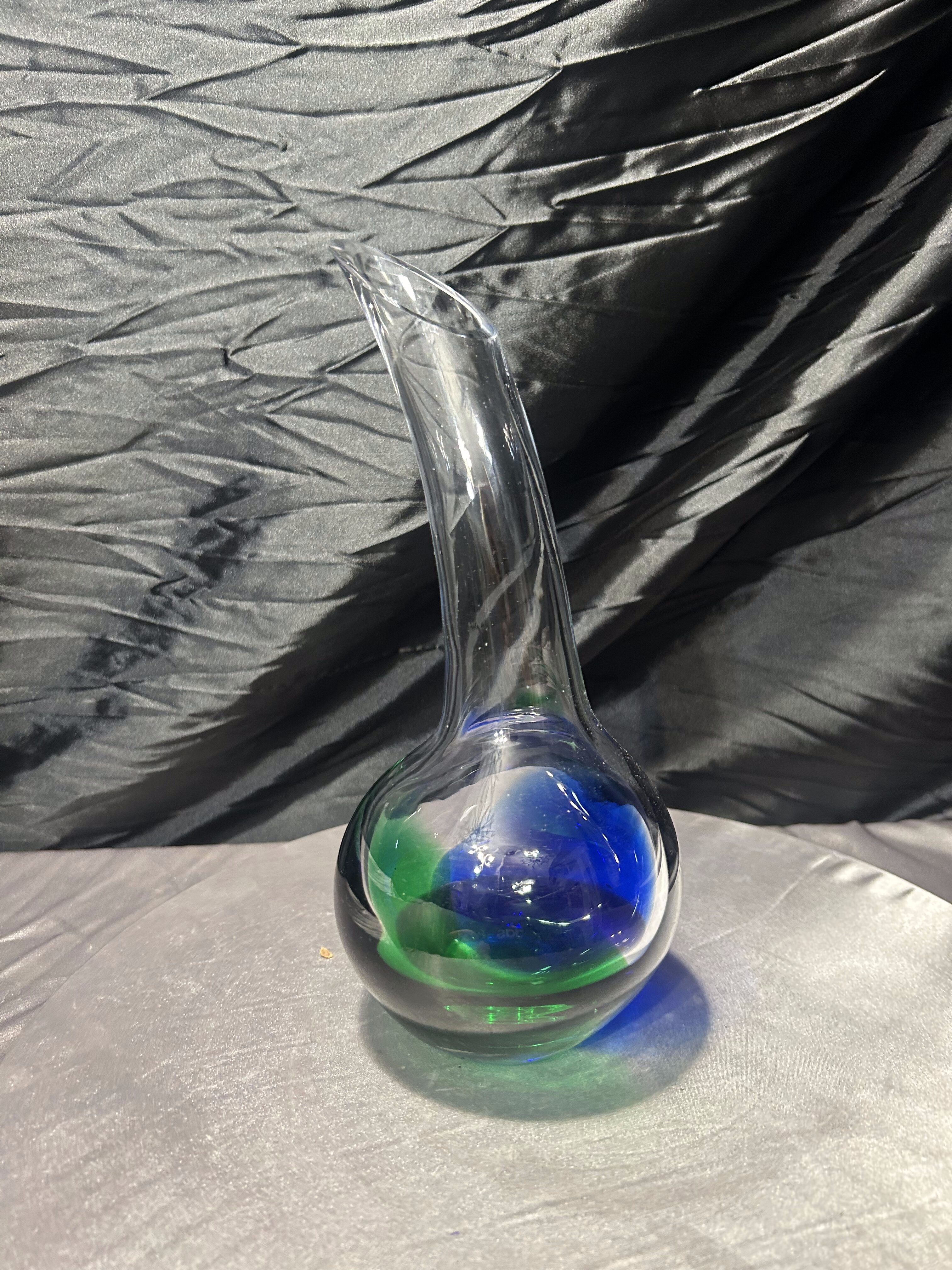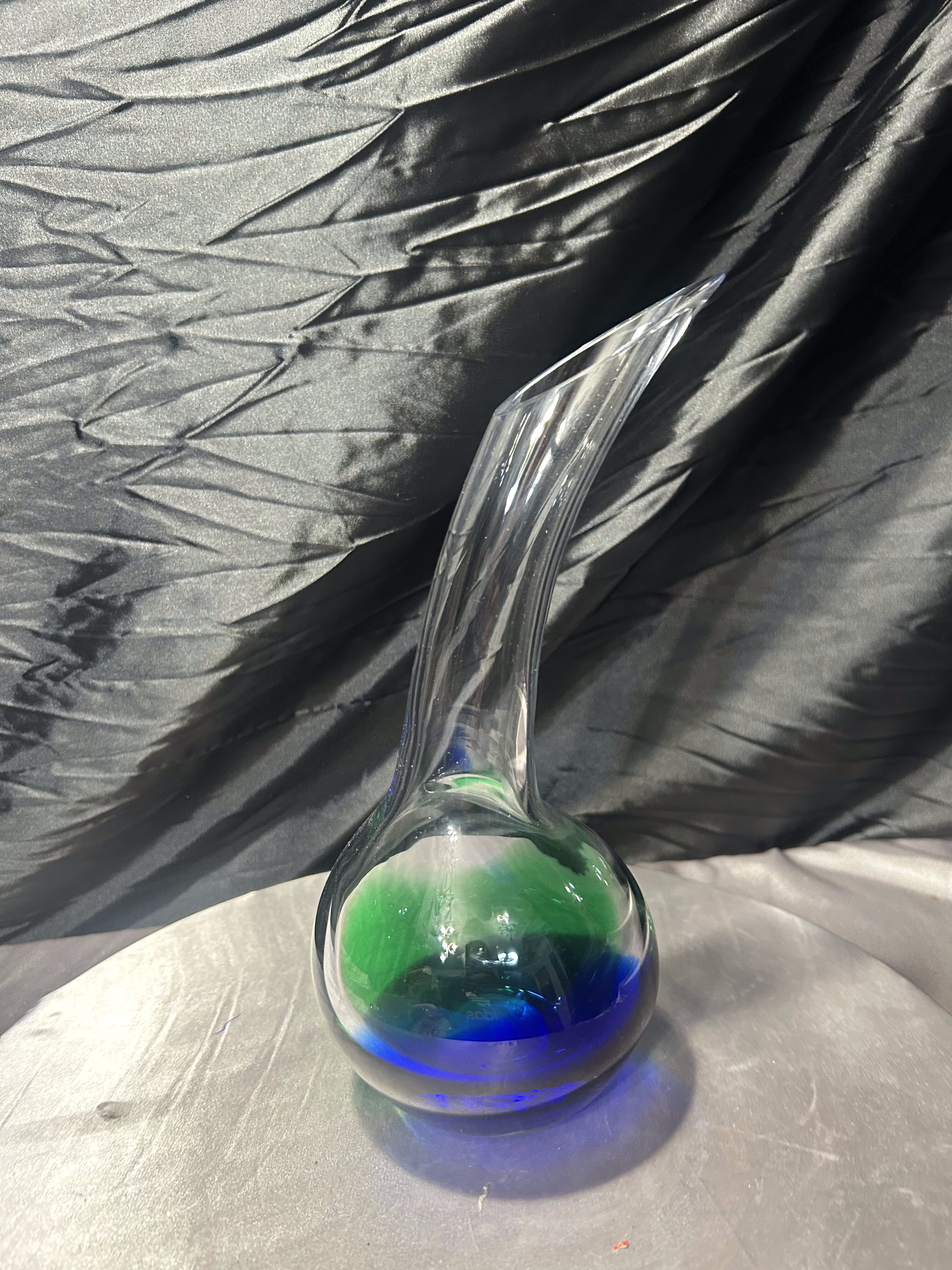Wyjątkowy, unikatowy flakon ze szkła artystycznego, wykonany ręcznie w technice szkła studyjnego. Projekt przyciąga uwagę swoją niecodzienną formą – pełna, kulista podstawa przechodzi w smukłą, wygiętą w jedną stronę szyję, tworząc dynamiczny, rzeźbiarski kształt. W masie szkła artysta zatopił intensywne barwy zieleni i głębokiego kobaltu, które przenikają się ze szkłem transparentnym, tworząc efekt mocnego kontrastu i głębi.