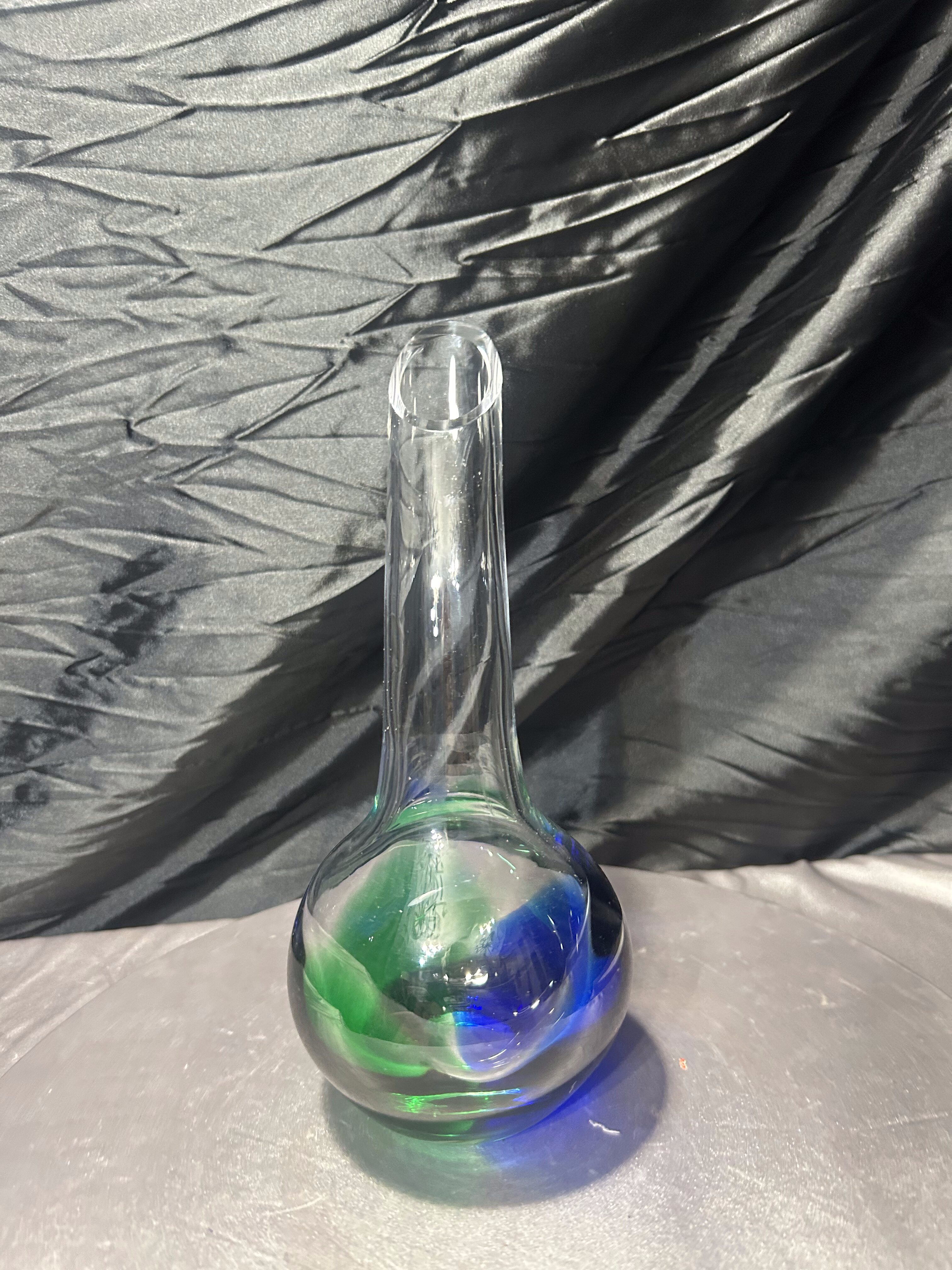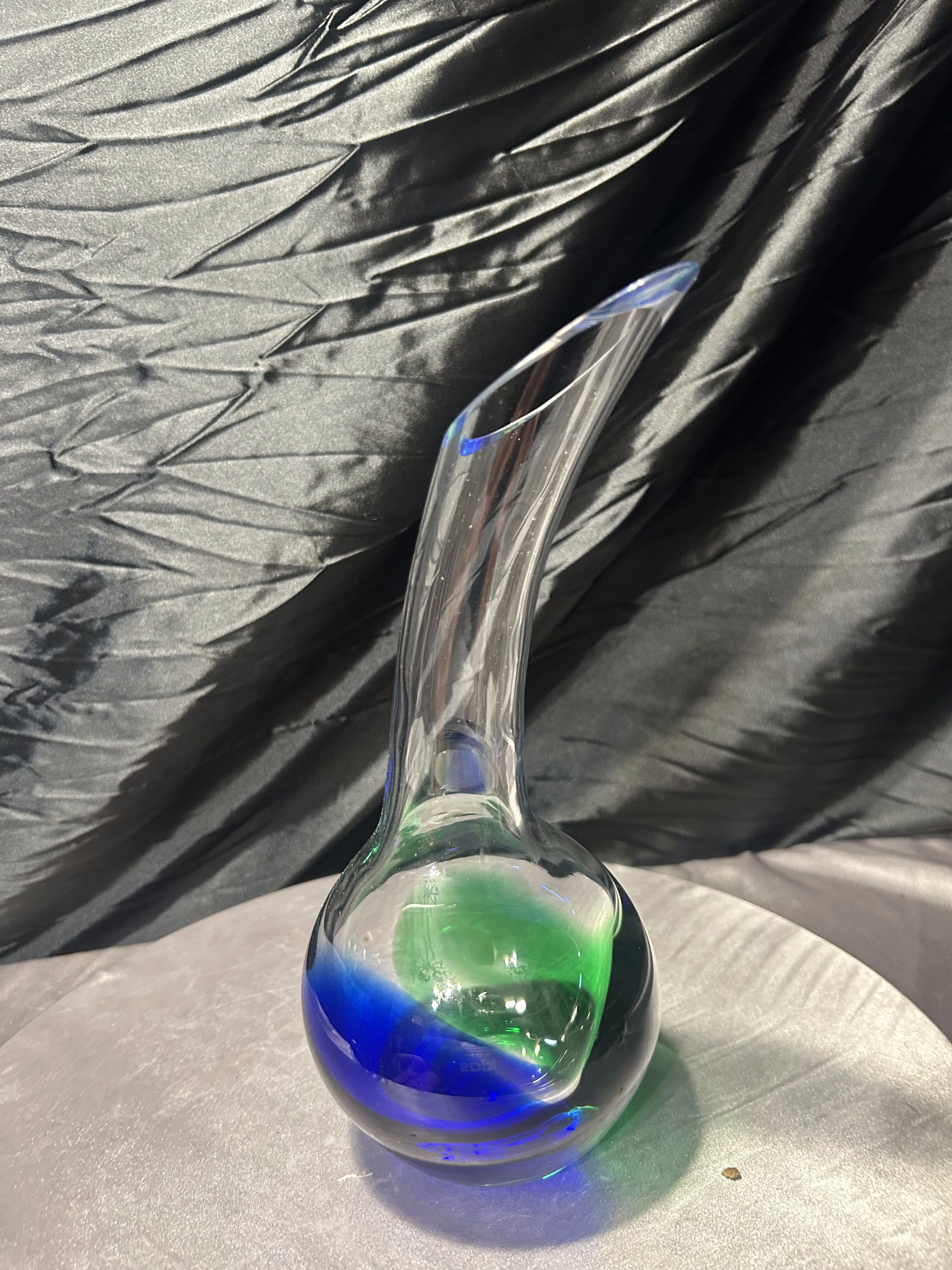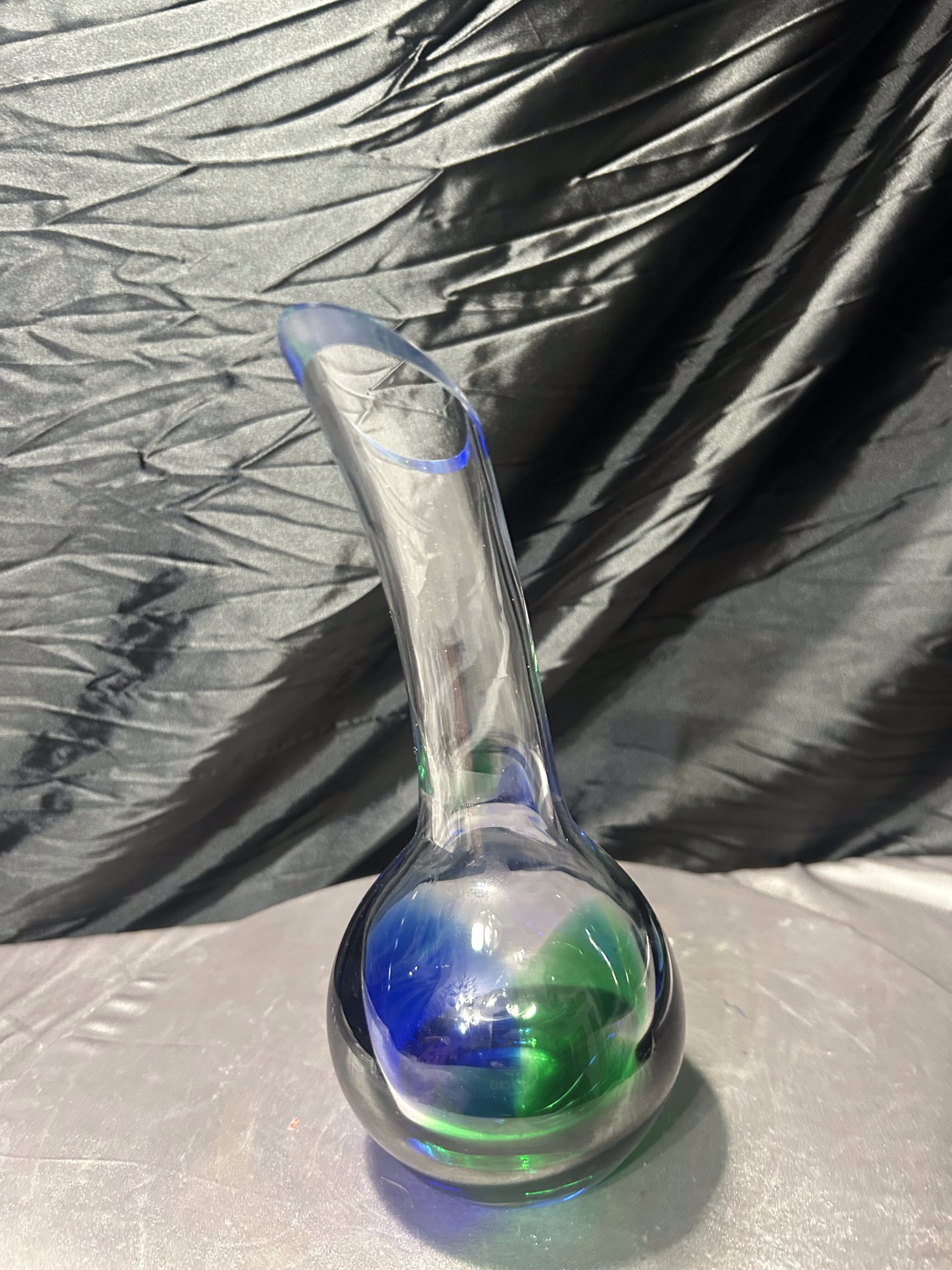 Wyjątkowy, unikatowy flakon ze szkła artystycznego, wykonany ręcznie w technice szkła studyjnego. Projekt przyciąga uwagę swoją niecodzienną formą – pełna, kulista podstawa przechodzi w smukłą, wygiętą w jedną stronę szyję, tworząc dynamiczny, rzeźbiarski kształt. W masie szkła artysta zatopił intensywne barwy zieleni i głębokiego kobaltu, które przenikają się ze szkłem transparentnym, tworząc efekt mocnego kontrastu i głębi.