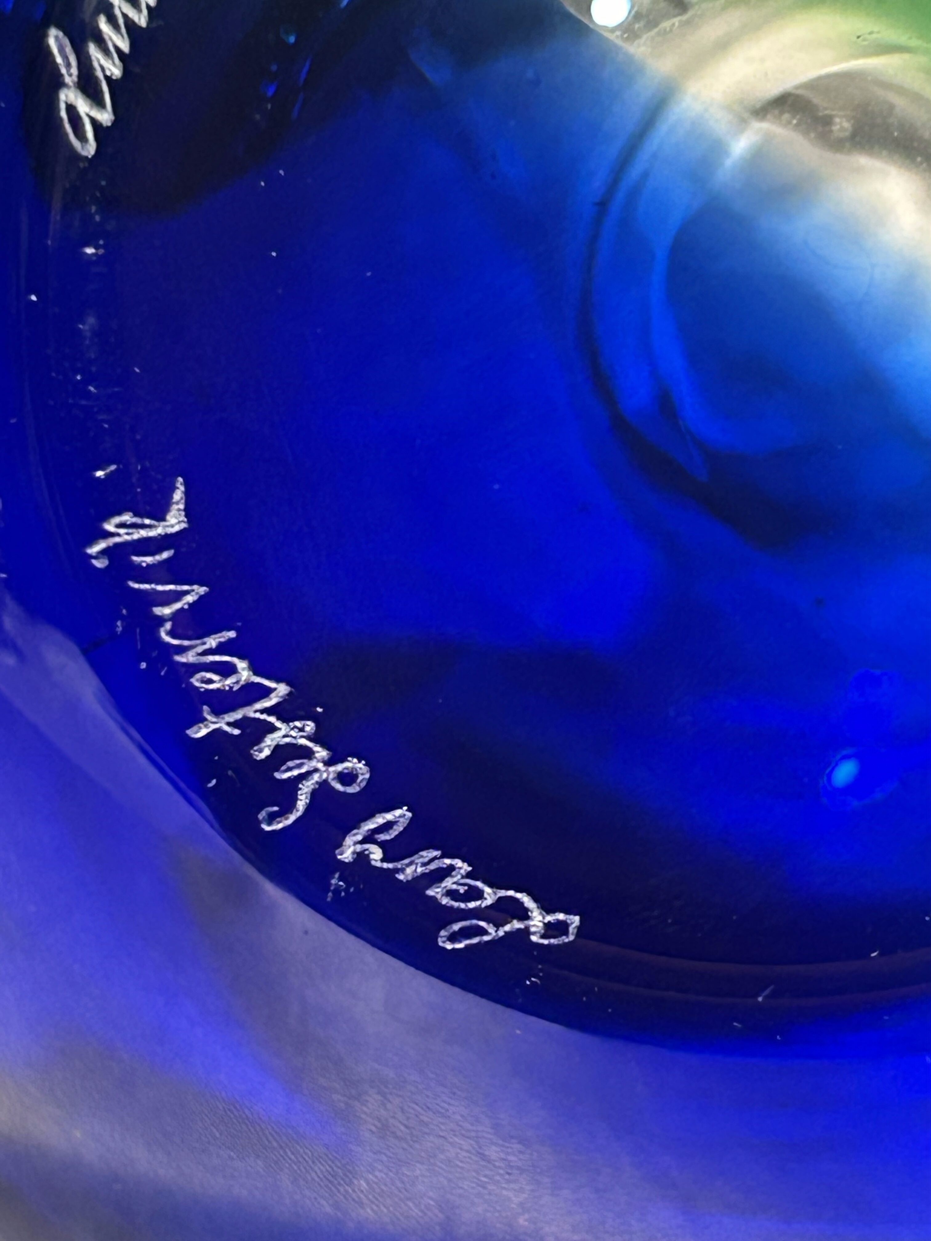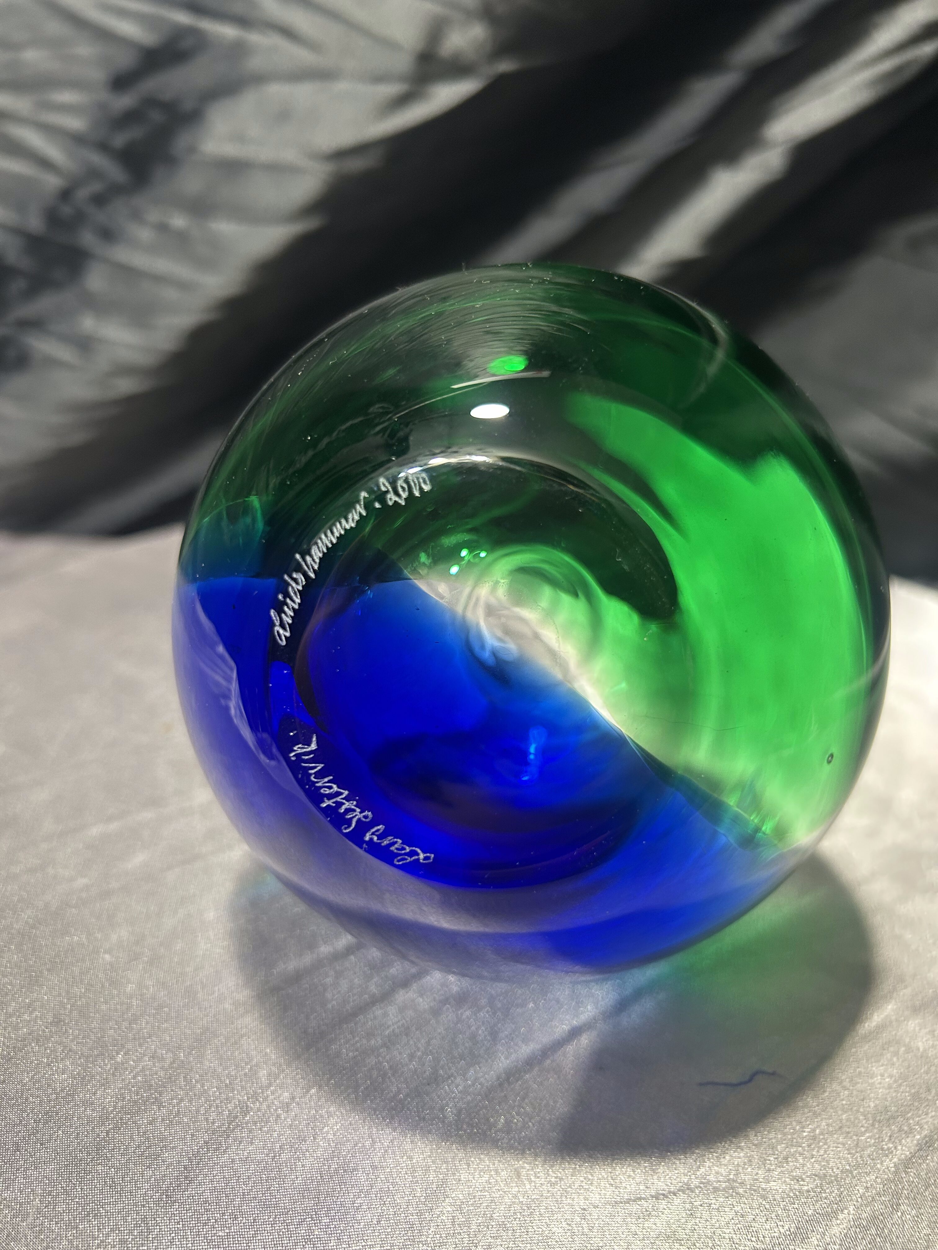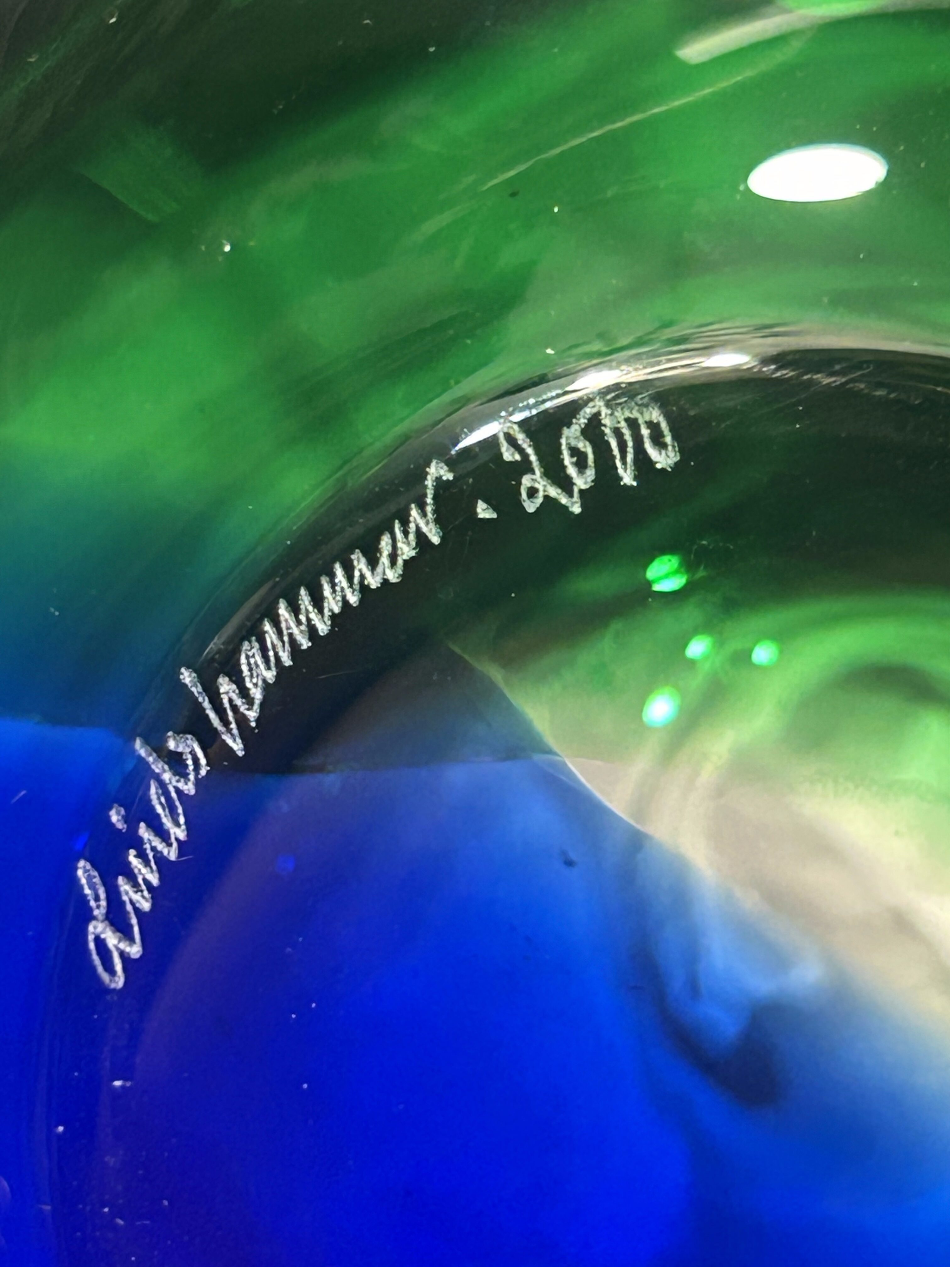 Flakon jest sygnowany na spodzie – grawer diamentowy wskazuje podpis Hammar oraz rok powstania 2010, co potwierdza, że jest to praca artysty z prywatnej pracowni szkła studyjnego, prawdopodobnie ze Skandynawii (Szwecja / Norwegia), gdzie nazwisko Hammar jest typowe. Nie jest to szkło masowe ani hutnicza produkcja seryjna – to praca indywidualna, wykonana w ograniczonej liczbie egzemplarzy lub jako unikat. Takie flakony powstają w małych warsztatach, w których artysta sam prowadzi proces formowania i wykańczania.
