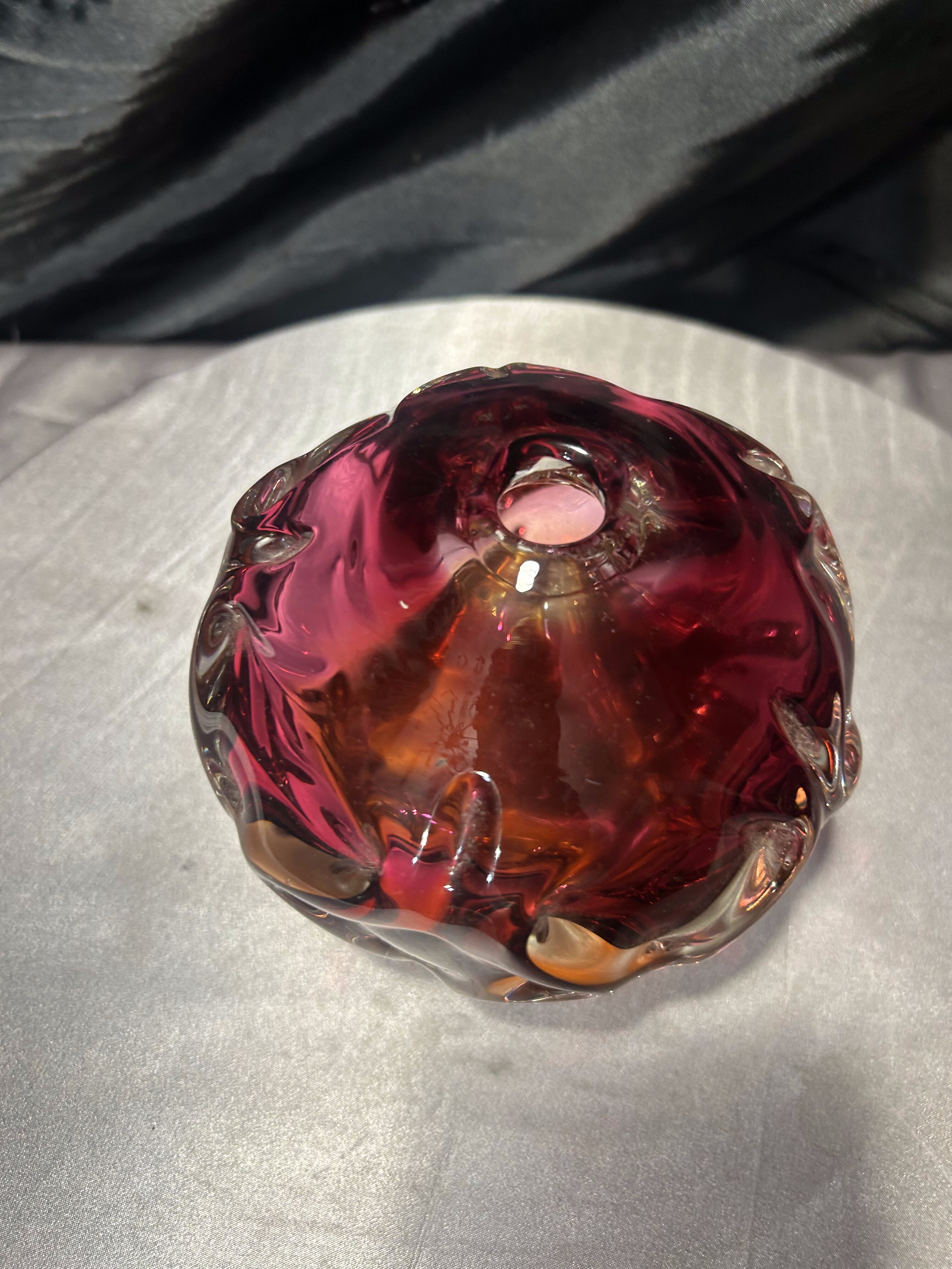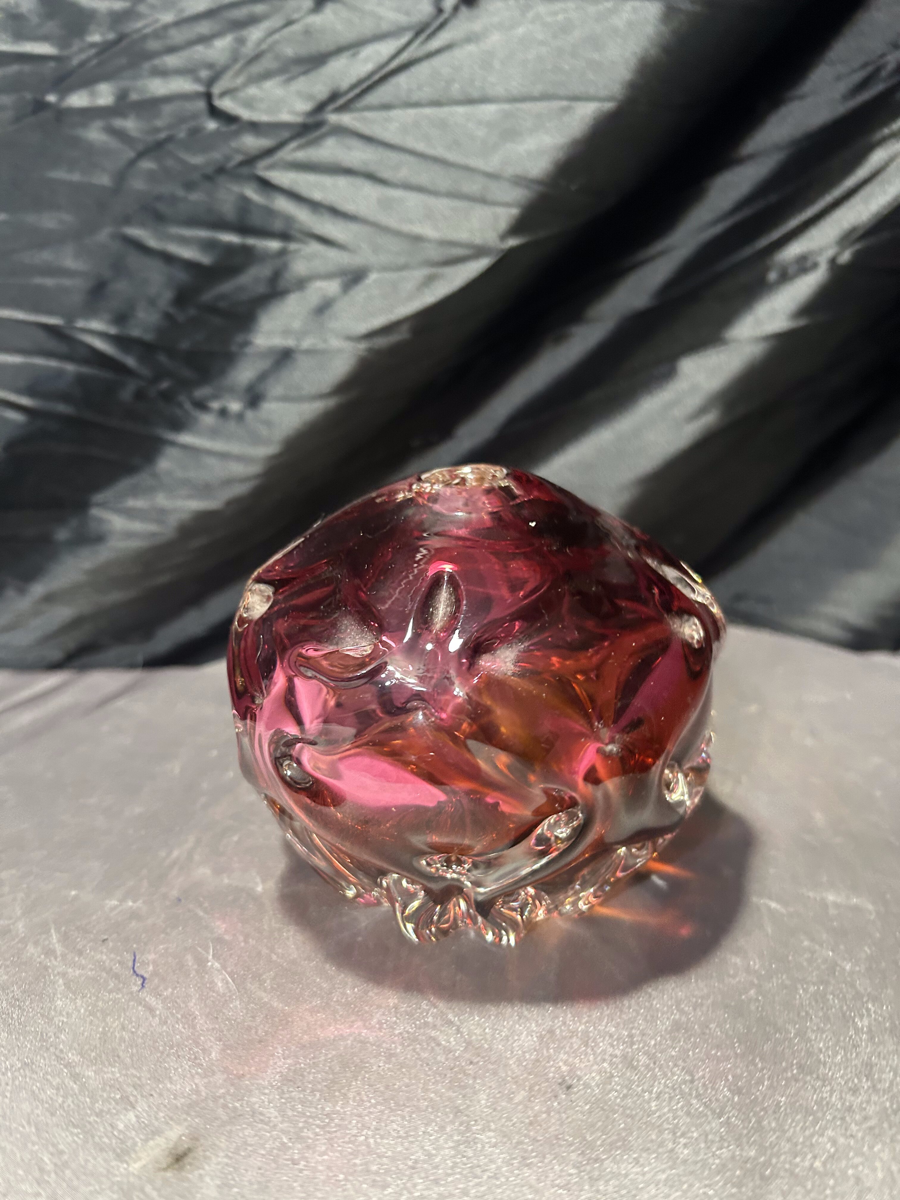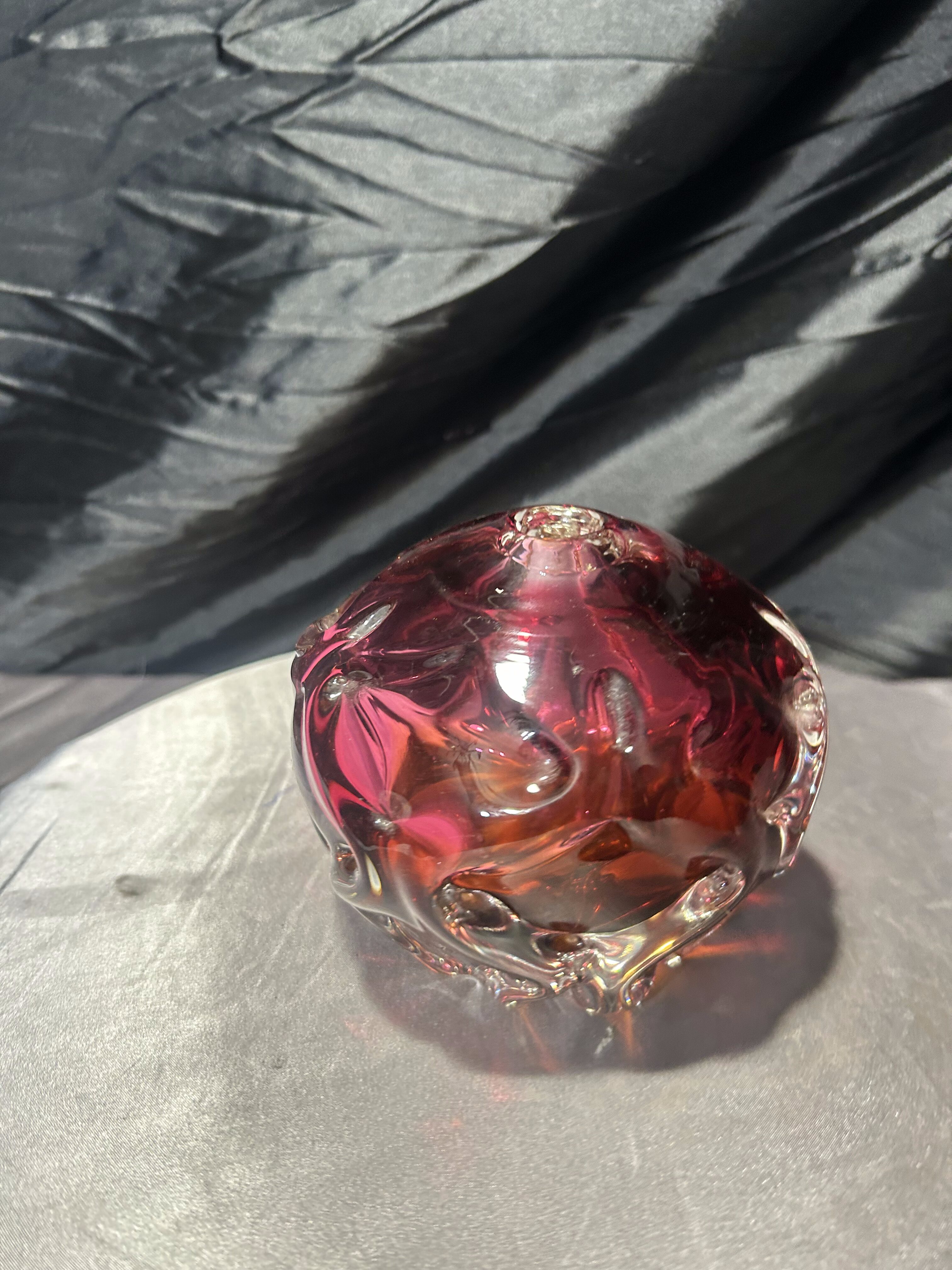 Oryginalny, ręcznie formowany flakon ze szkła artystycznego z renomowanej Huty Bohemia, wykonany w charakterystycznym stylu czeskiego szkła powojennego. Kształt kuli z dynamicznymi, rzeźbiarskimi wypukłościami oraz intensywne przenikanie barw – od głębokiego różu po bursztynowy odcień – czynią ten egzemplarz wyjątkową dekoracją o kolekcjonerskim charakterze.