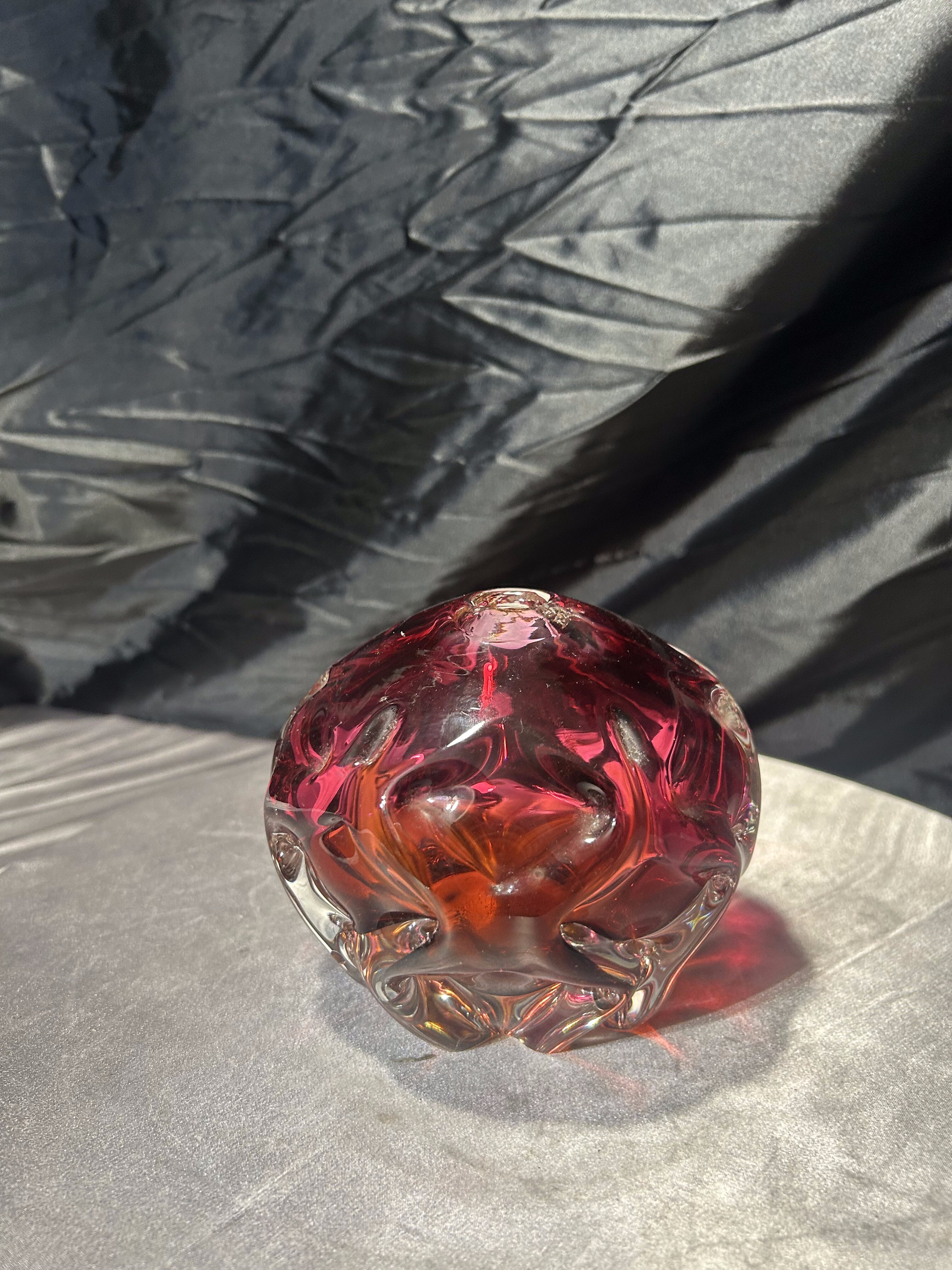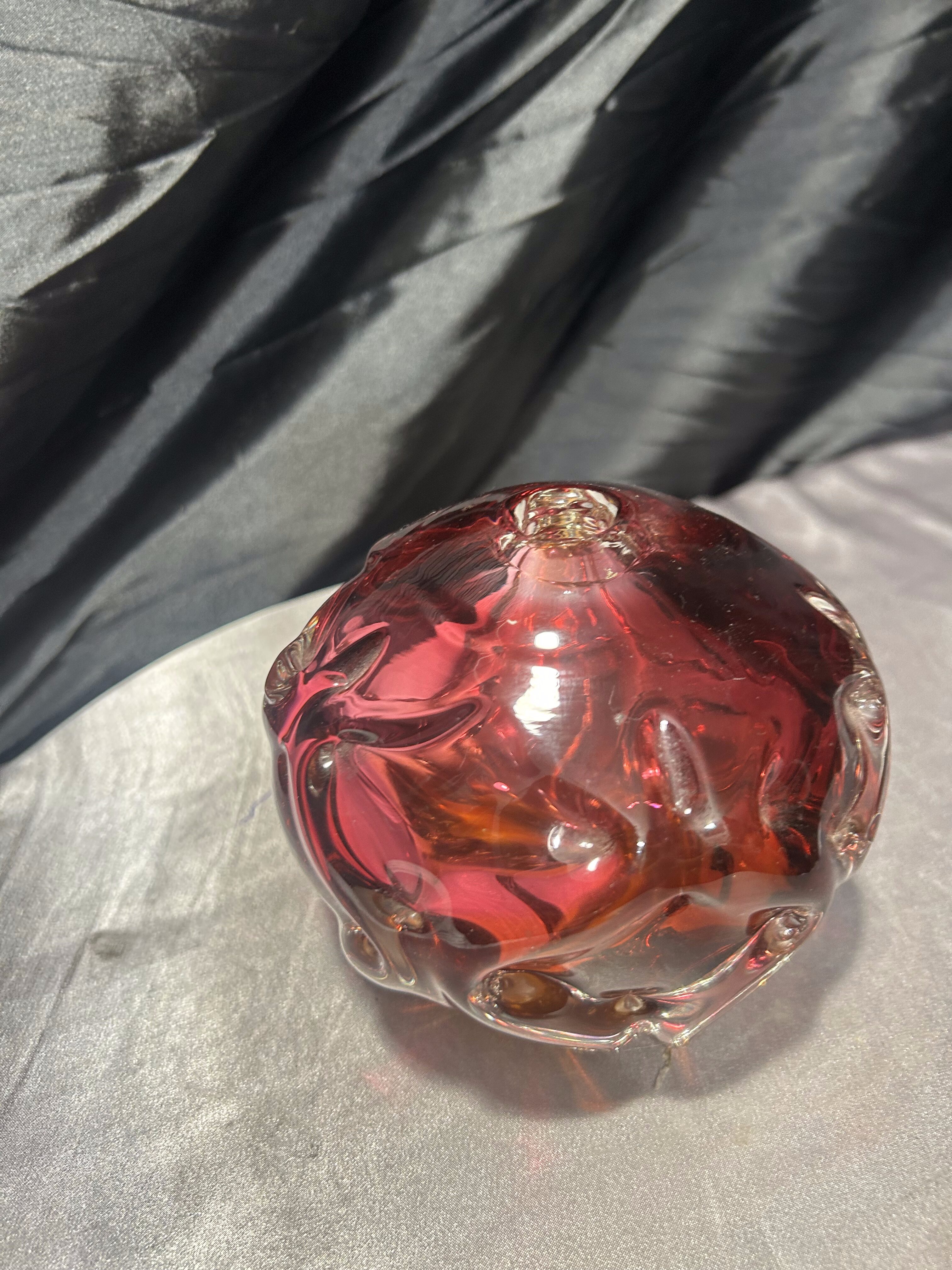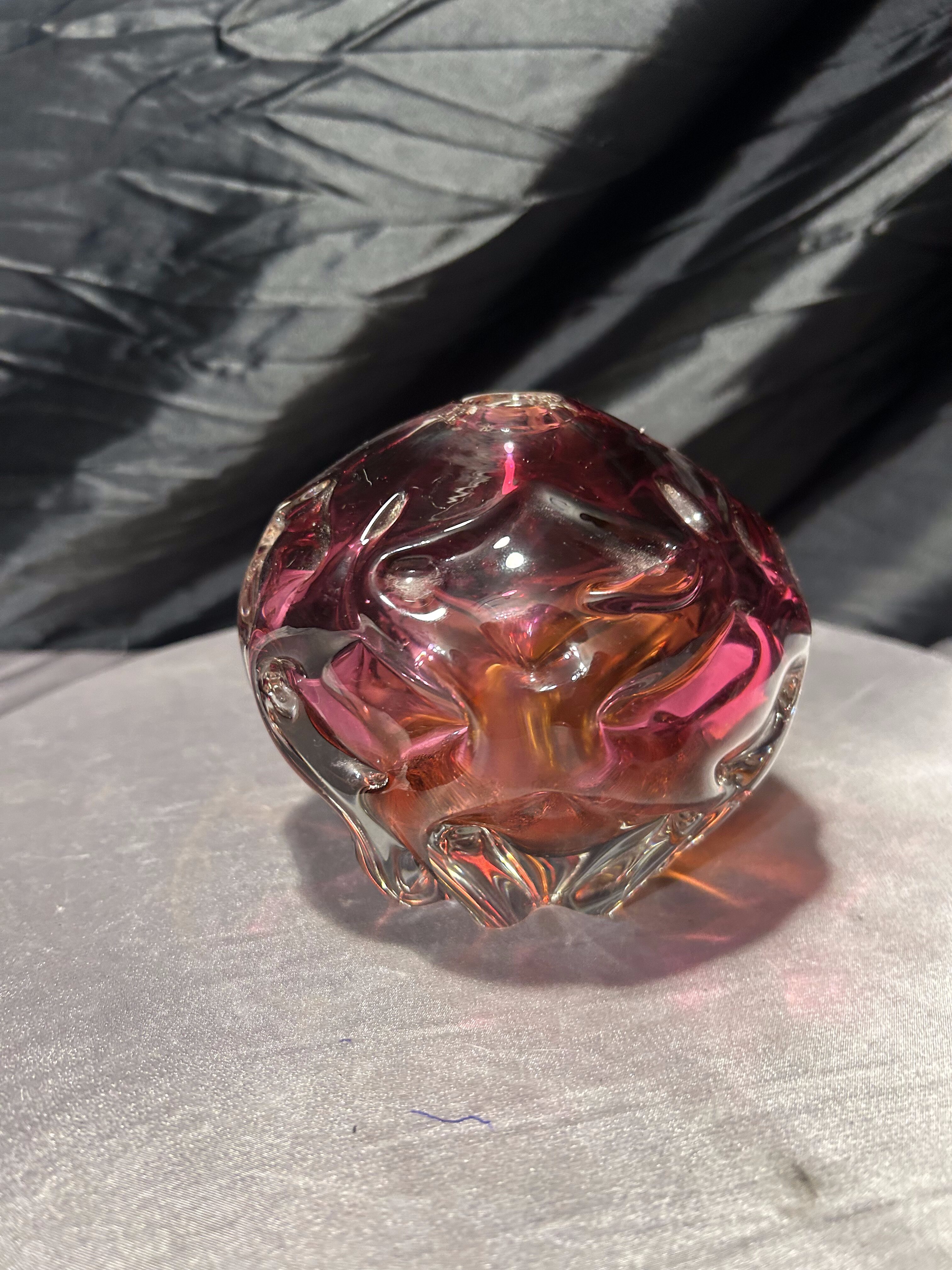 Oryginalny, ręcznie formowany flakon ze szkła artystycznego z renomowanej Huty Bohemia, wykonany w charakterystycznym stylu czeskiego szkła powojennego. Kształt kuli z dynamicznymi, rzeźbiarskimi wypukłościami oraz intensywne przenikanie barw – od głębokiego różu po bursztynowy odcień – czynią ten egzemplarz wyjątkową dekoracją o kolekcjonerskim charakterze.