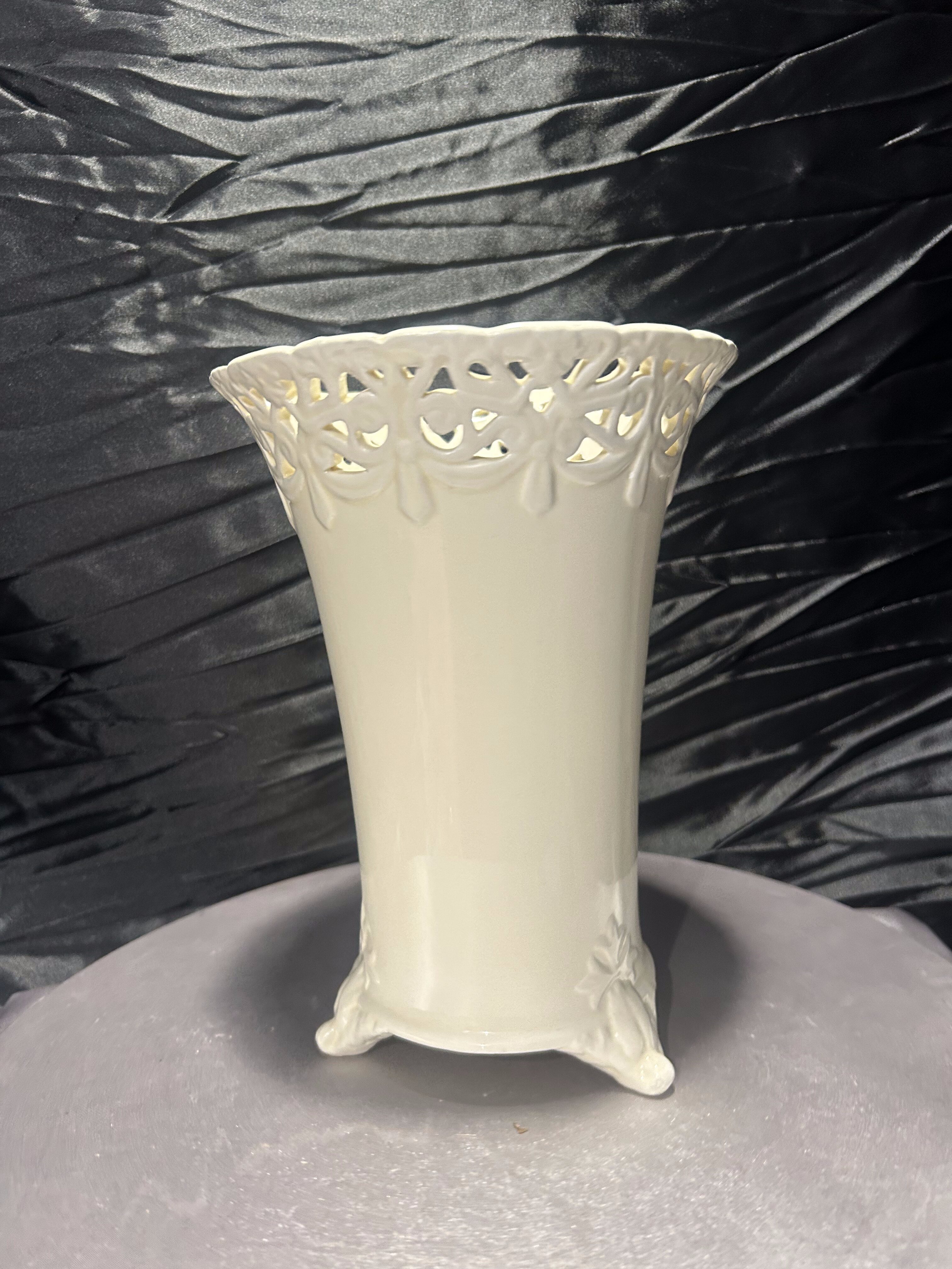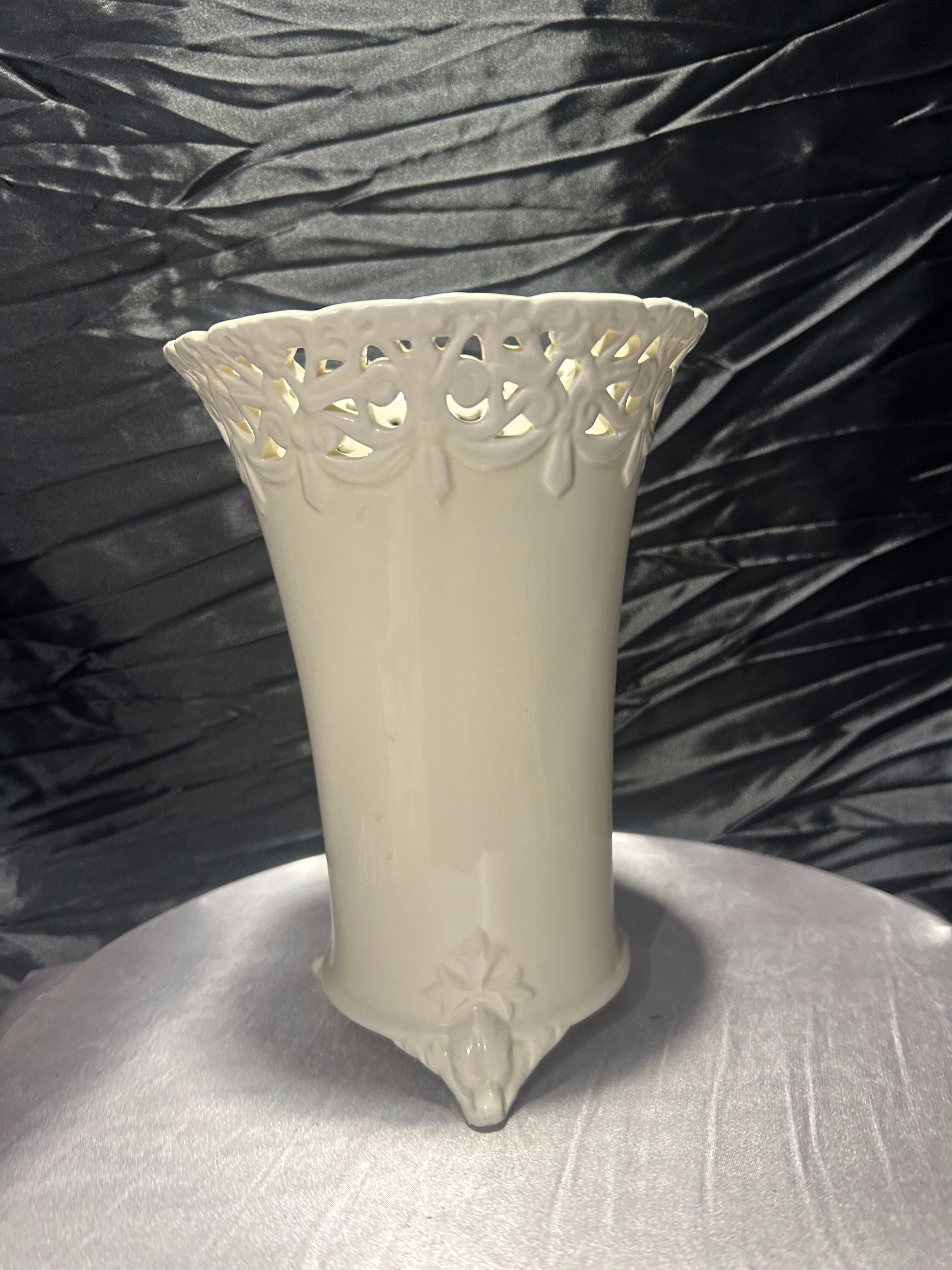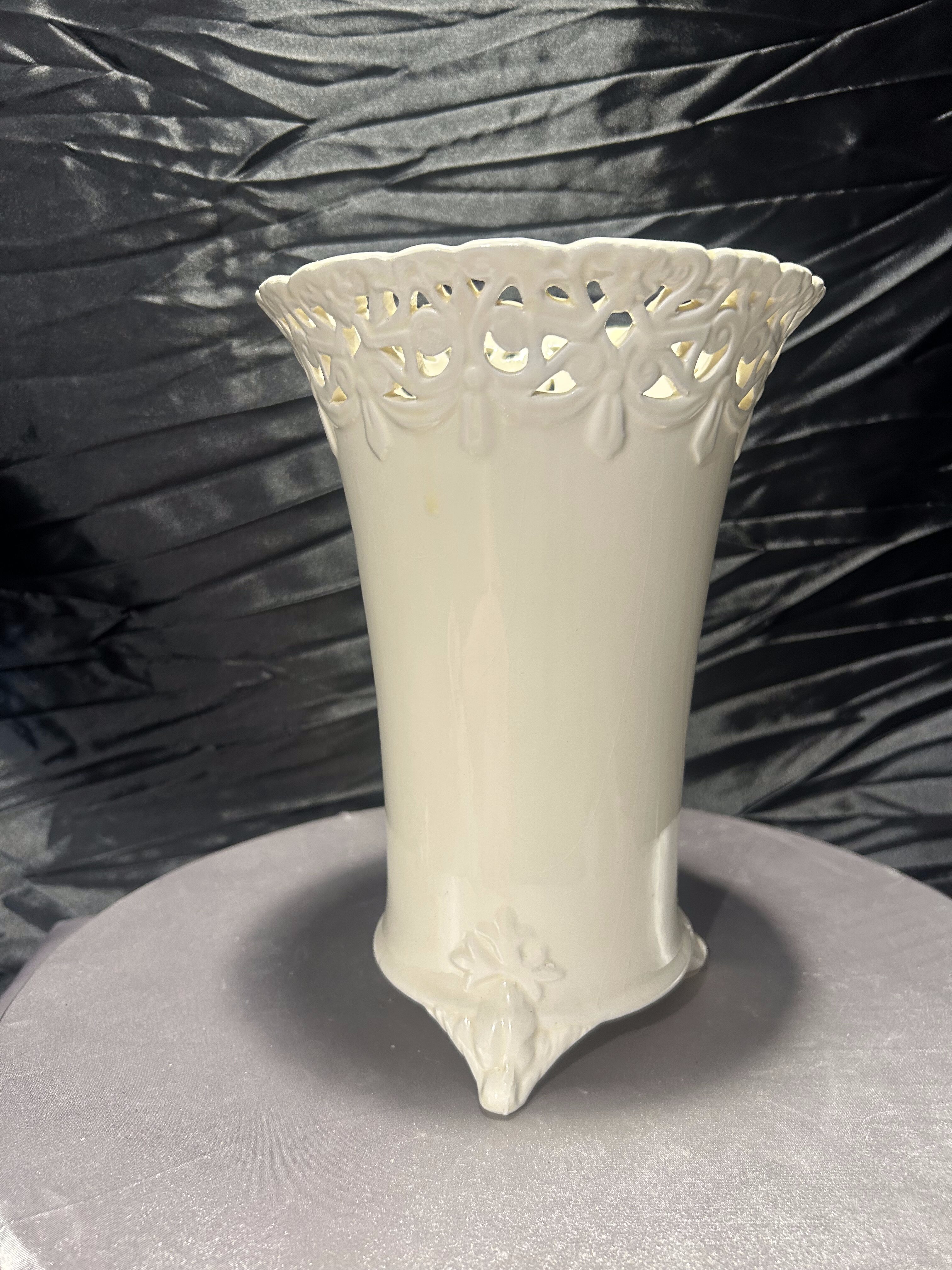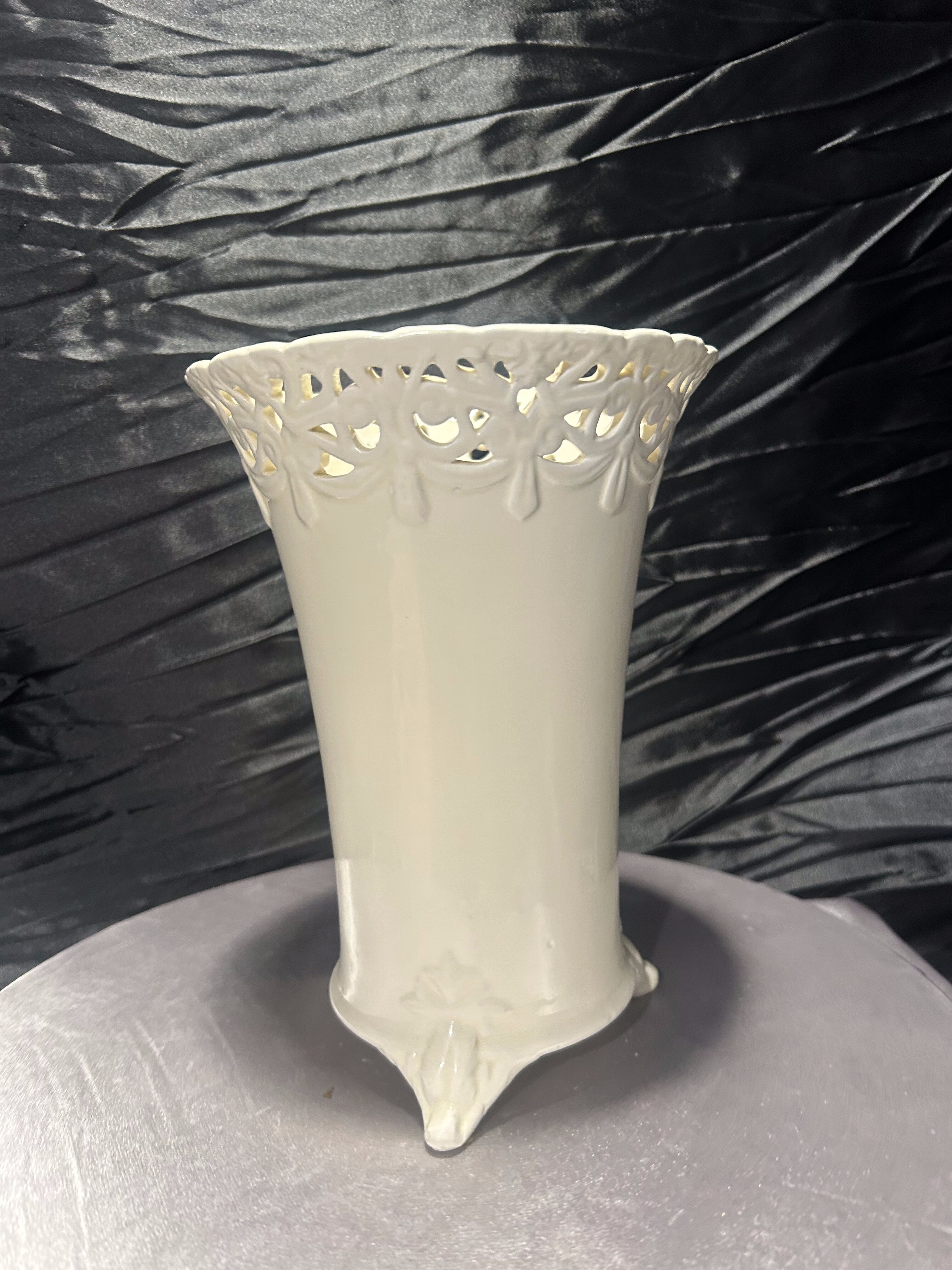 Elegancki flakon ceramiczny w kolorze ecri, z misternie ażurowym rantem i finezyjnie zdobionymi nóżkami. Wysoki, o smukłej sylwetce i delikatnym połysku – stanowi wyrafinowany akcent dekoracyjny w klasycznym lub romantycznym wnętrzu. Doskonały jako wazon na kwiaty cięte lub samodzielny element dekoracyjny.