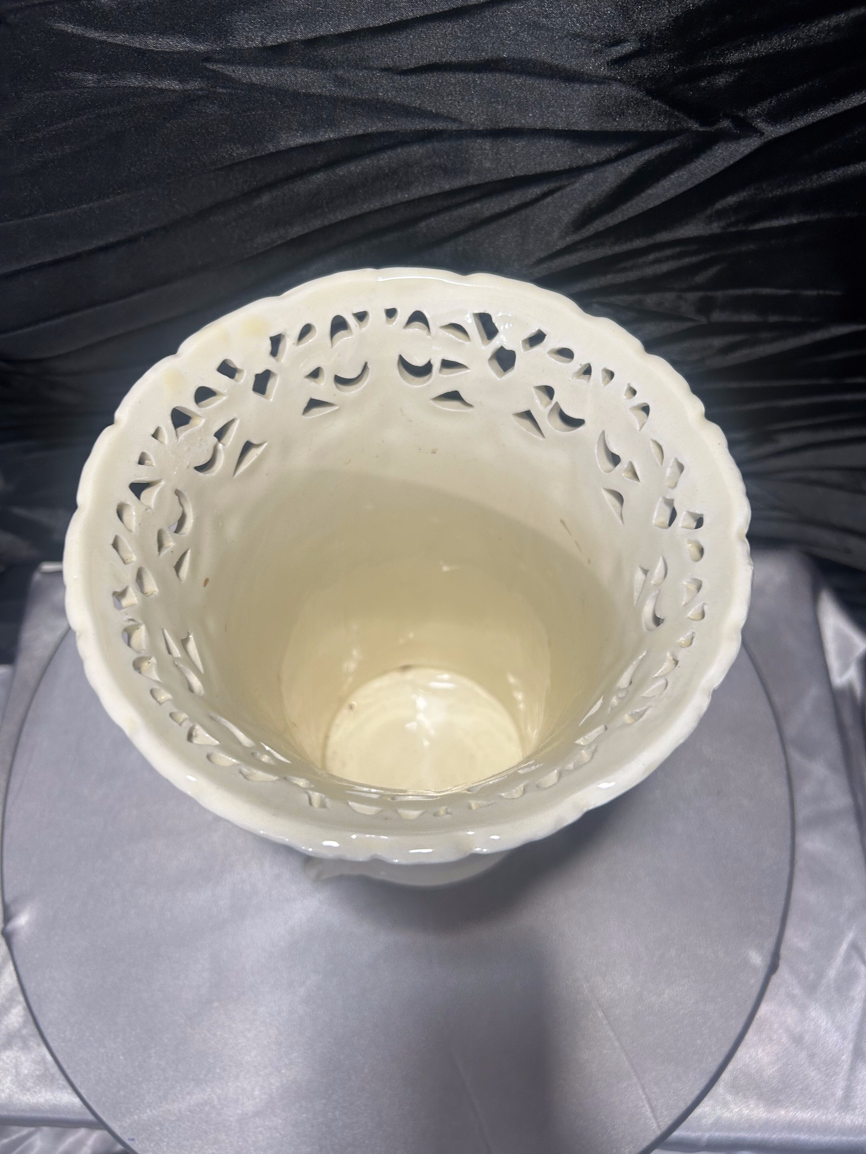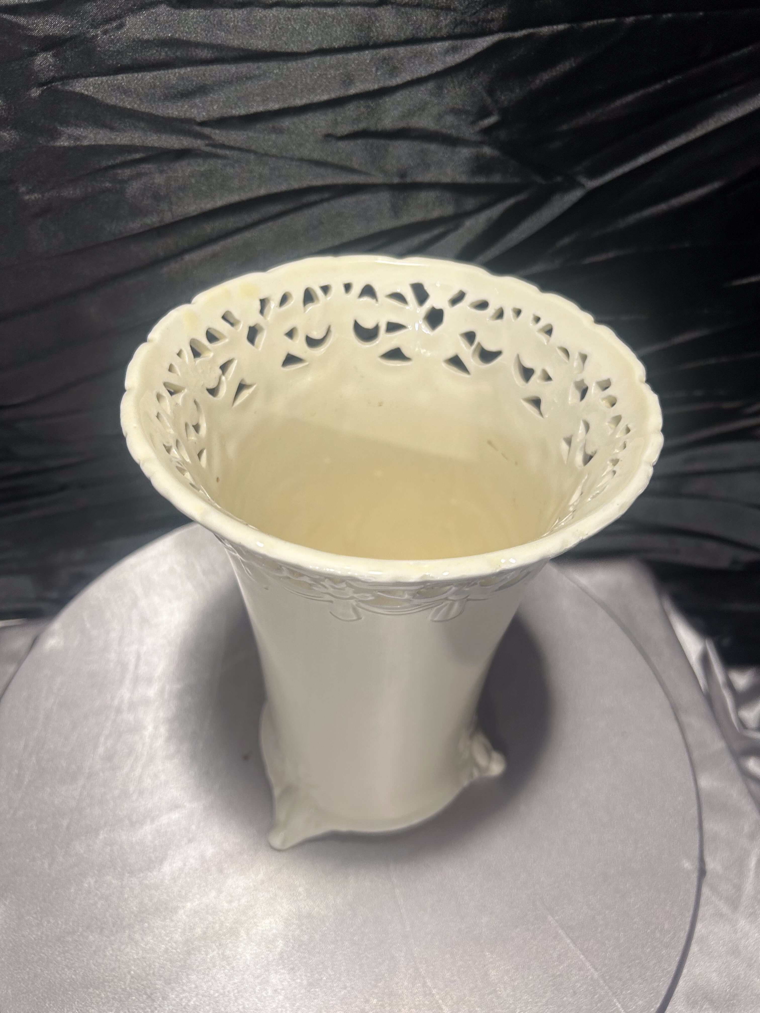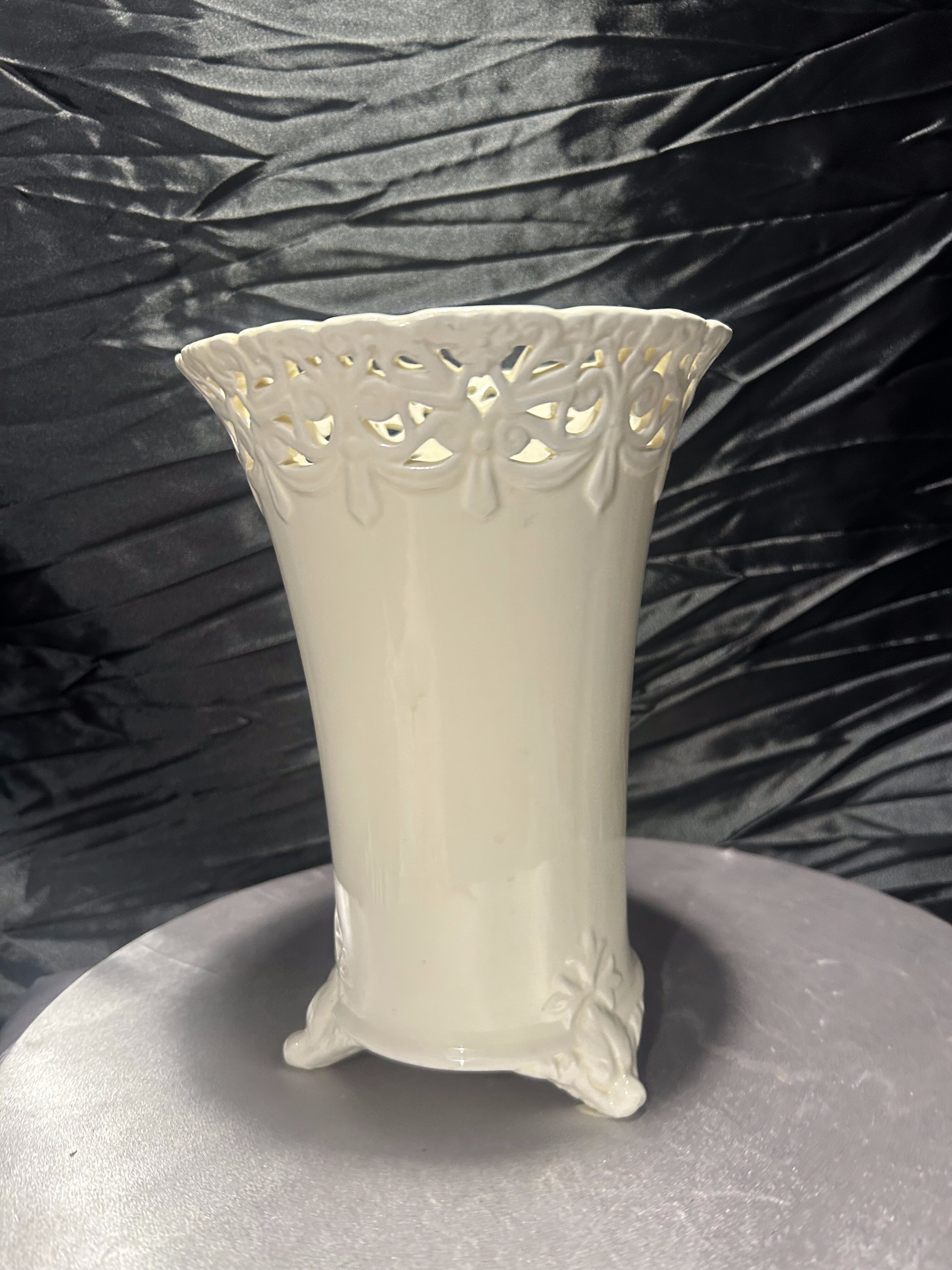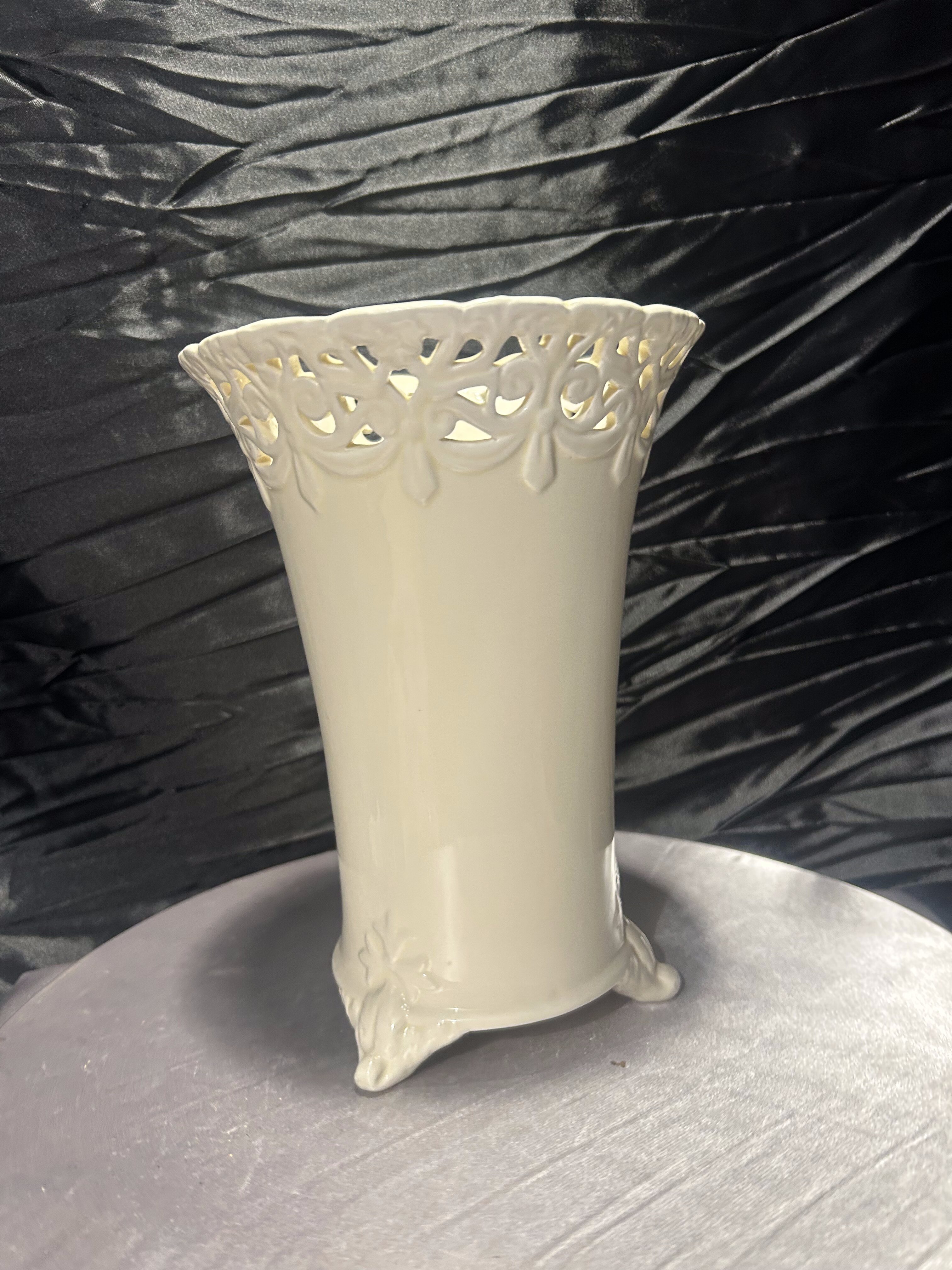 Elegancki flakon ceramiczny w kolorze ecri, z misternie ażurowym rantem i finezyjnie zdobionymi nóżkami. Wysoki, o smukłej sylwetce i delikatnym połysku – stanowi wyrafinowany akcent dekoracyjny w klasycznym lub romantycznym wnętrzu. Doskonały jako wazon na kwiaty cięte lub samodzielny element dekoracyjny.