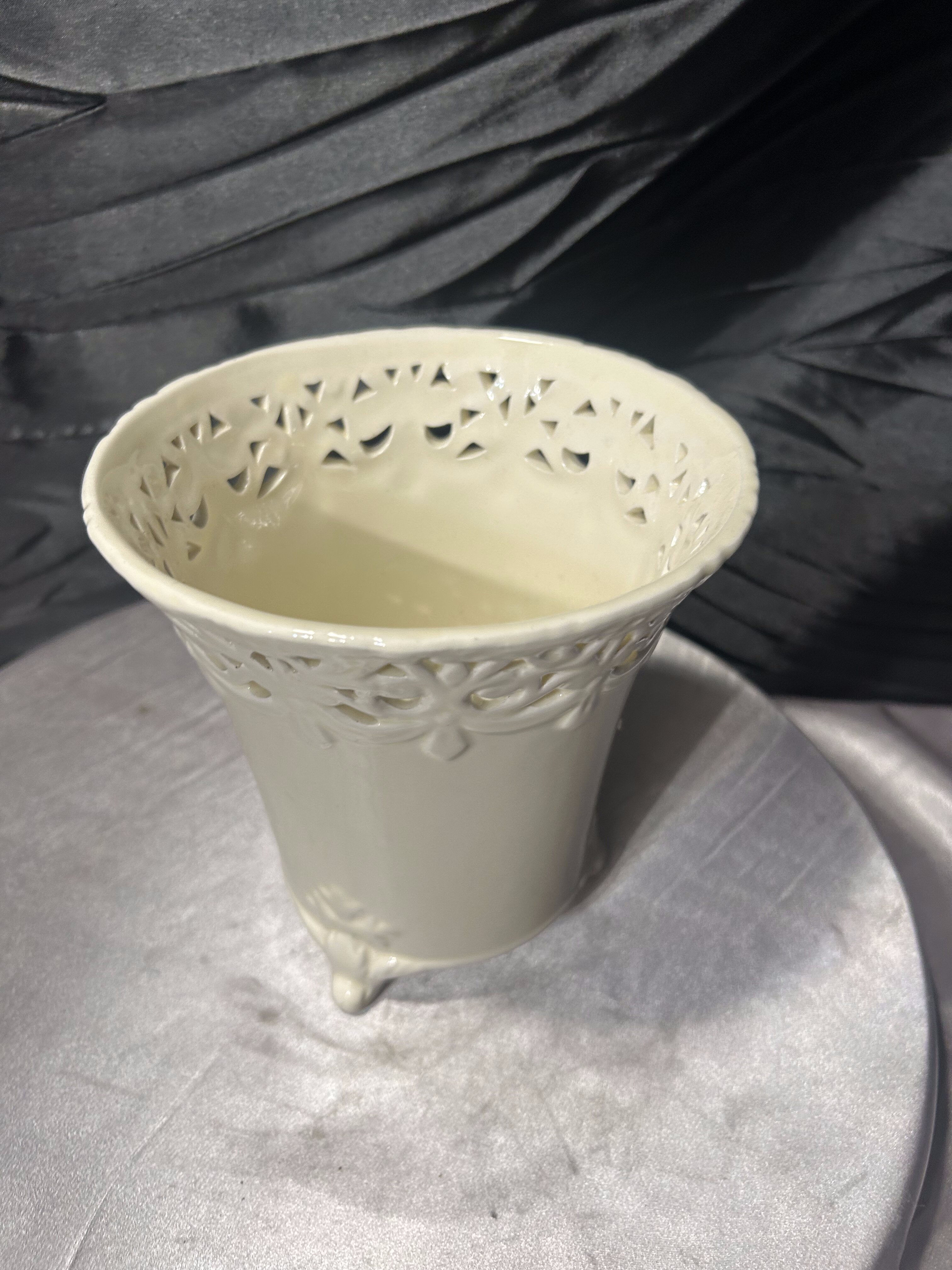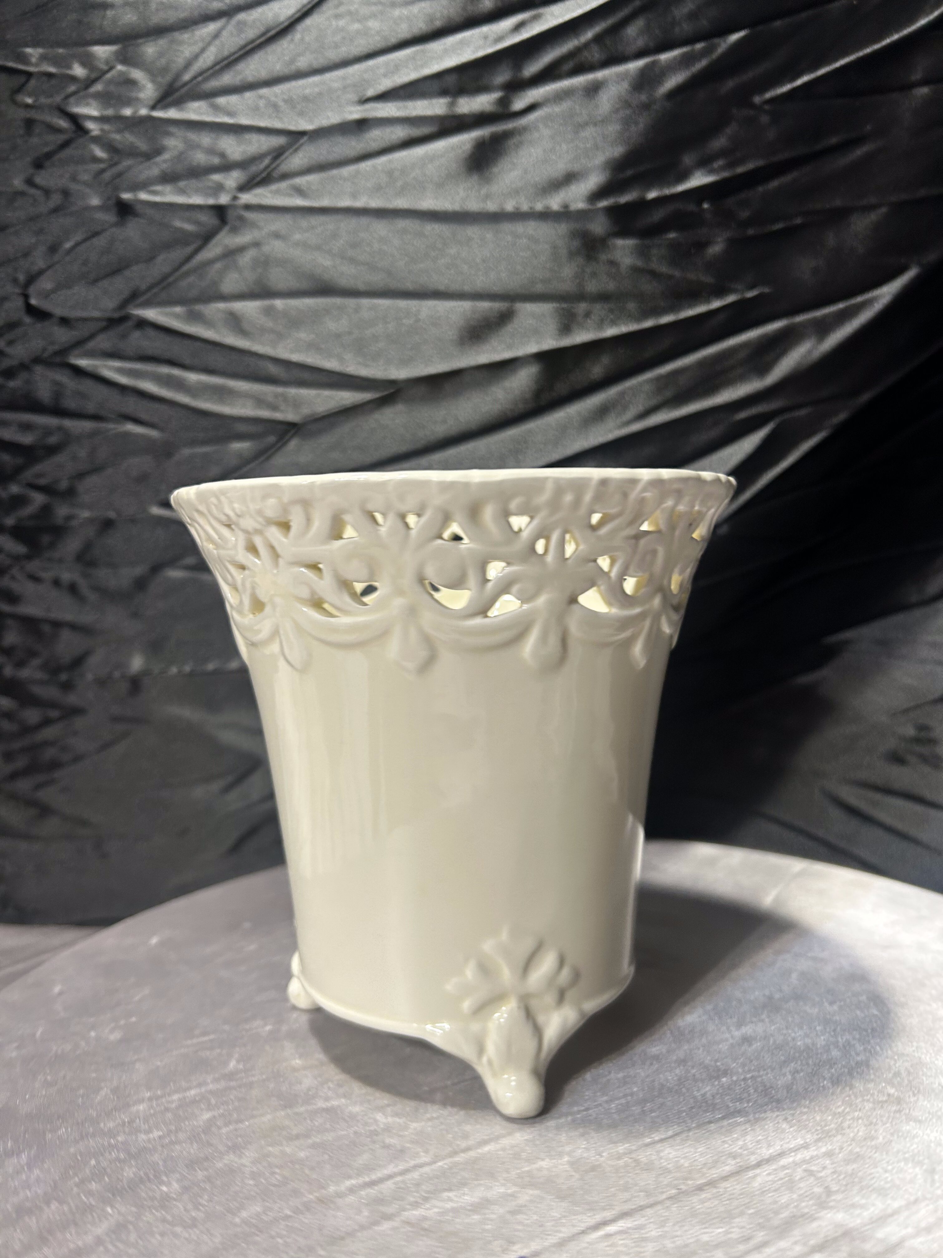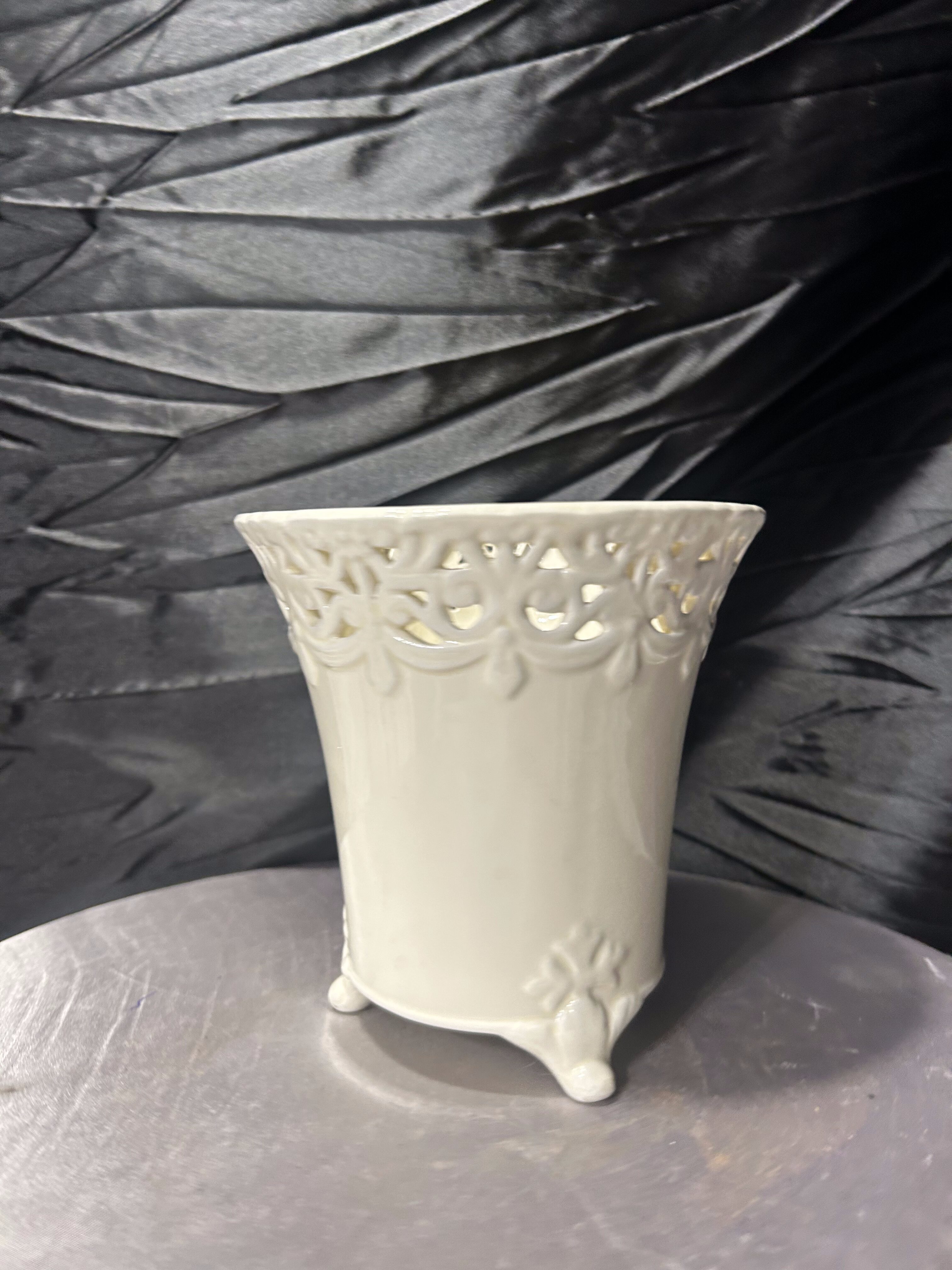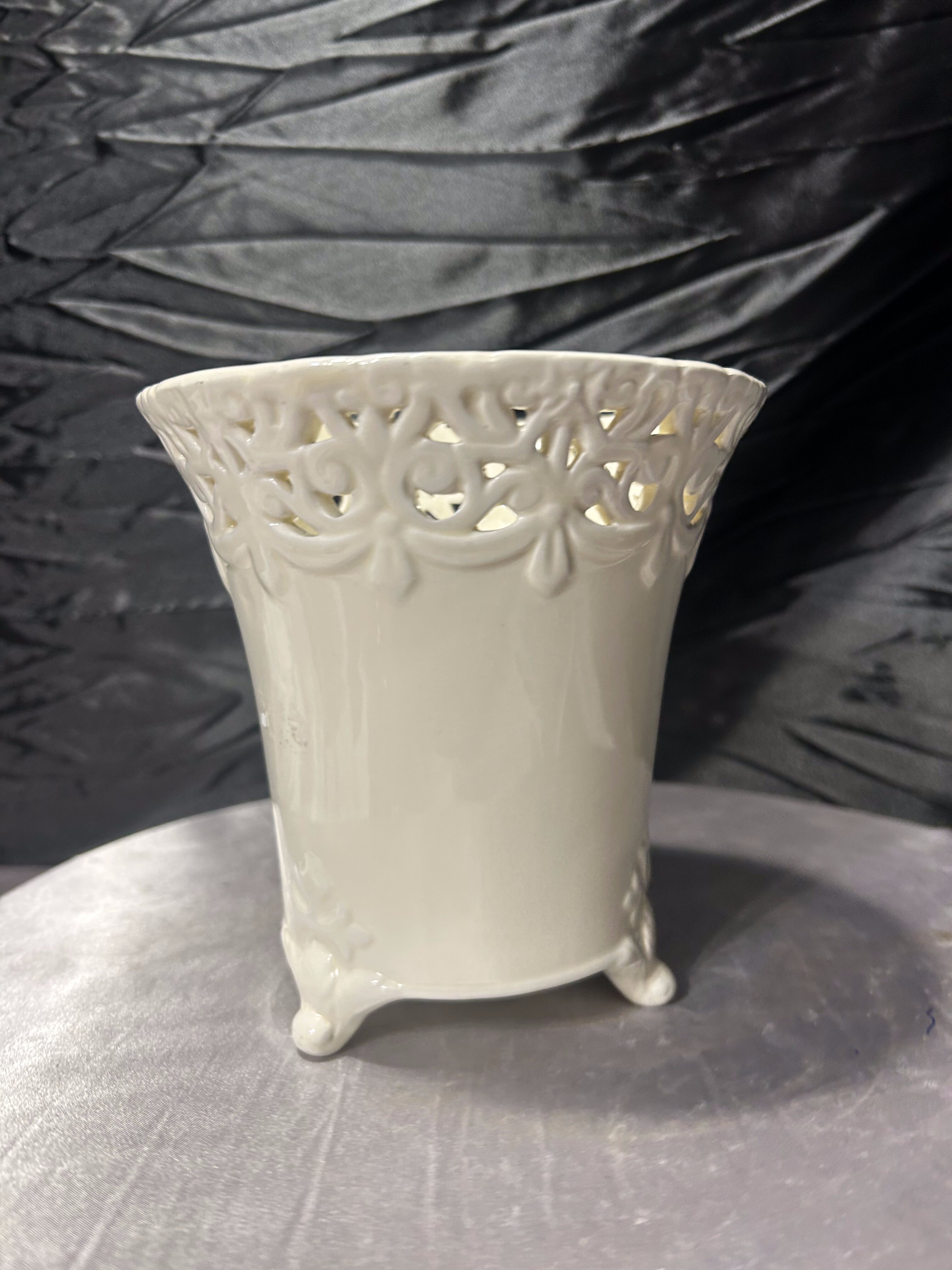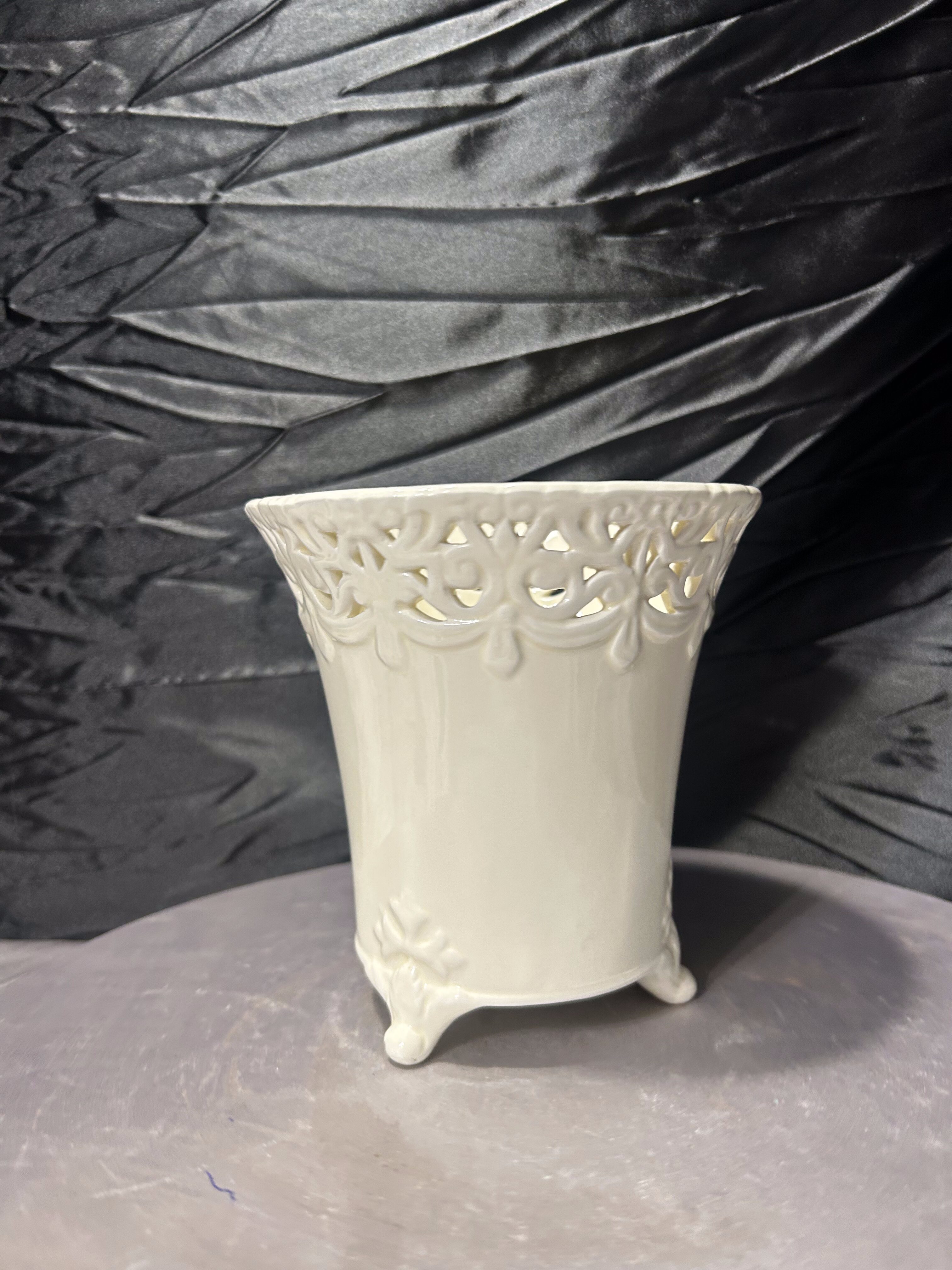 Elegancki flakon ceramiczny o klasycznej, harmonijnej formie, zwieńczony dekoracyjnym ażurowym rantem. Subtelne wycięcia w górnej części nadają całości lekkości i dekoracyjnego charakteru, pięknie przepuszczając światło. Jasna, jednolita ceramika sprawia, że flakon doskonale wpisuje się zarówno w klasyczne, jak i bardziej romantyczne wnętrza.